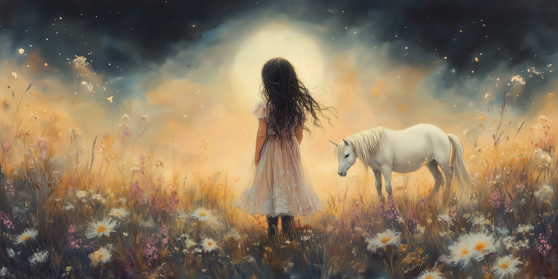 Magisch Meisje en Witte Paard in Bloemenveld