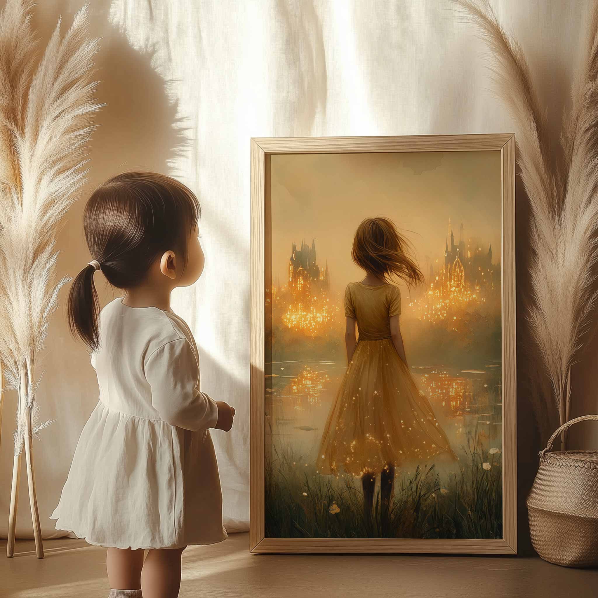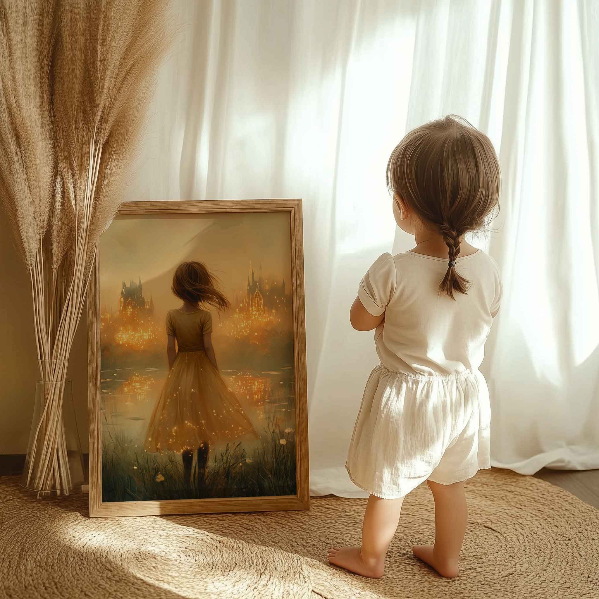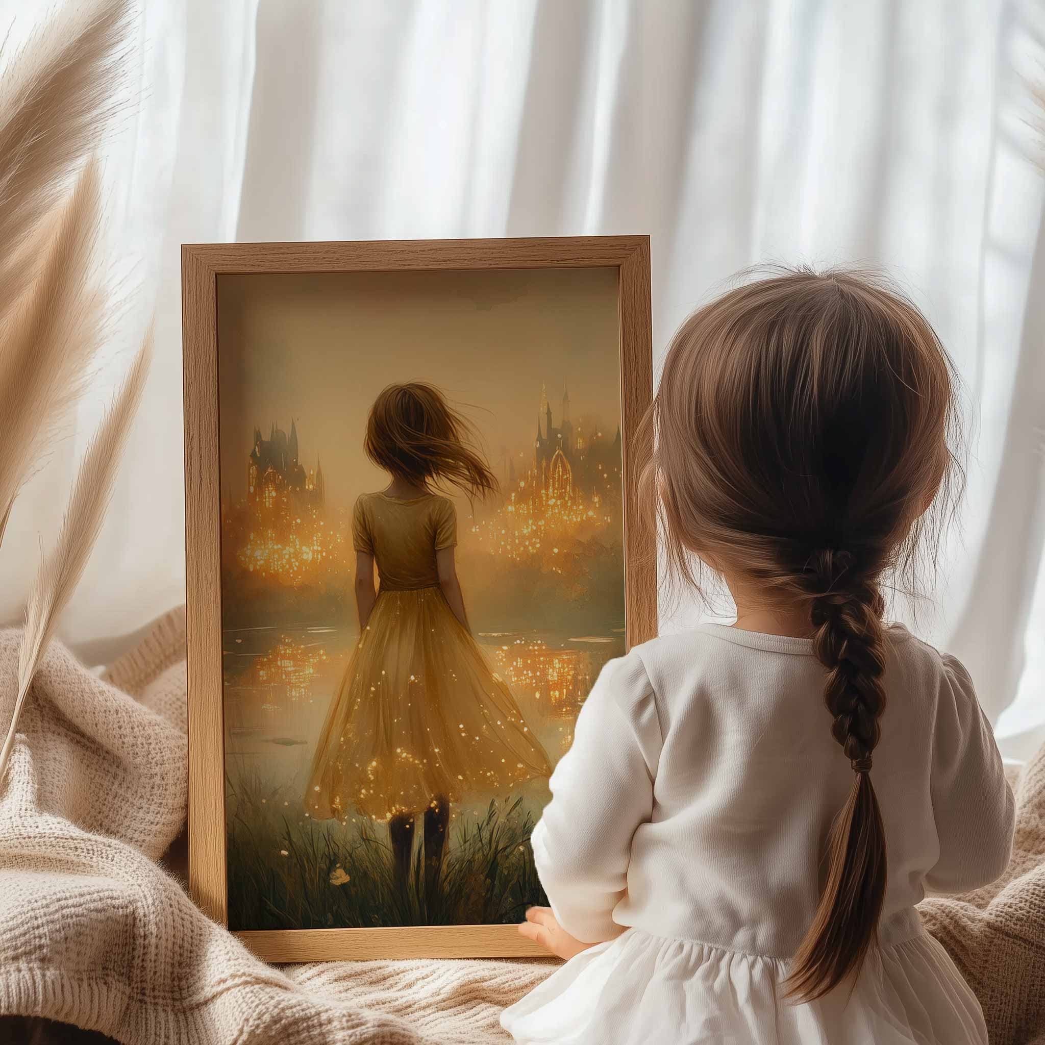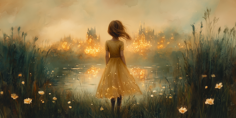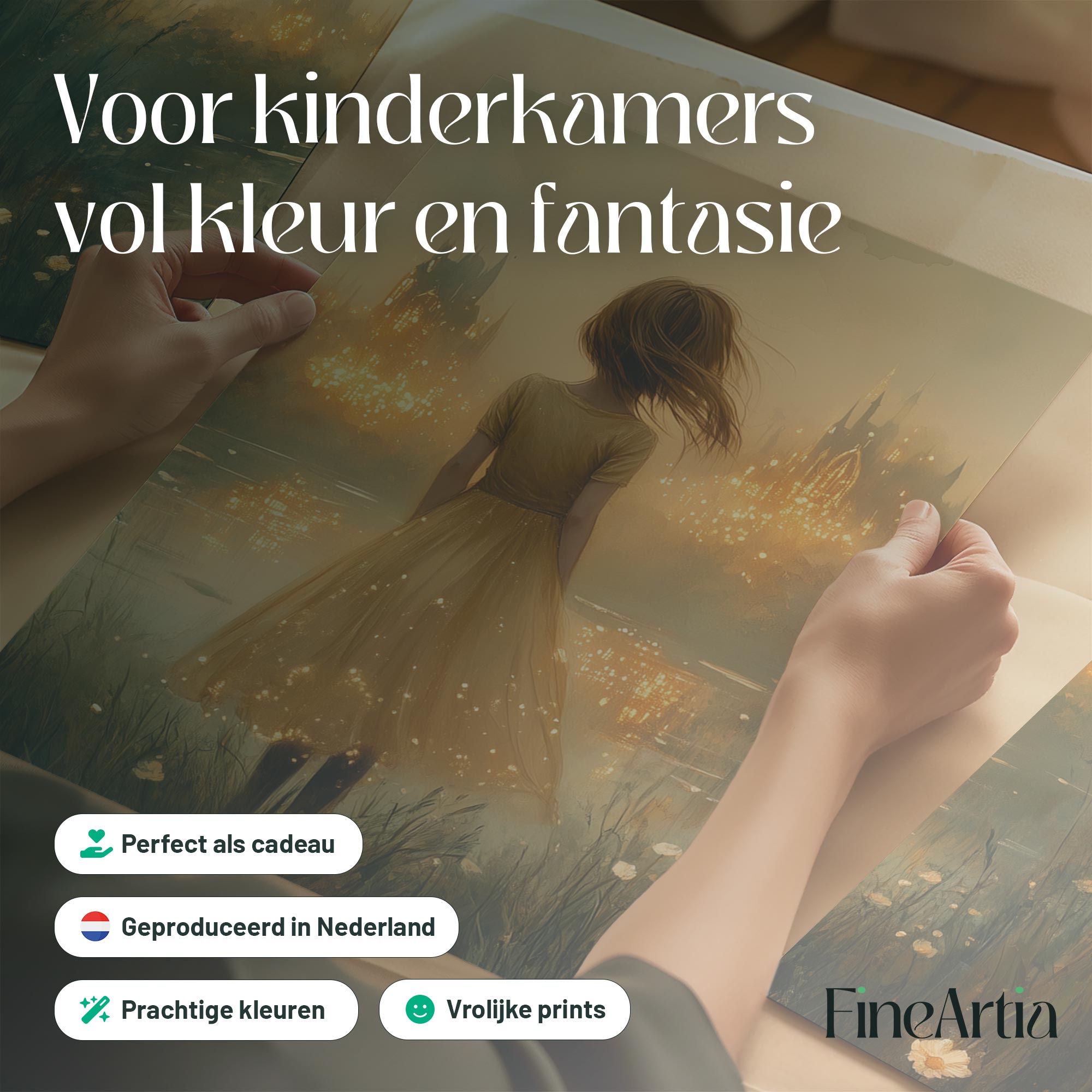 Magisch Meisje in Bloeiend Bloemenveld met Kasteel
