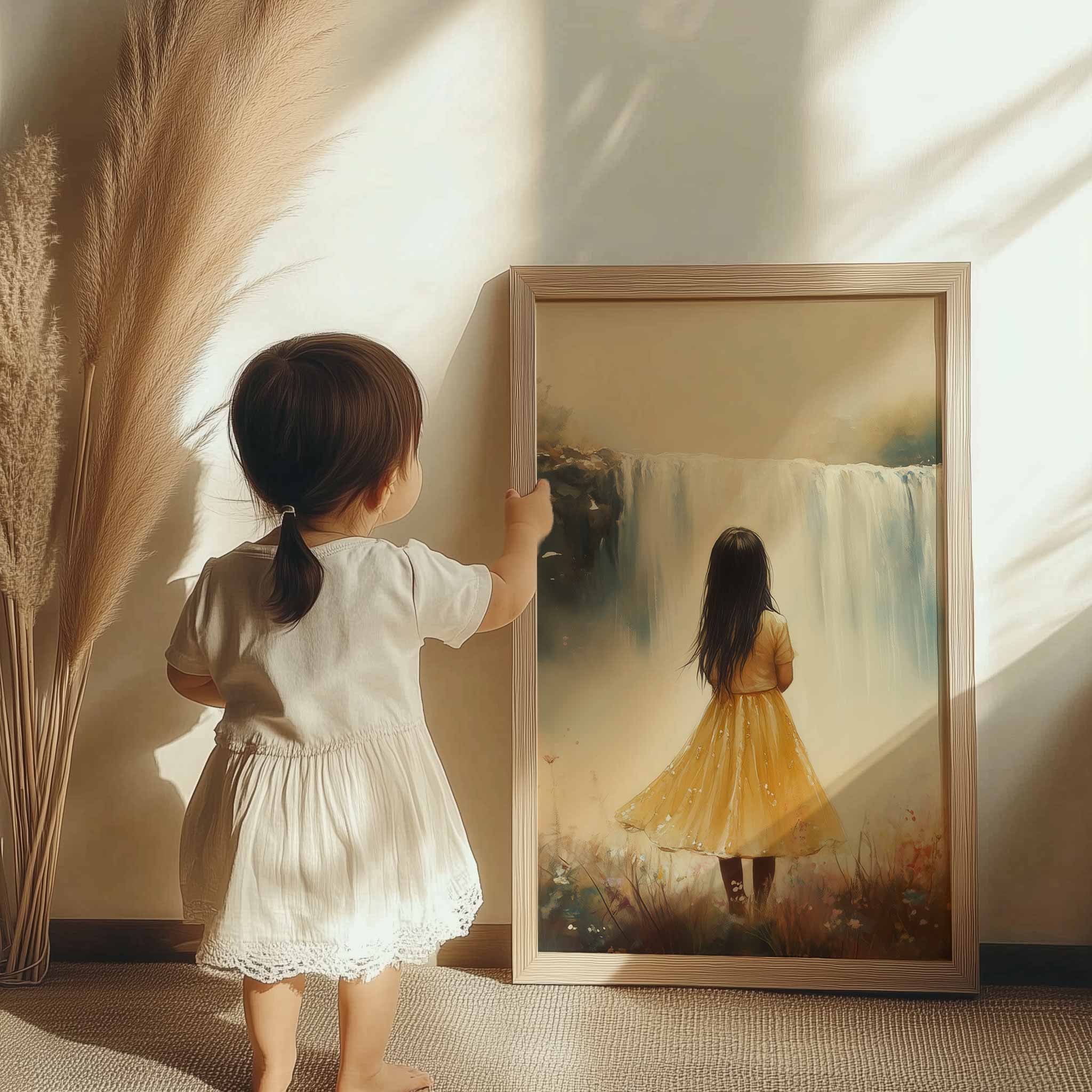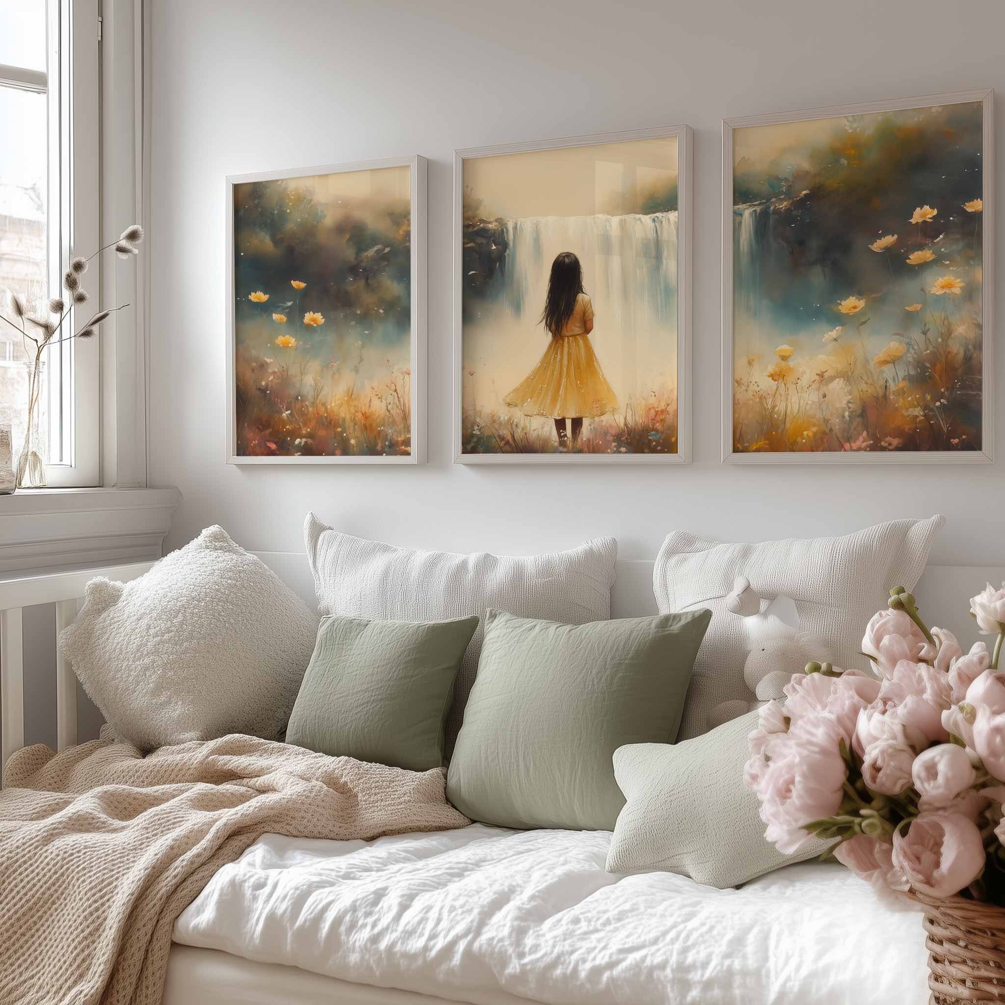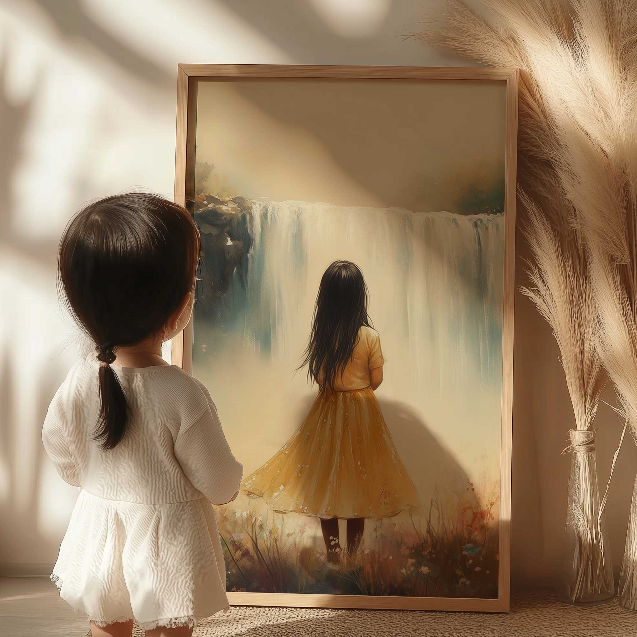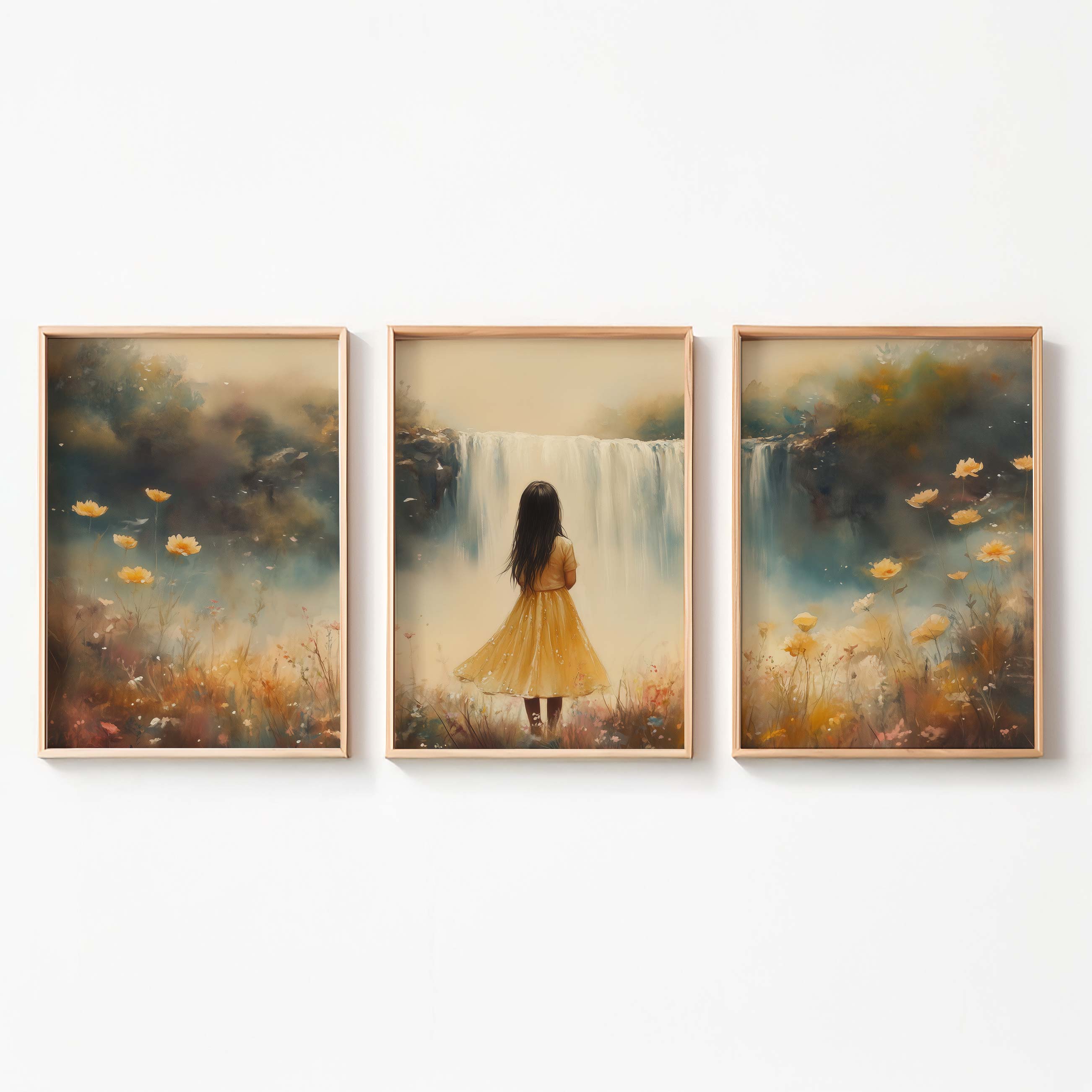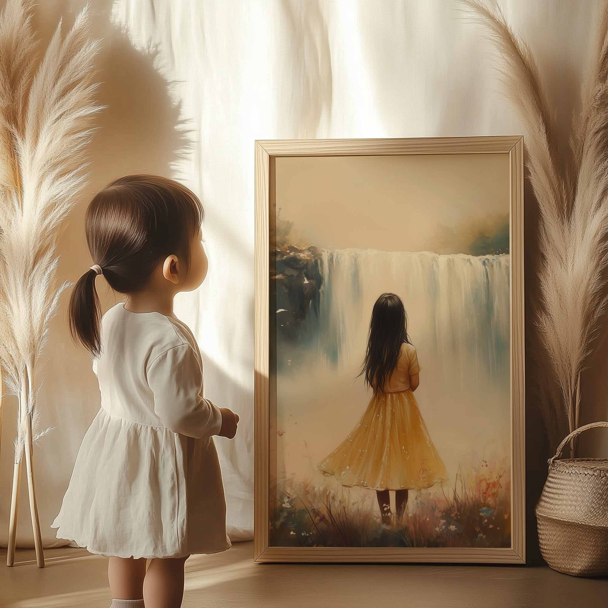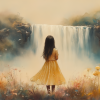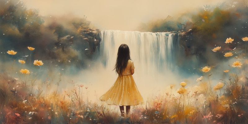 Magisch Meisje in Bloemenveld bij Waterval