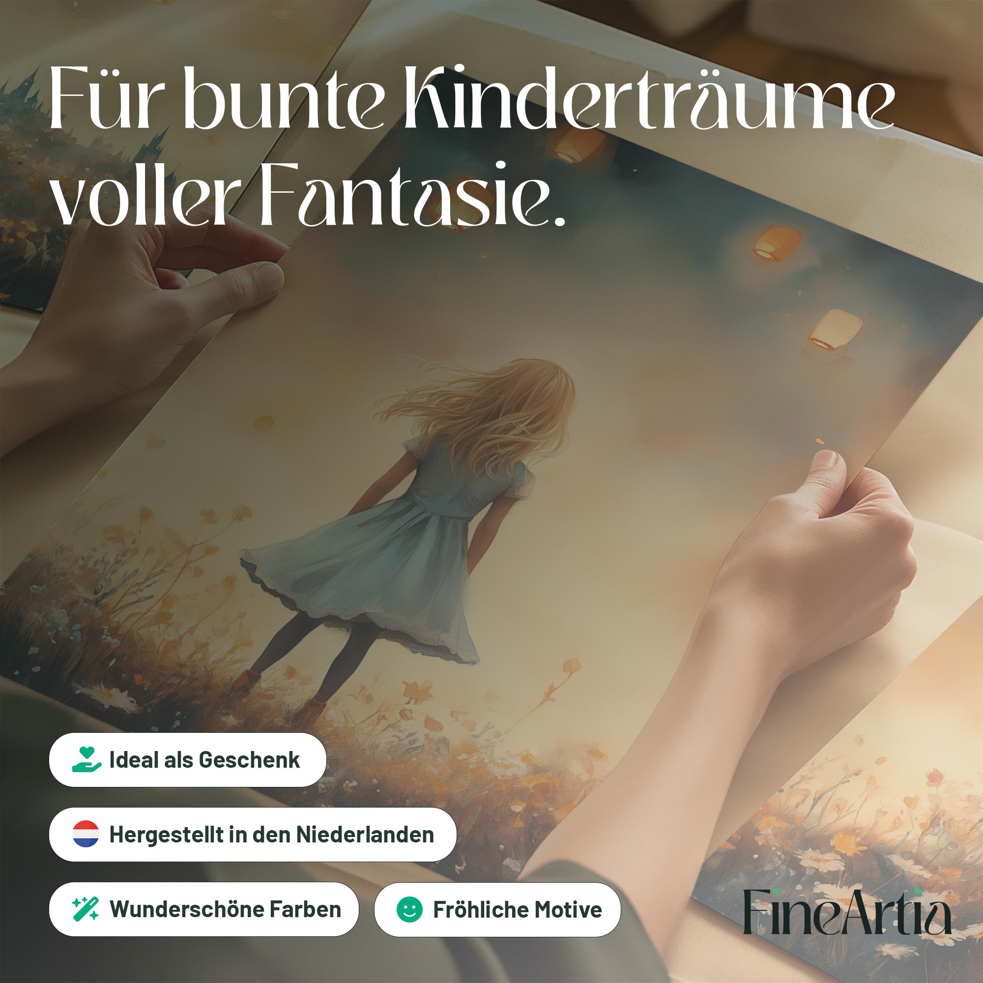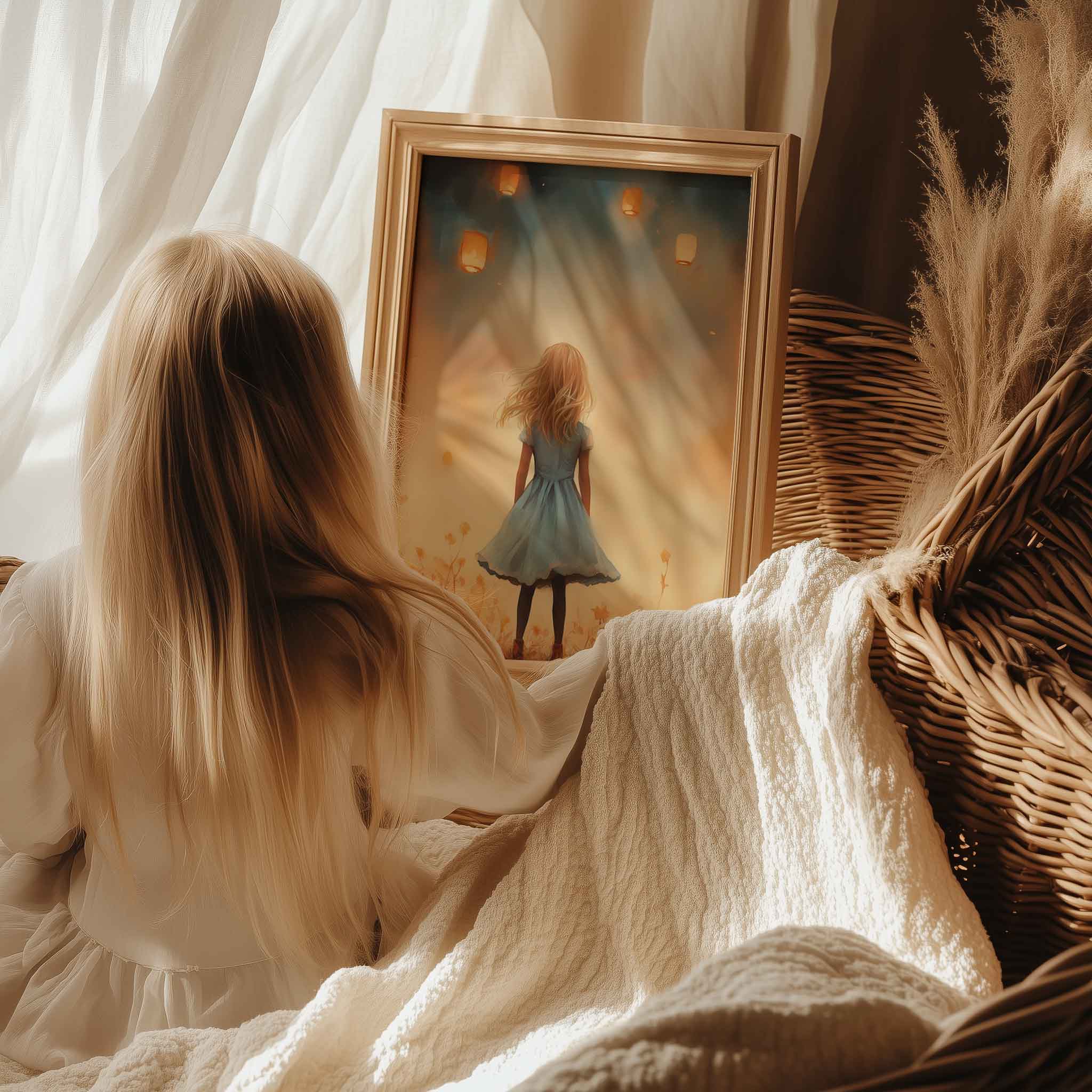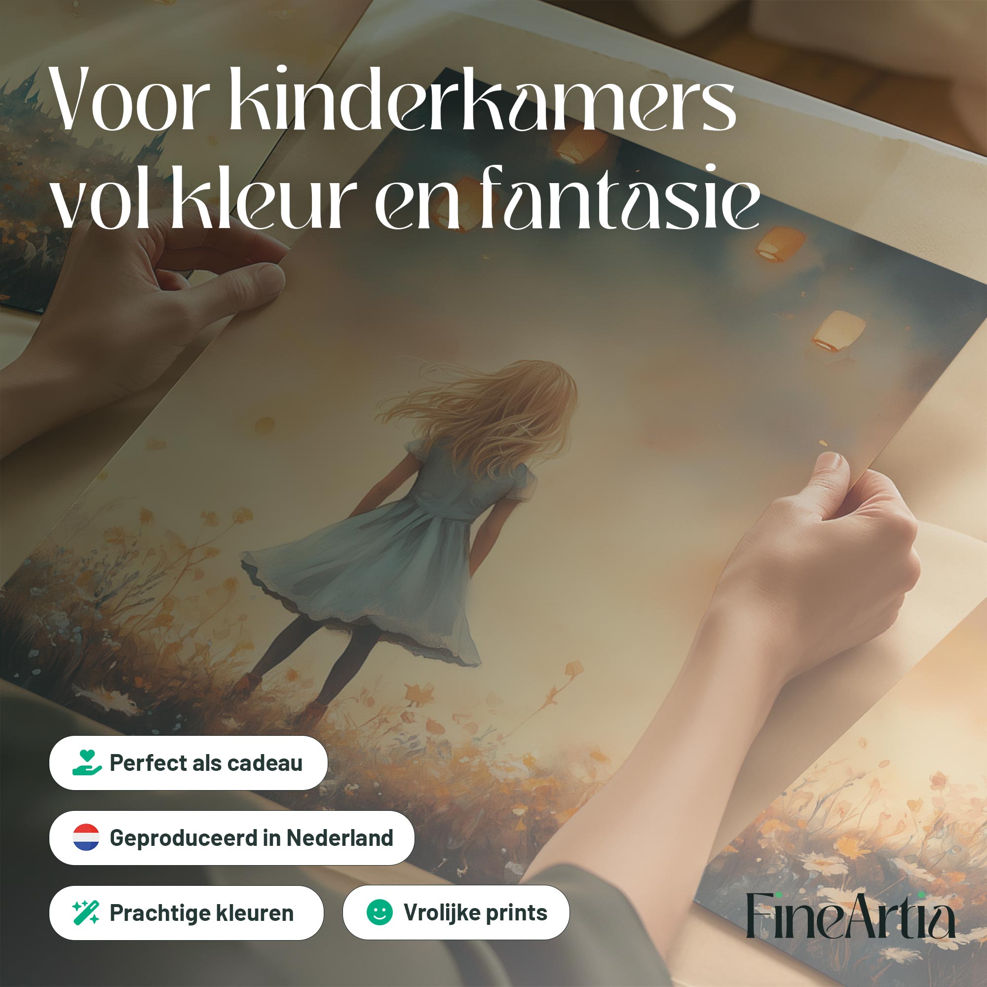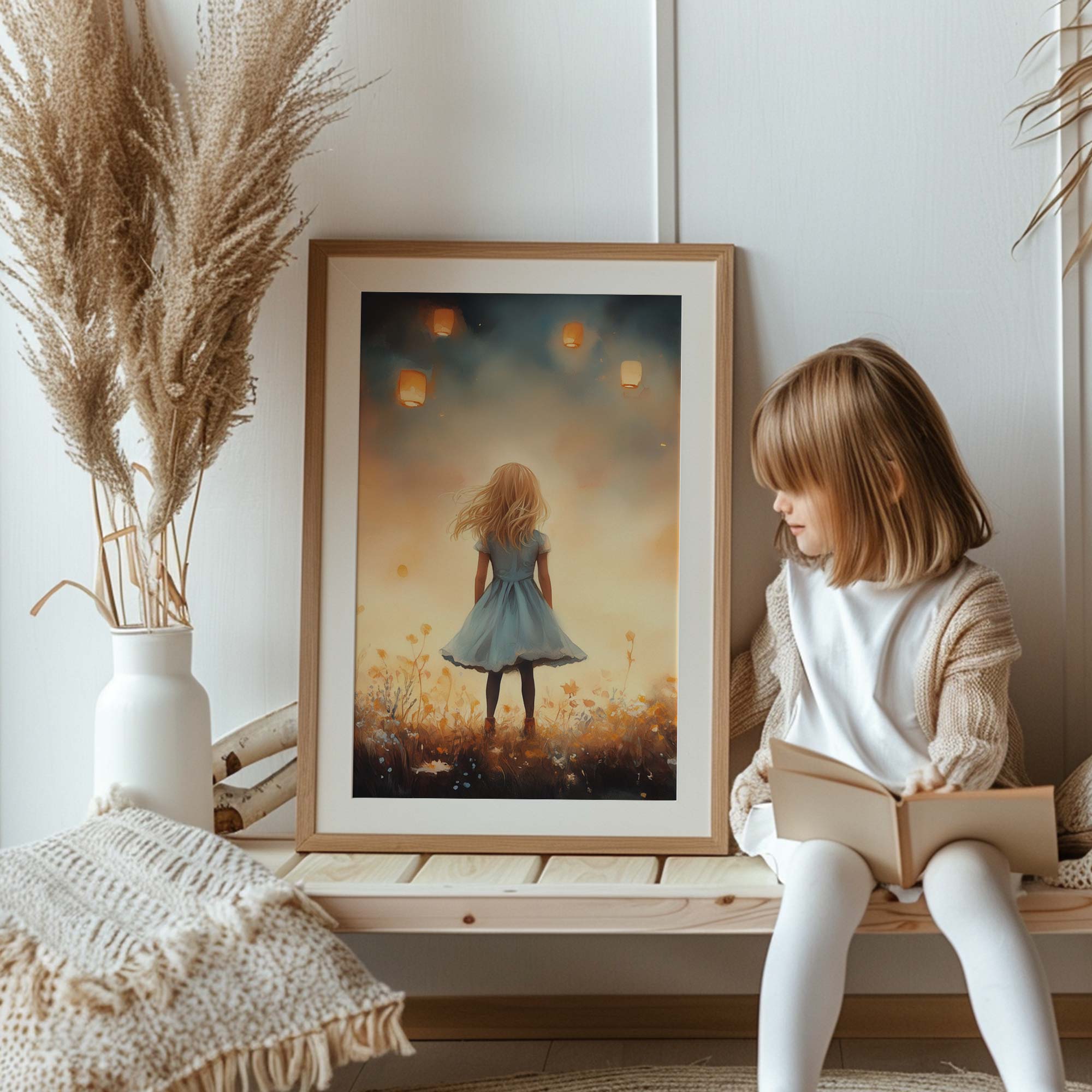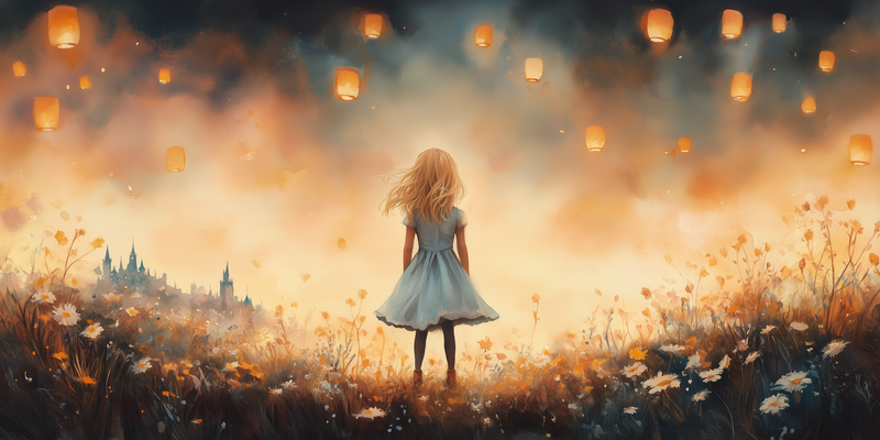 Magisch Meisje in Bloemenveld met Drijvende Lantaarns