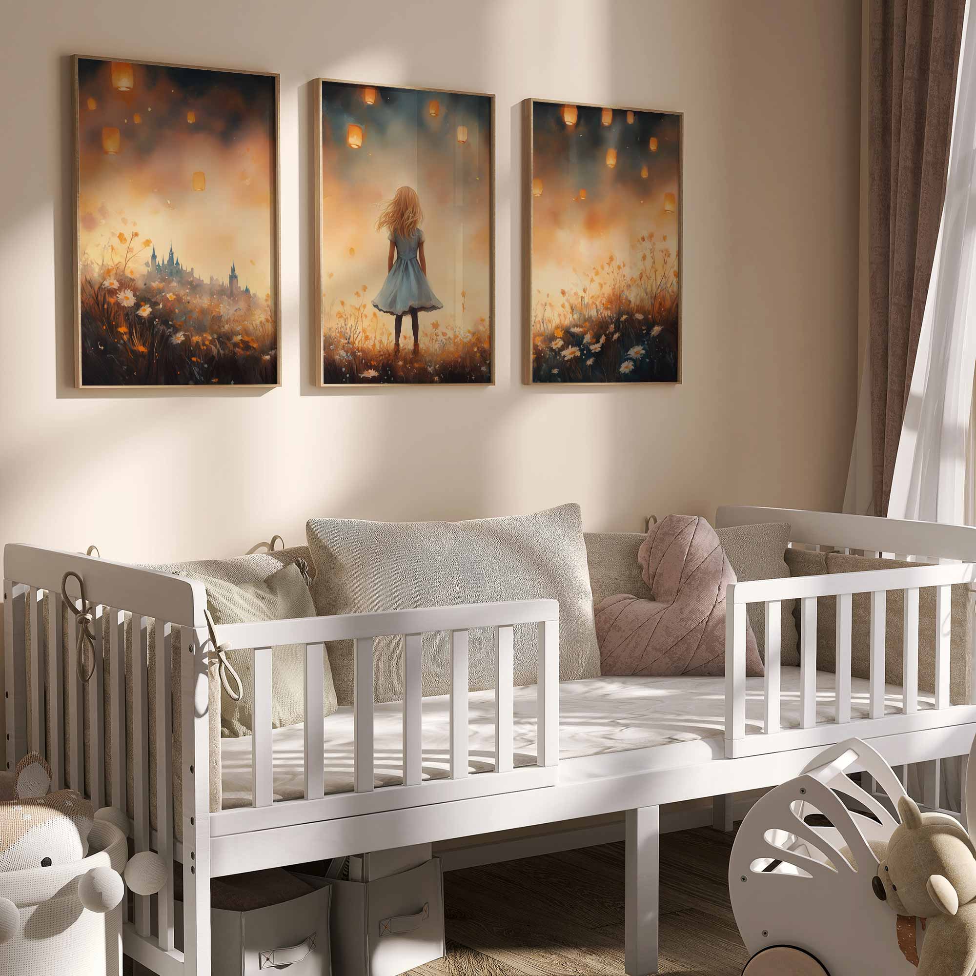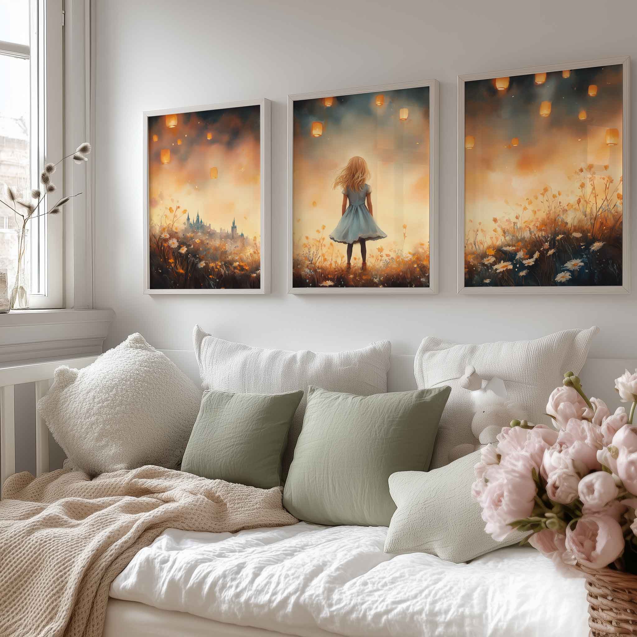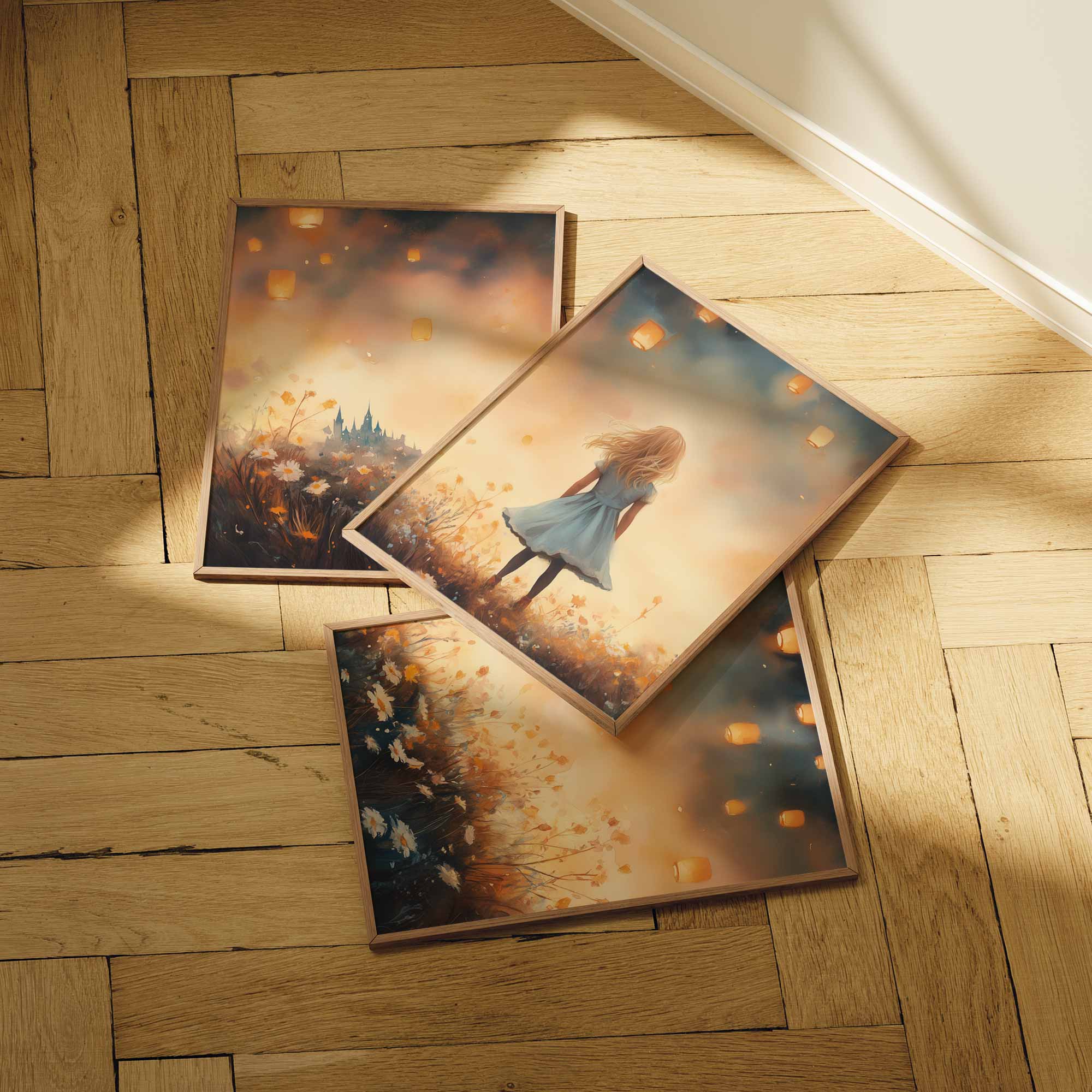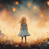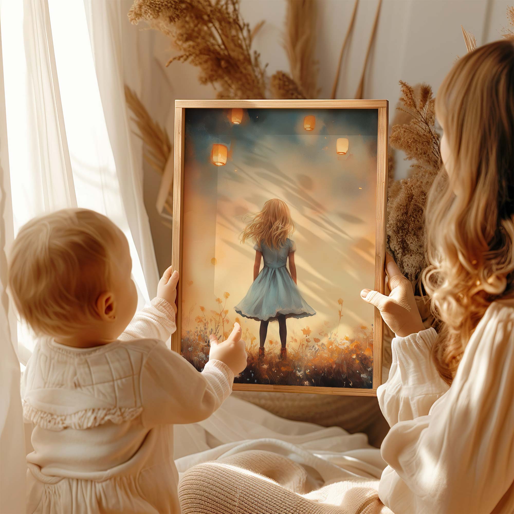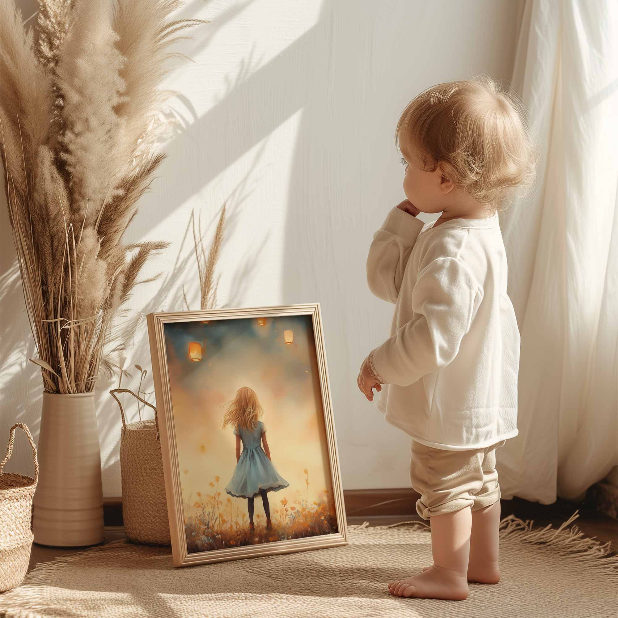 Magisch Meisje in Bloemenveld met Drijvende Lantaarns