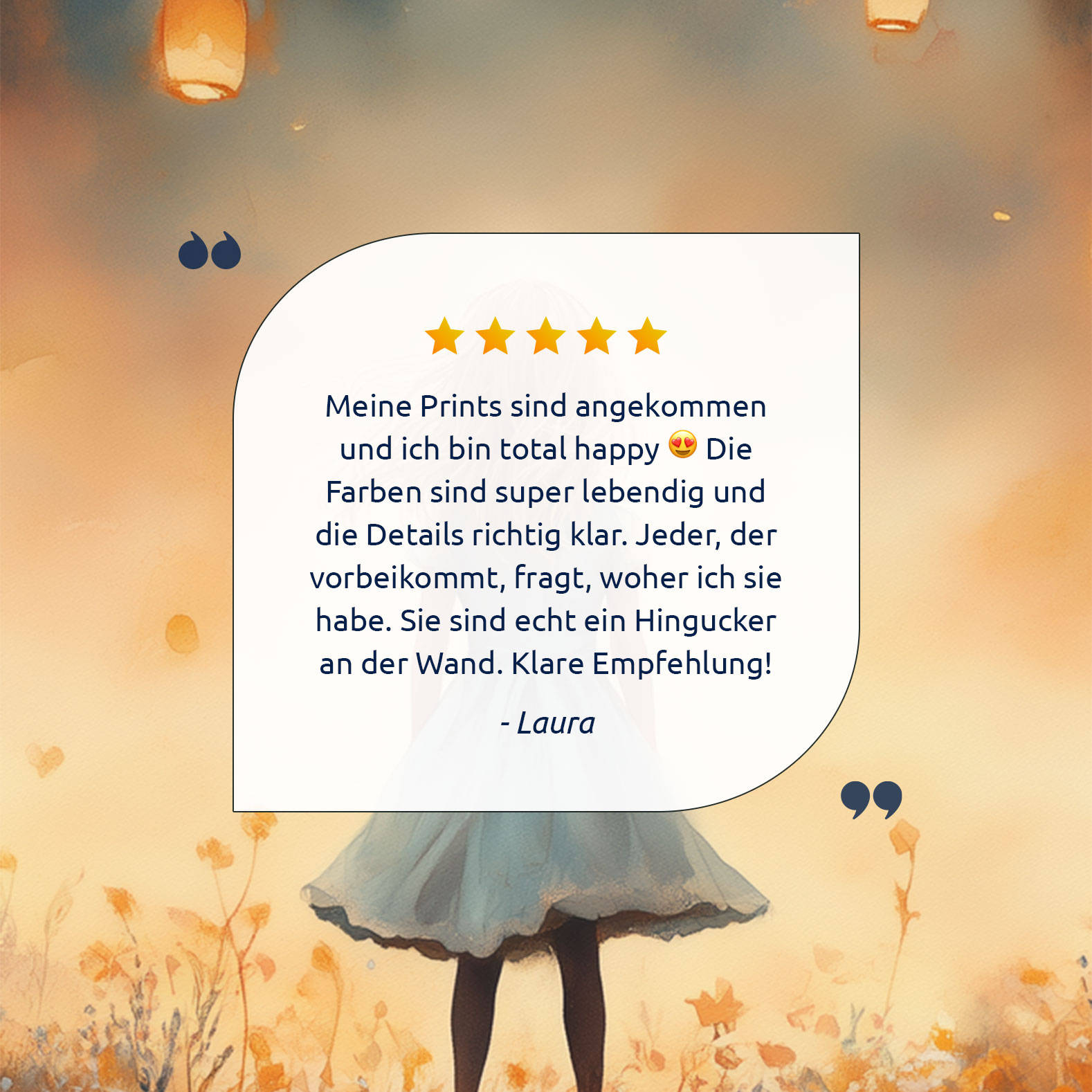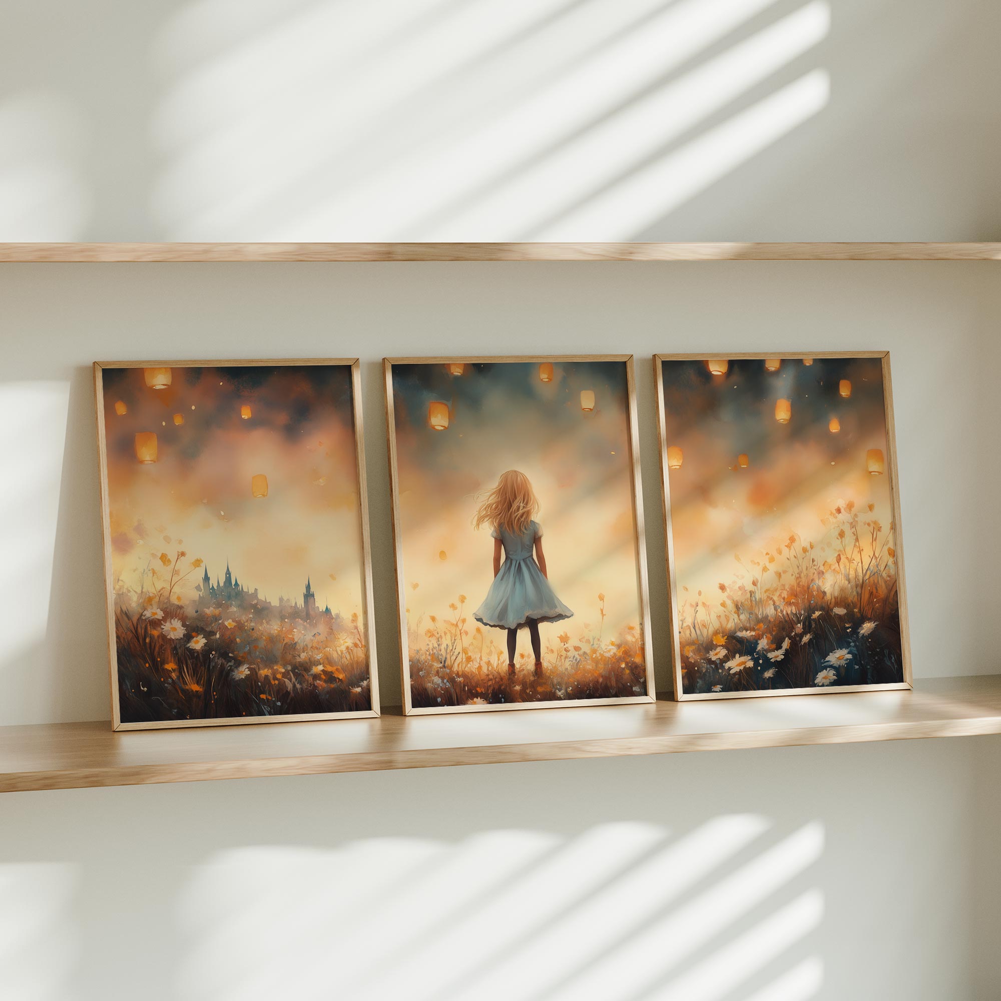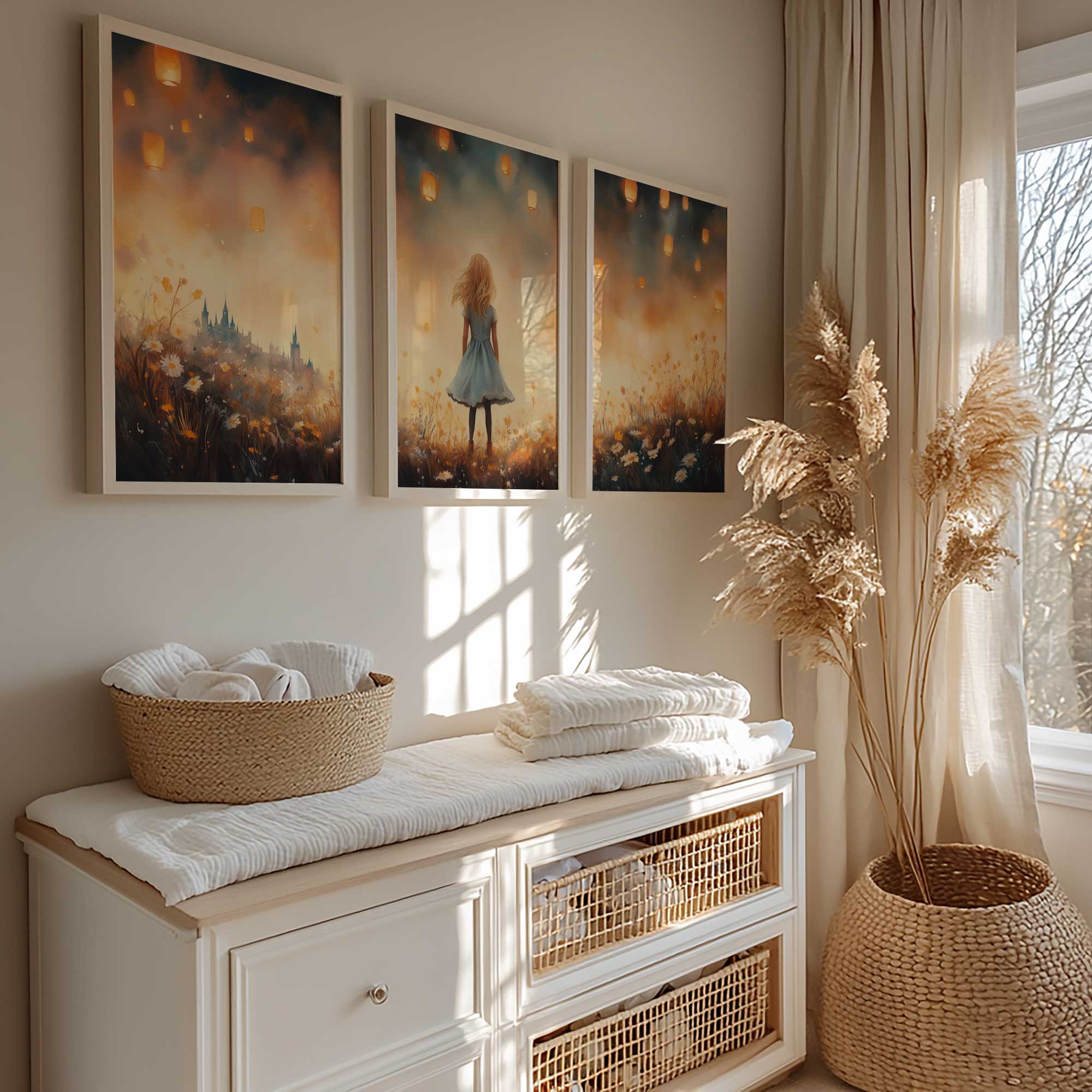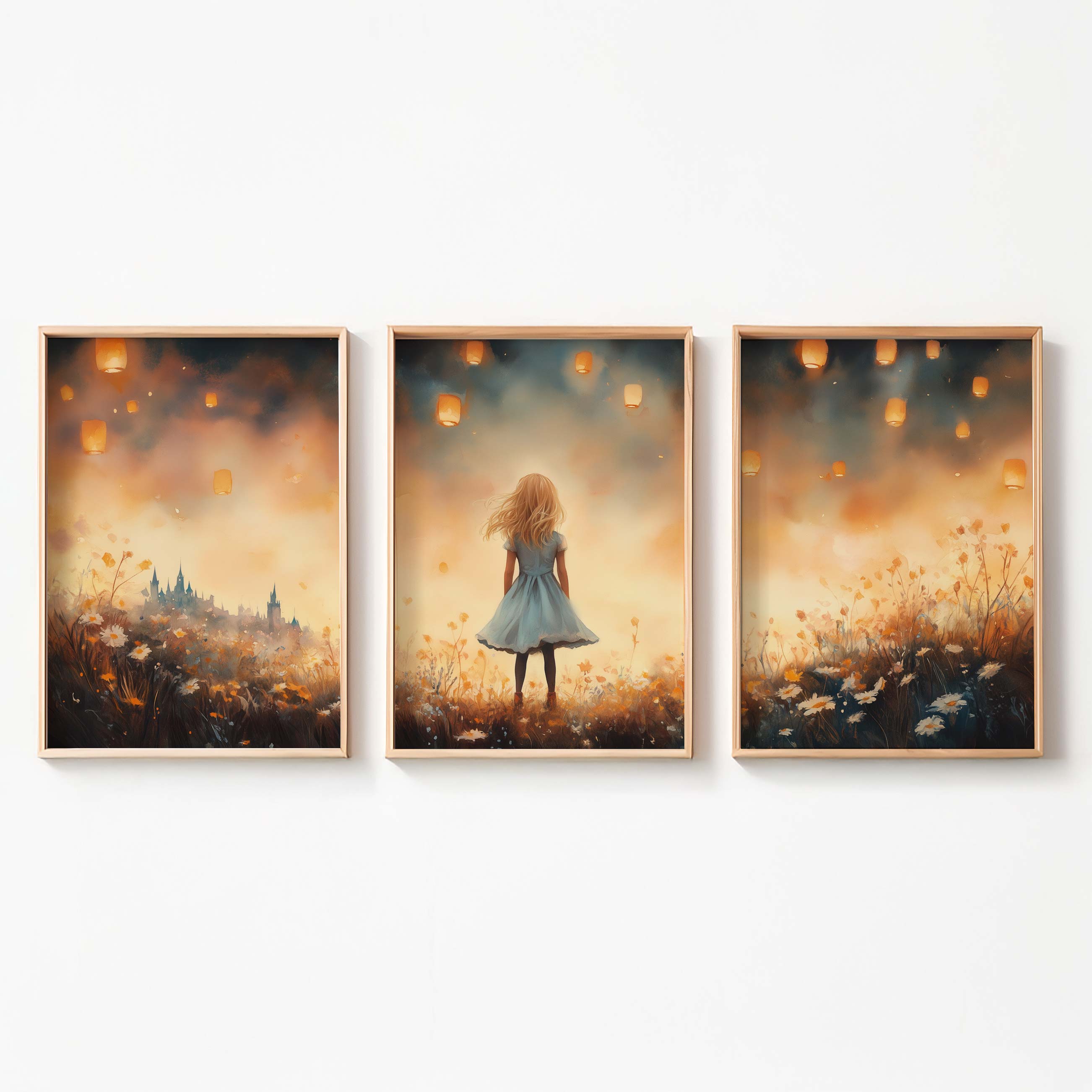Magisch Meisje in Bloemenveld met Drijvende Lantaarns