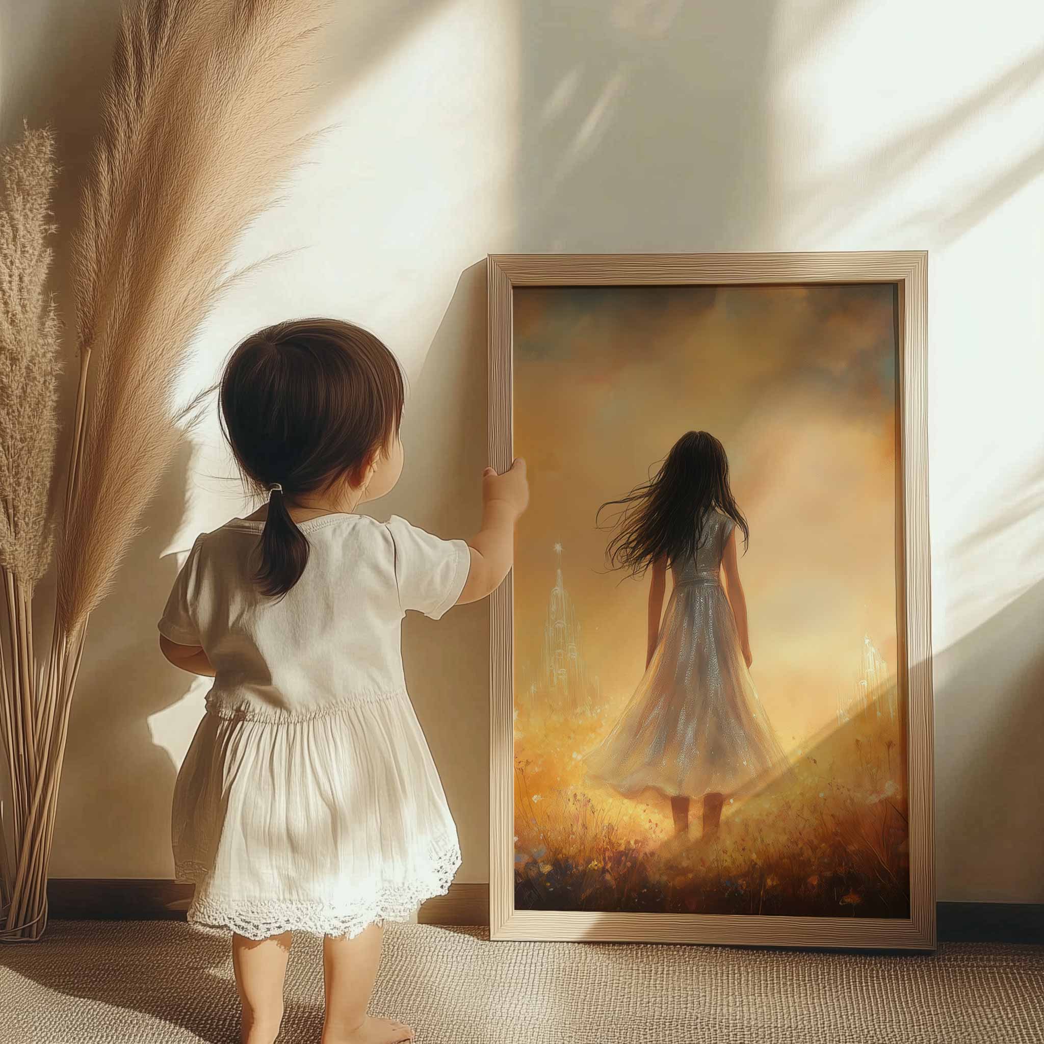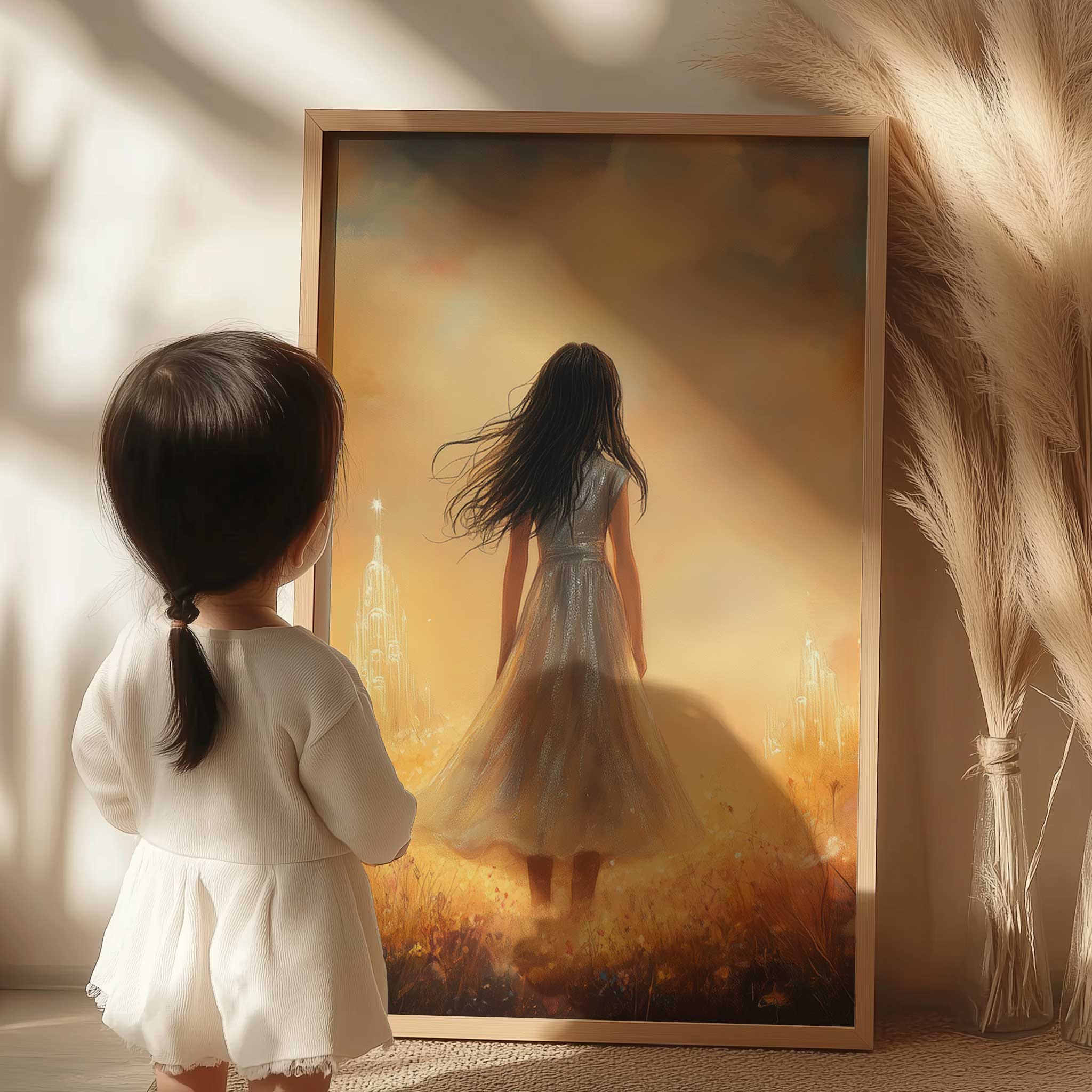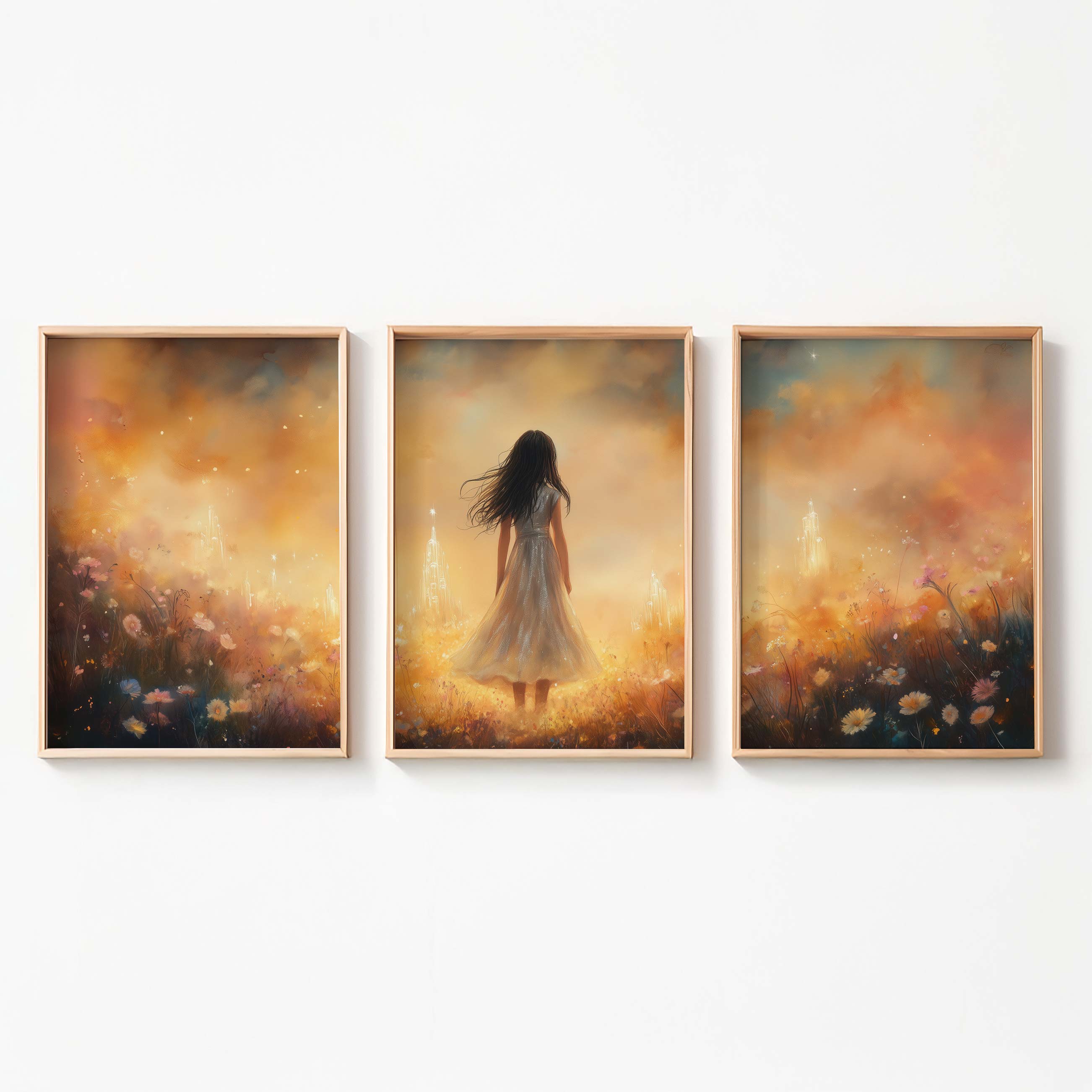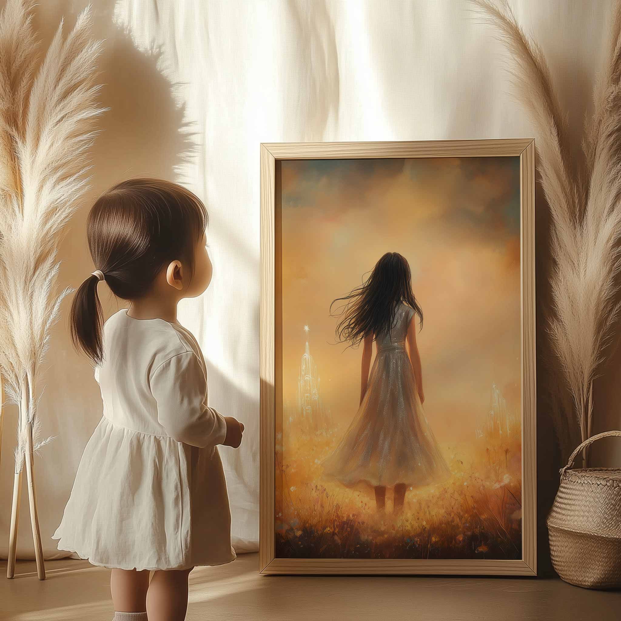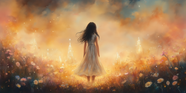 Magisch Meisje in Bloemenveld met Droomkasteel