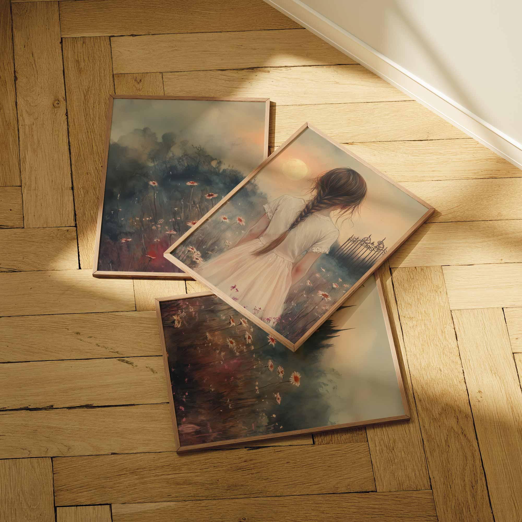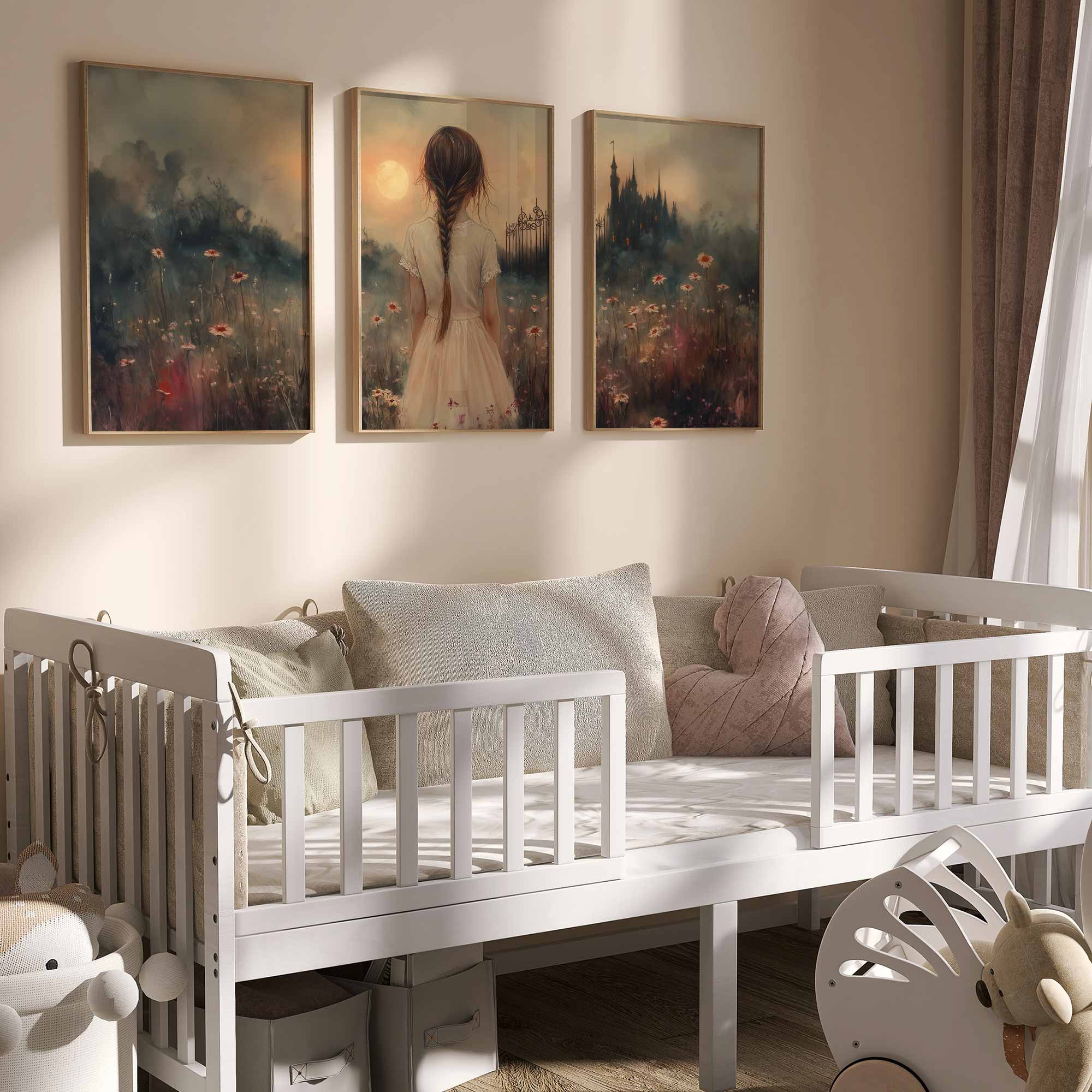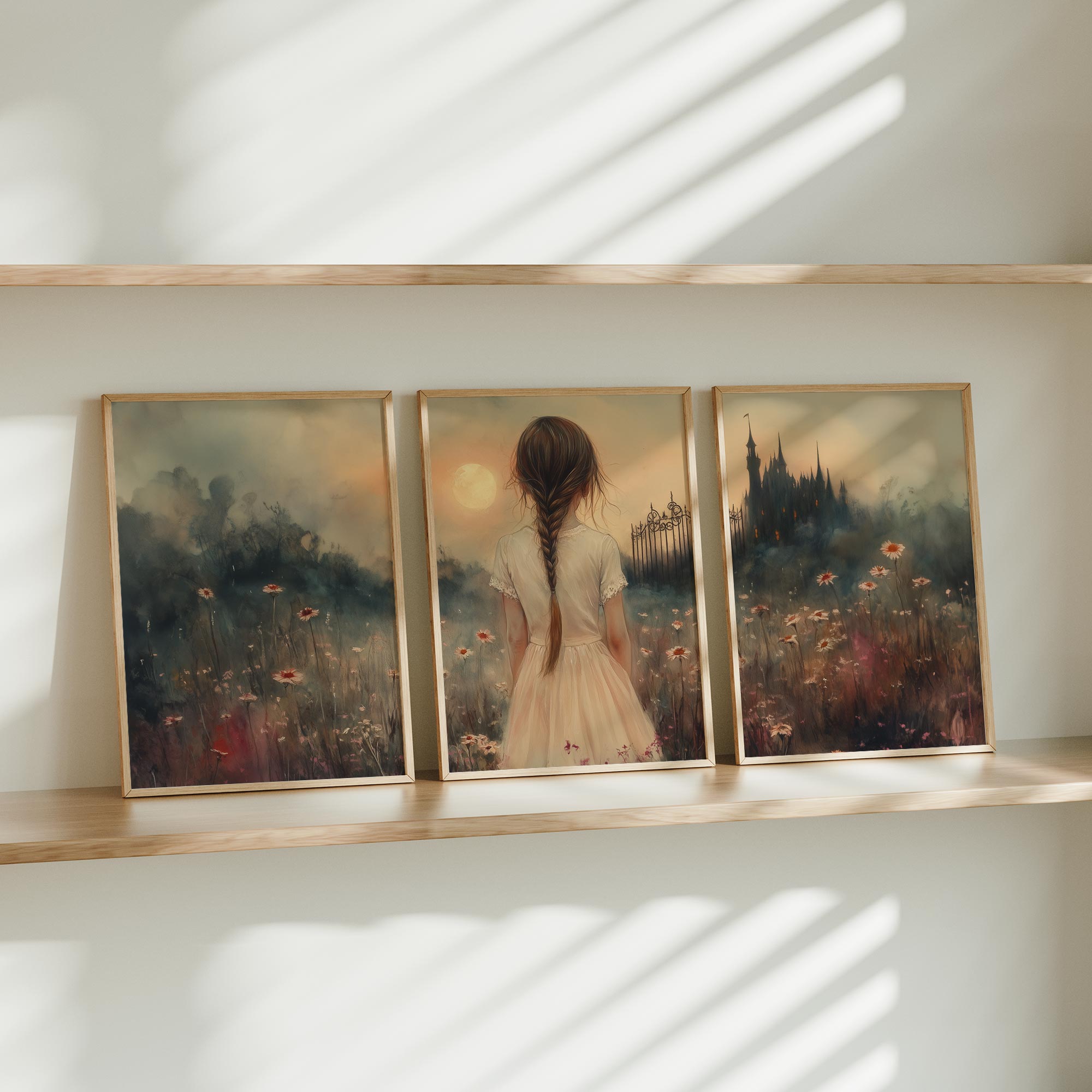 Terug naar collectie Posters Magisch Meisje in Bloemenveld met Droomkasteel