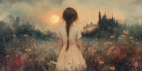 Magisch Meisje in Bloemenveld met Droomkasteel