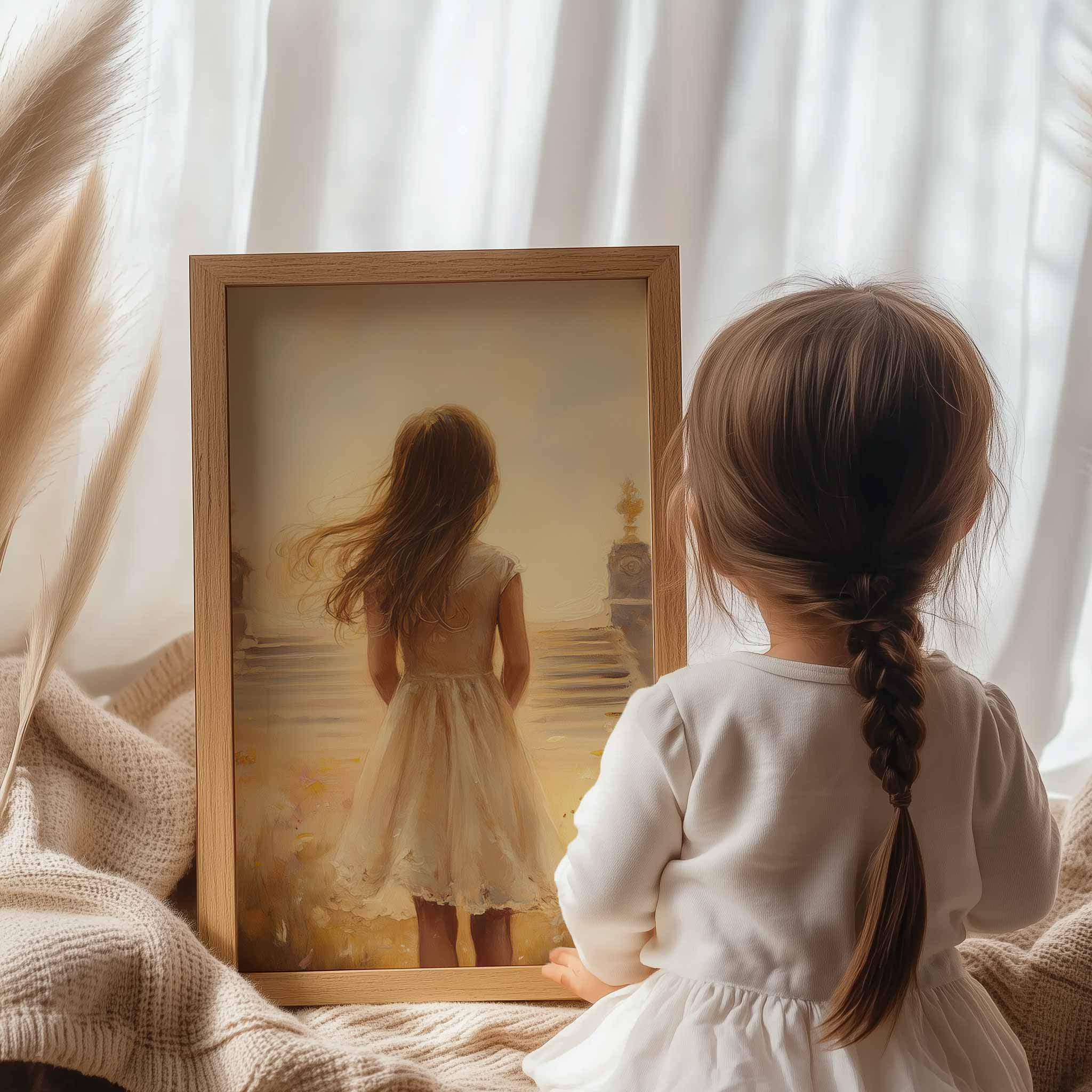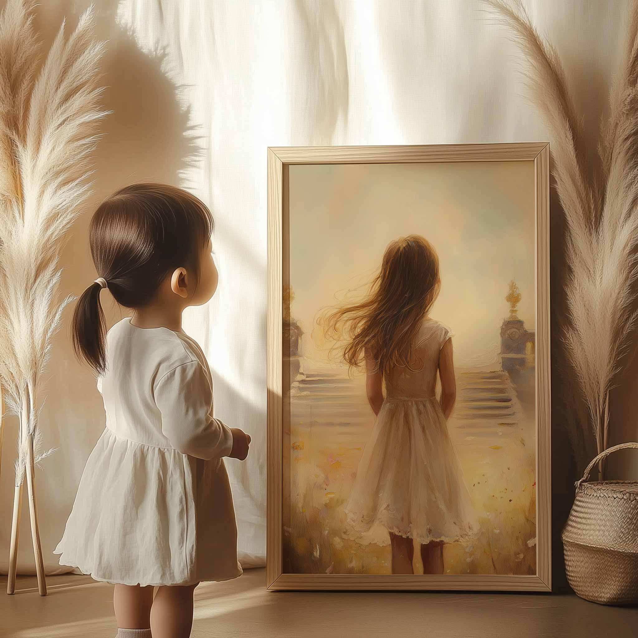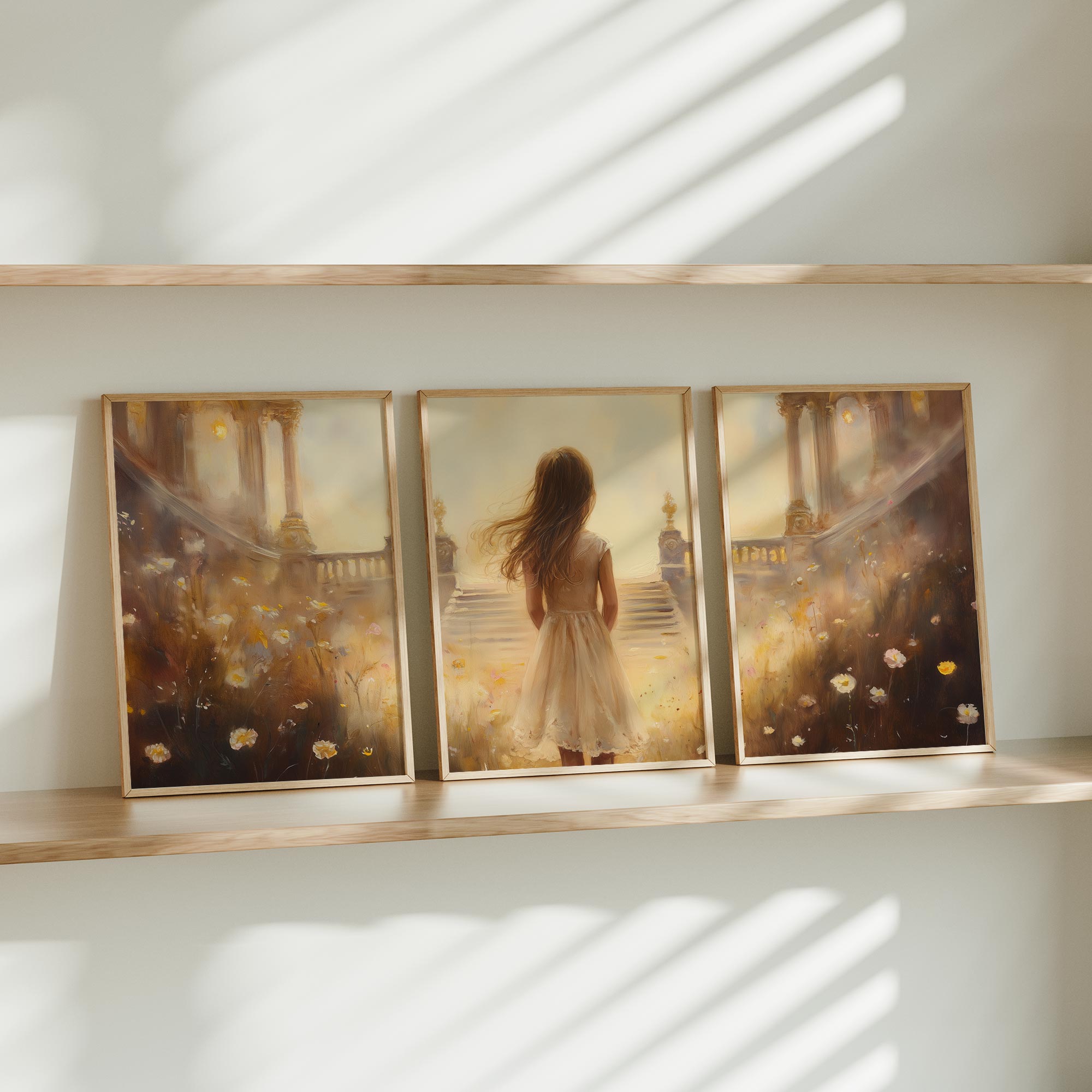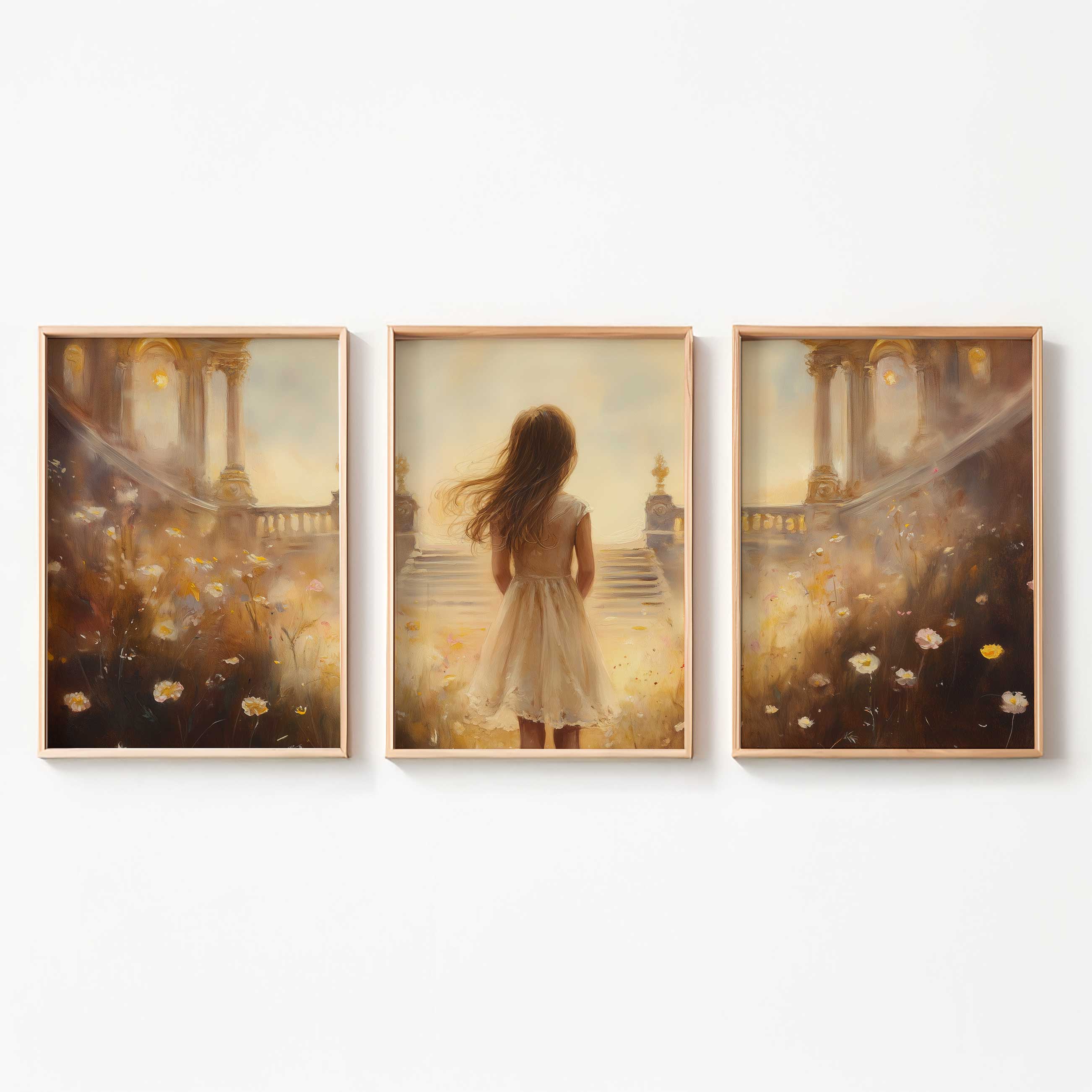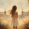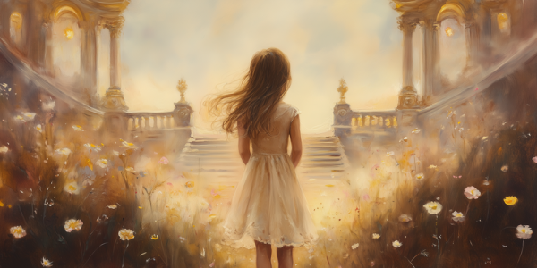 Magisch Meisje in Bloemenveld met Gouden Kasteel