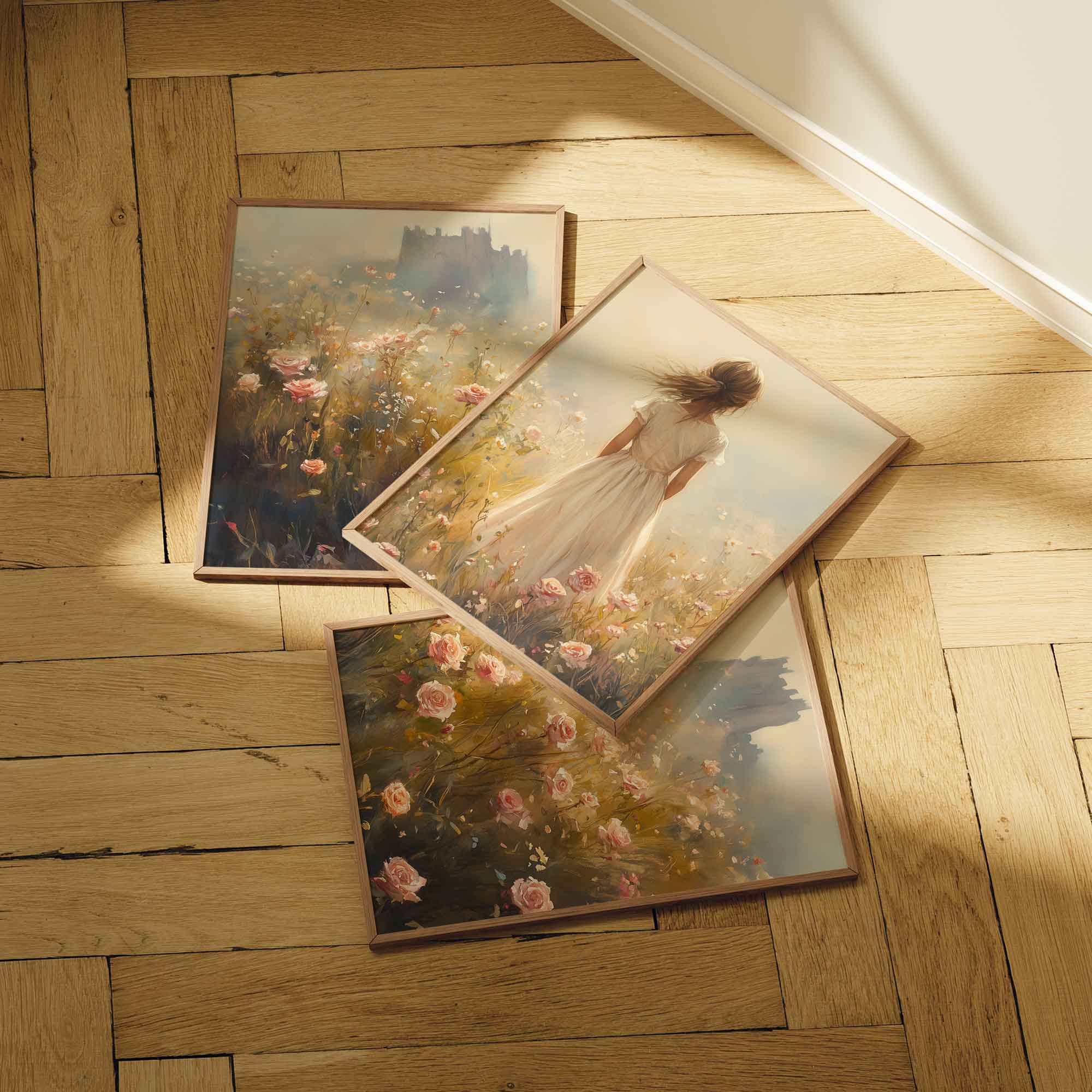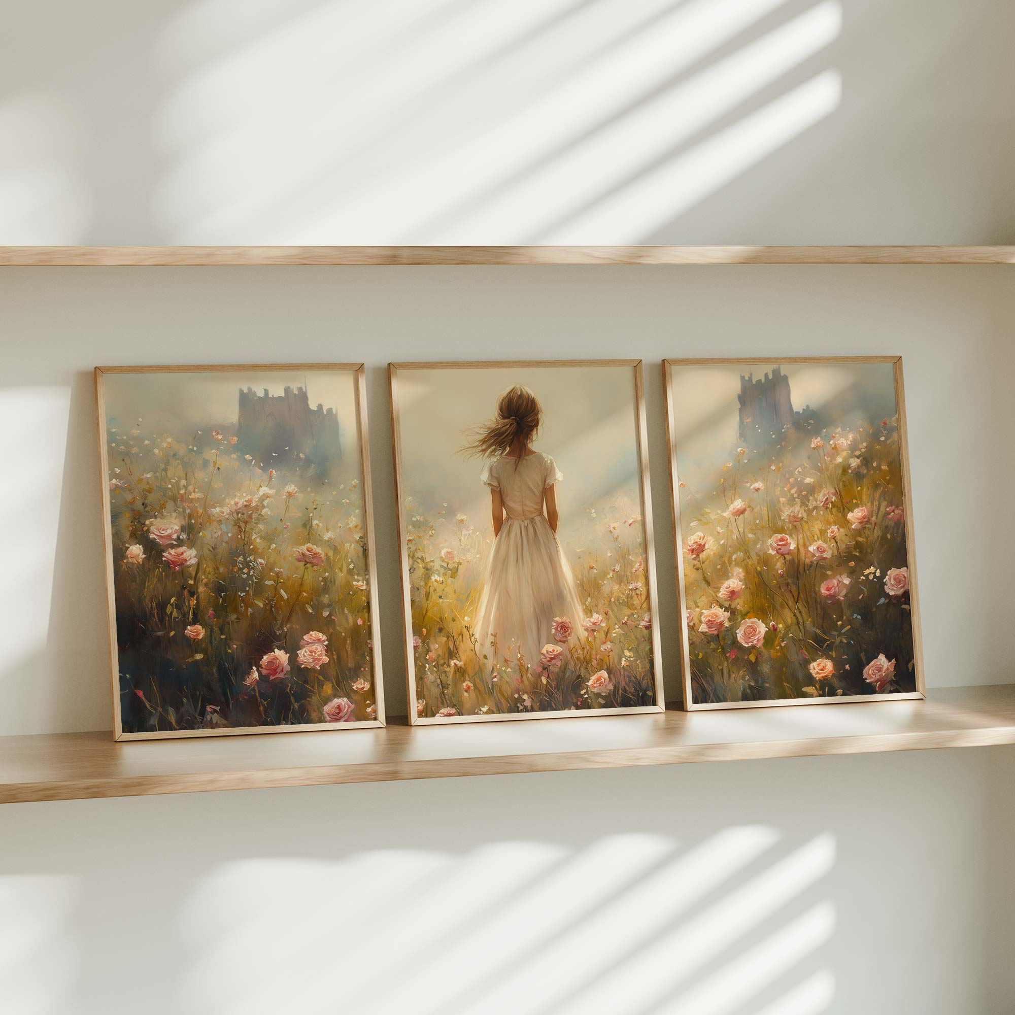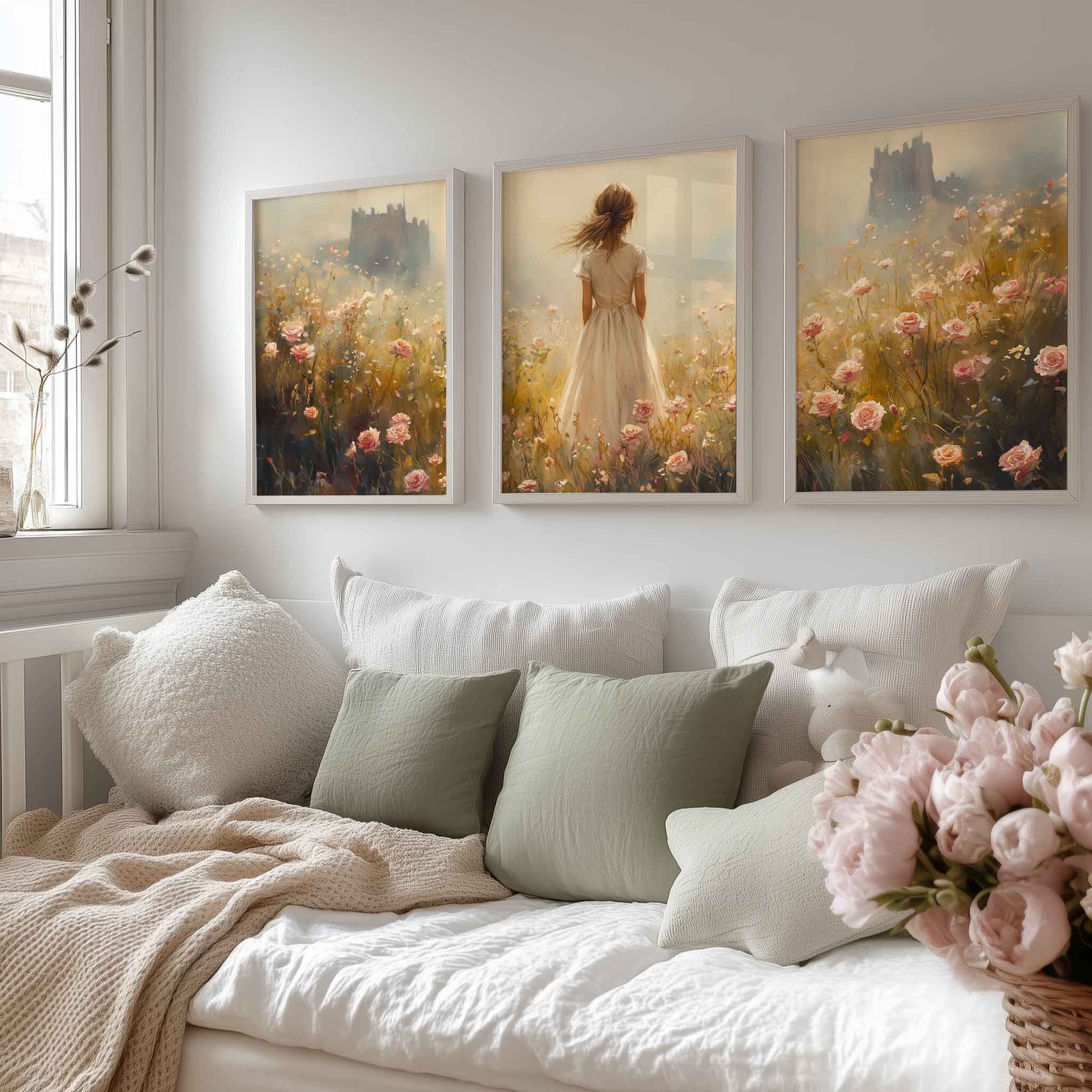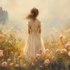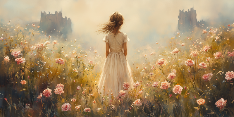 Magisch Meisje in Bloemenveld met Kasteelachtergrond