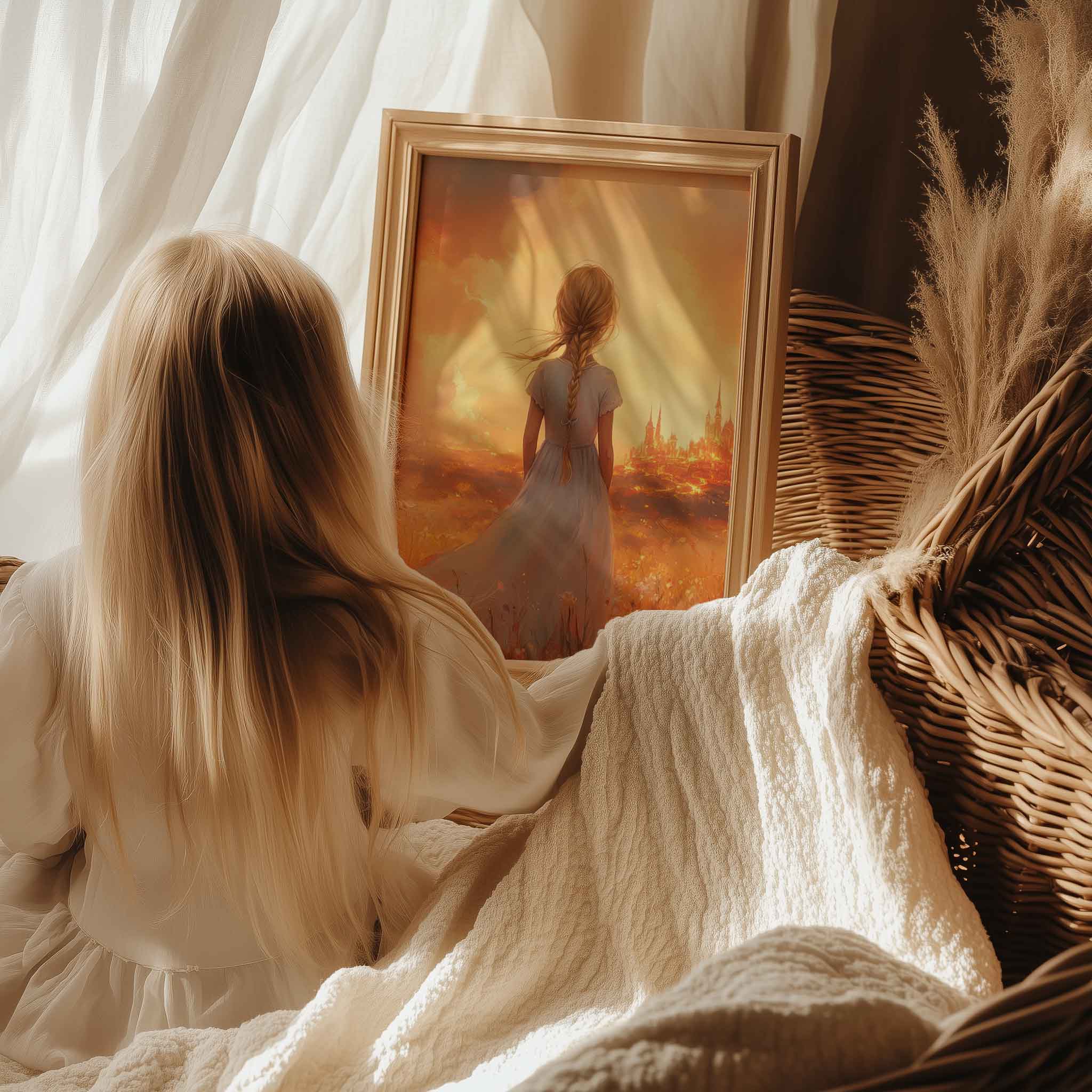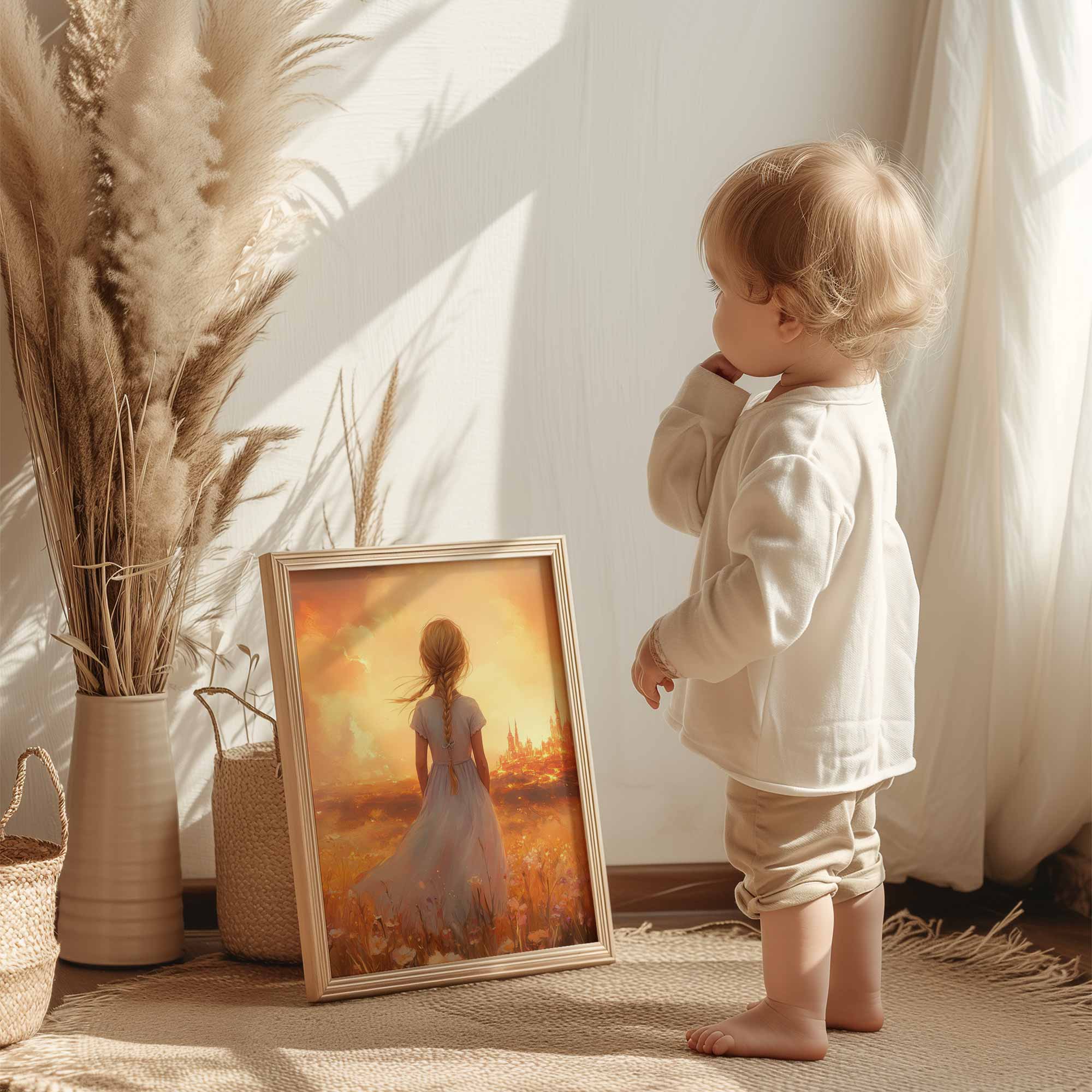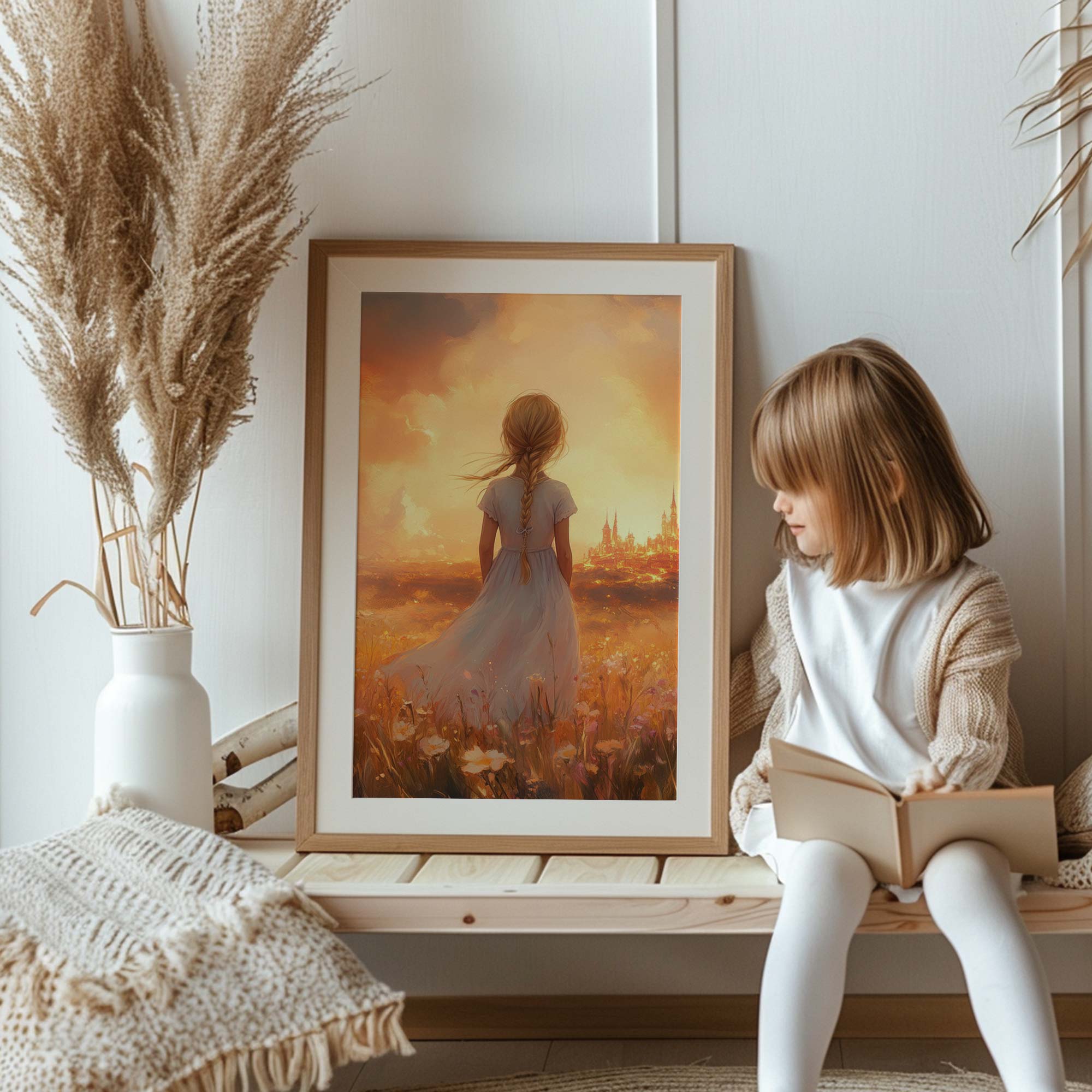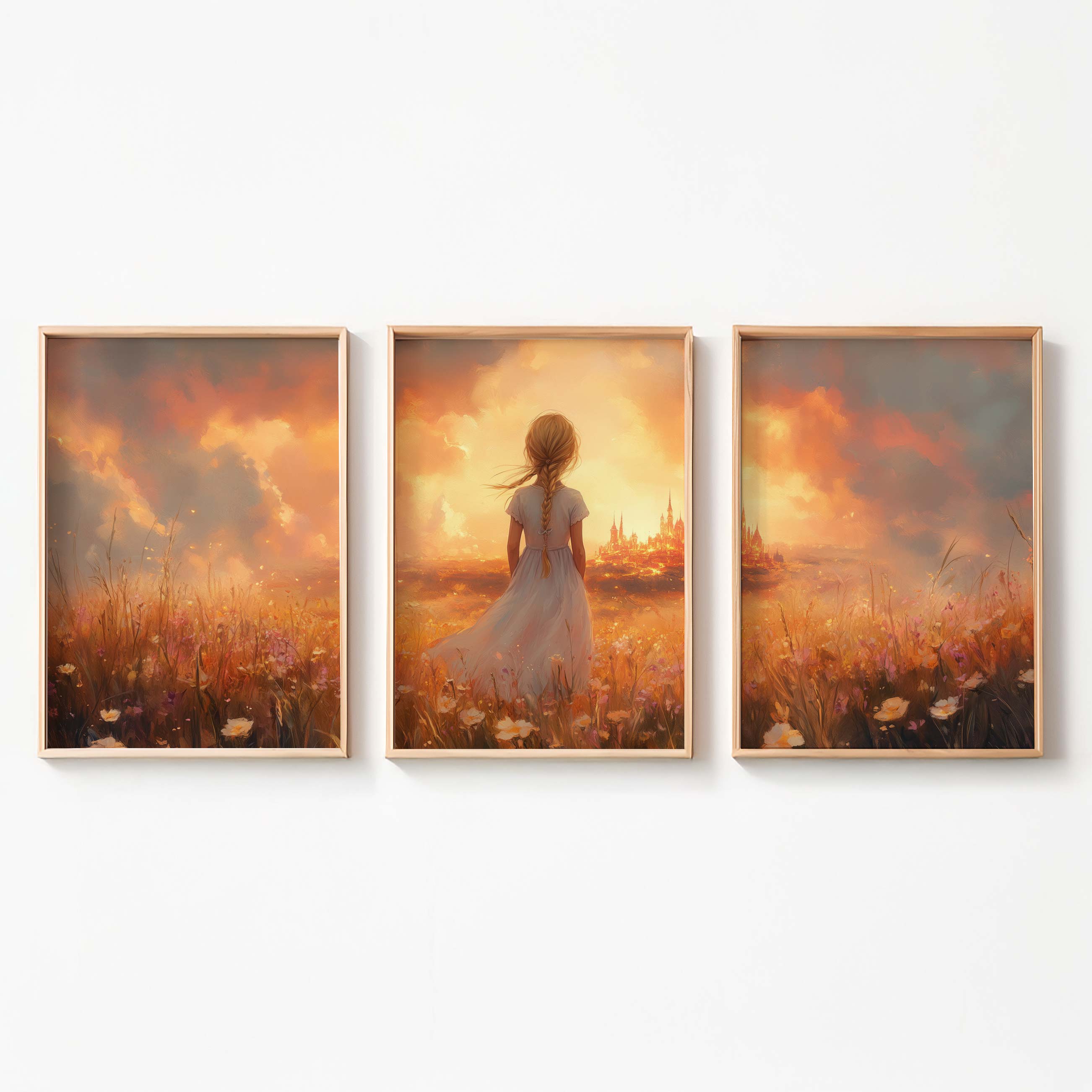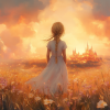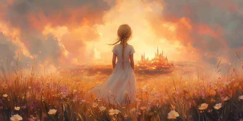 Magisch Meisje in Bloemenveld met Sprookjeskasteel