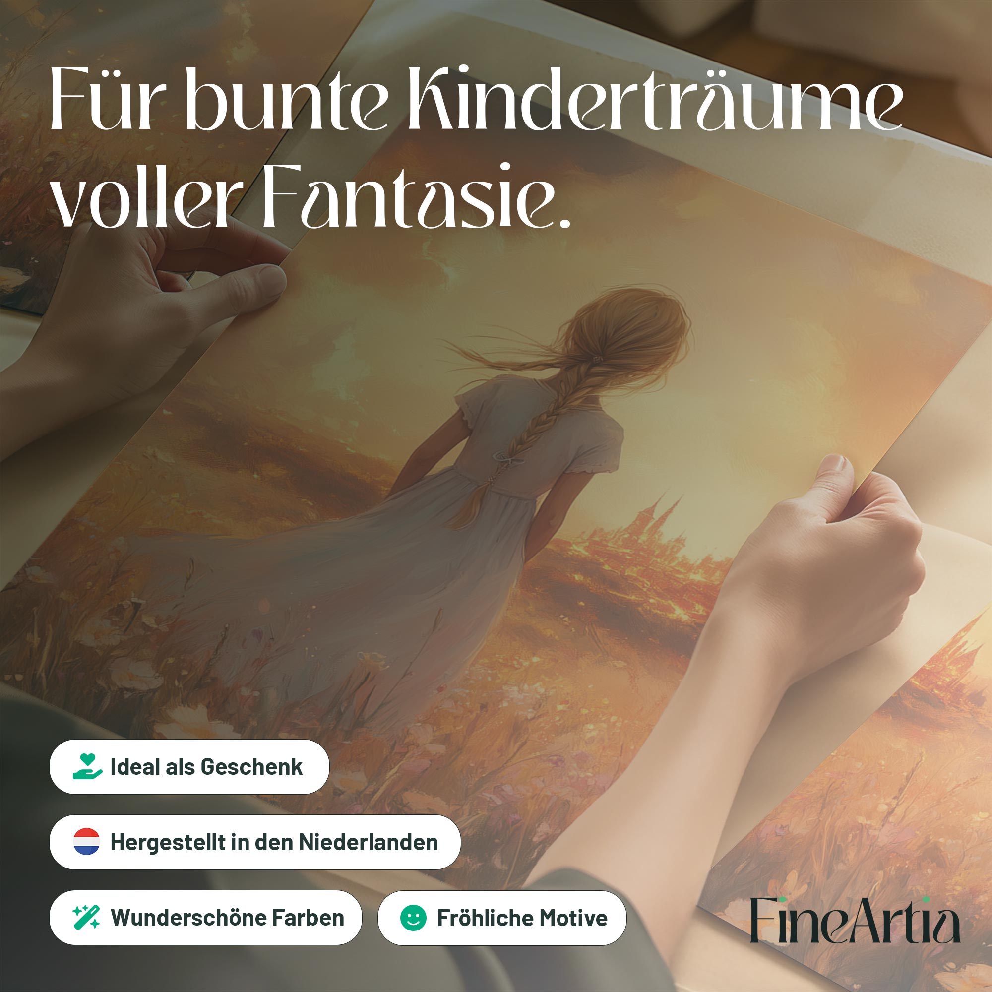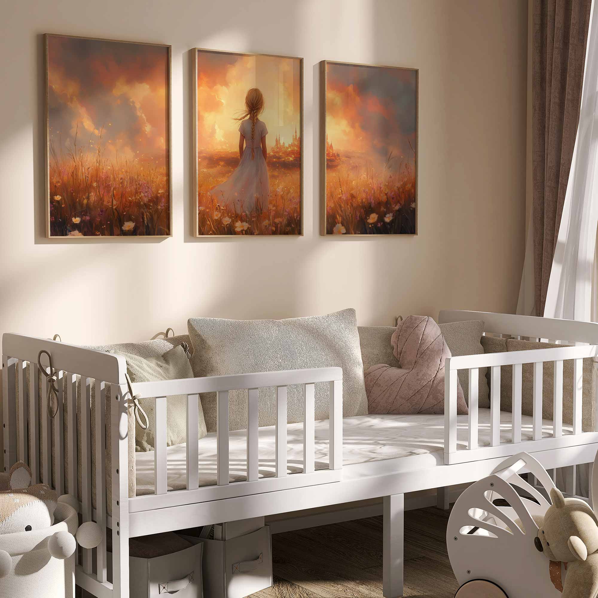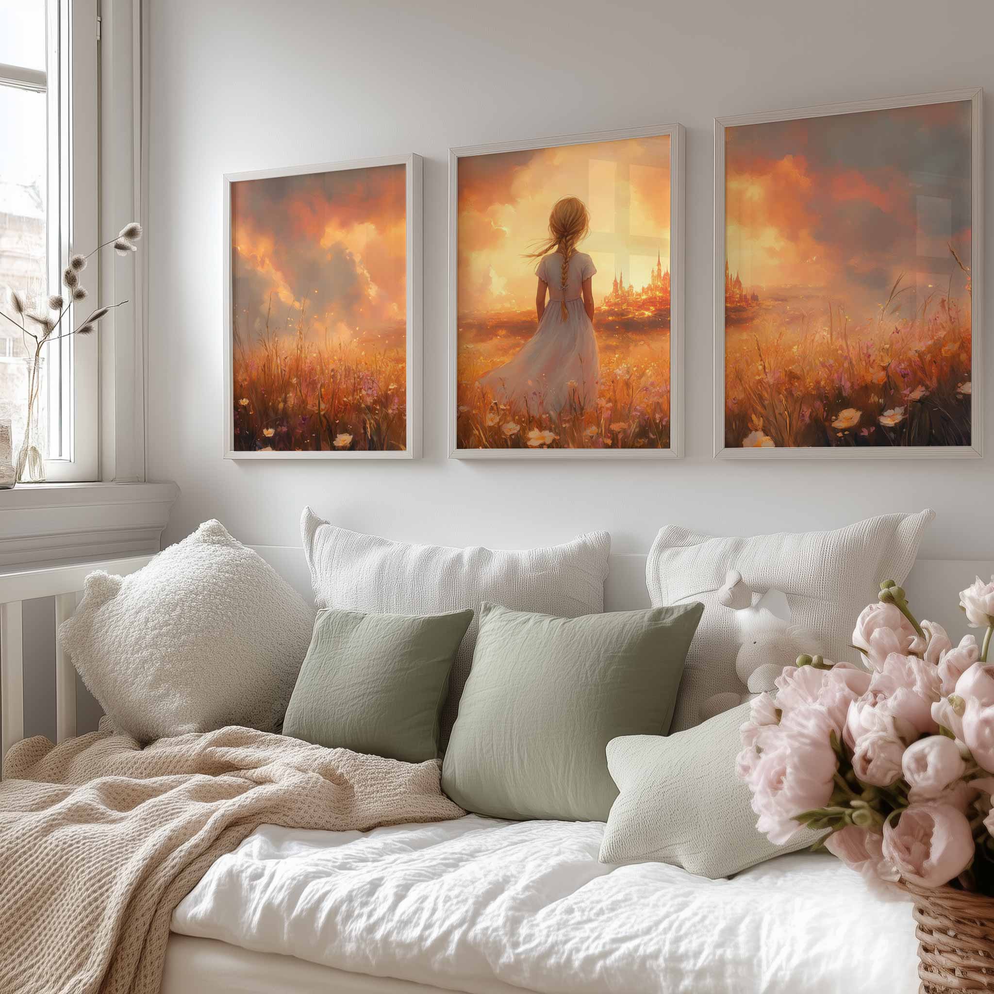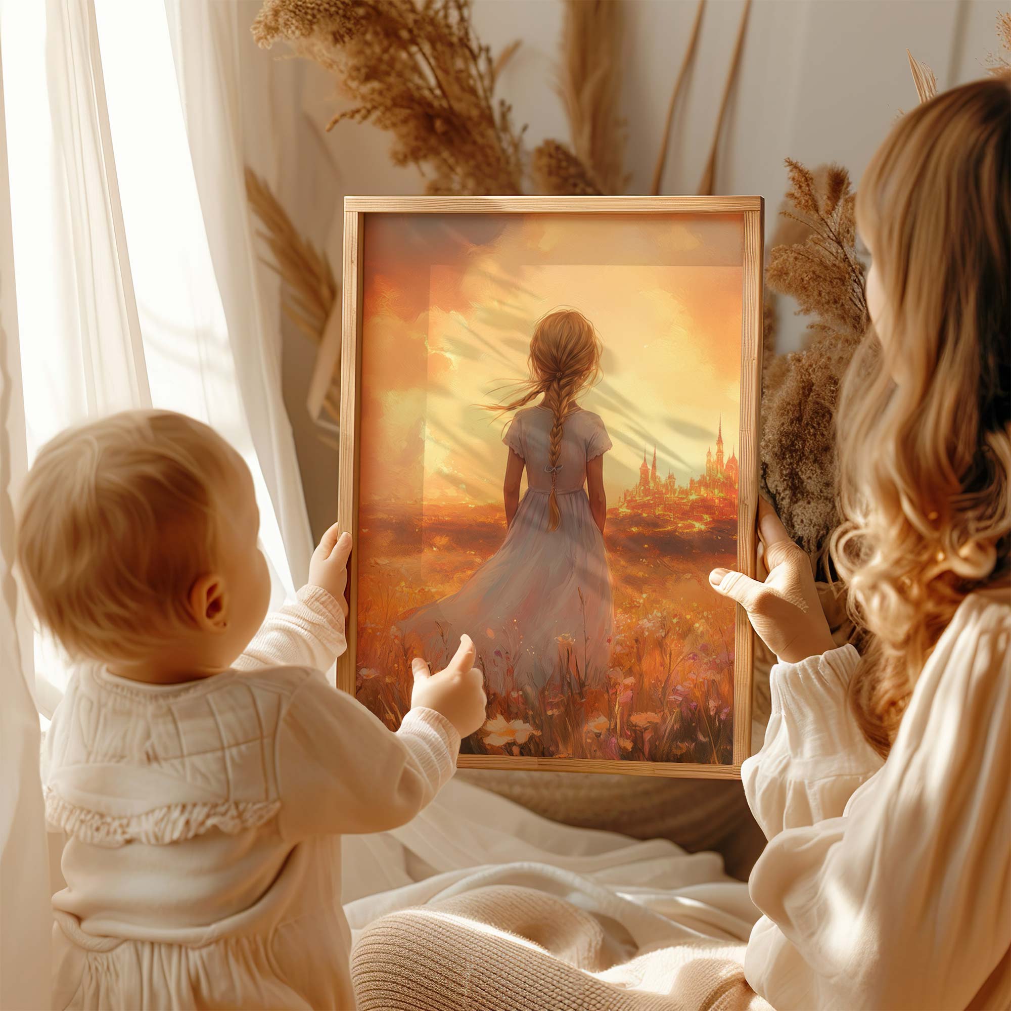 Magisch Meisje in Bloemenveld met Sprookjeskasteel