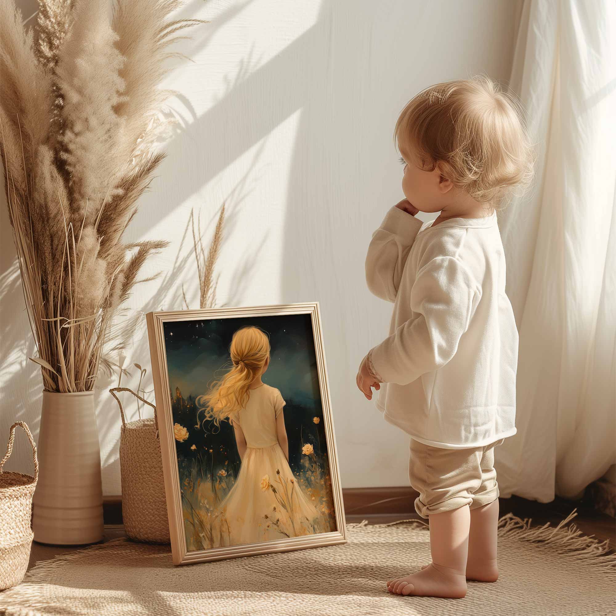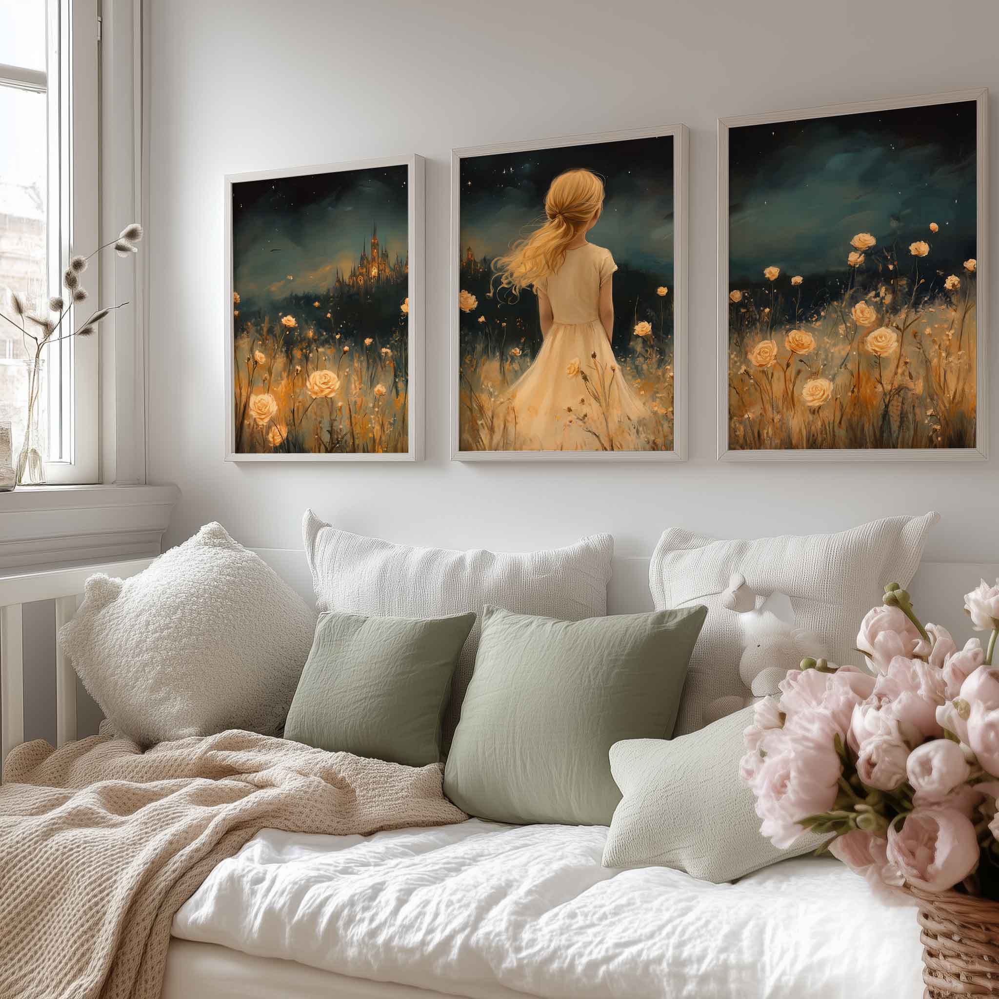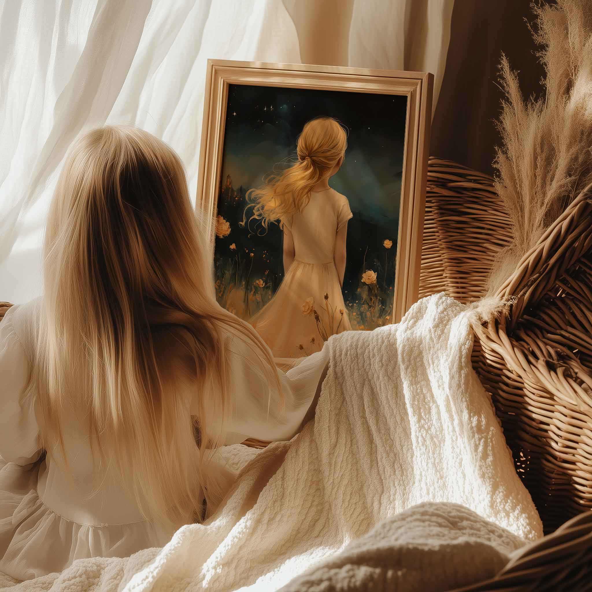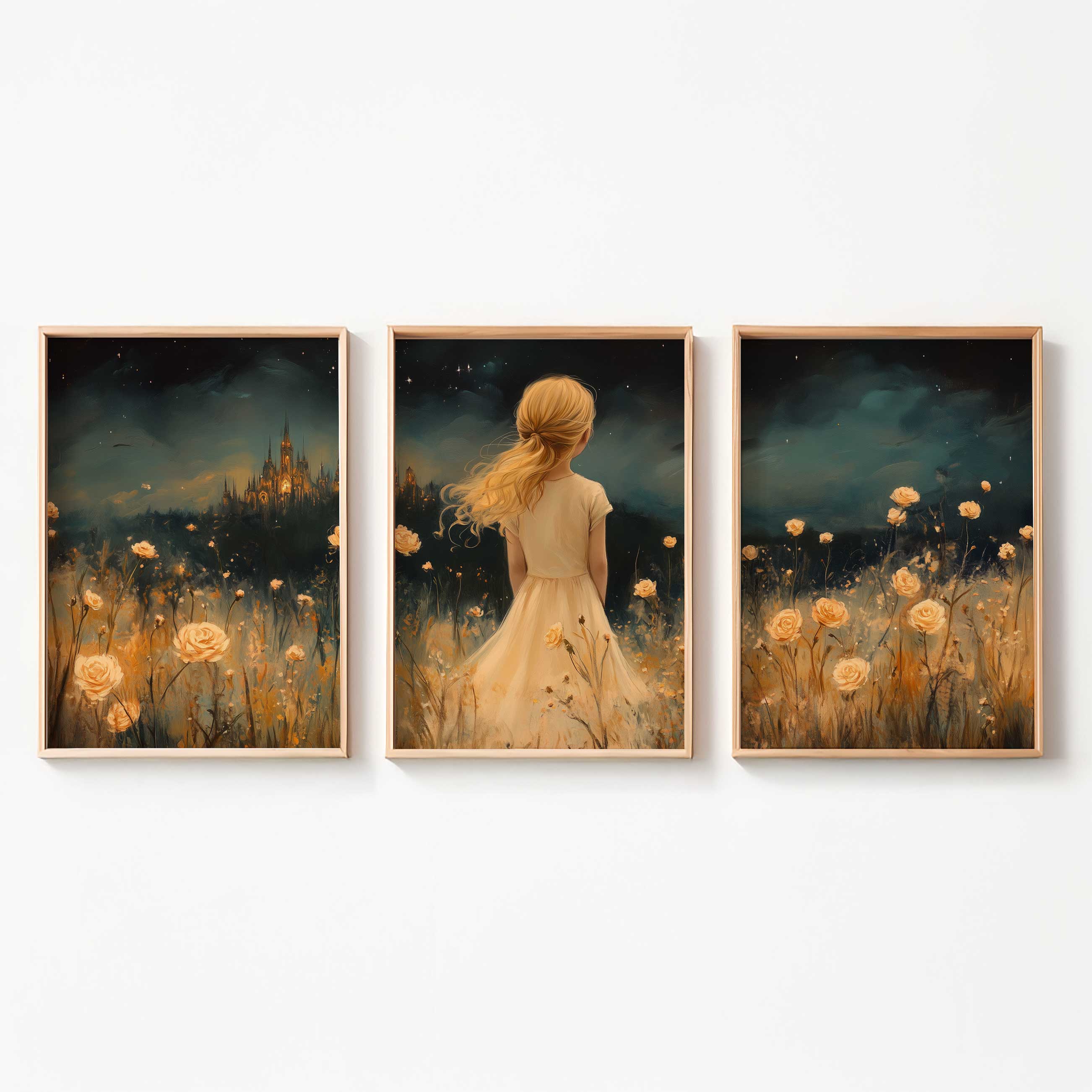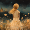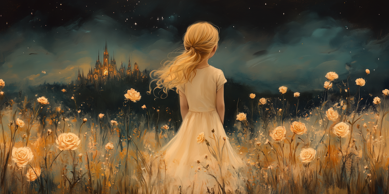 Magisch Meisje in Bloemenveld met Sprookjeskasteel