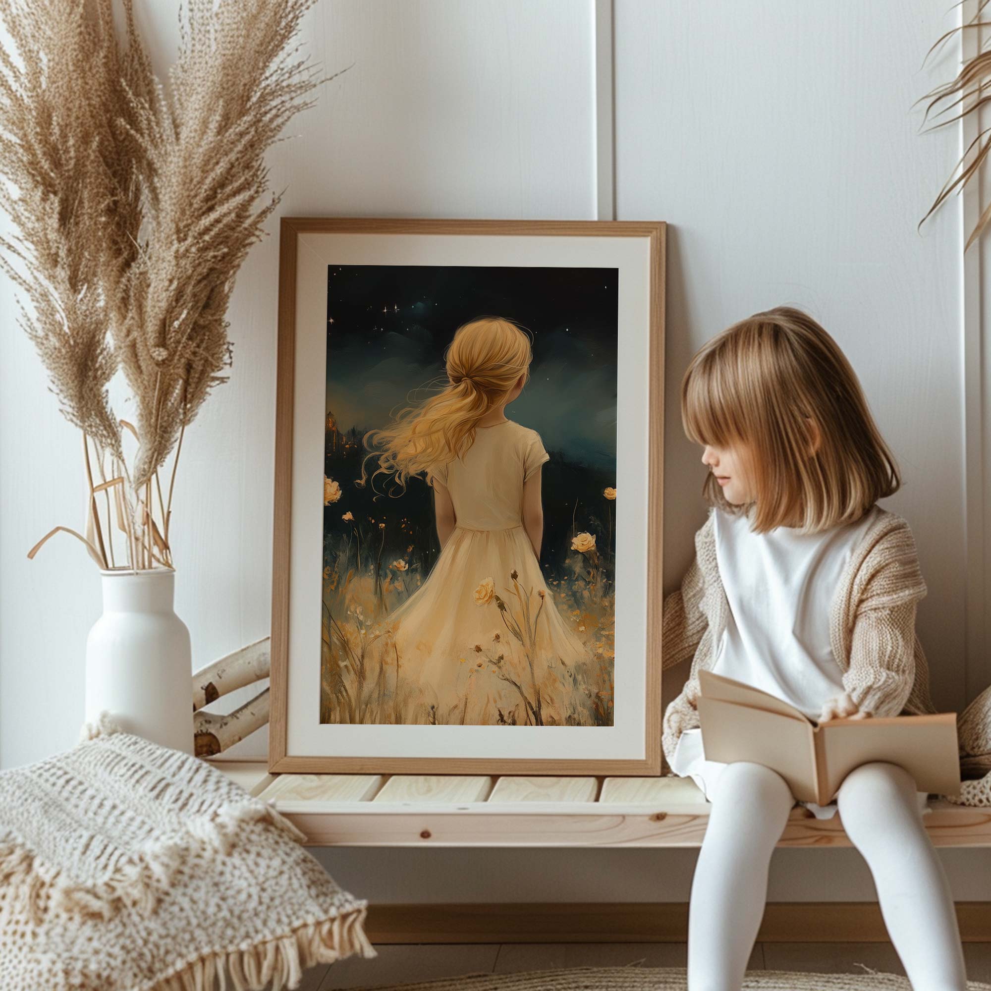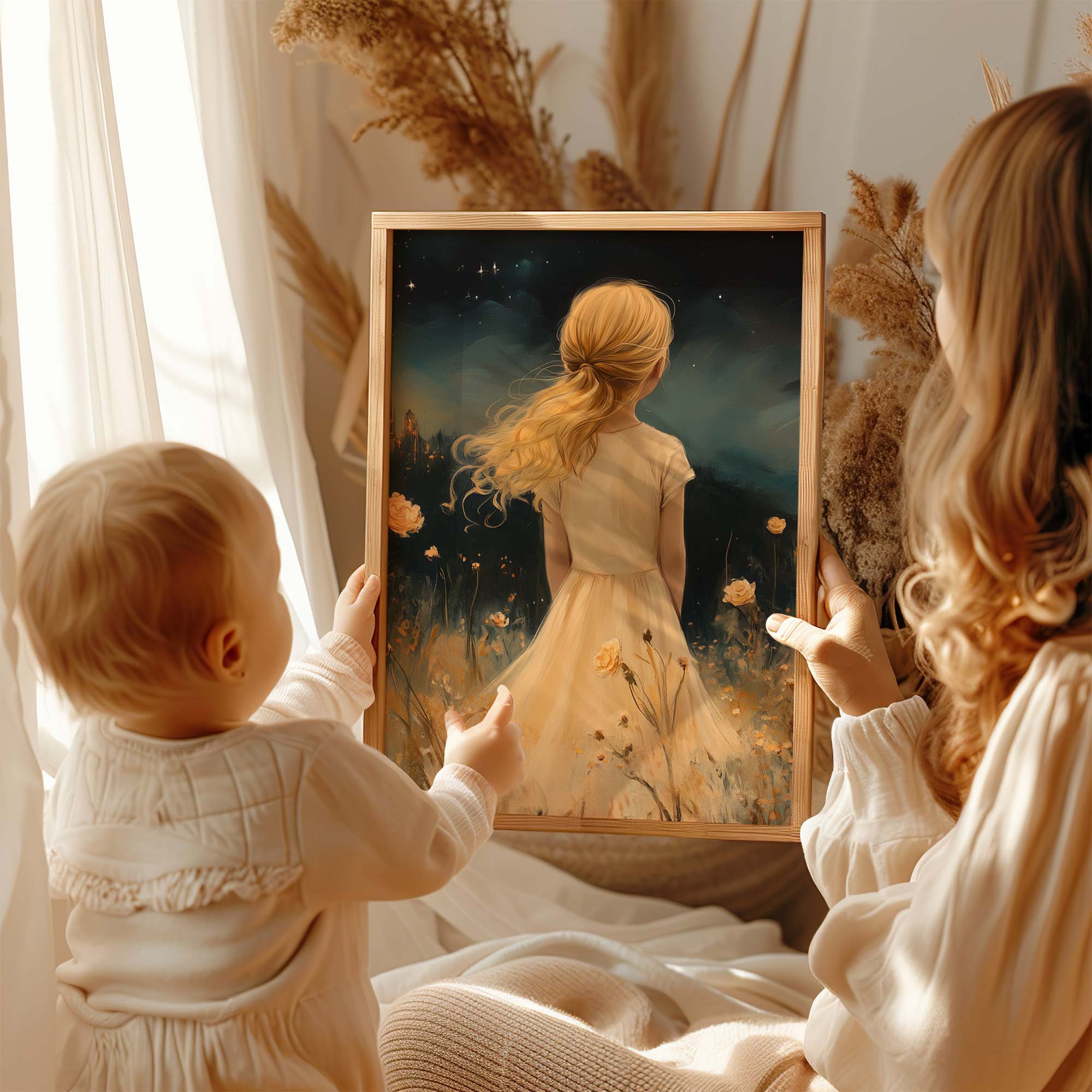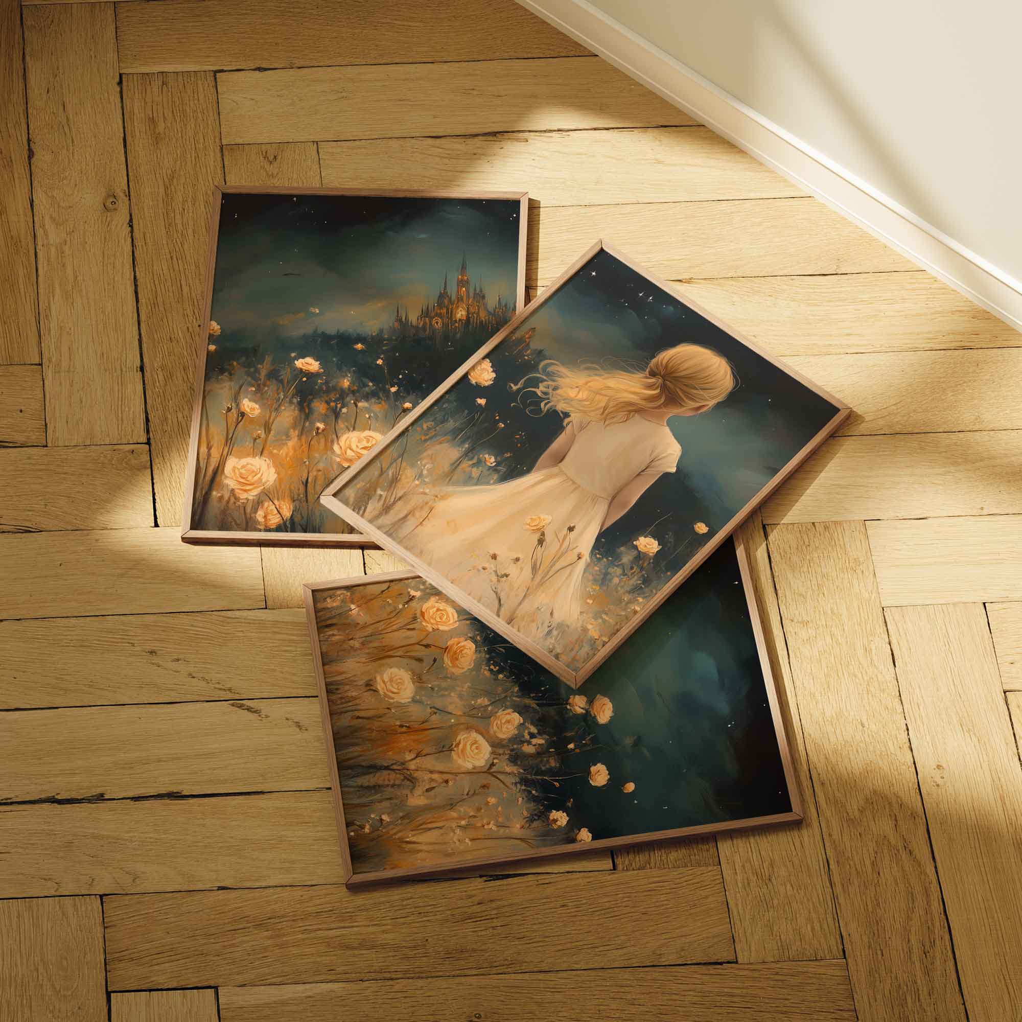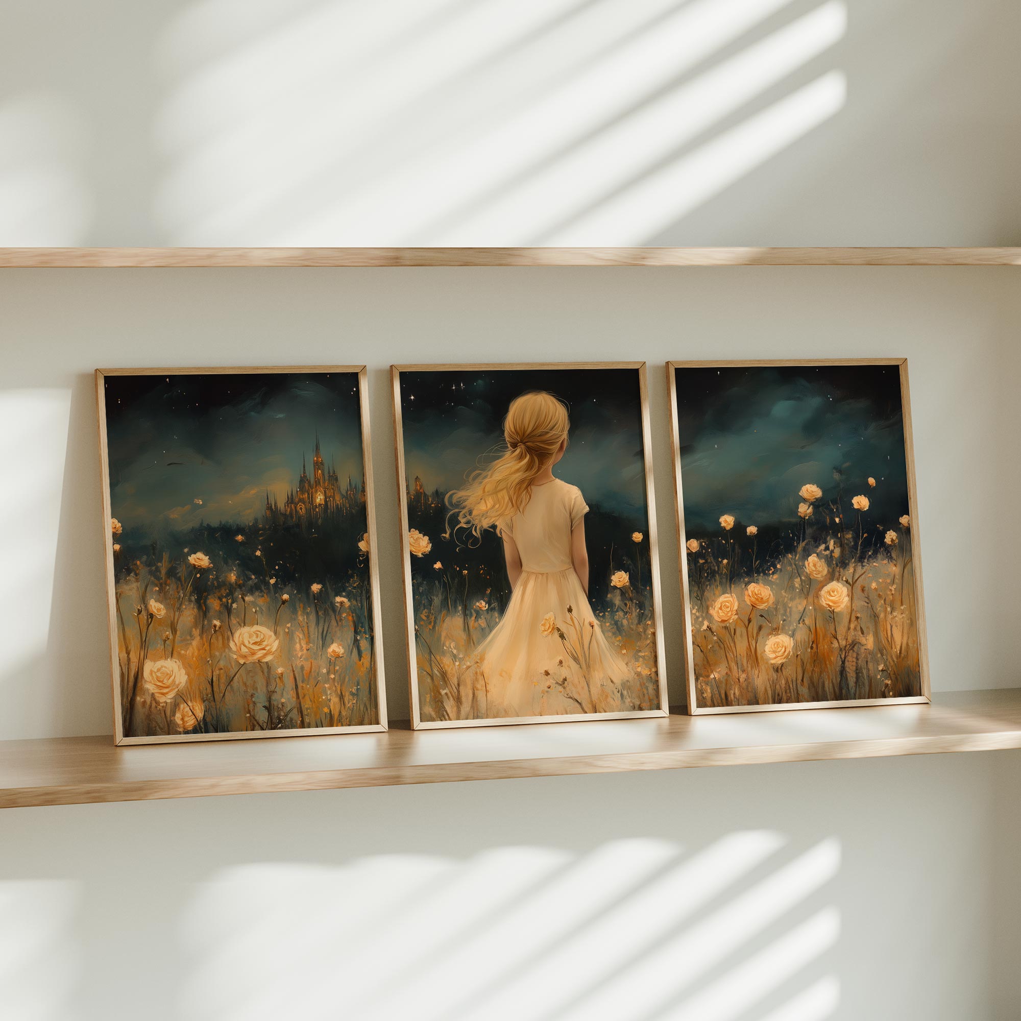 Magisch Meisje in Bloemenveld met Sprookjeskasteel