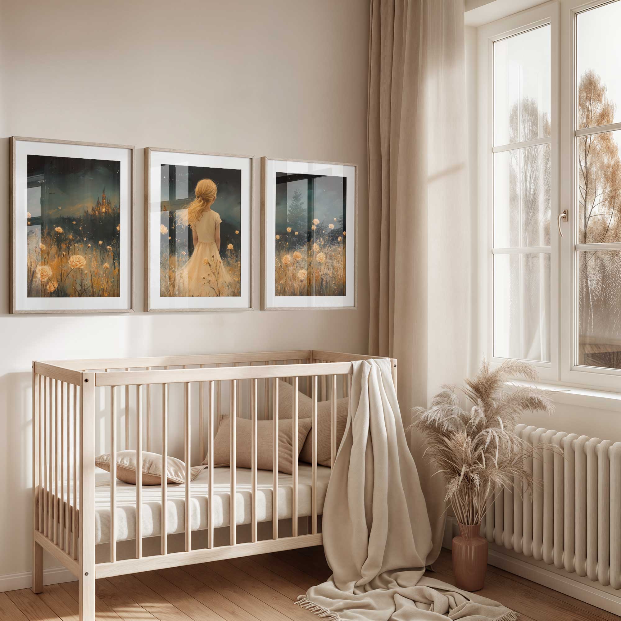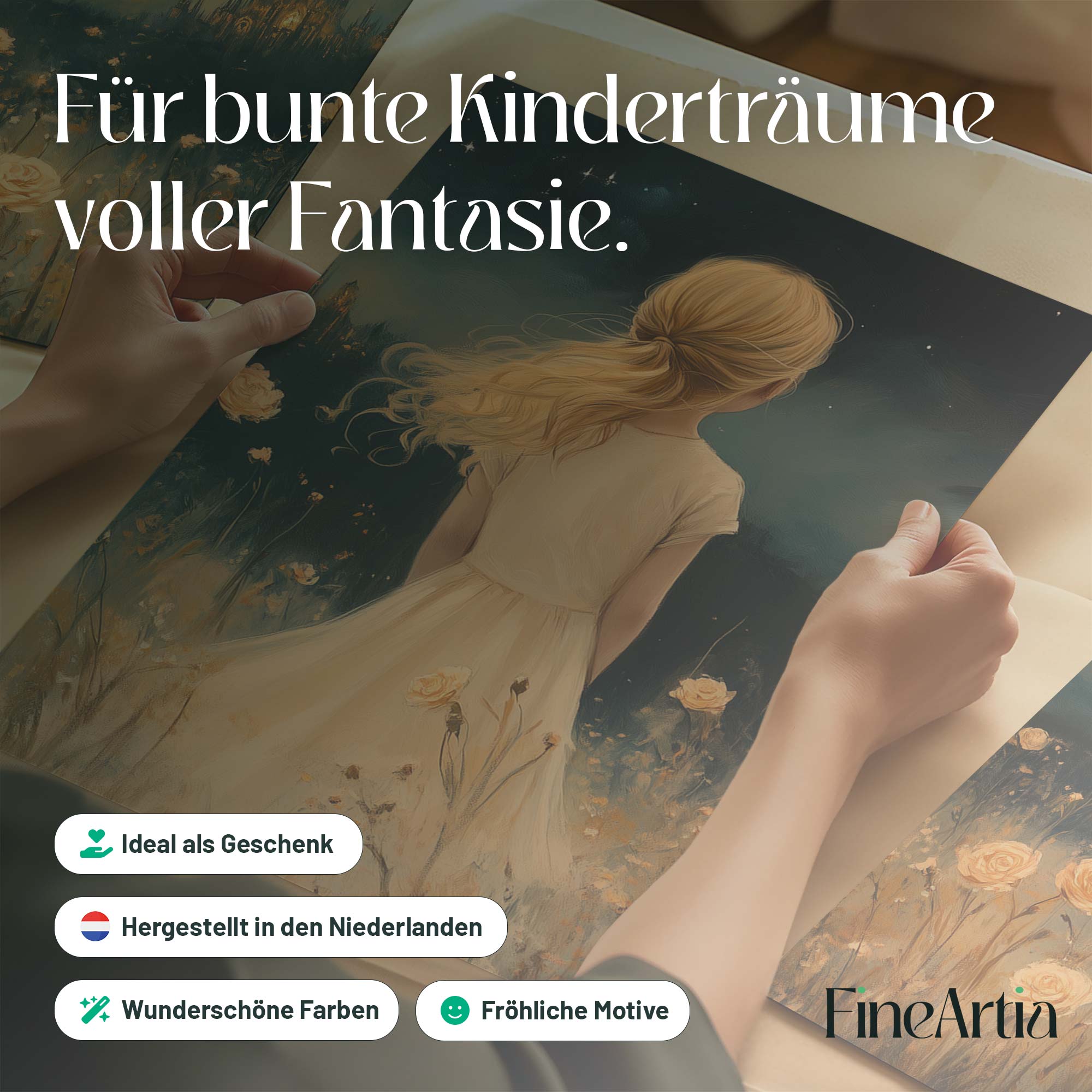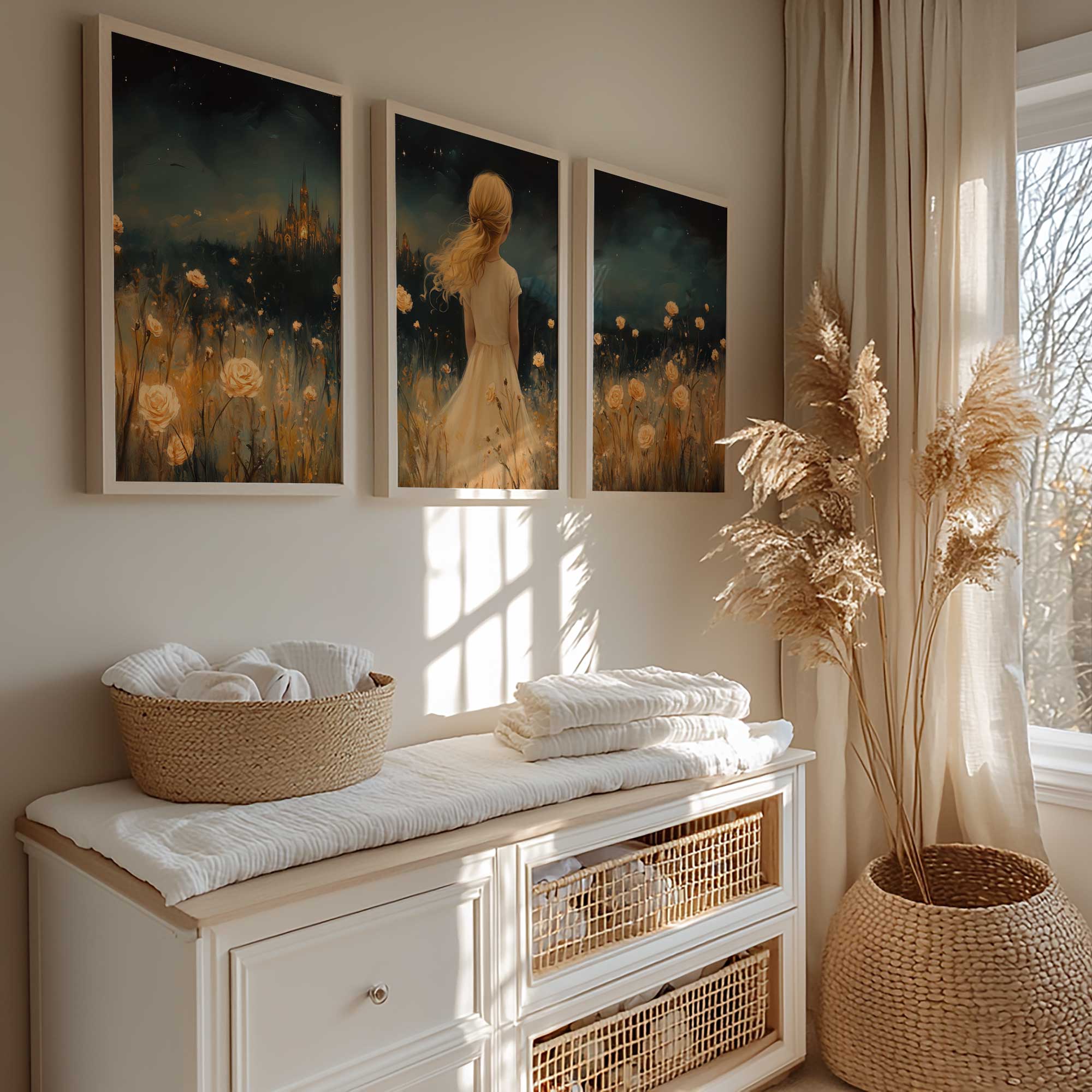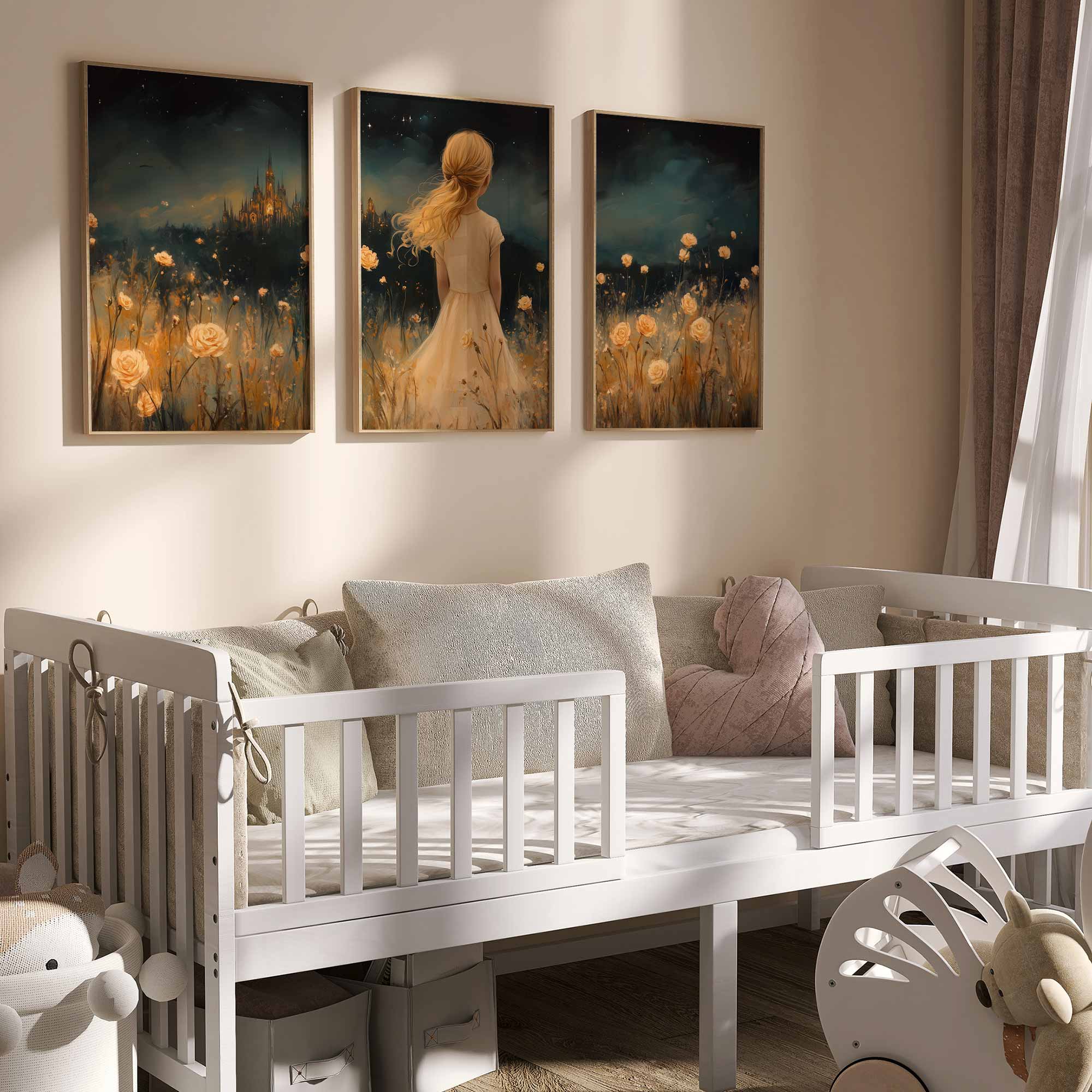 Magisch Meisje in Bloemenveld met Sprookjeskasteel