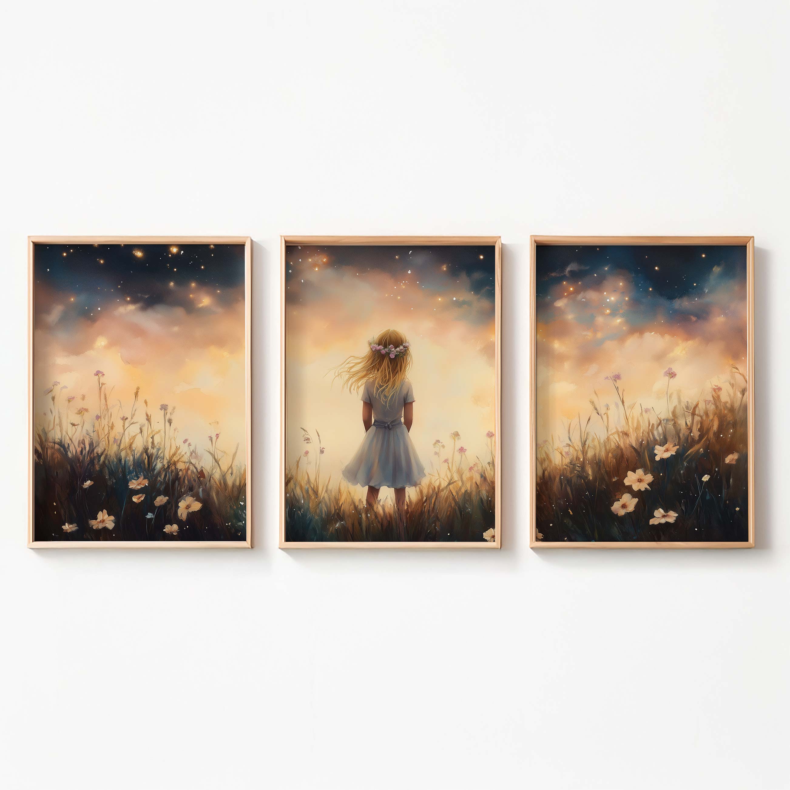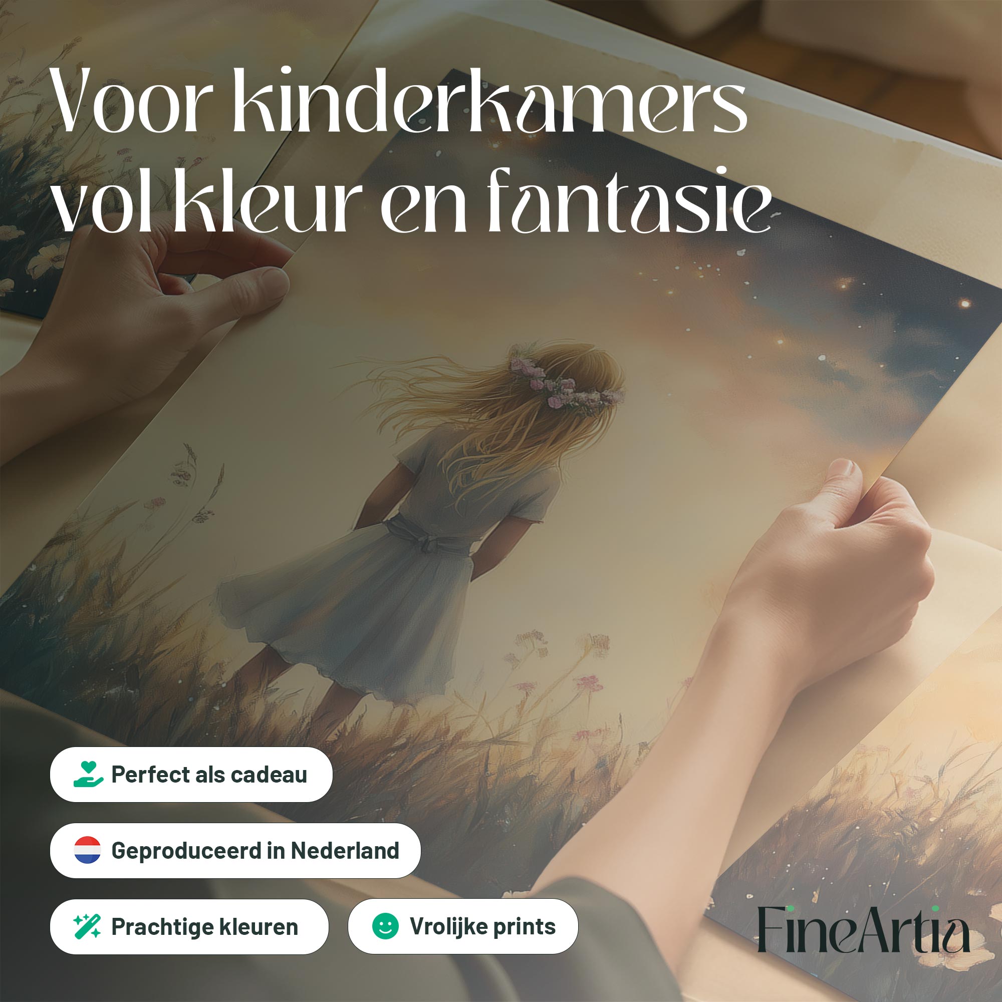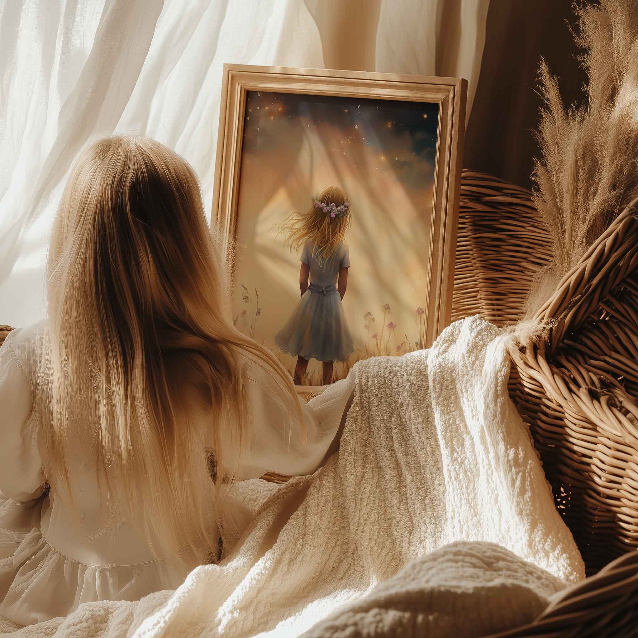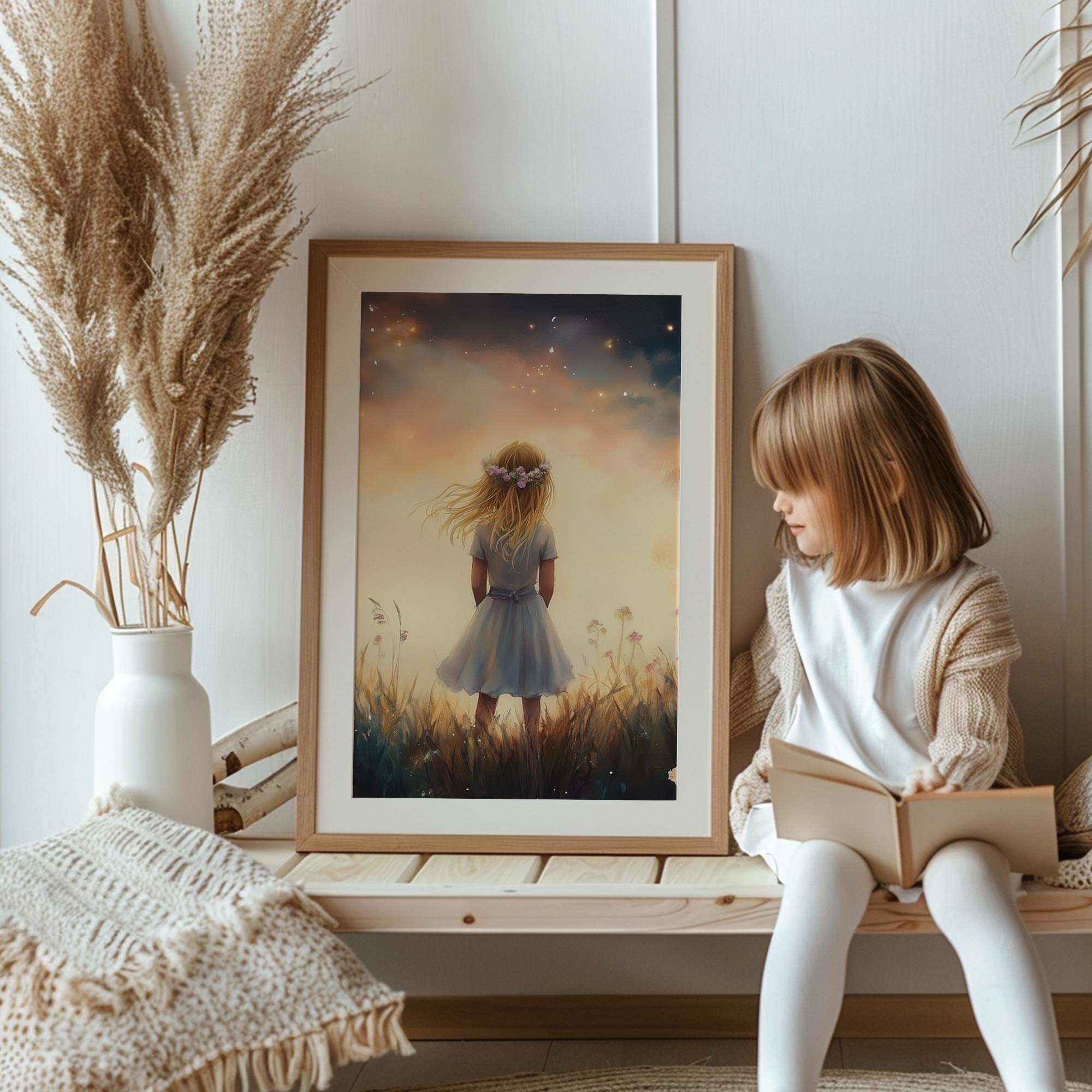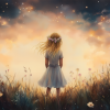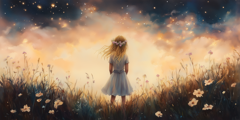 Magisch Meisje in Bloemenveld onder Sterrenhemel