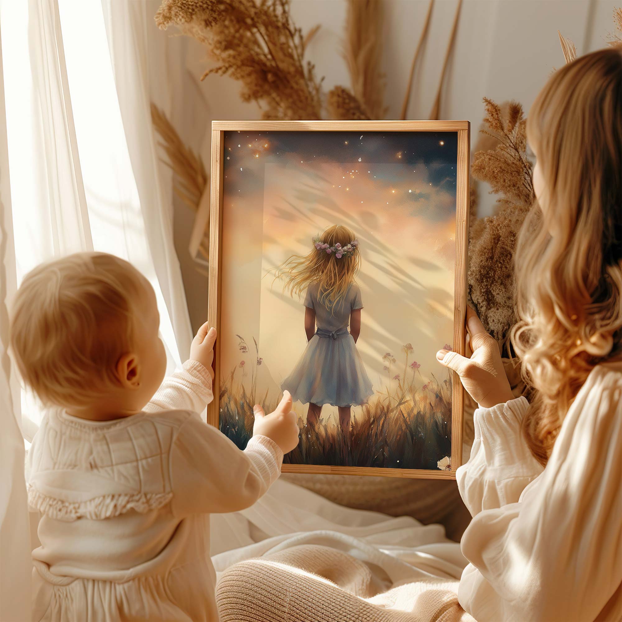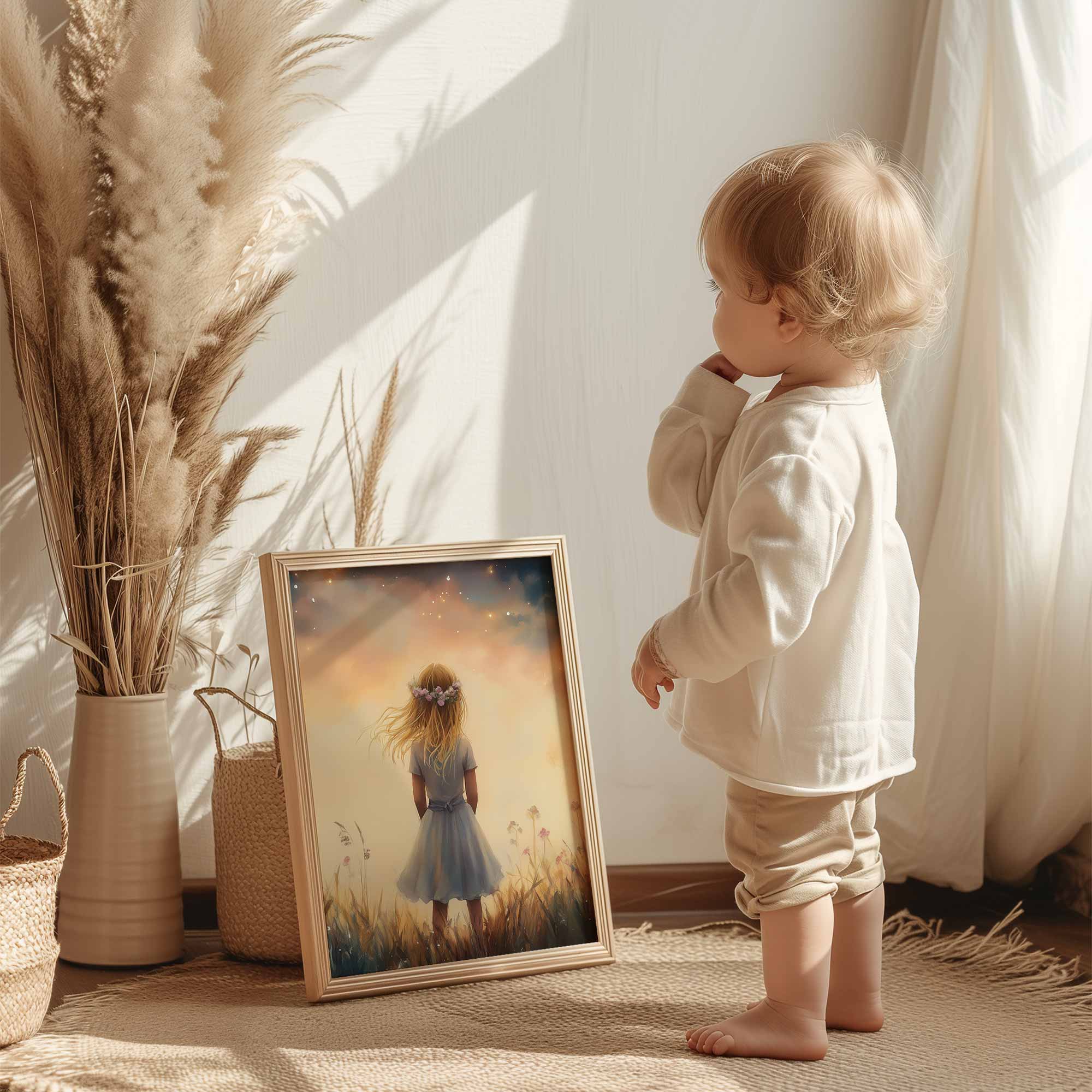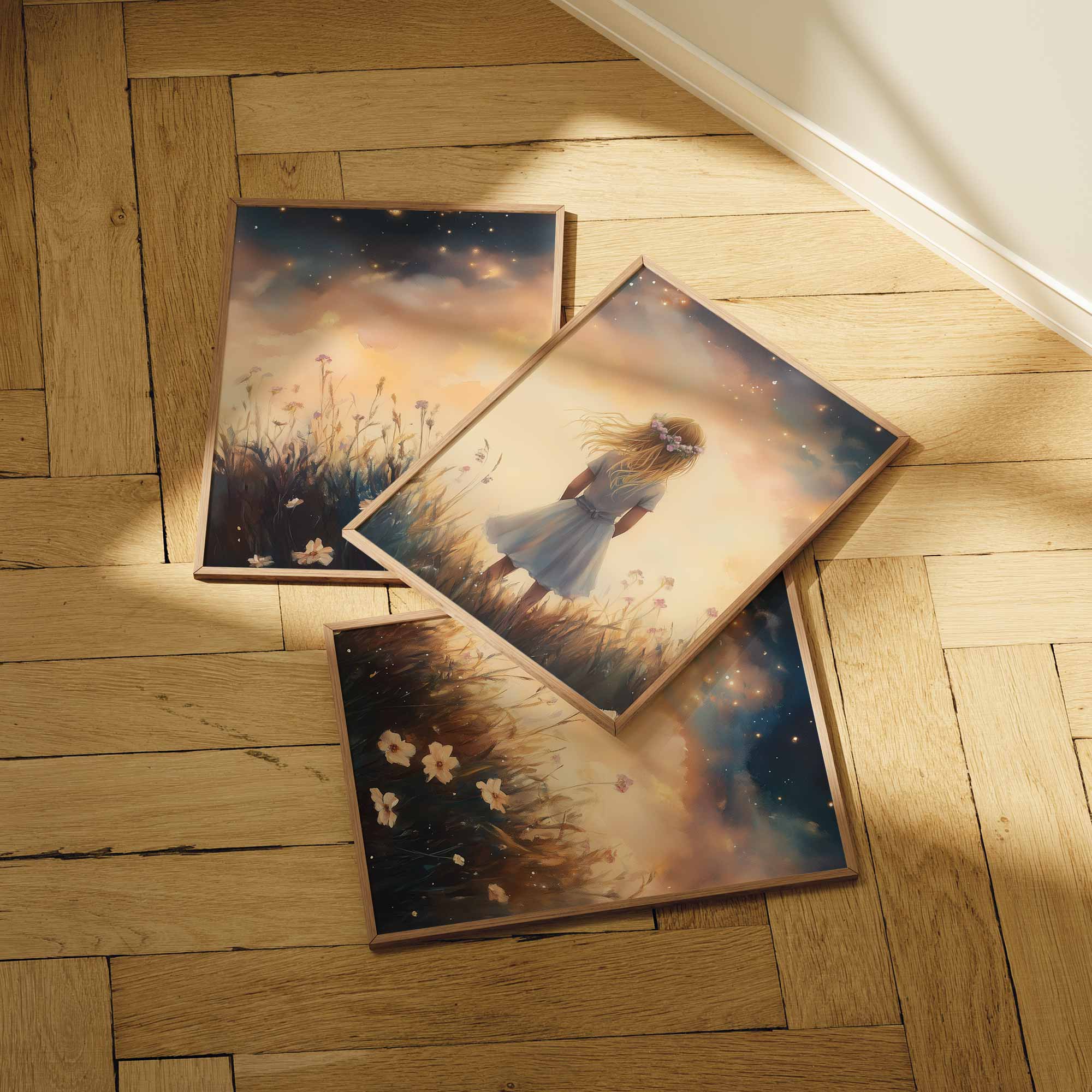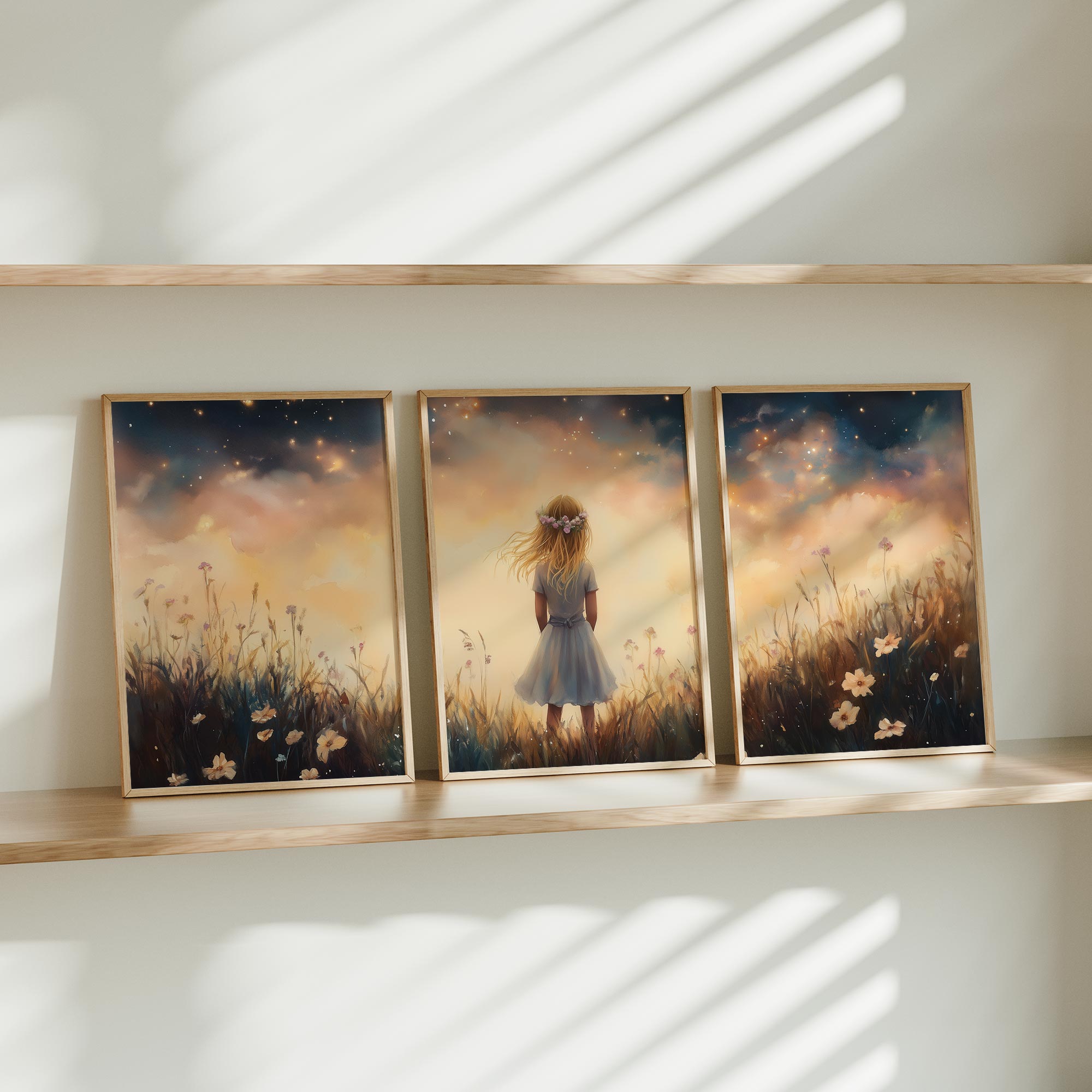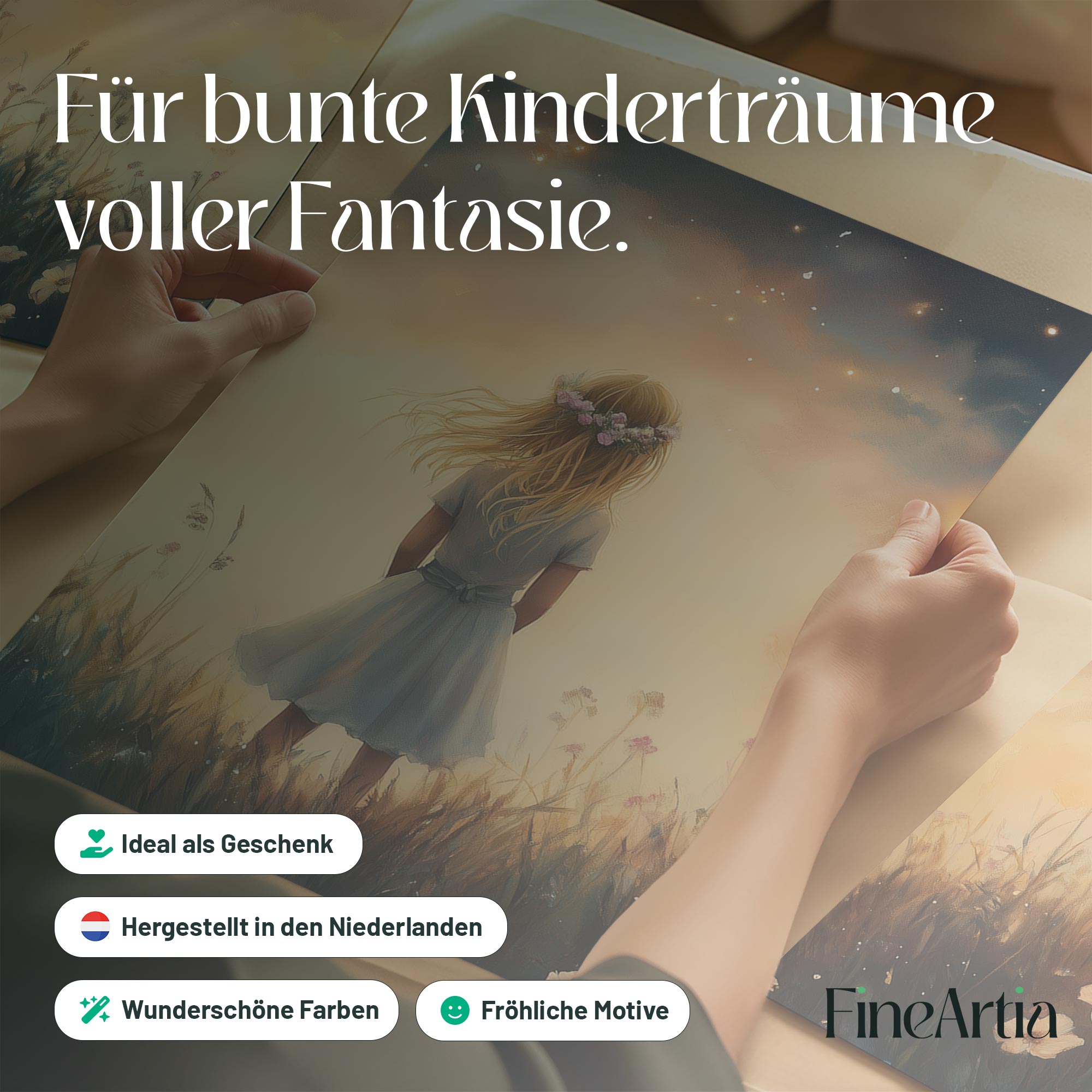 Magisch Meisje in Bloemenveld onder Sterrenhemel