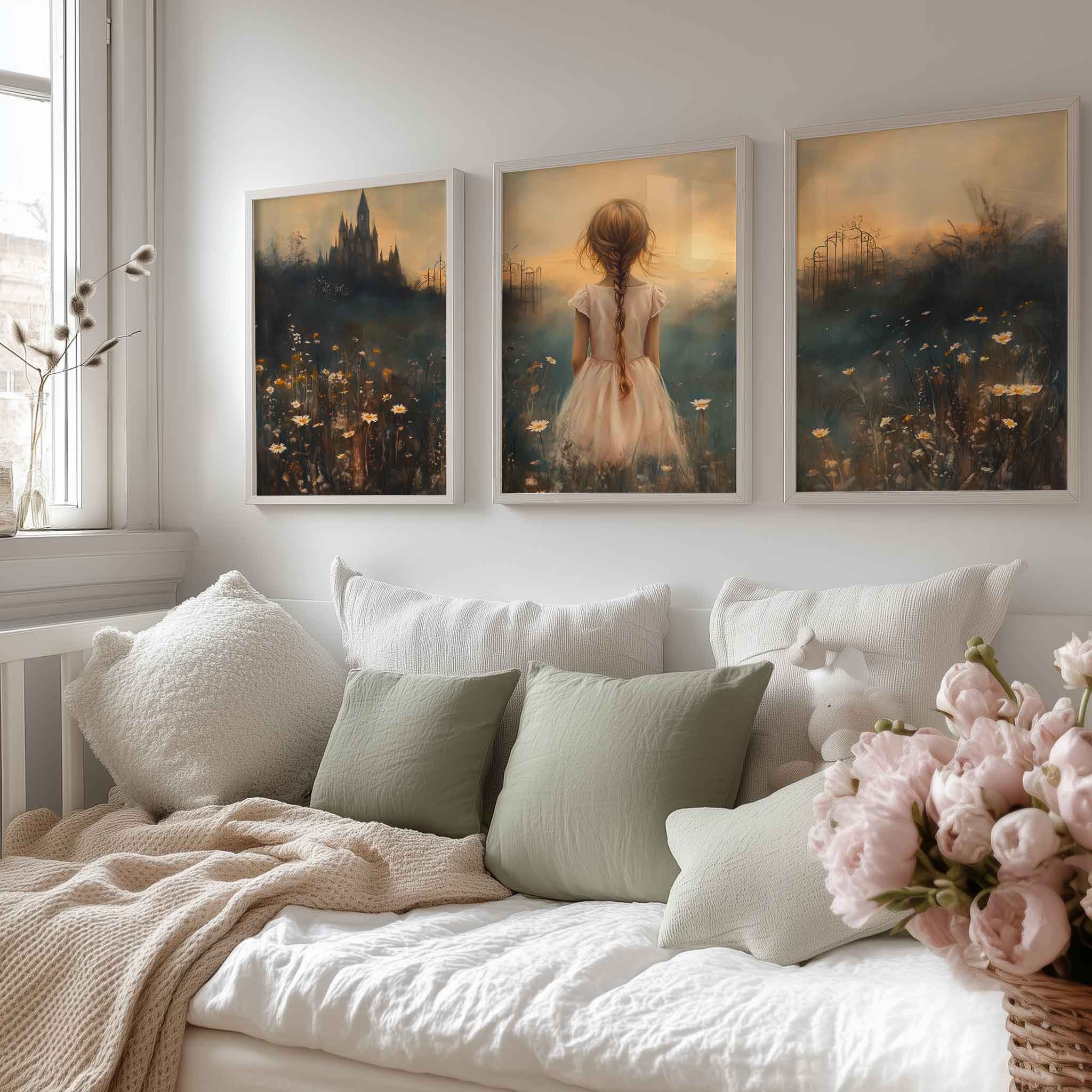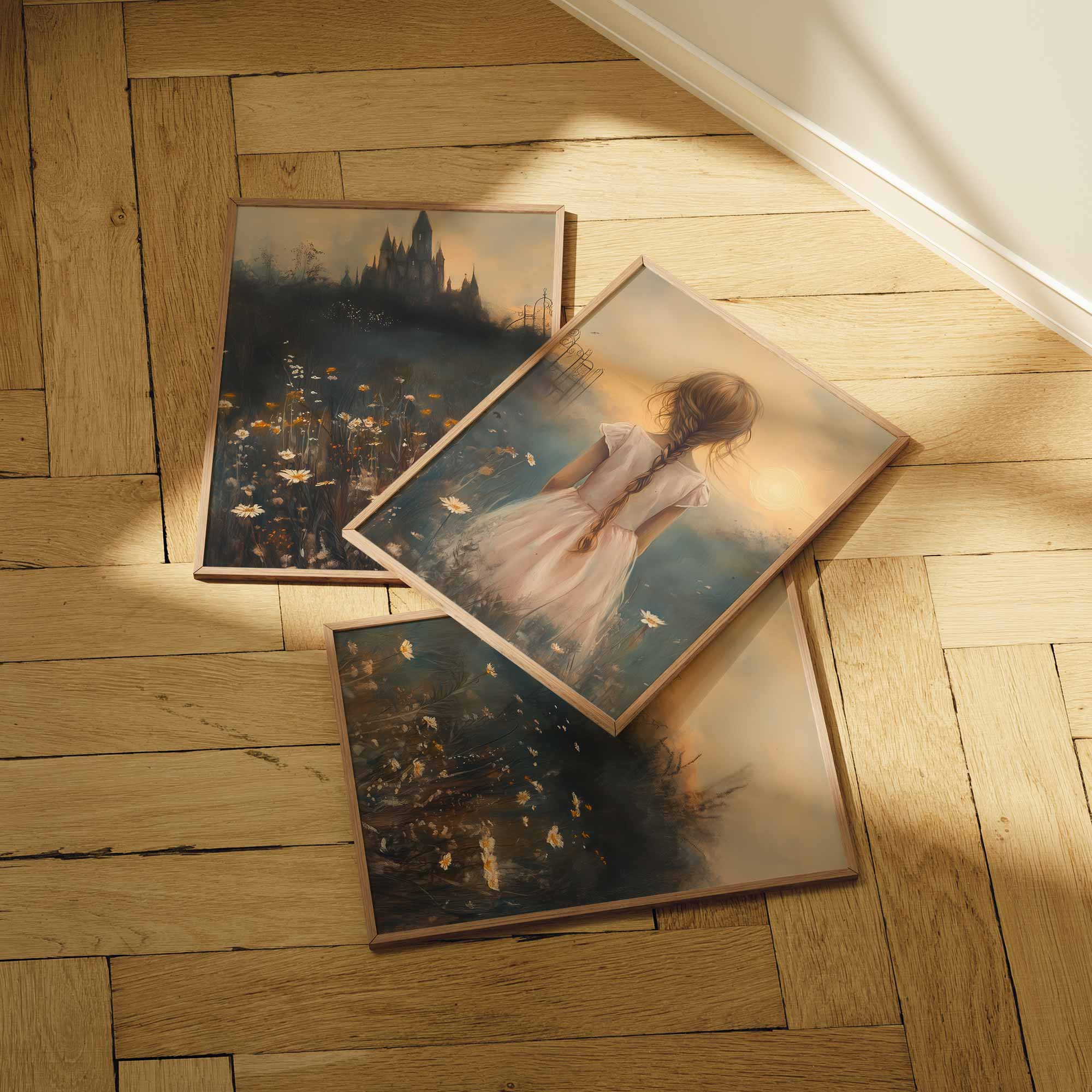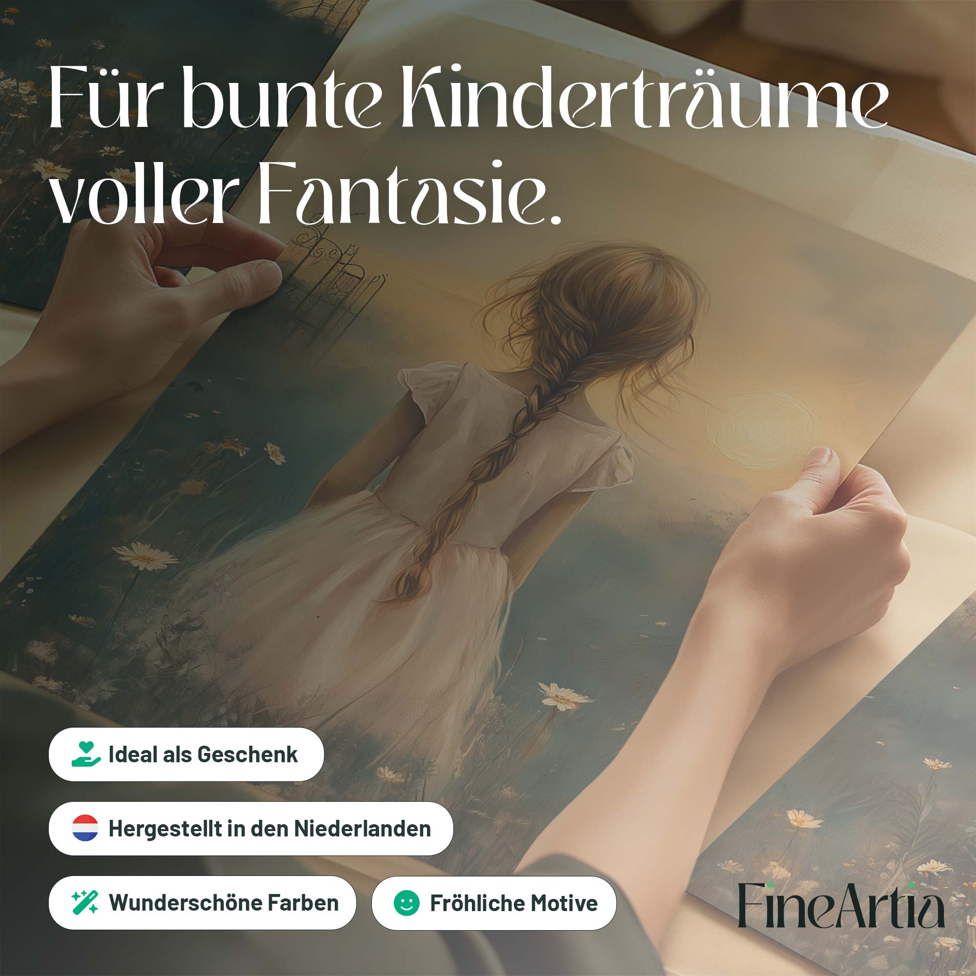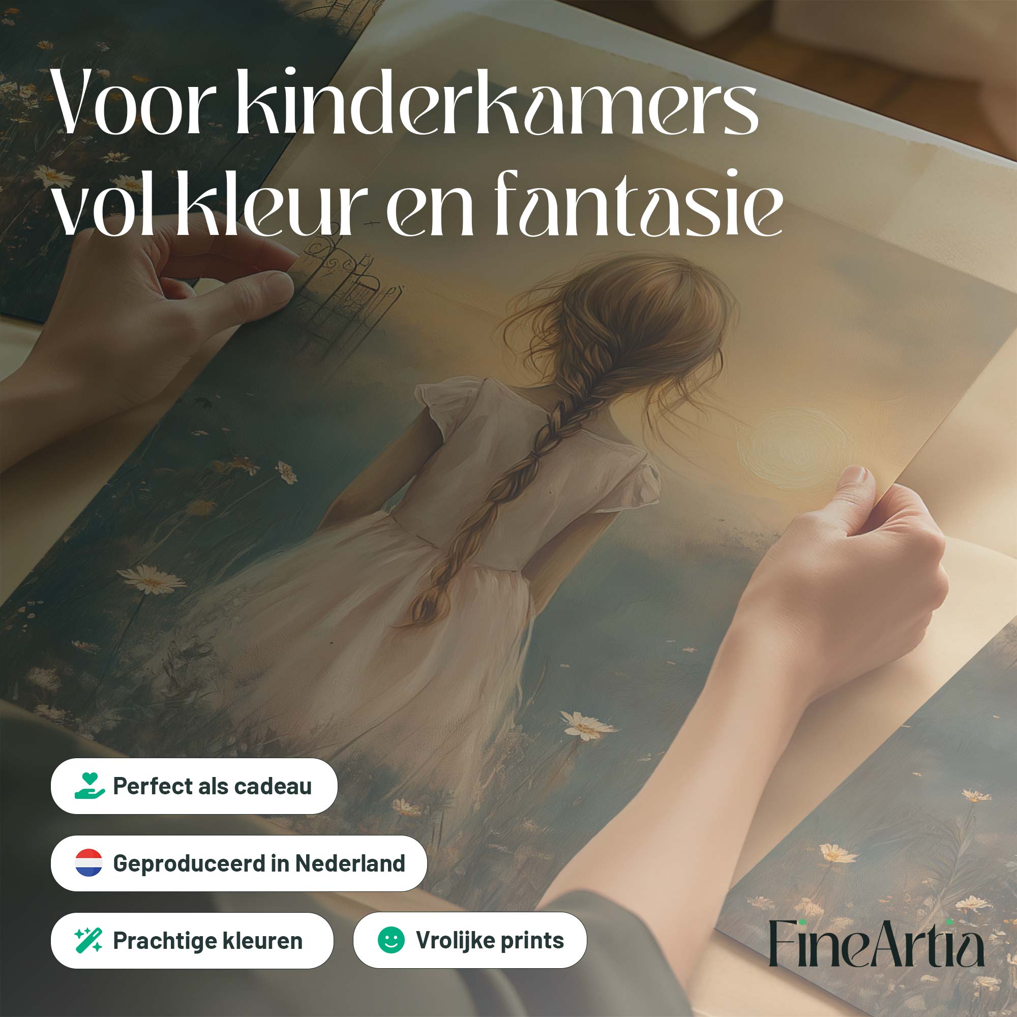 Terug naar collectie Posters Magisch Meisje in Dromerig Bloemenveld met Kasteel
