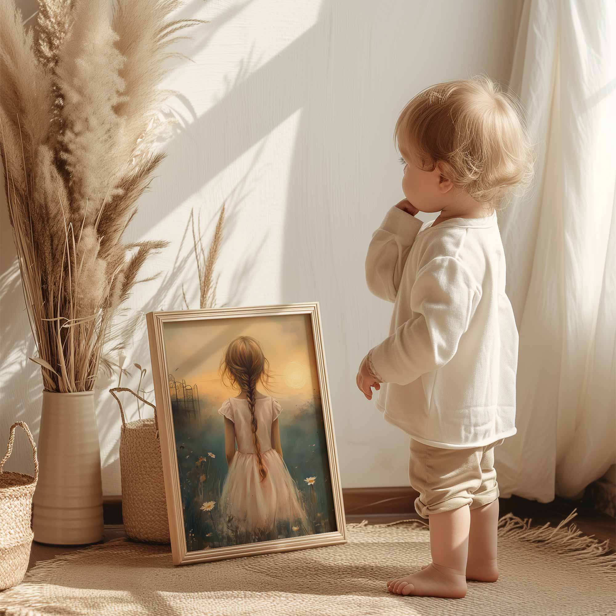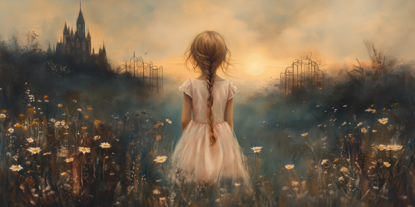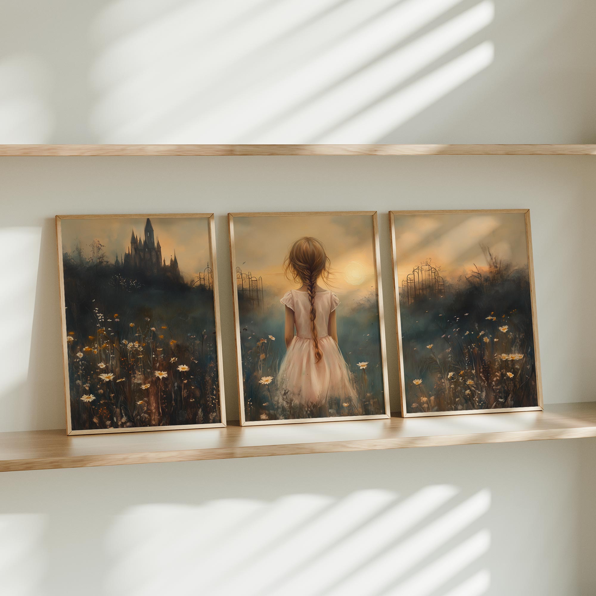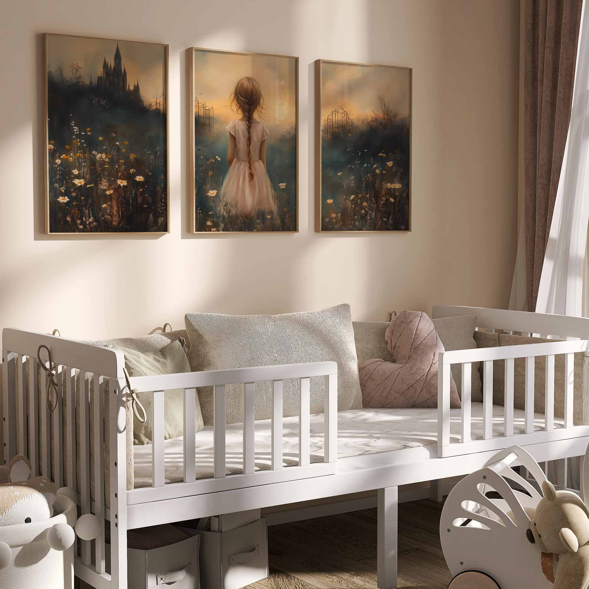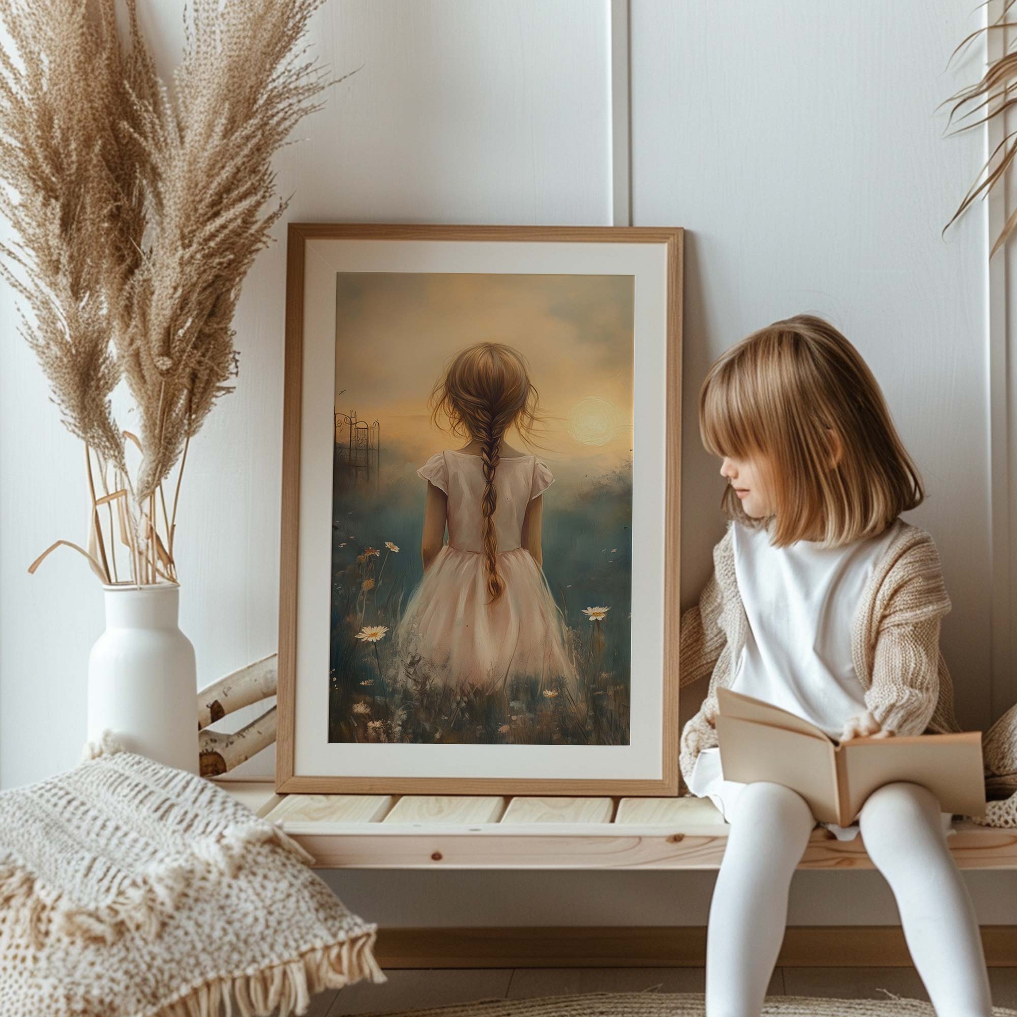 Terug naar collectie Posters Magisch Meisje in Dromerig Bloemenveld met Kasteel