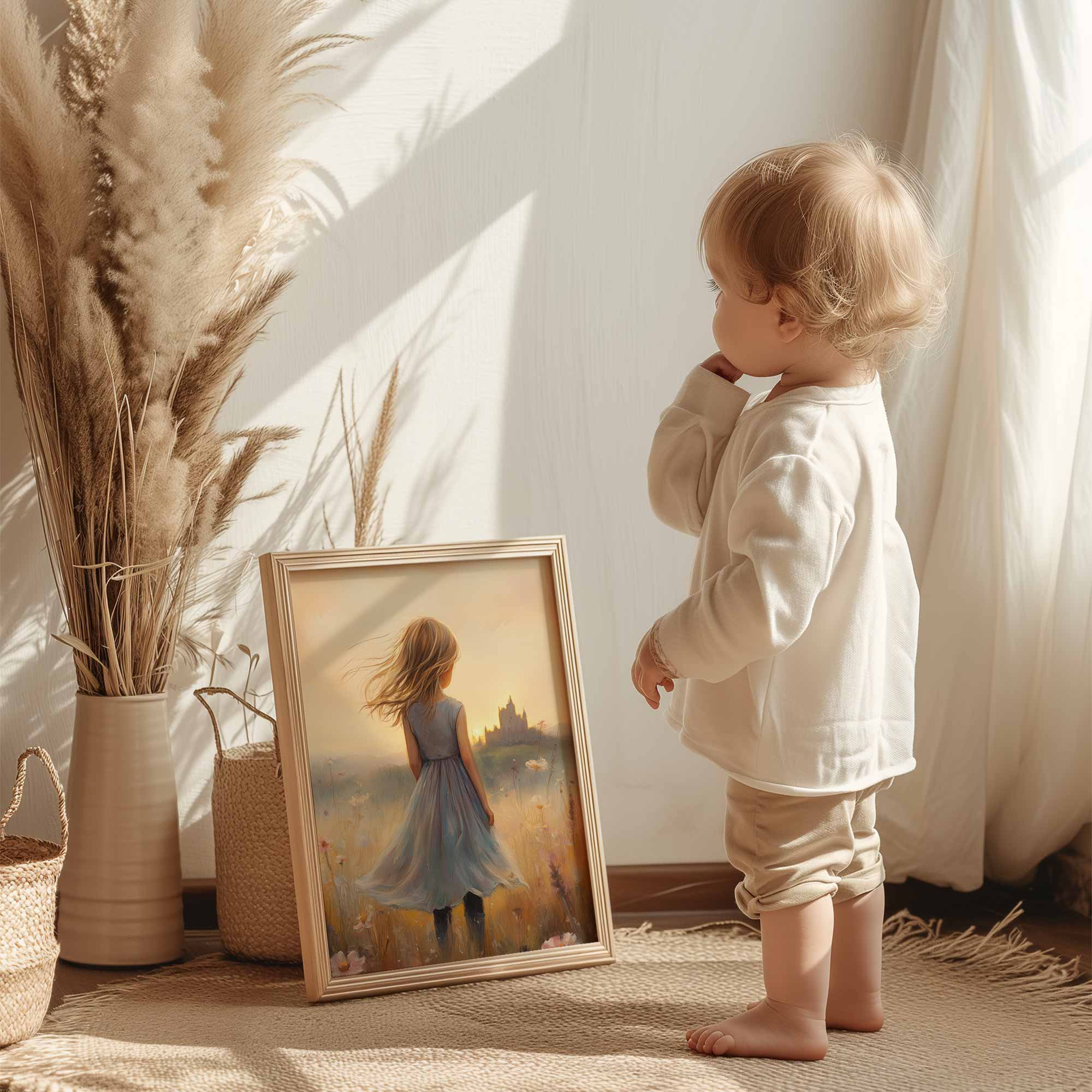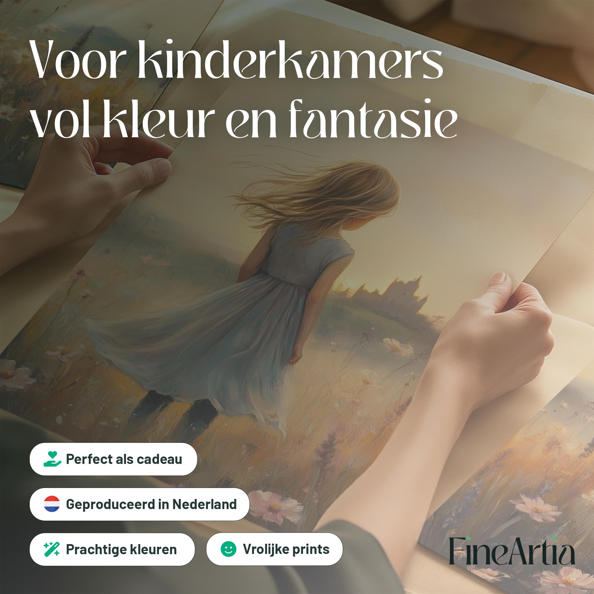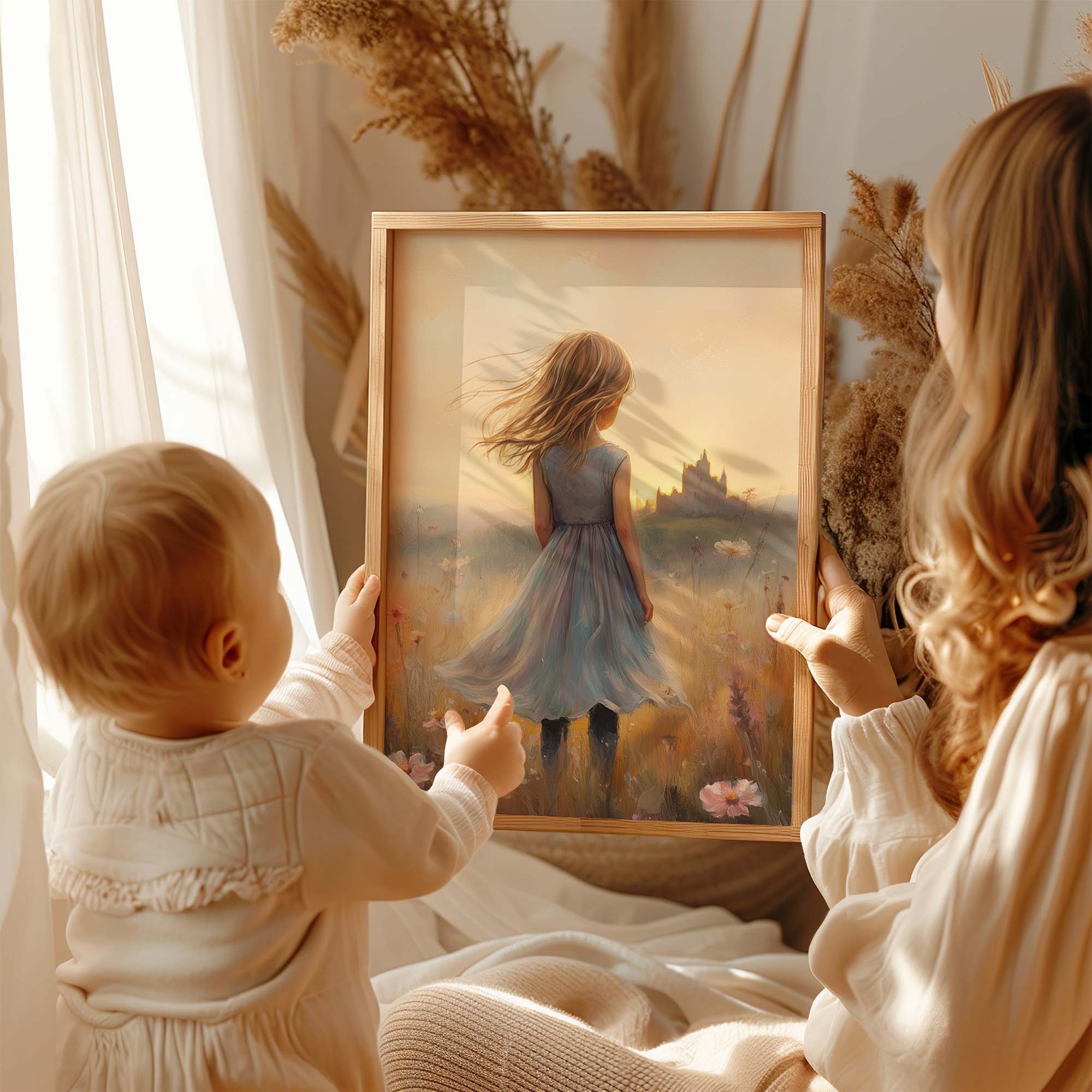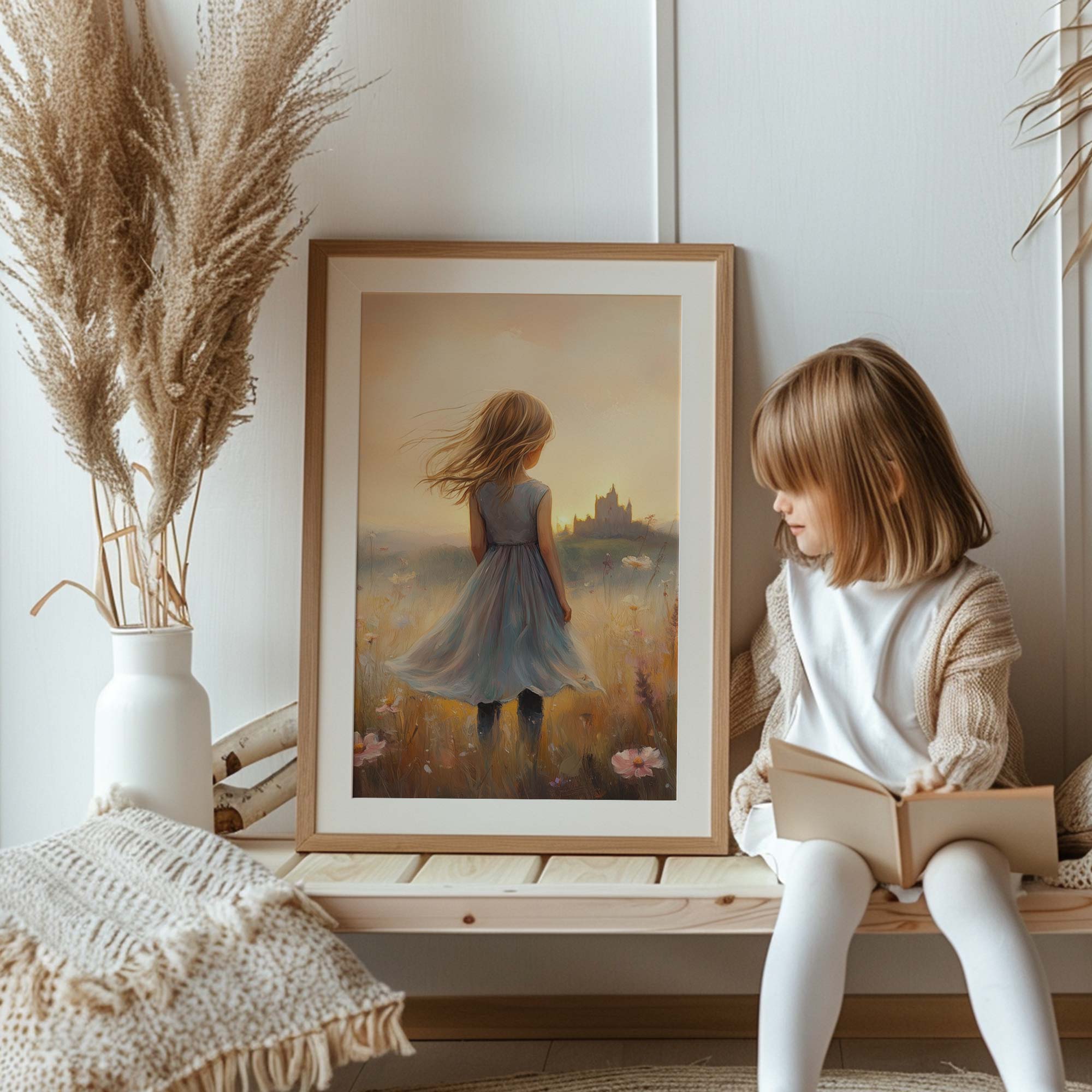 Terug naar collectie Posters Magisch Meisje in Dromerig Bloemenveld met Kasteel