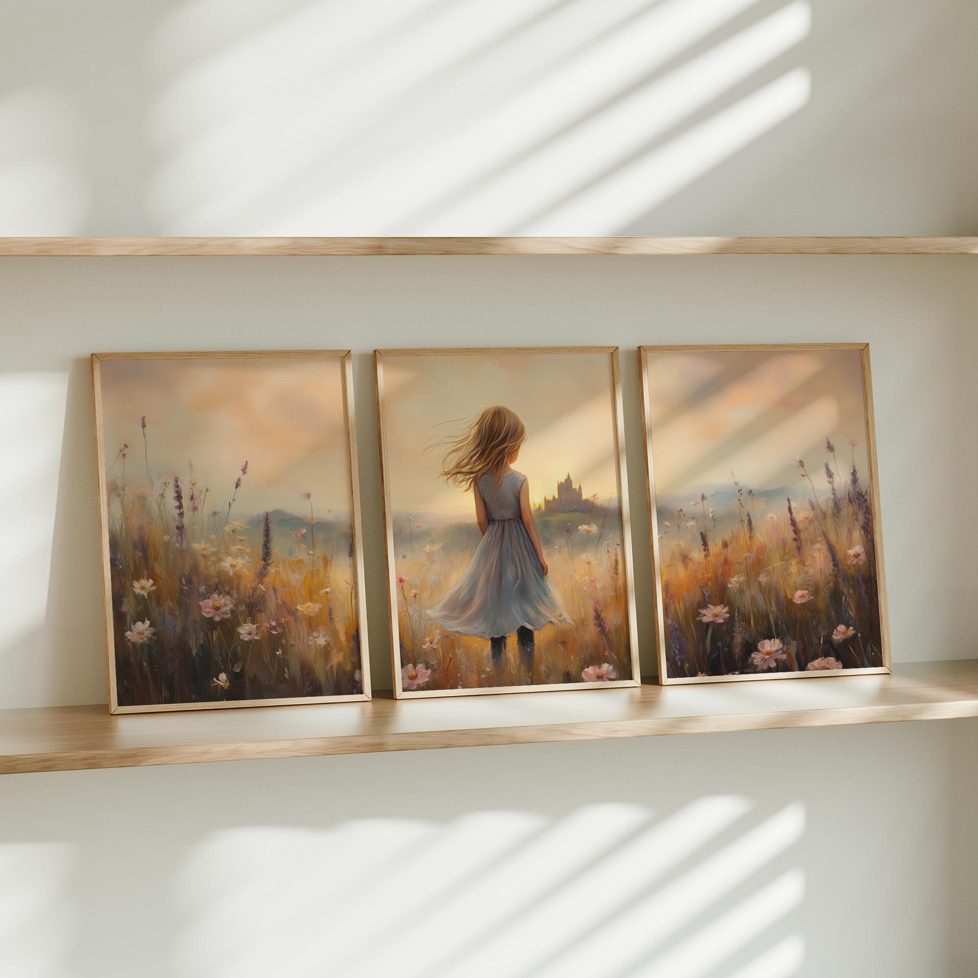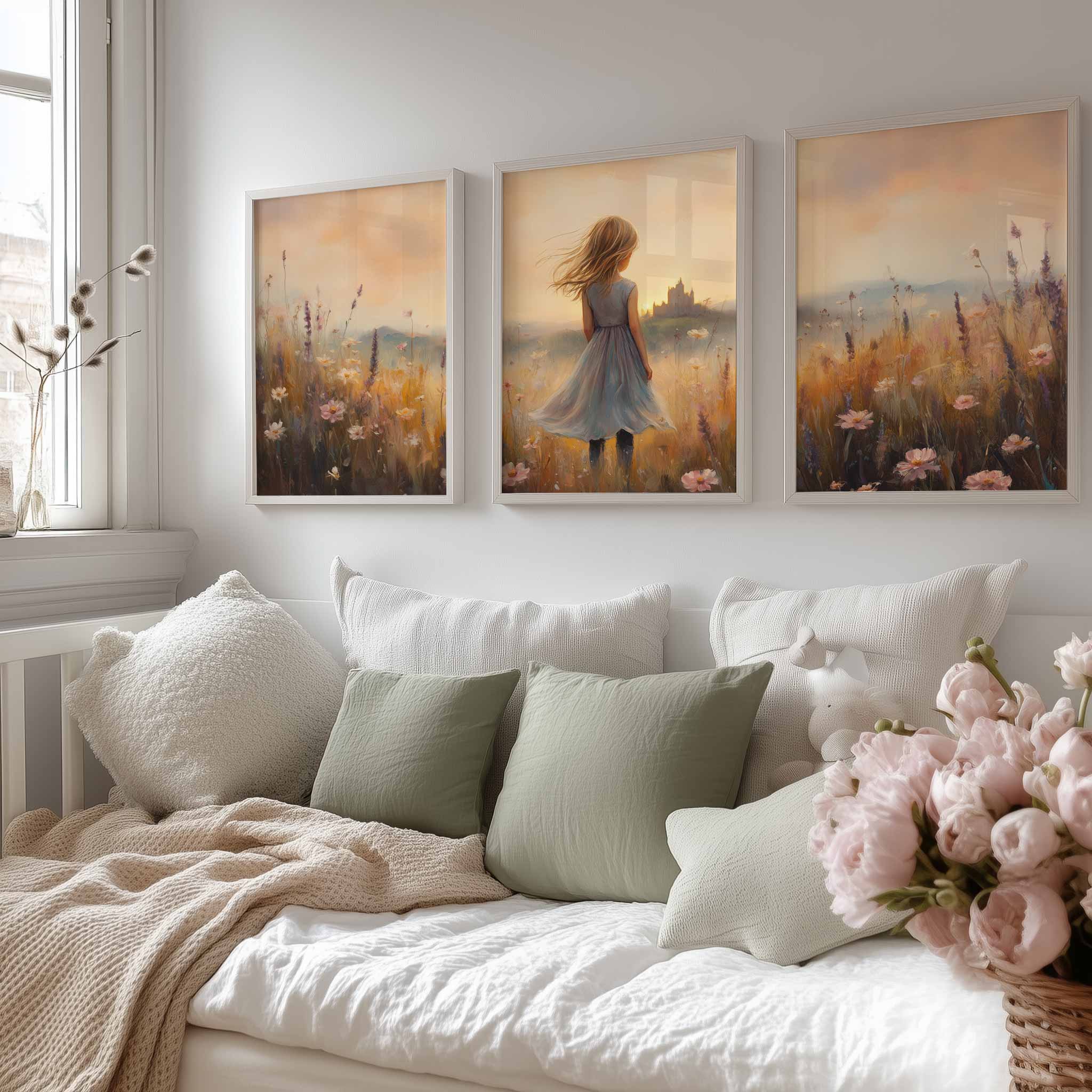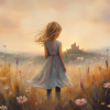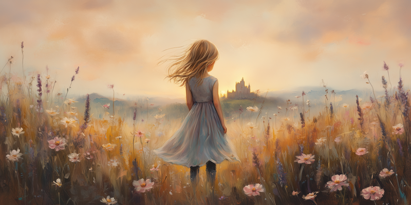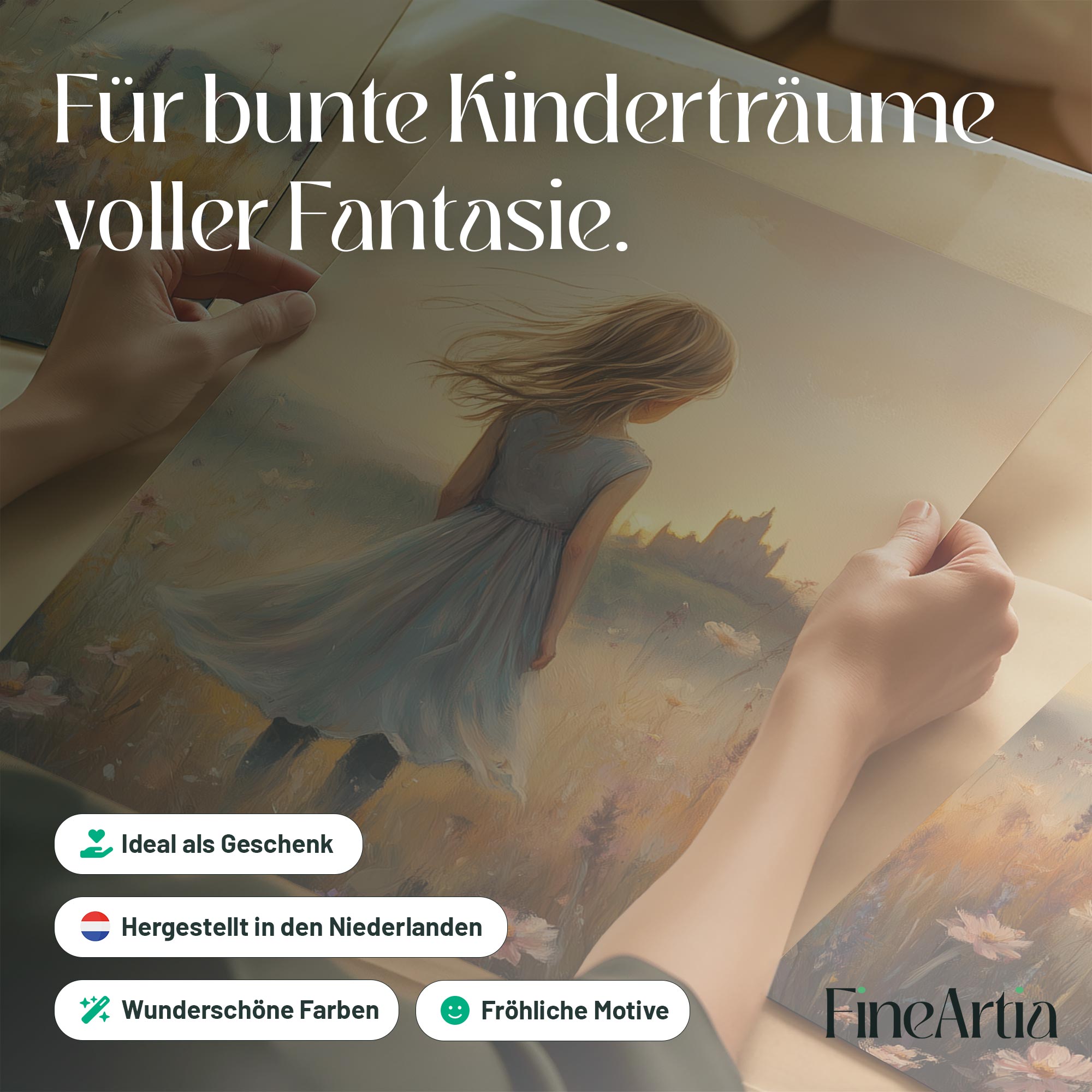 Terug naar collectie Posters Magisch Meisje in Dromerig Bloemenveld met Kasteel