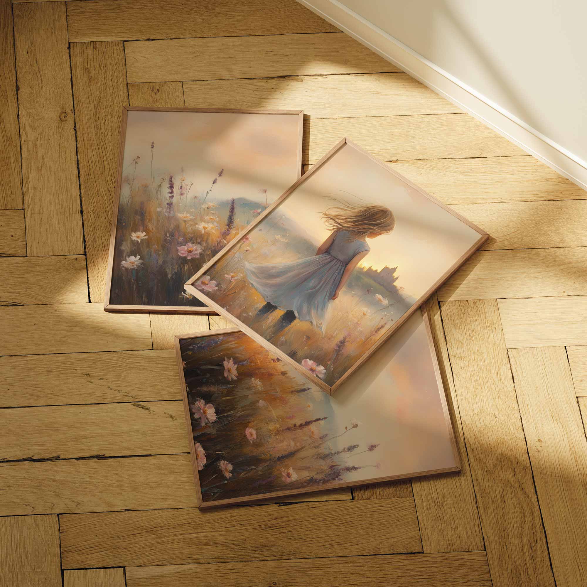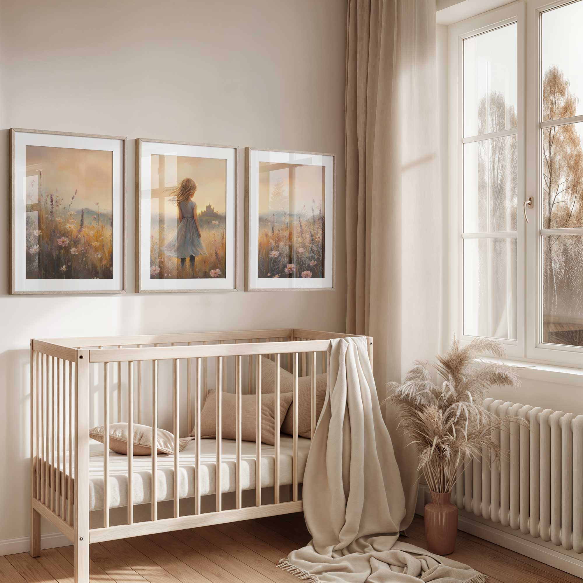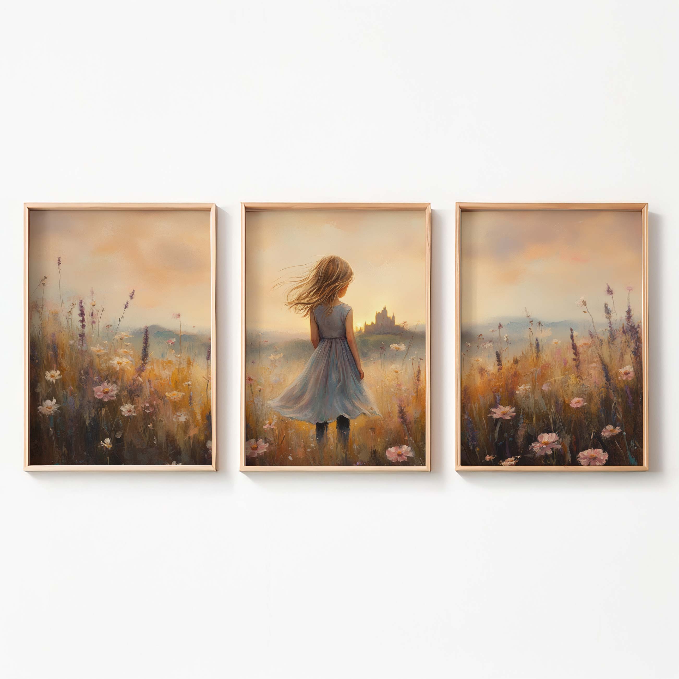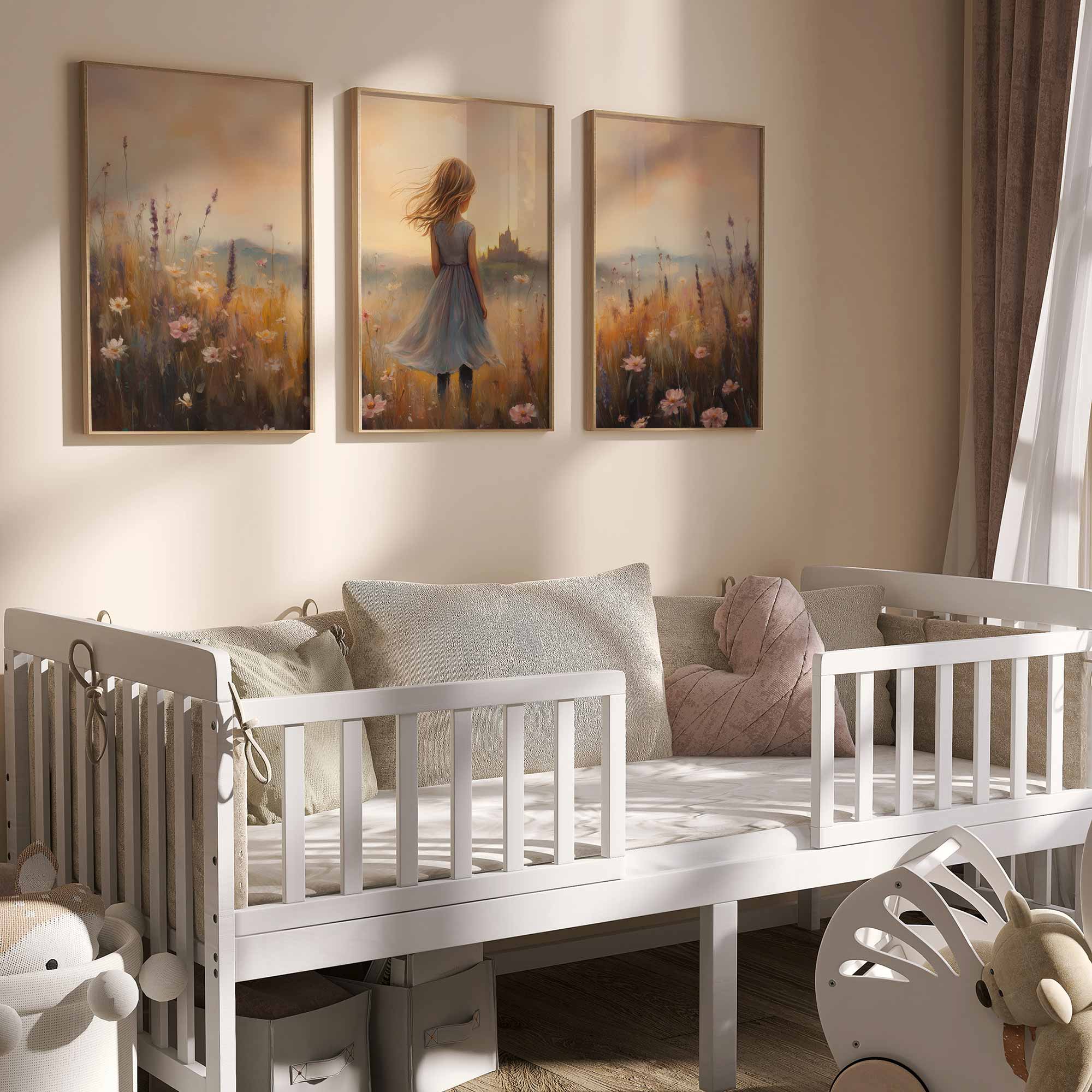 Terug naar collectie Posters Magisch Meisje in Dromerig Bloemenveld met Kasteel