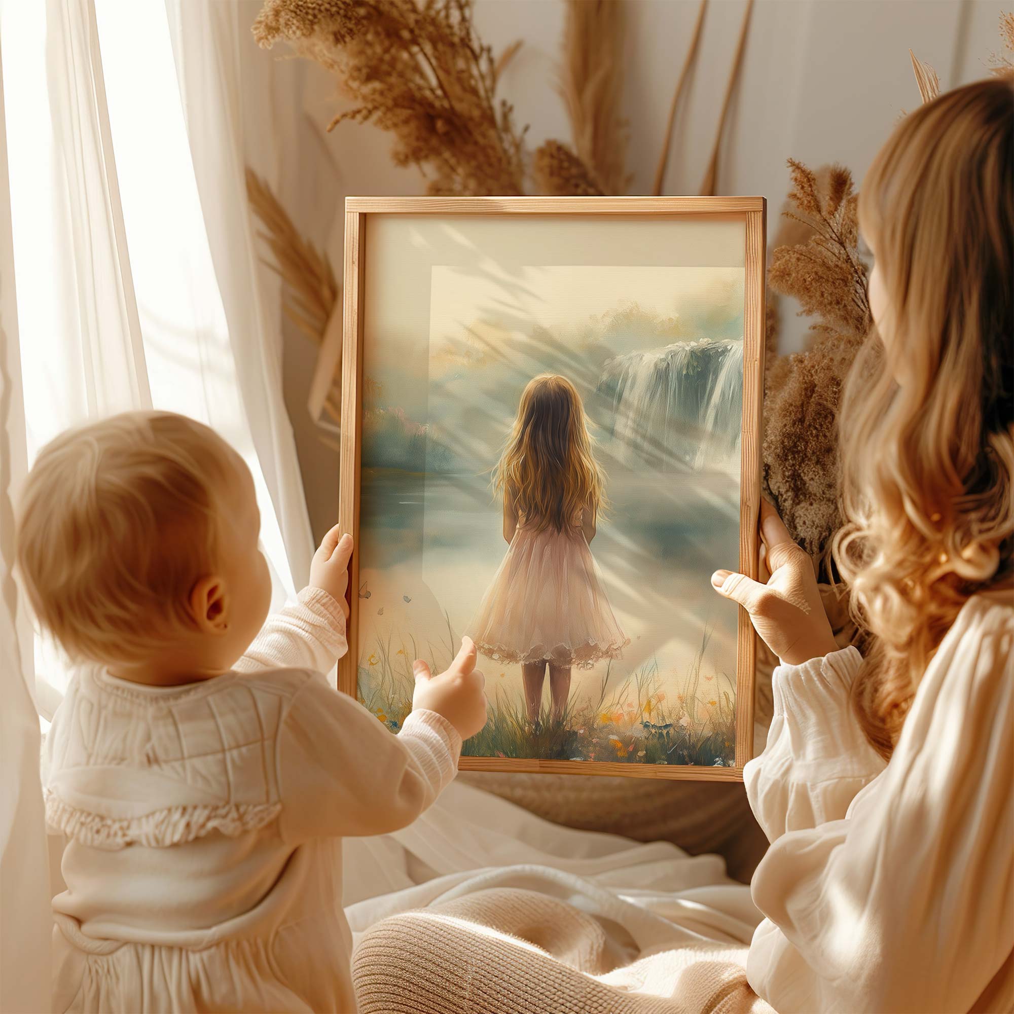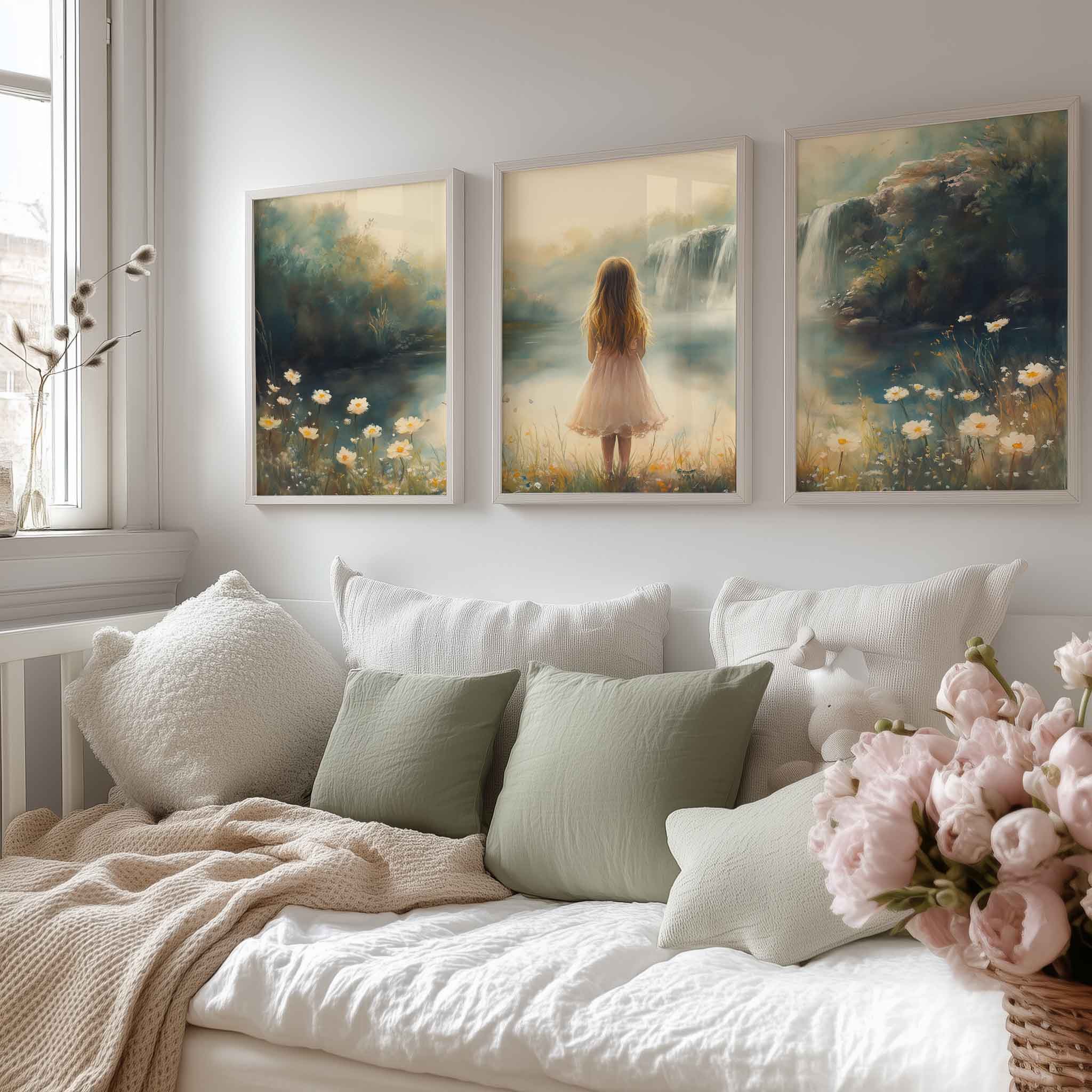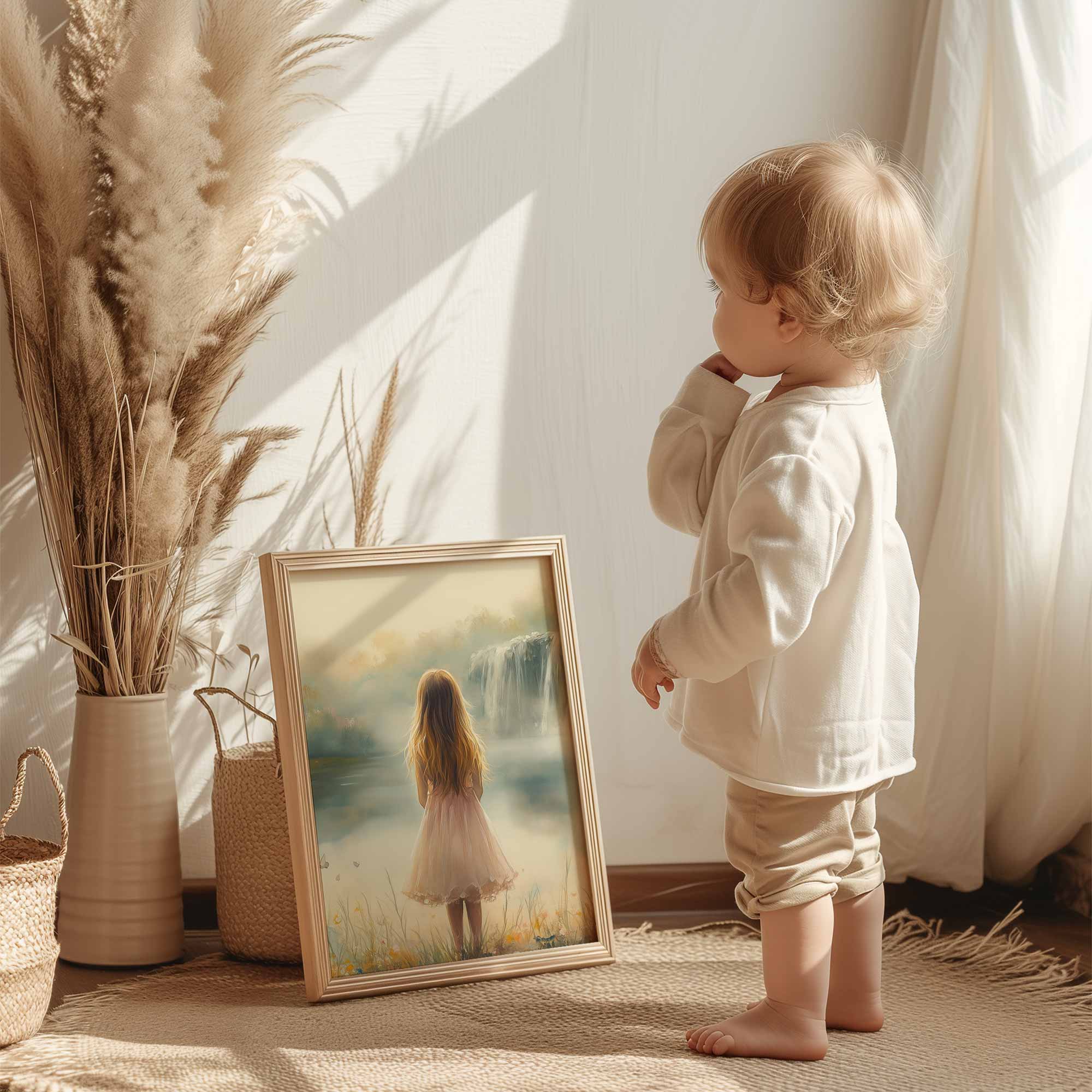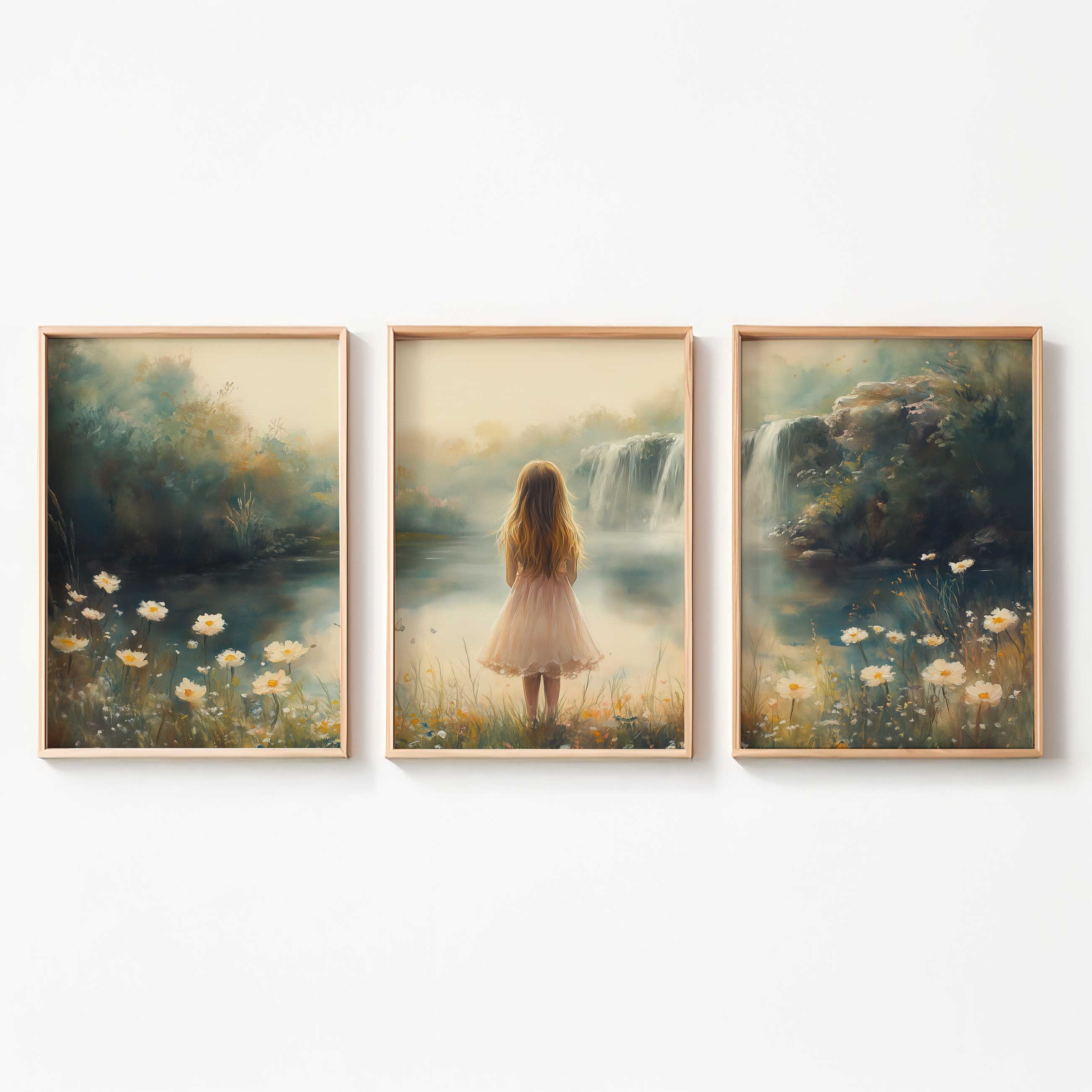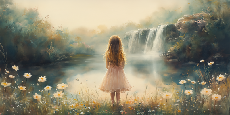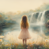 Magisch Meisje in Pastel Bloemenveld bij Waterval