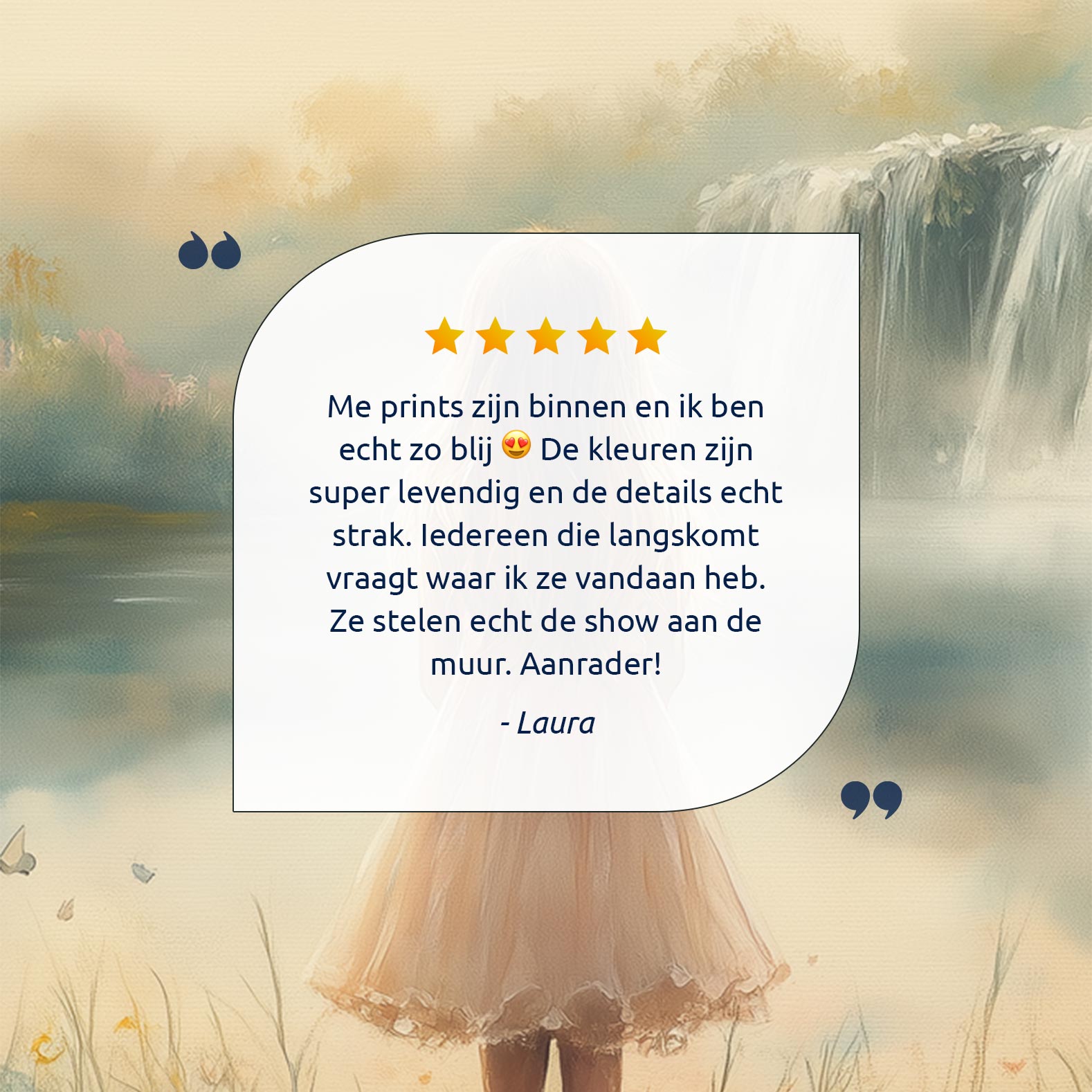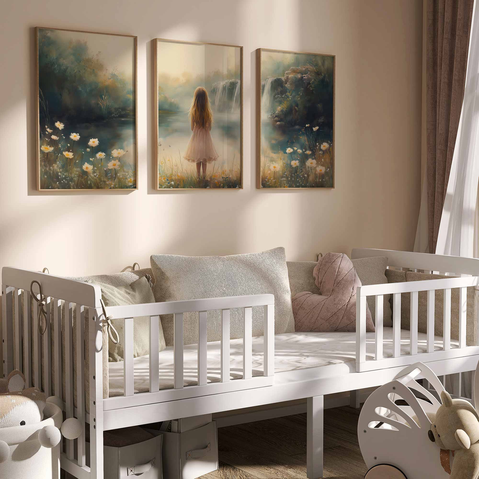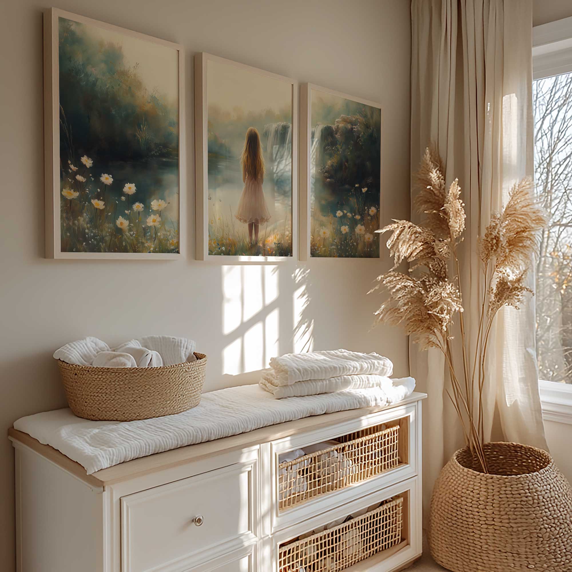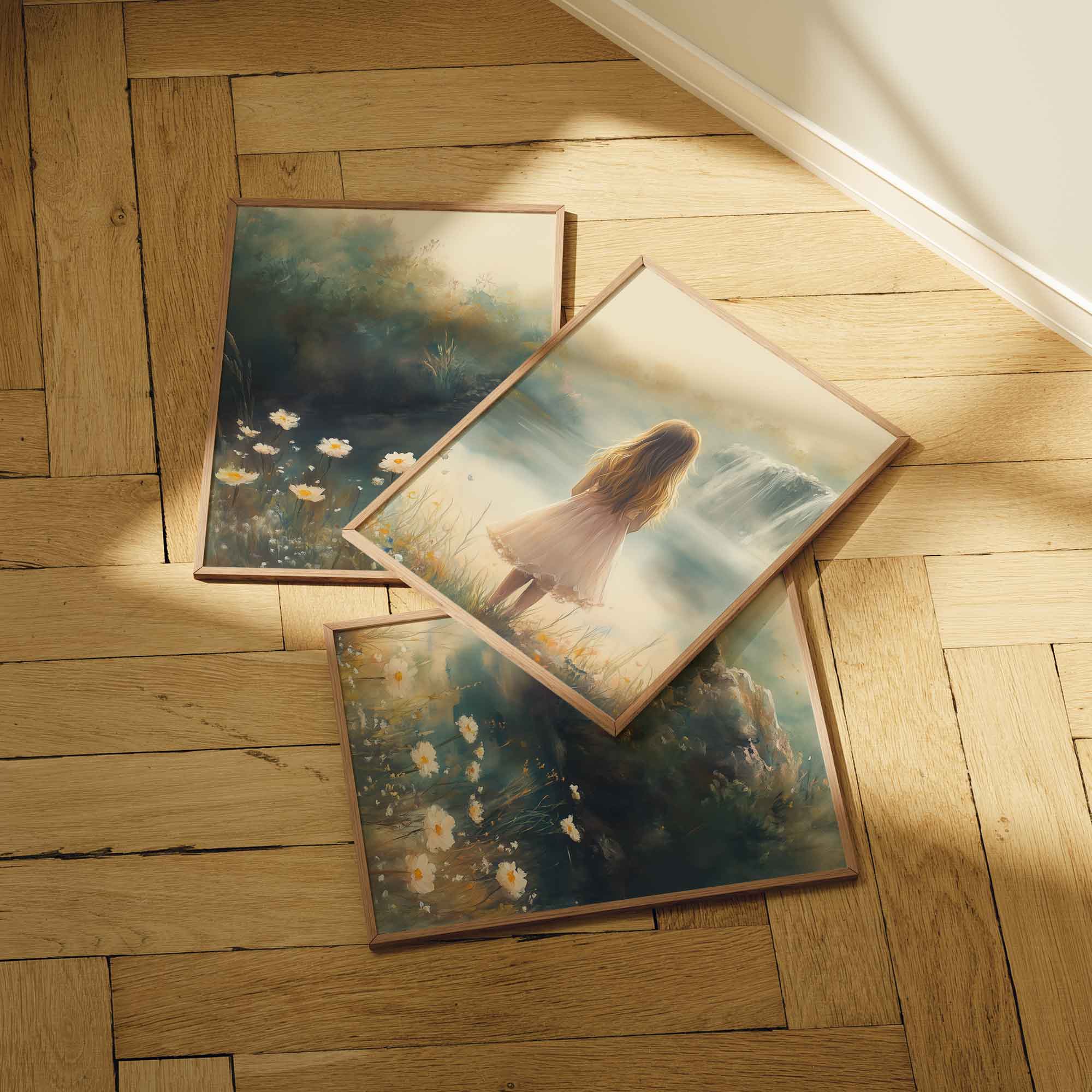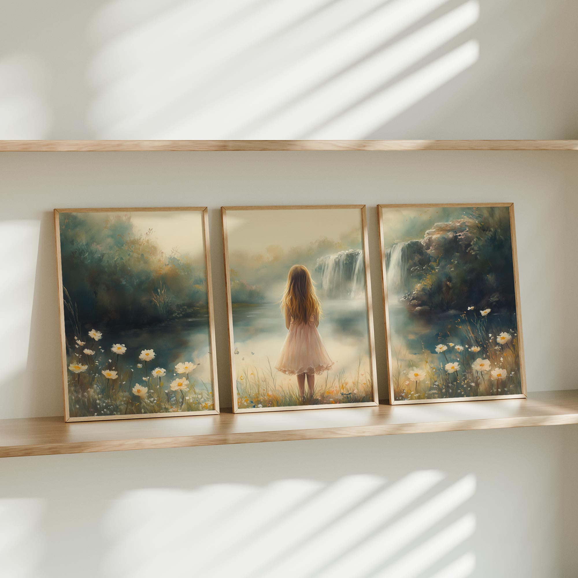 Magisch Meisje in Pastel Bloemenveld bij Waterval