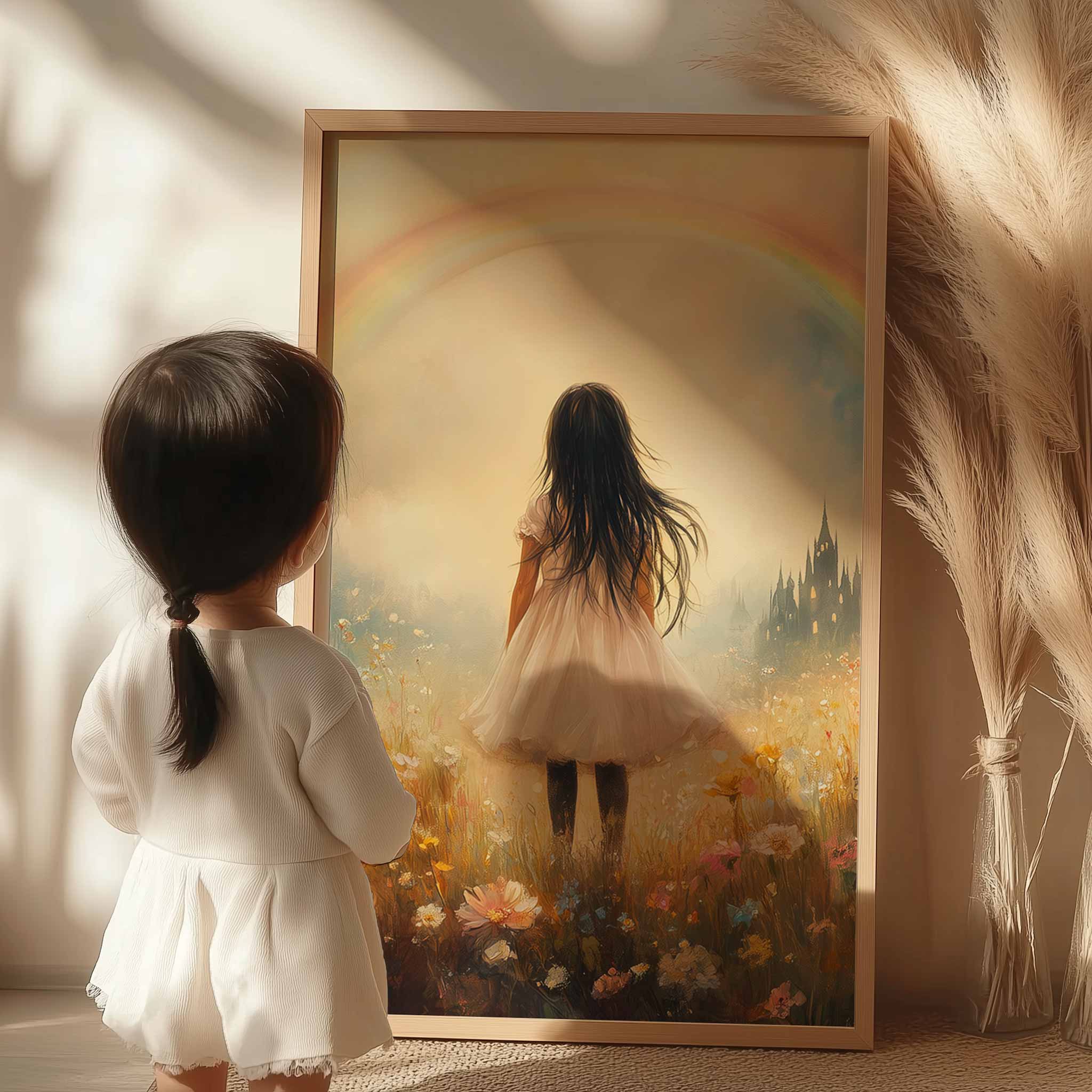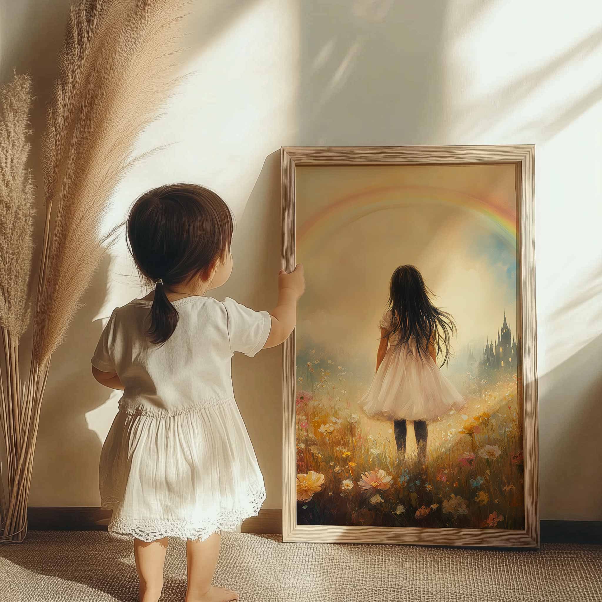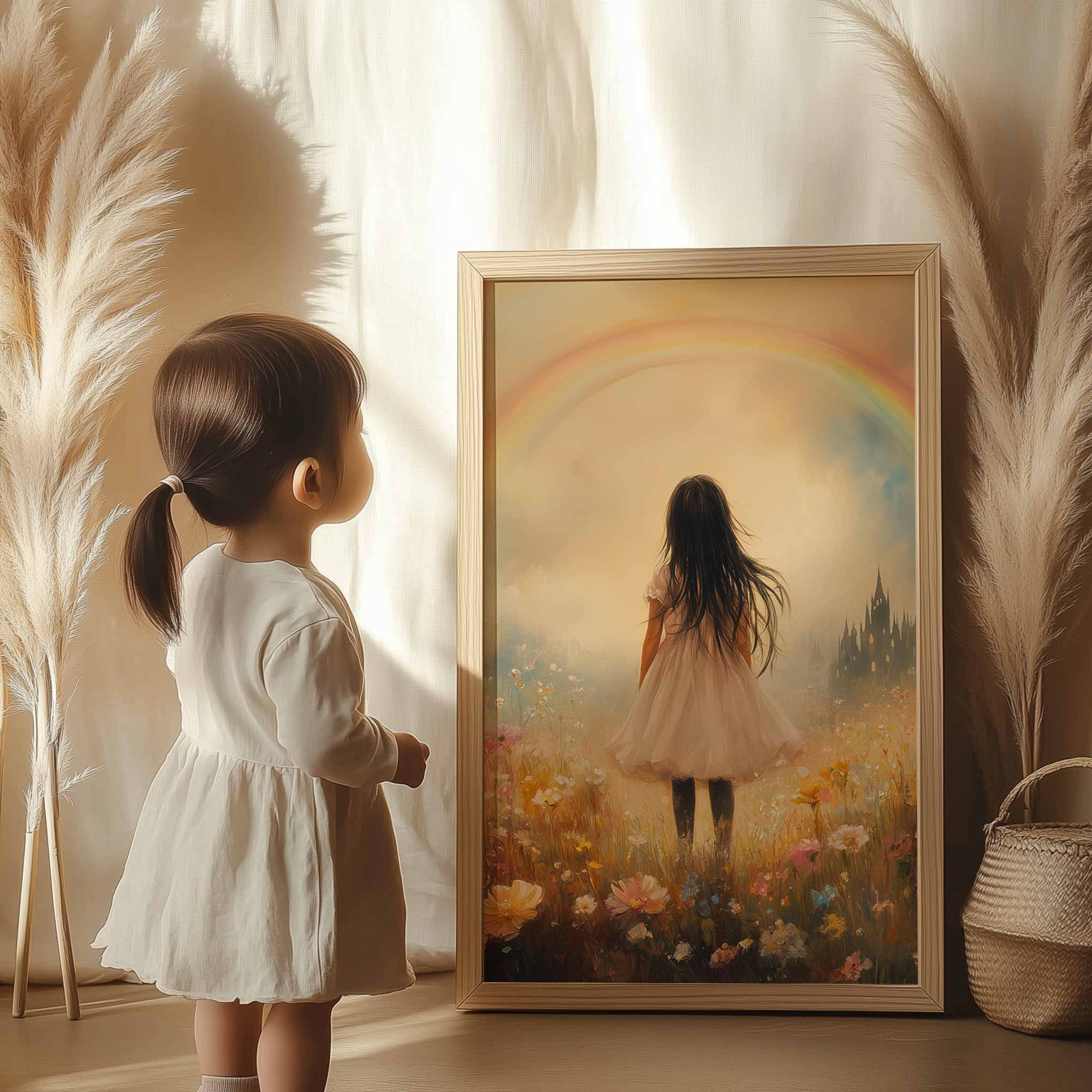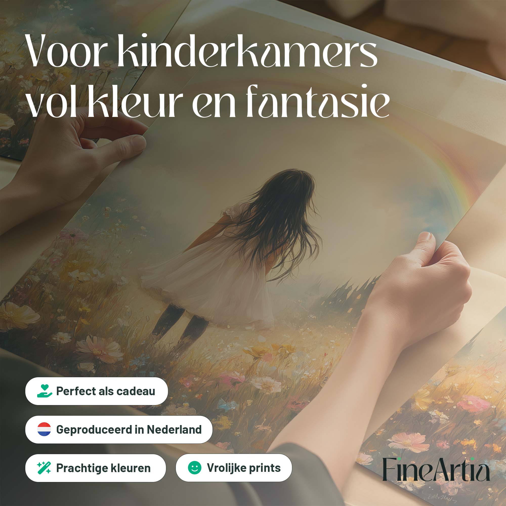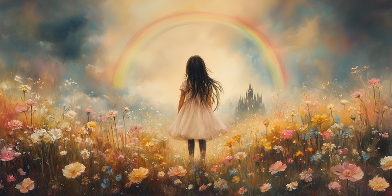 Magisch Meisje in Pastel Bloemenveld met Regenboog