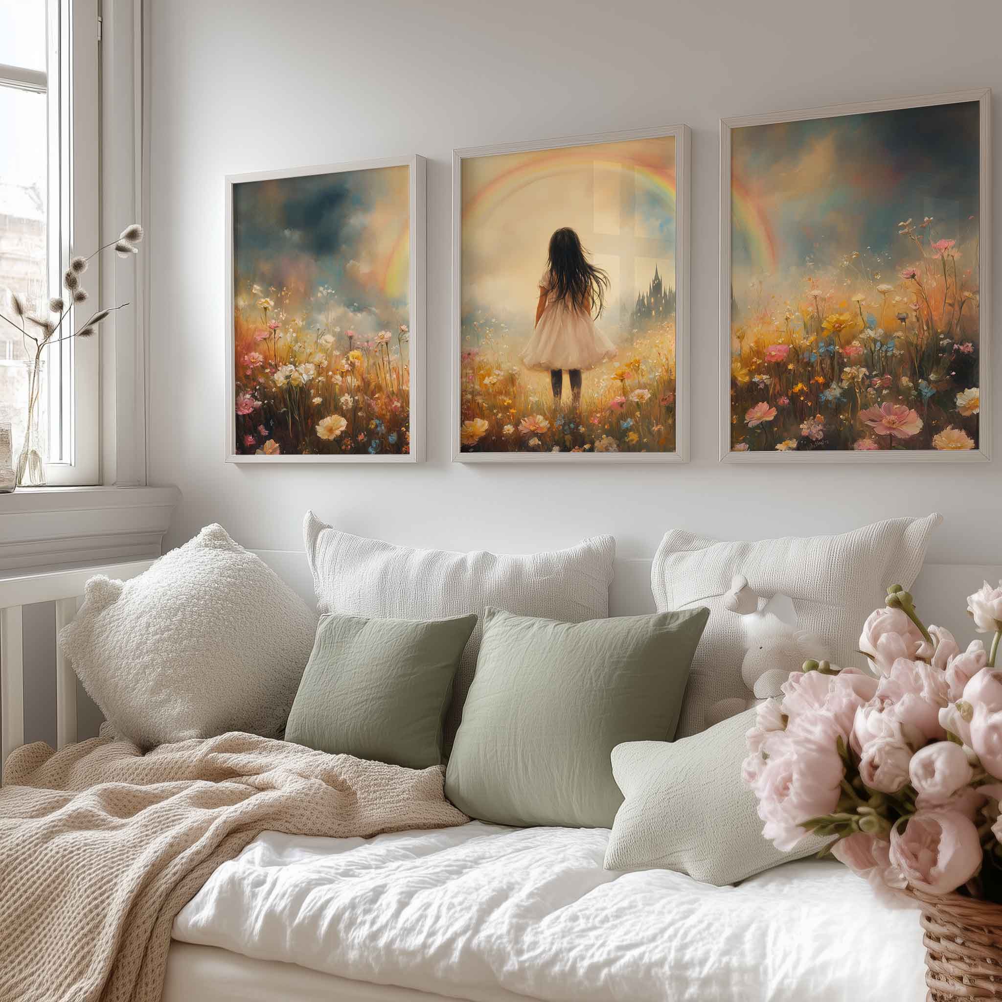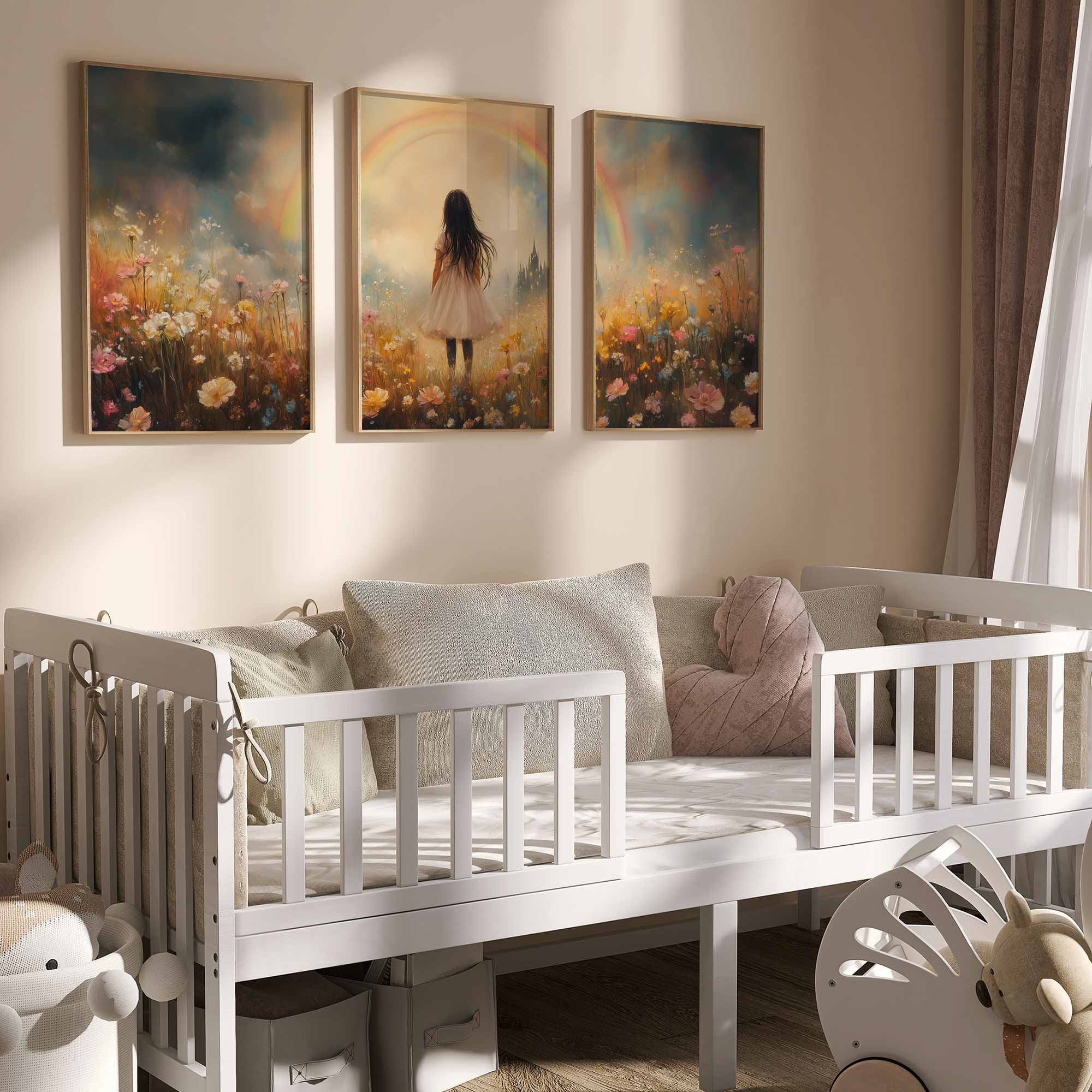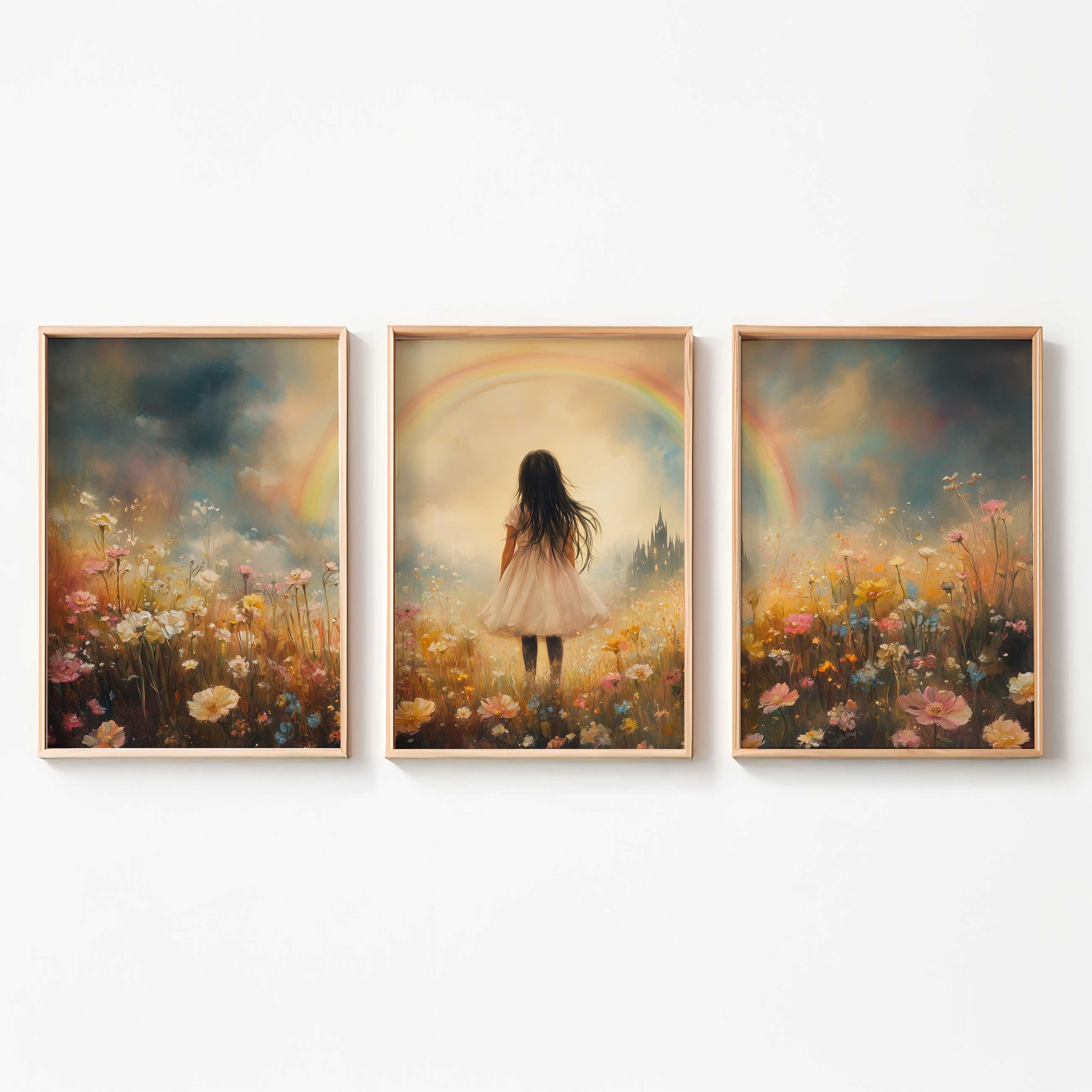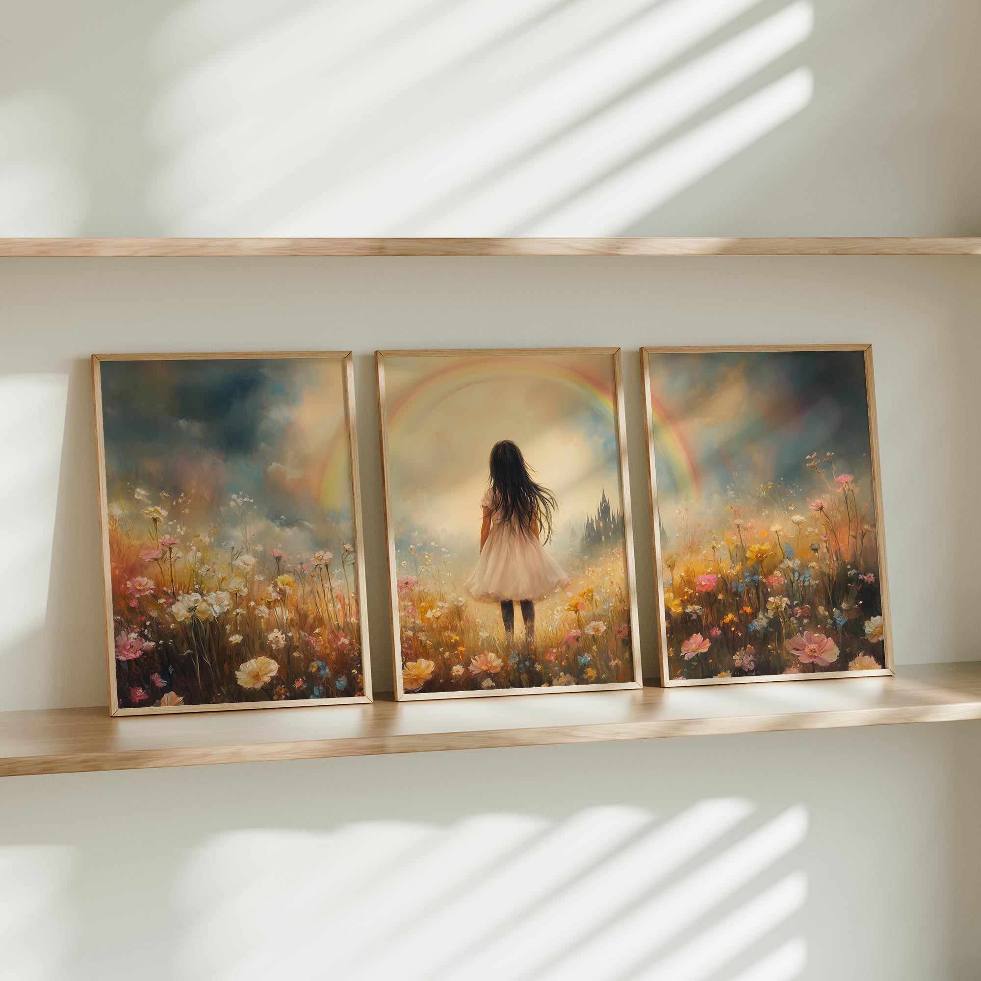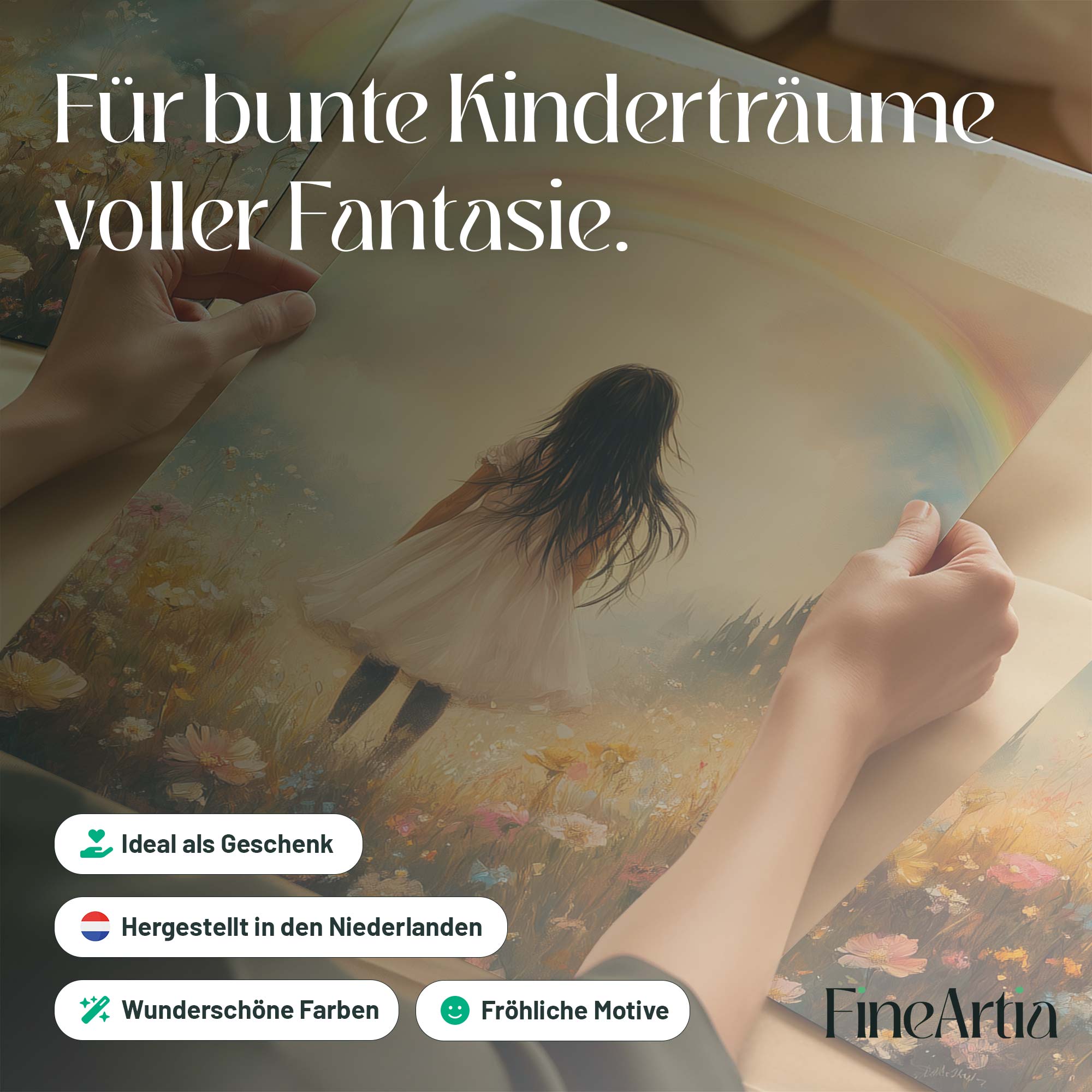 Magisch Meisje in Pastel Bloemenveld met Regenboog