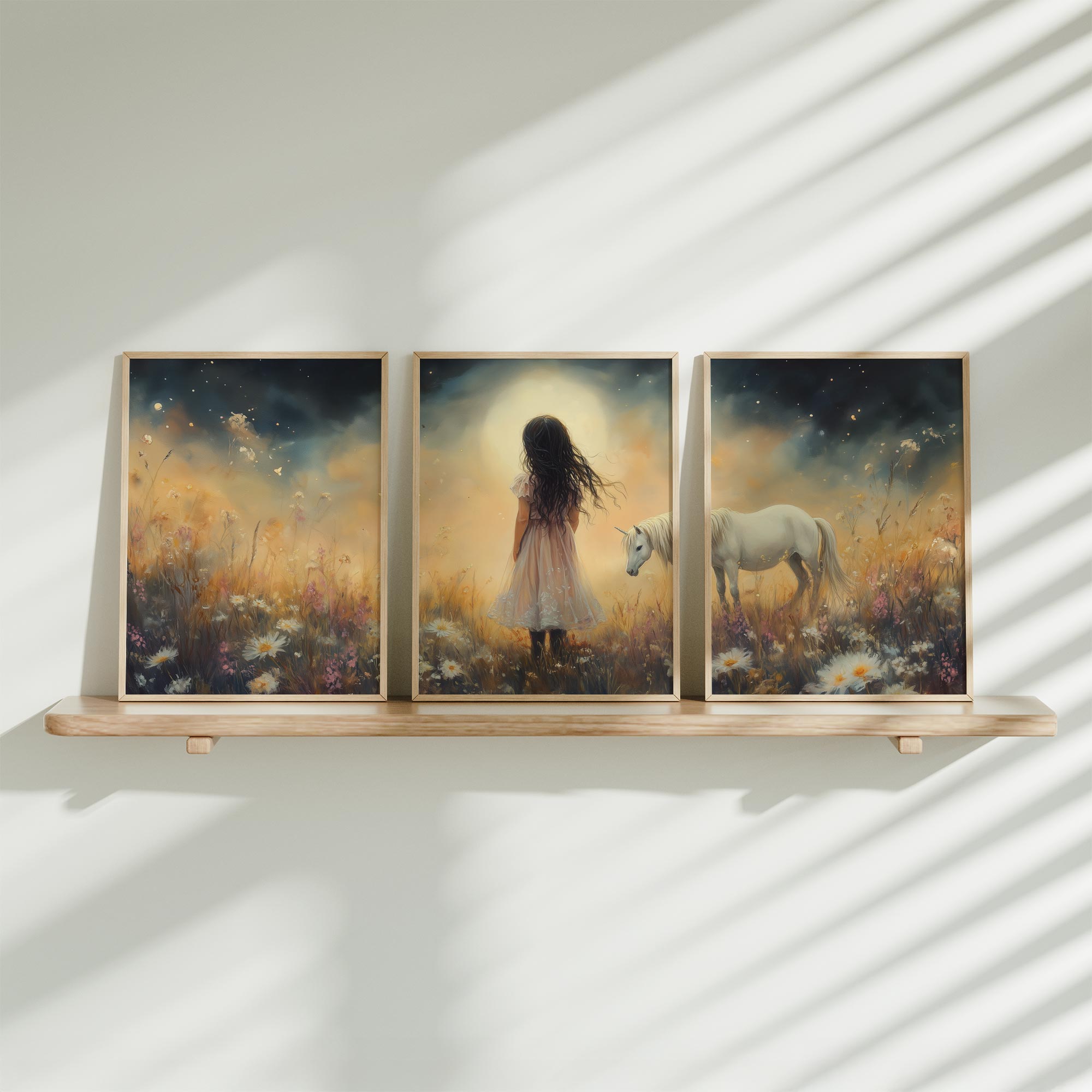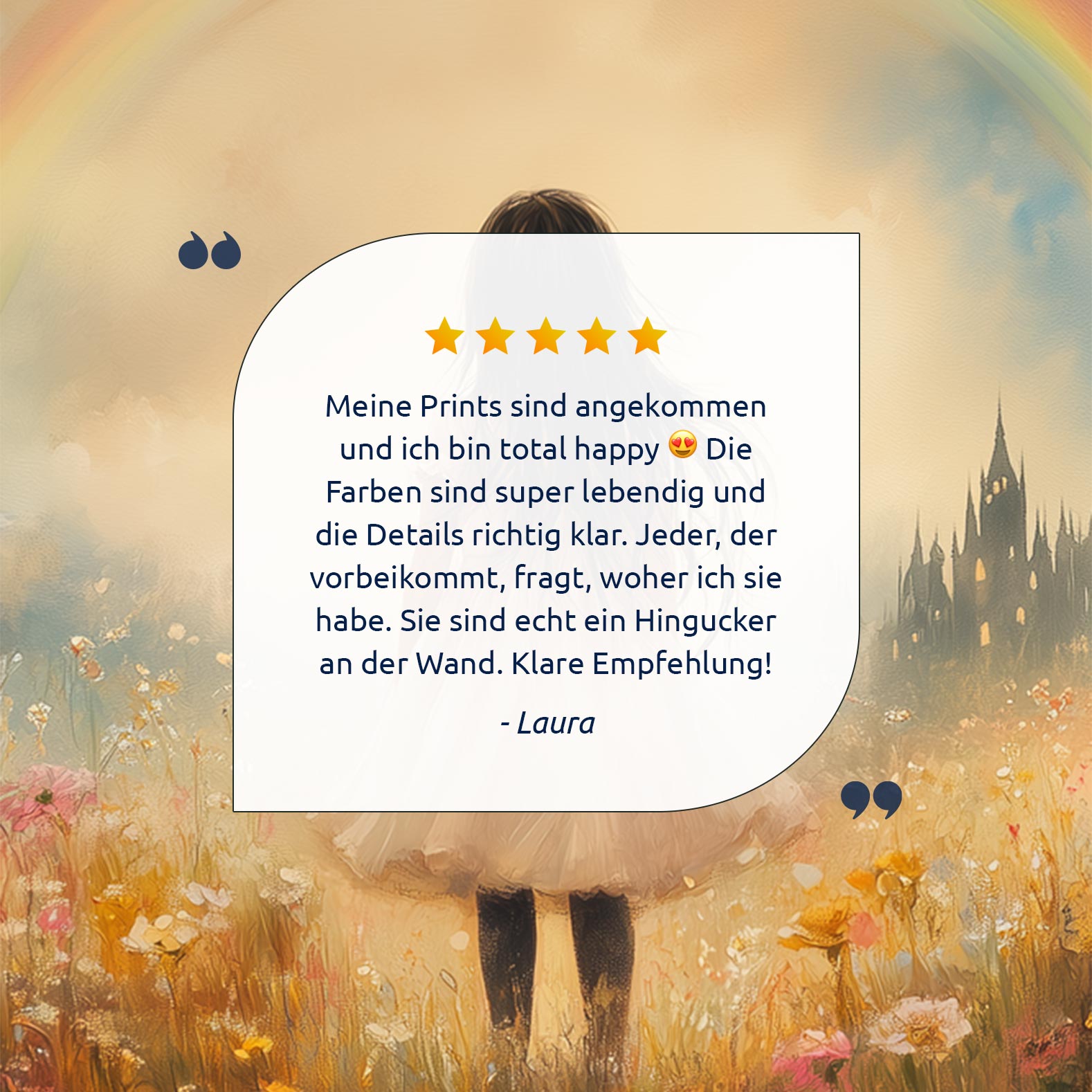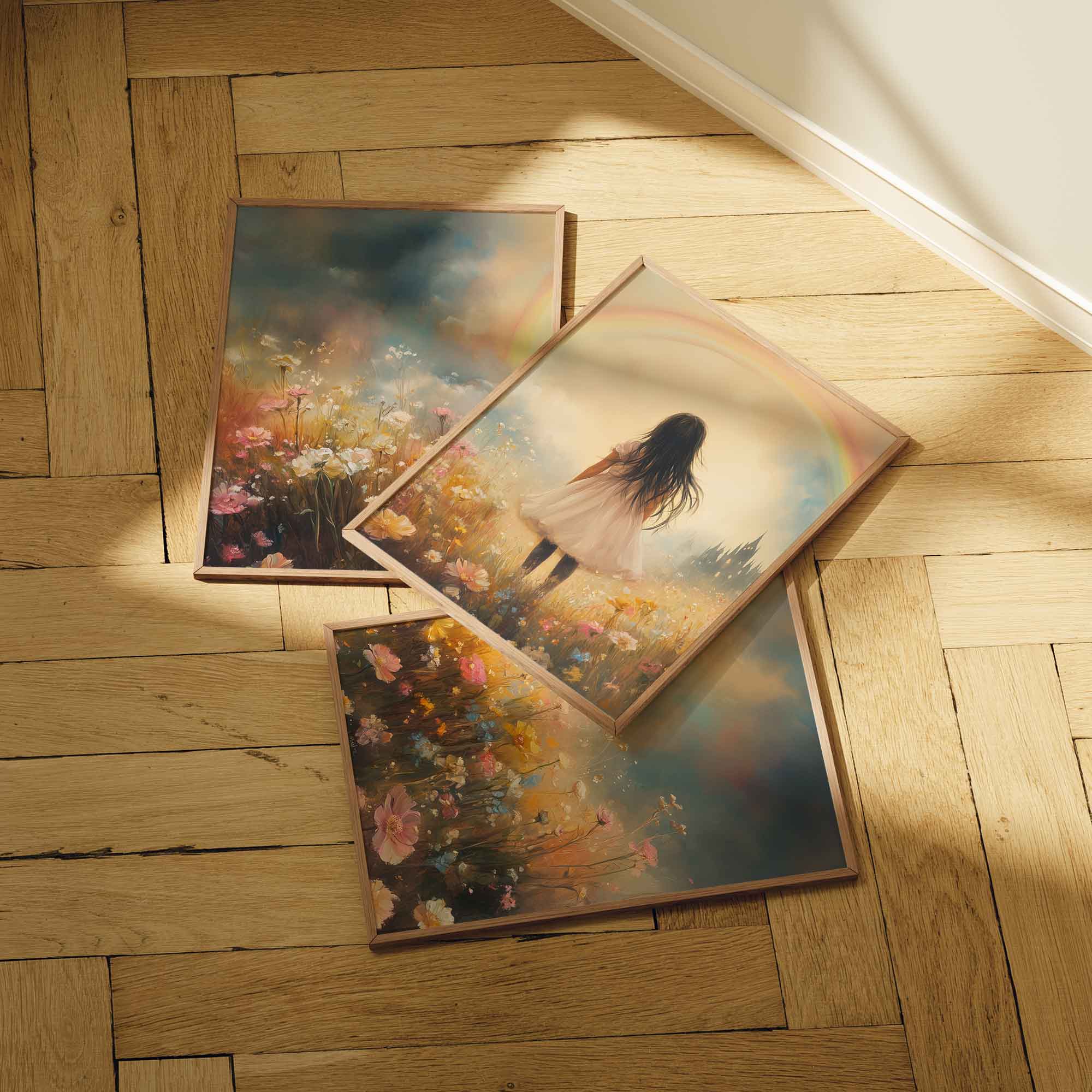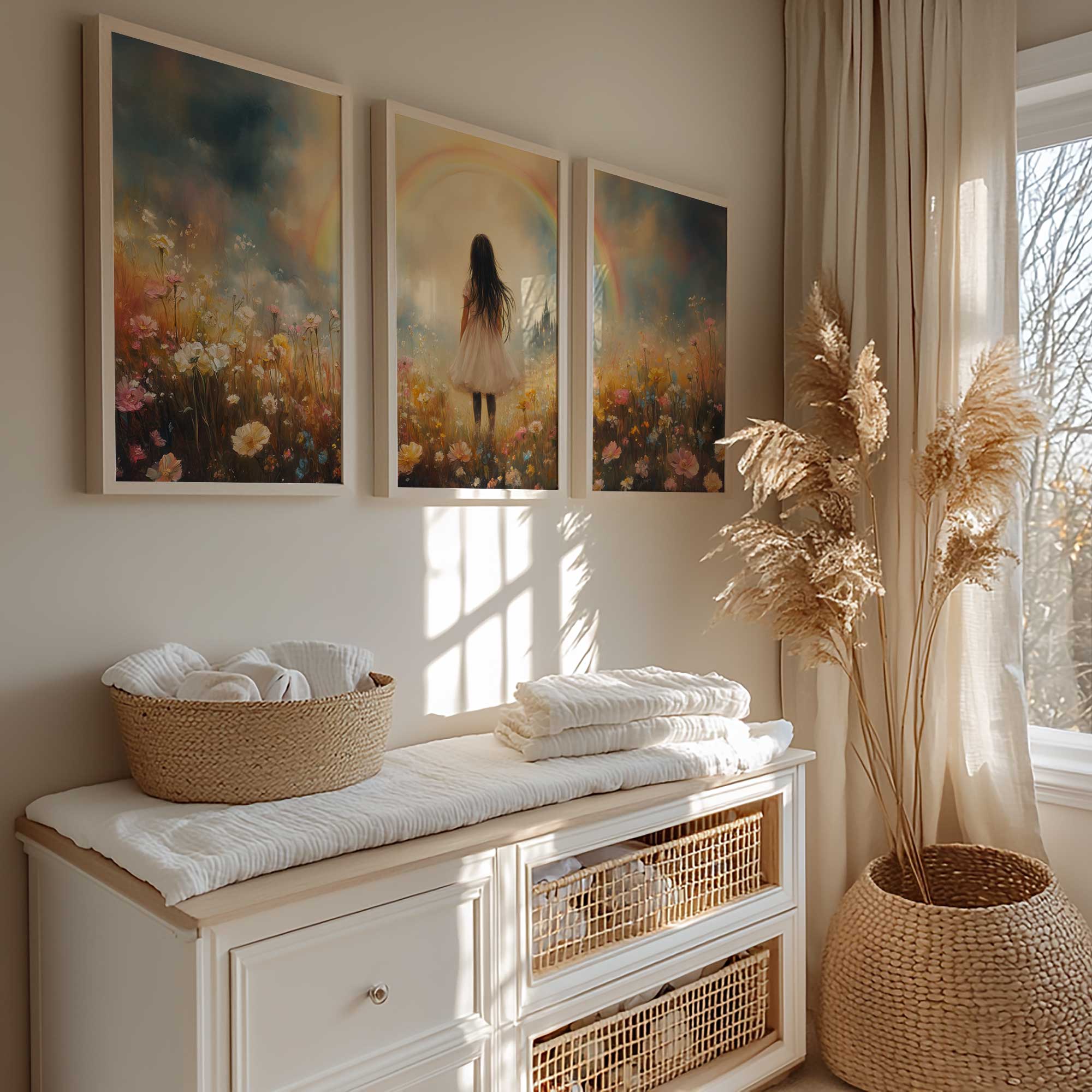 Magisch Meisje in Pastel Bloemenveld met Regenboog