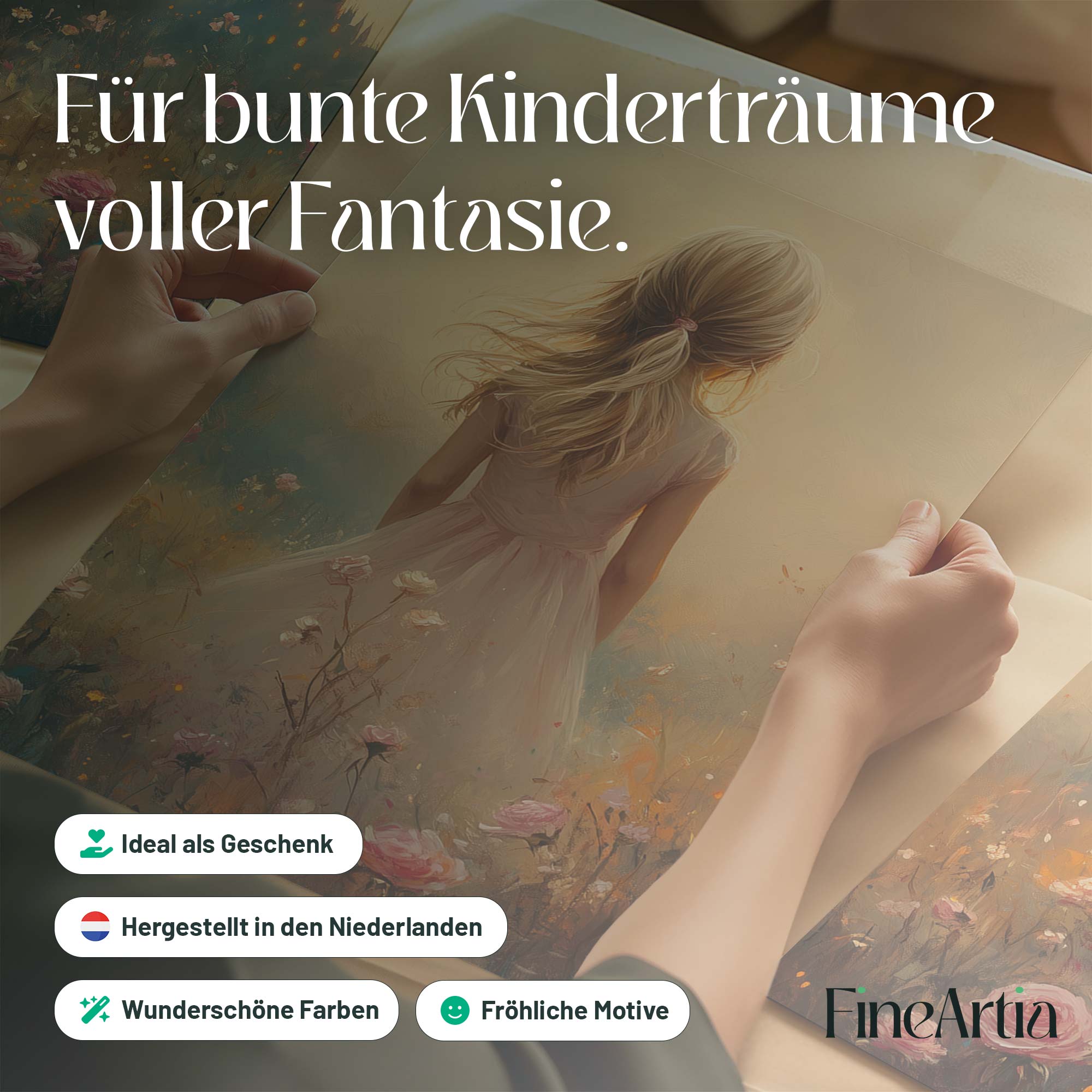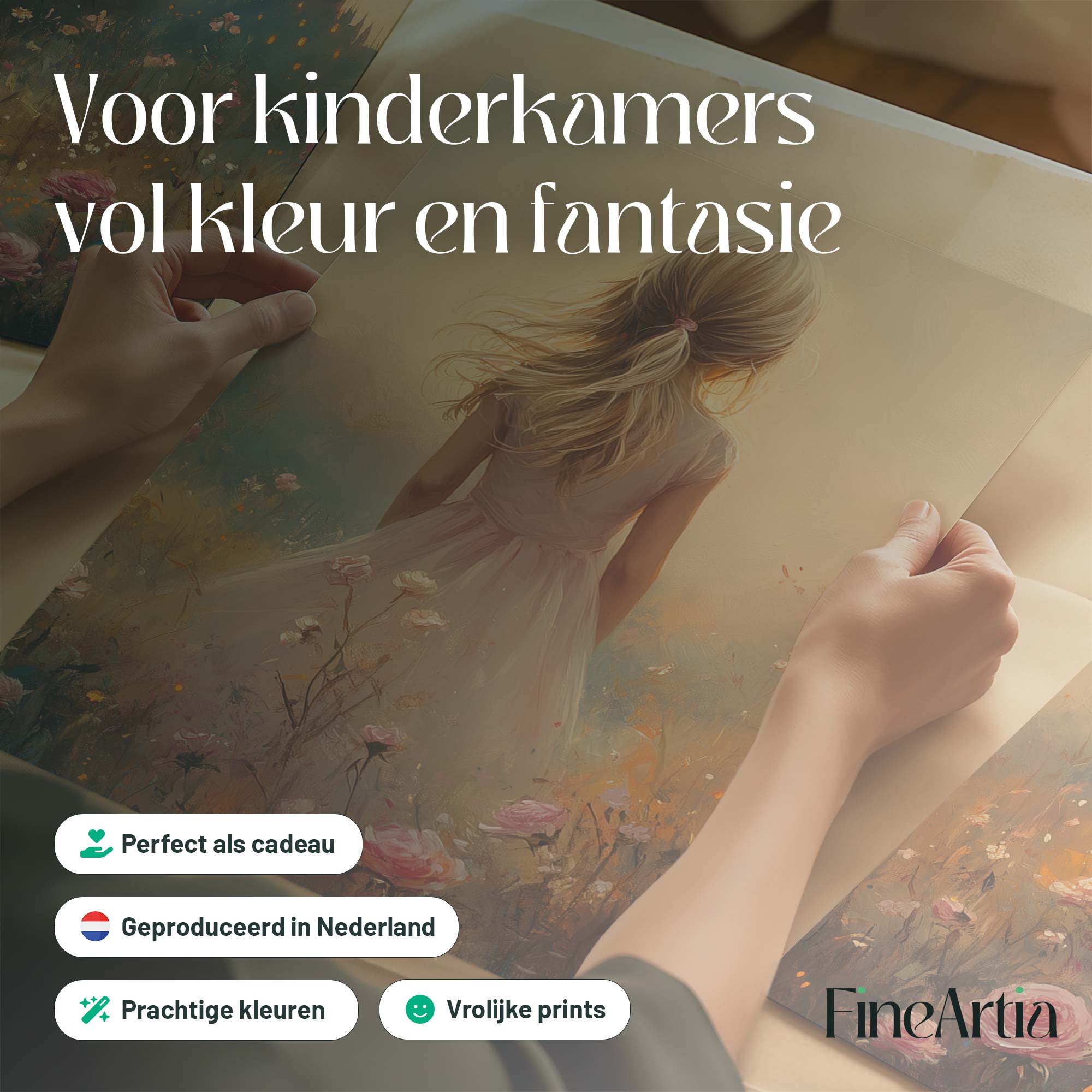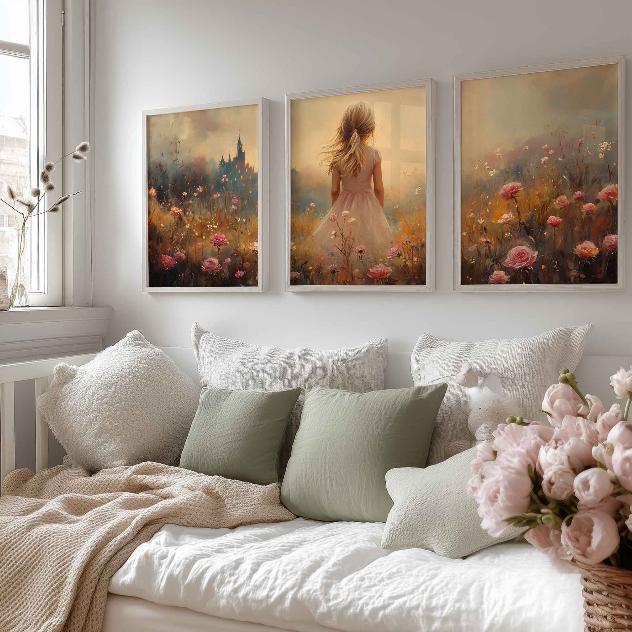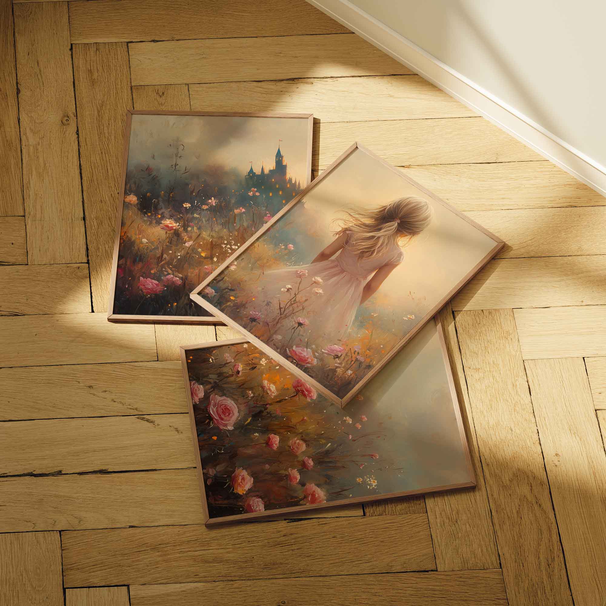 Terug naar collectie Posters Magisch Meisje in Roze Bloemenveld met Kasteel