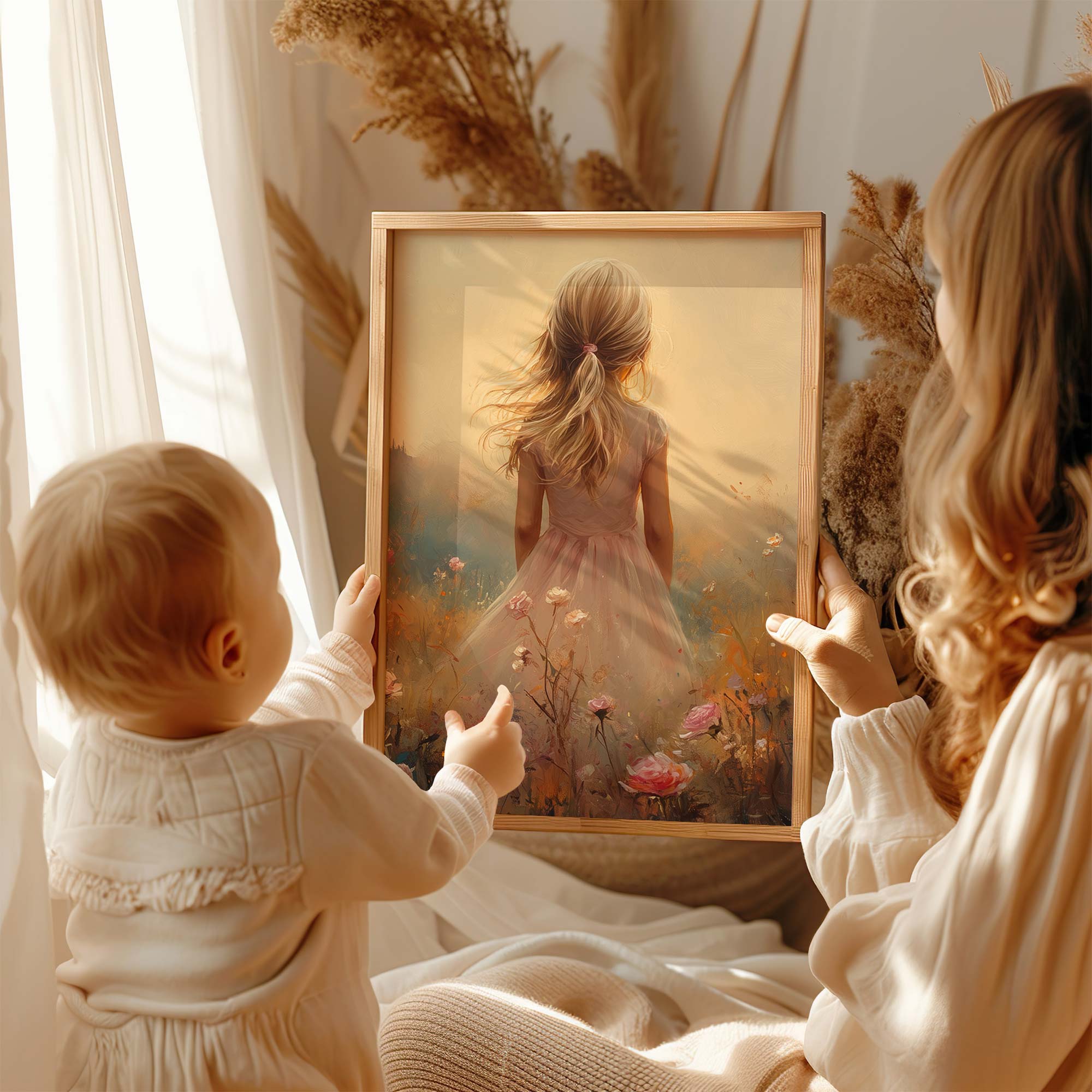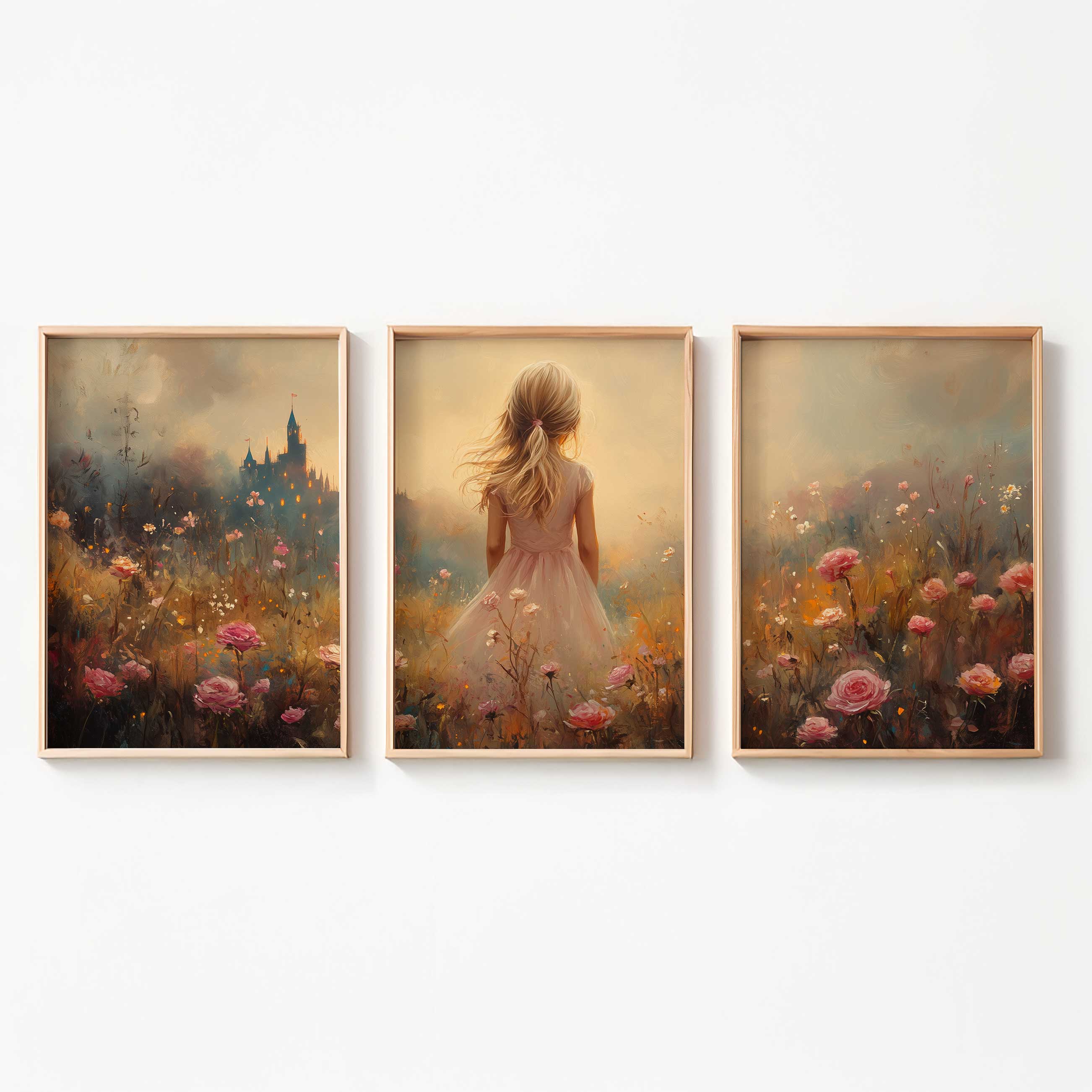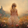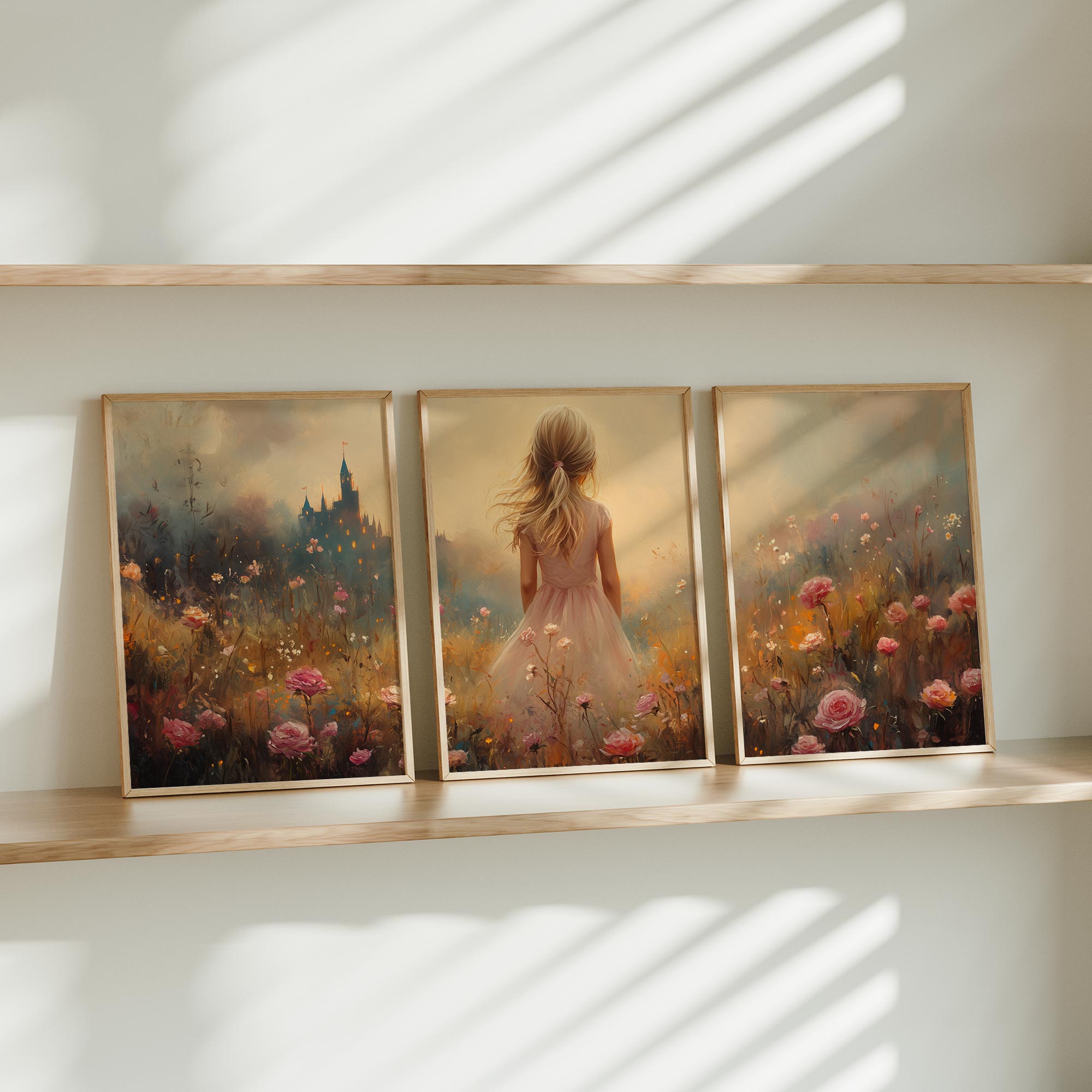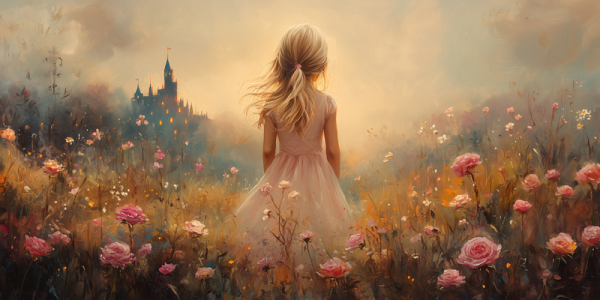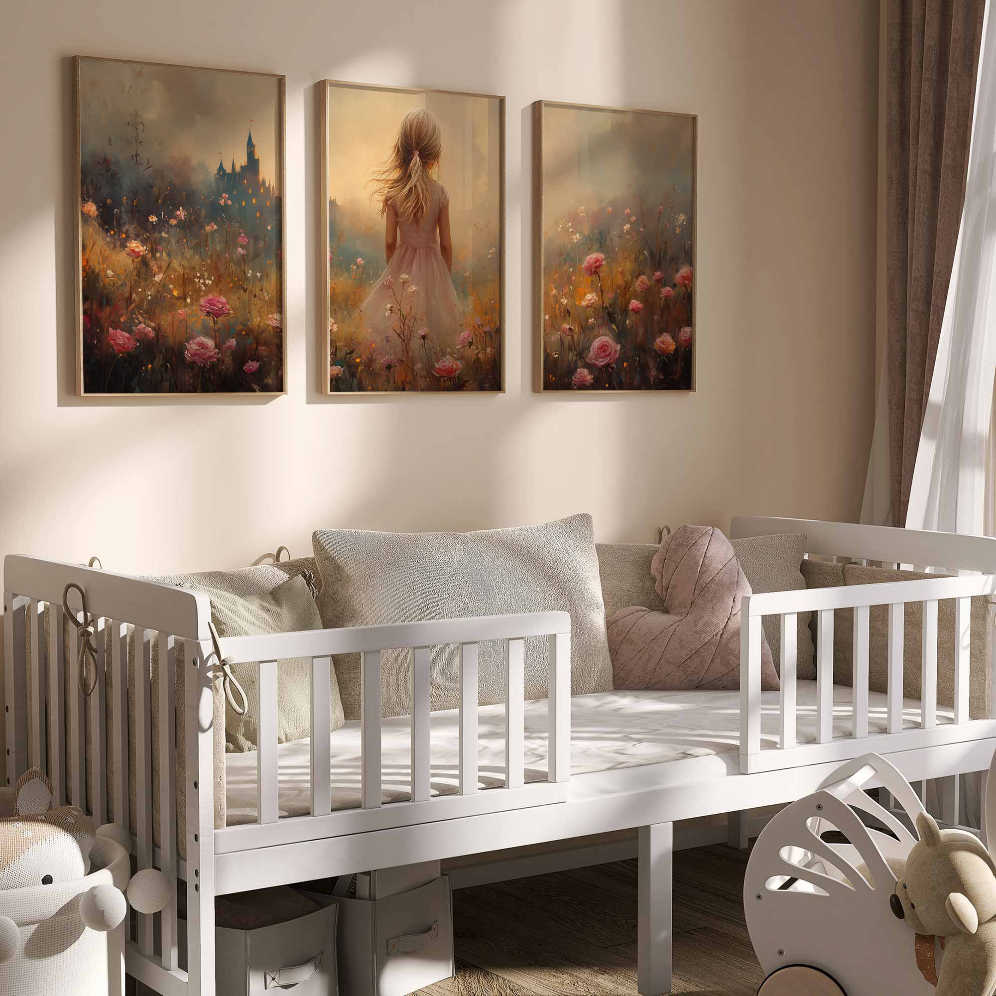 Terug naar collectie Posters Magisch Meisje in Roze Bloemenveld met Kasteel