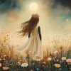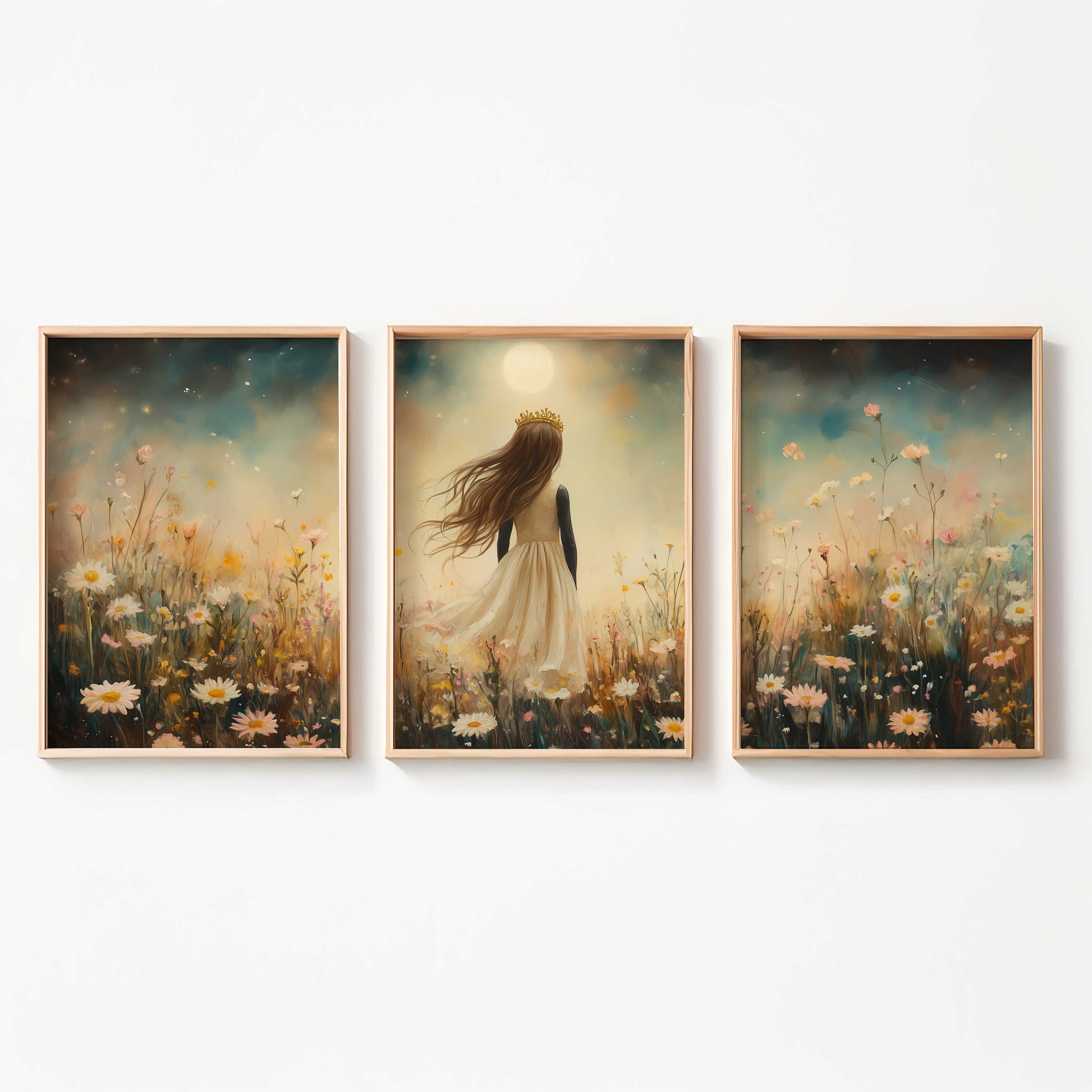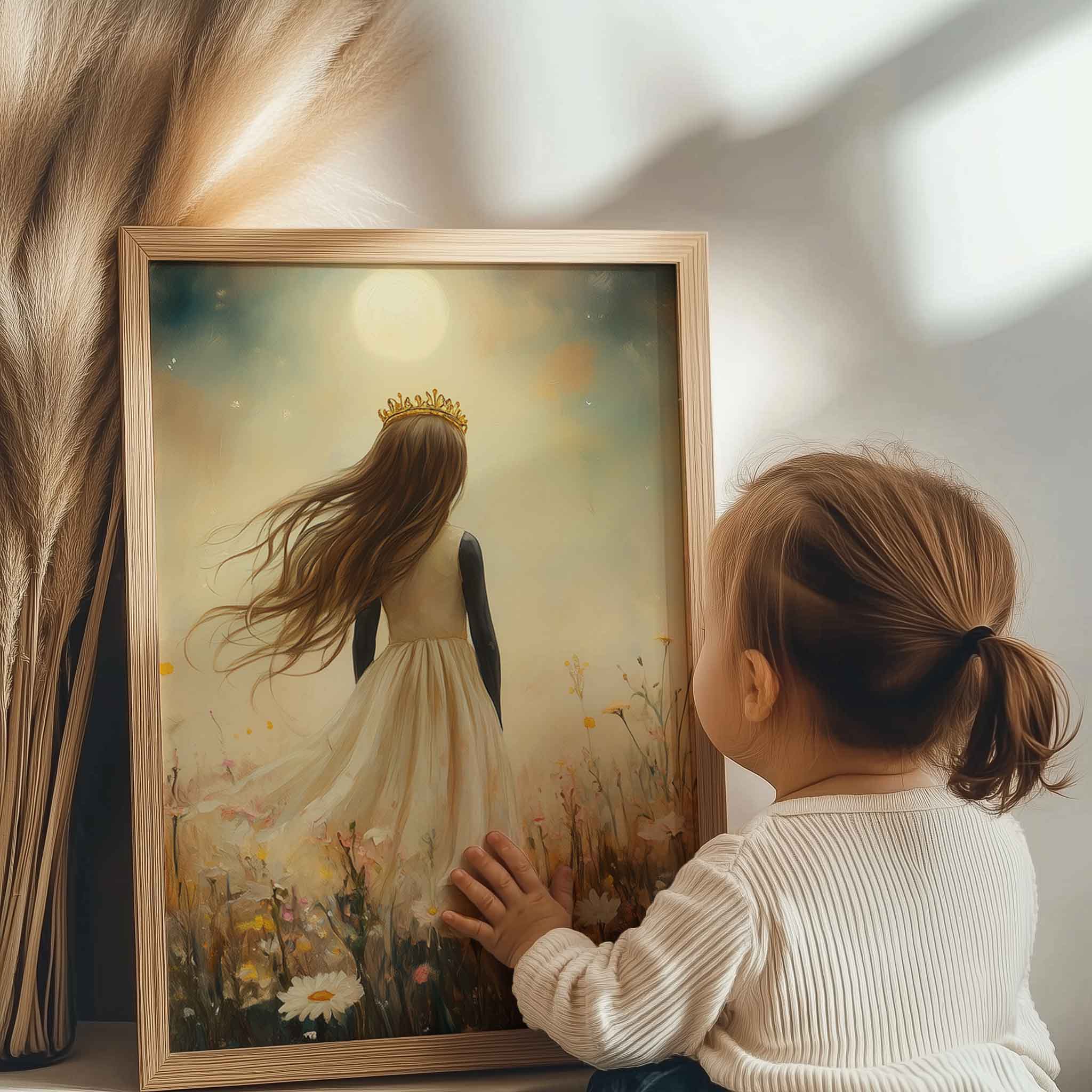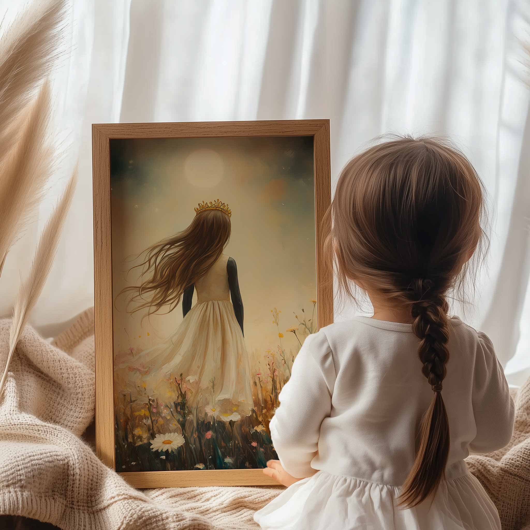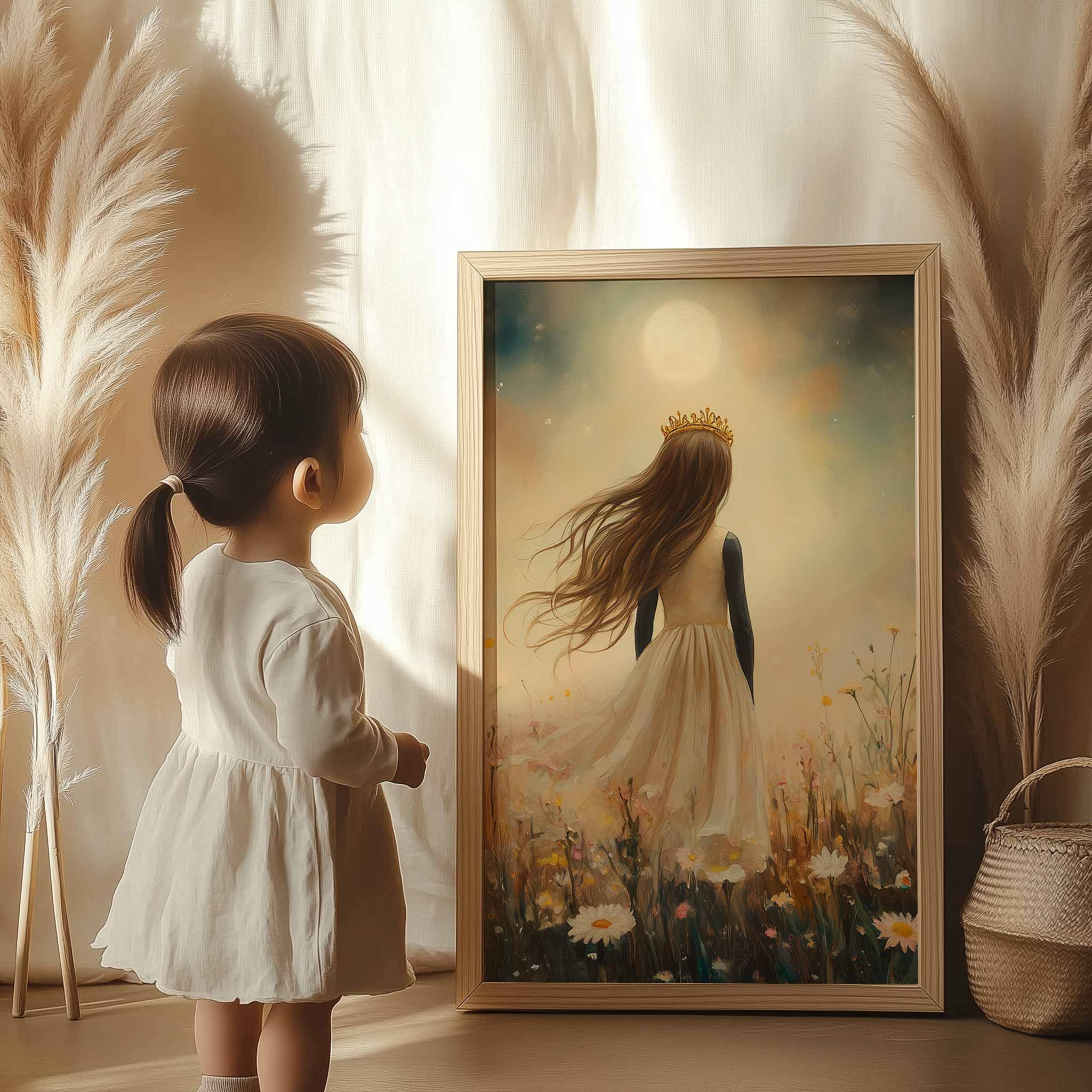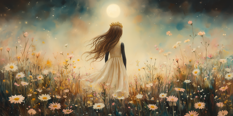 Magisch Meisje met Kroon in Maanlicht en Bloemenveld