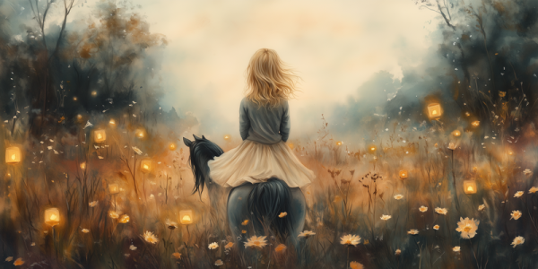 Magisch Meisje op Paard tussen Bloemen en Lantaarns