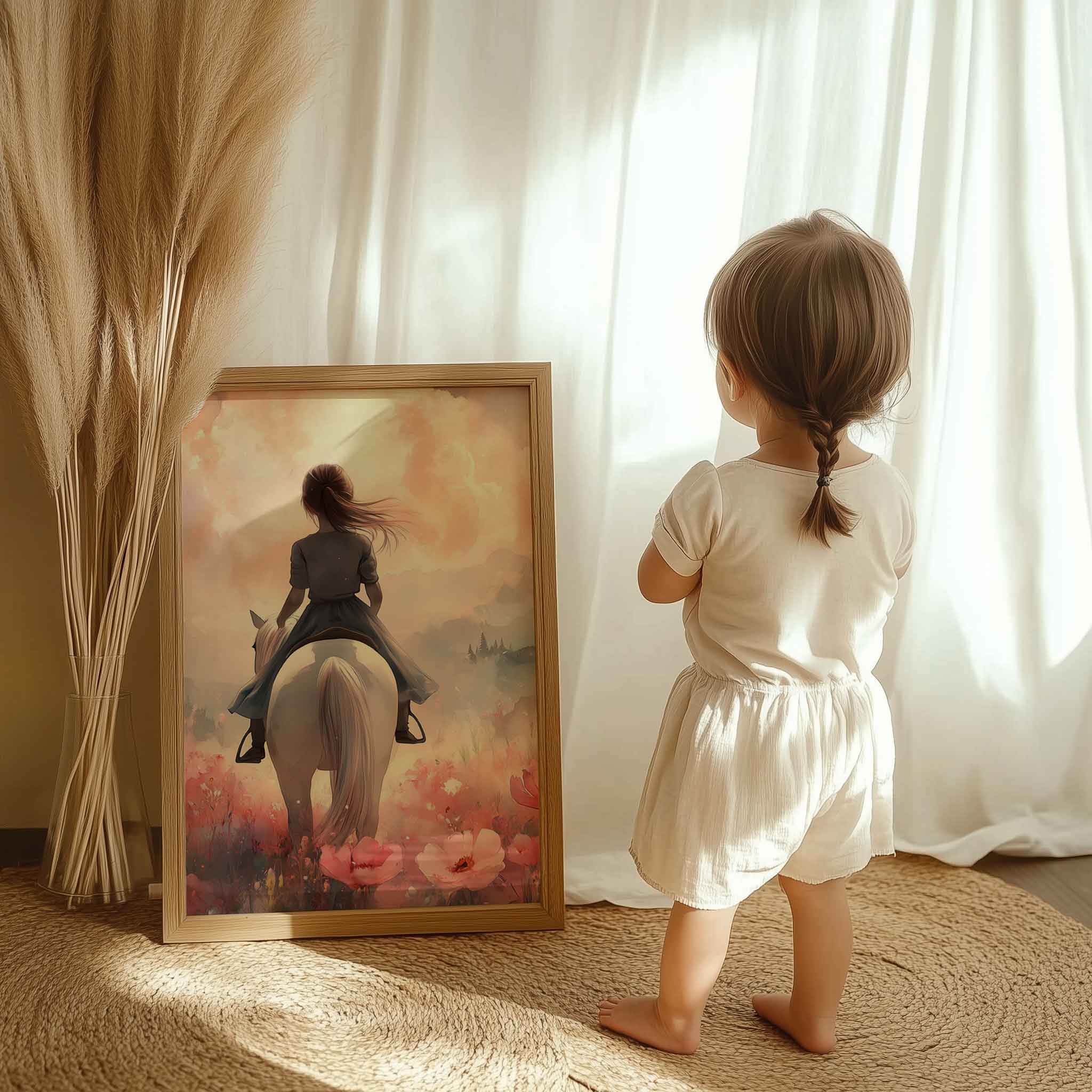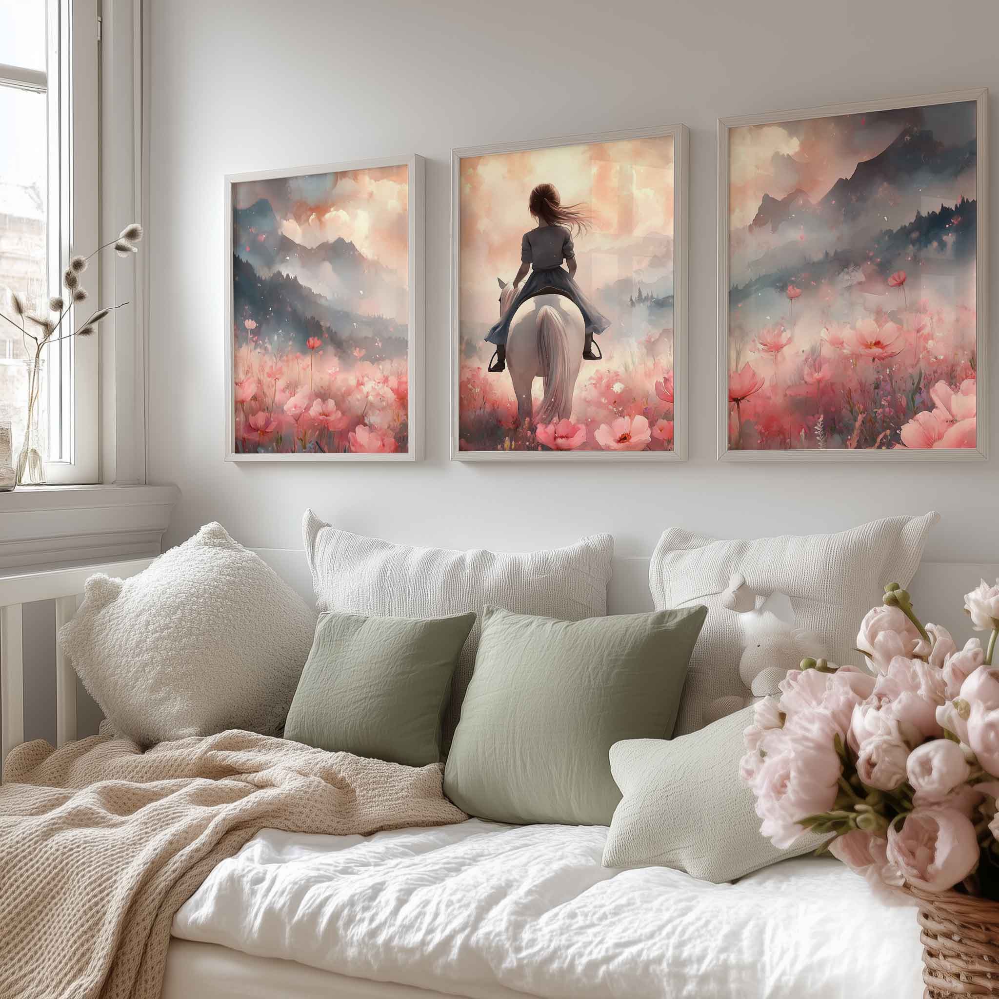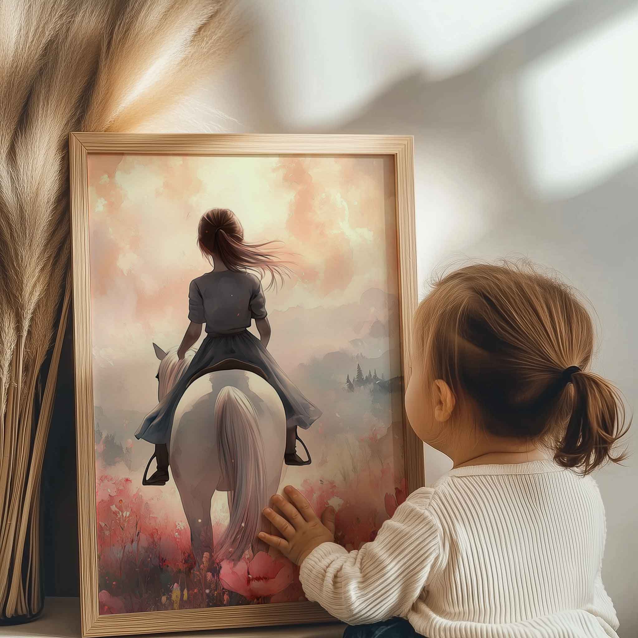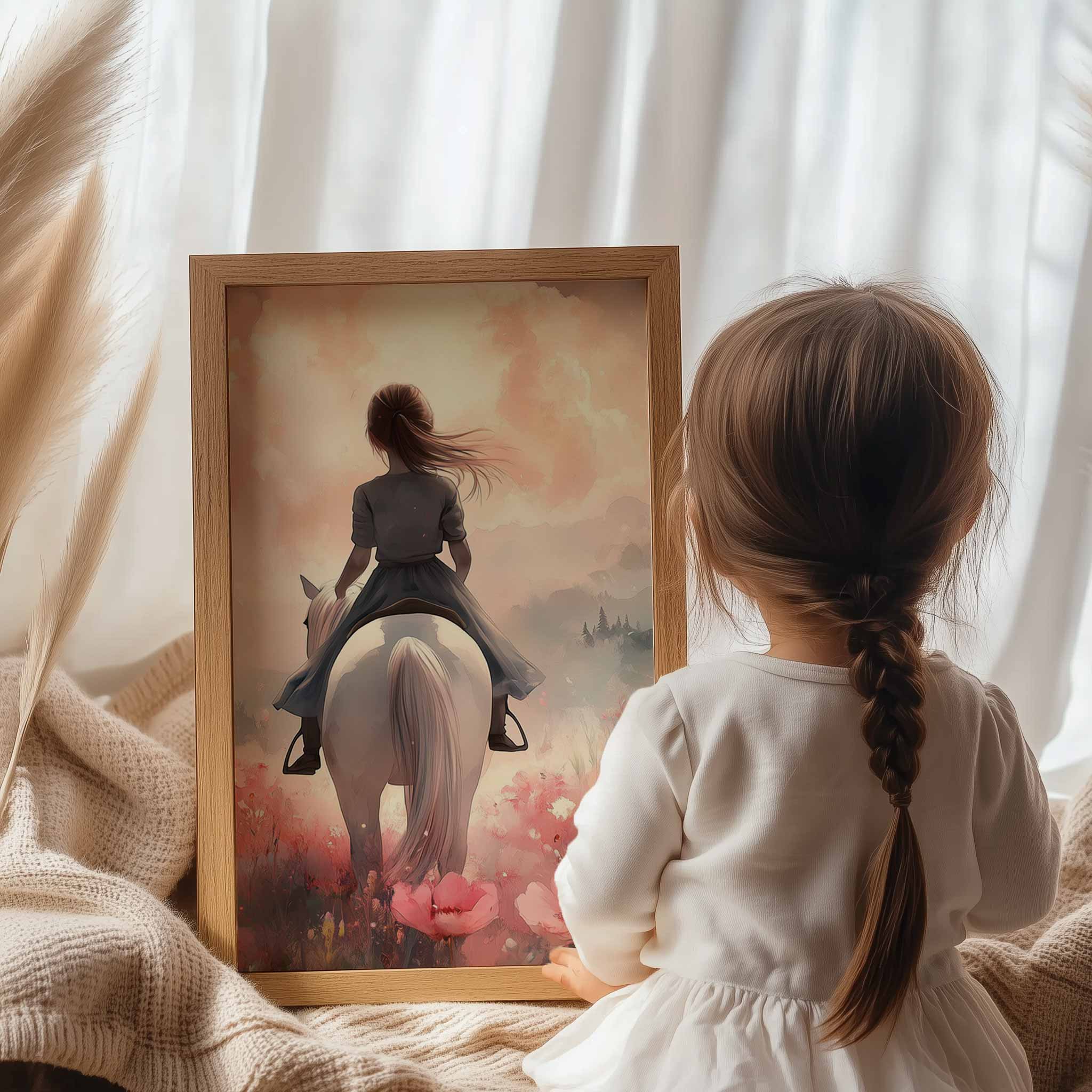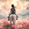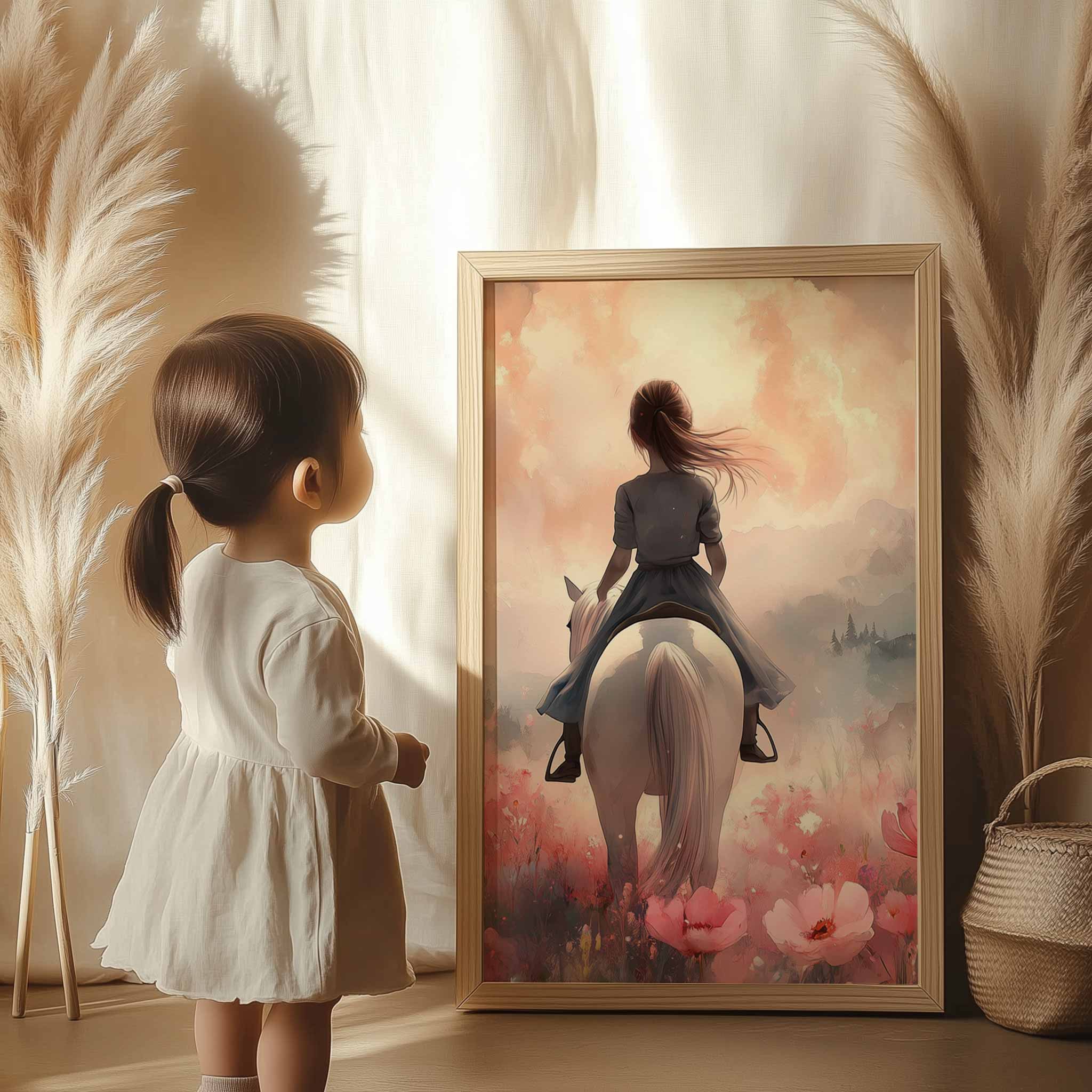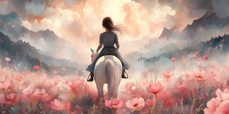 Magisch Meisje op Witte Paard in Roze Bloemenveld