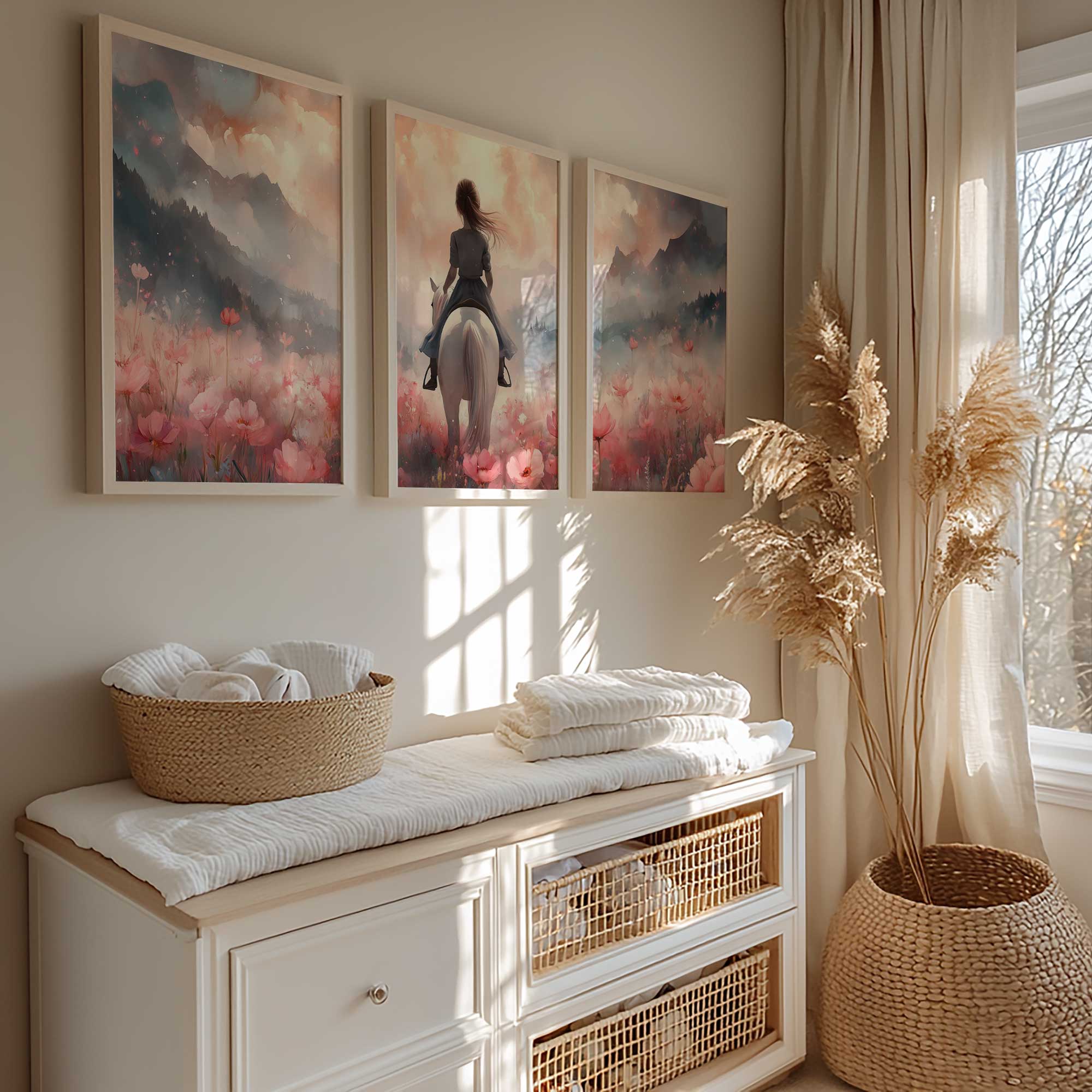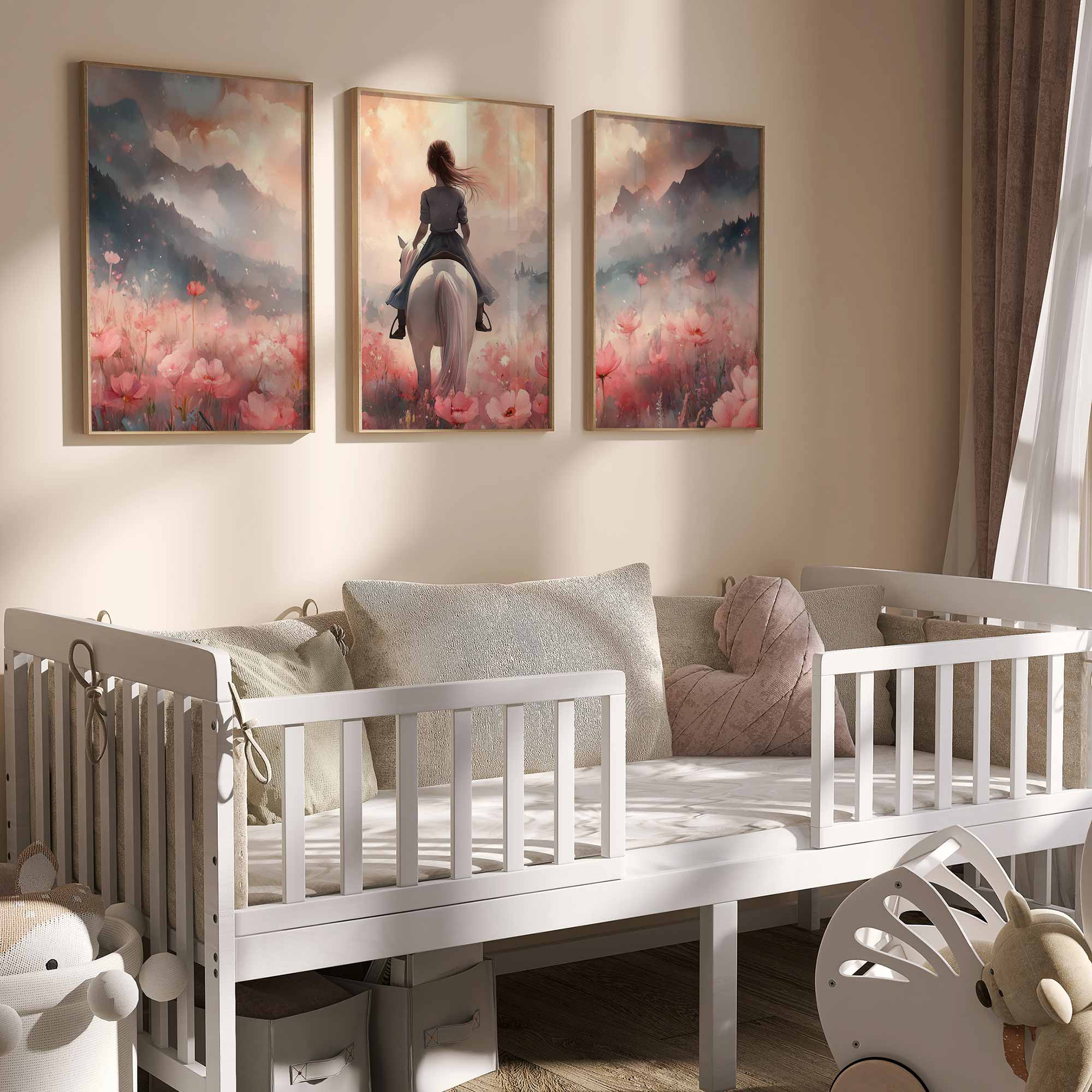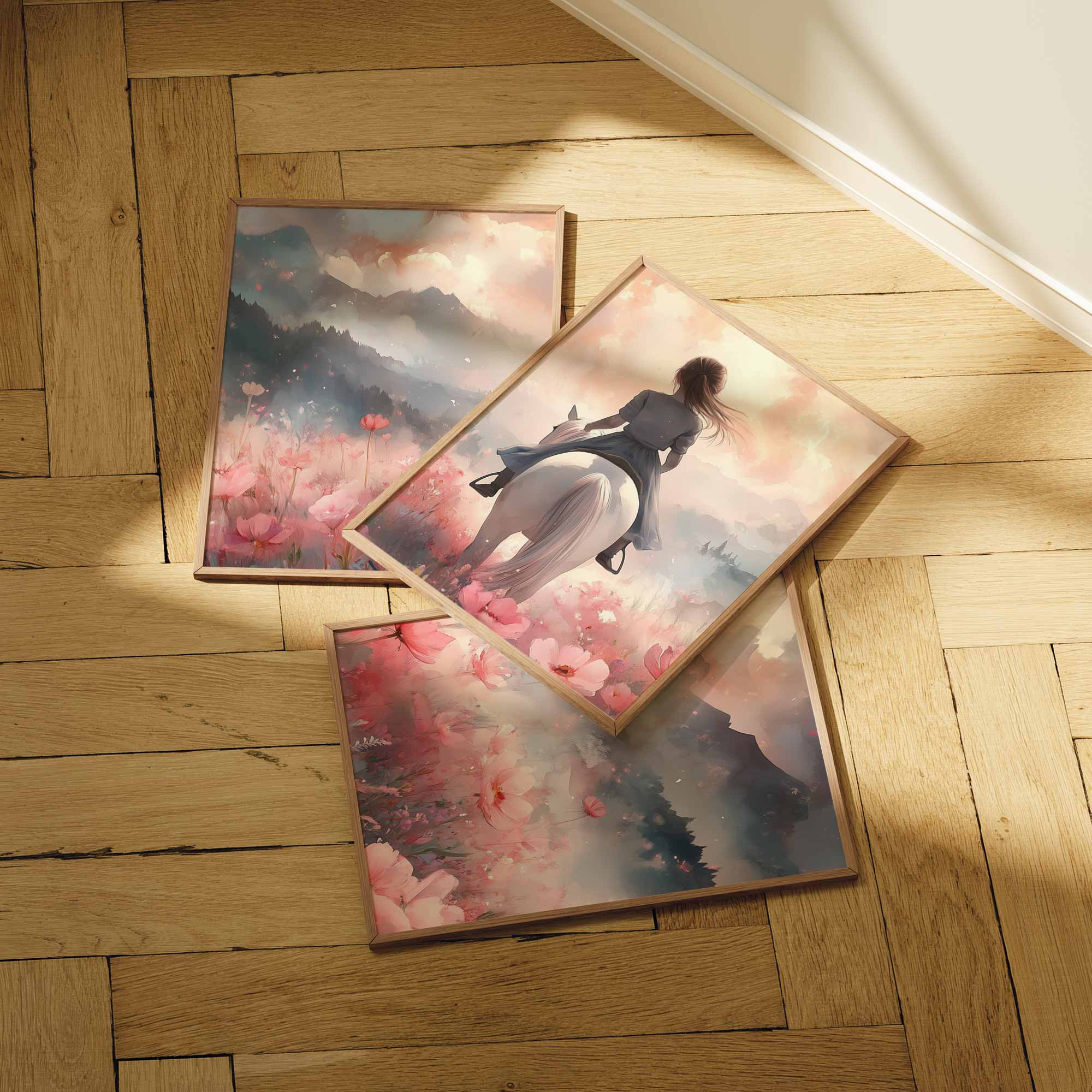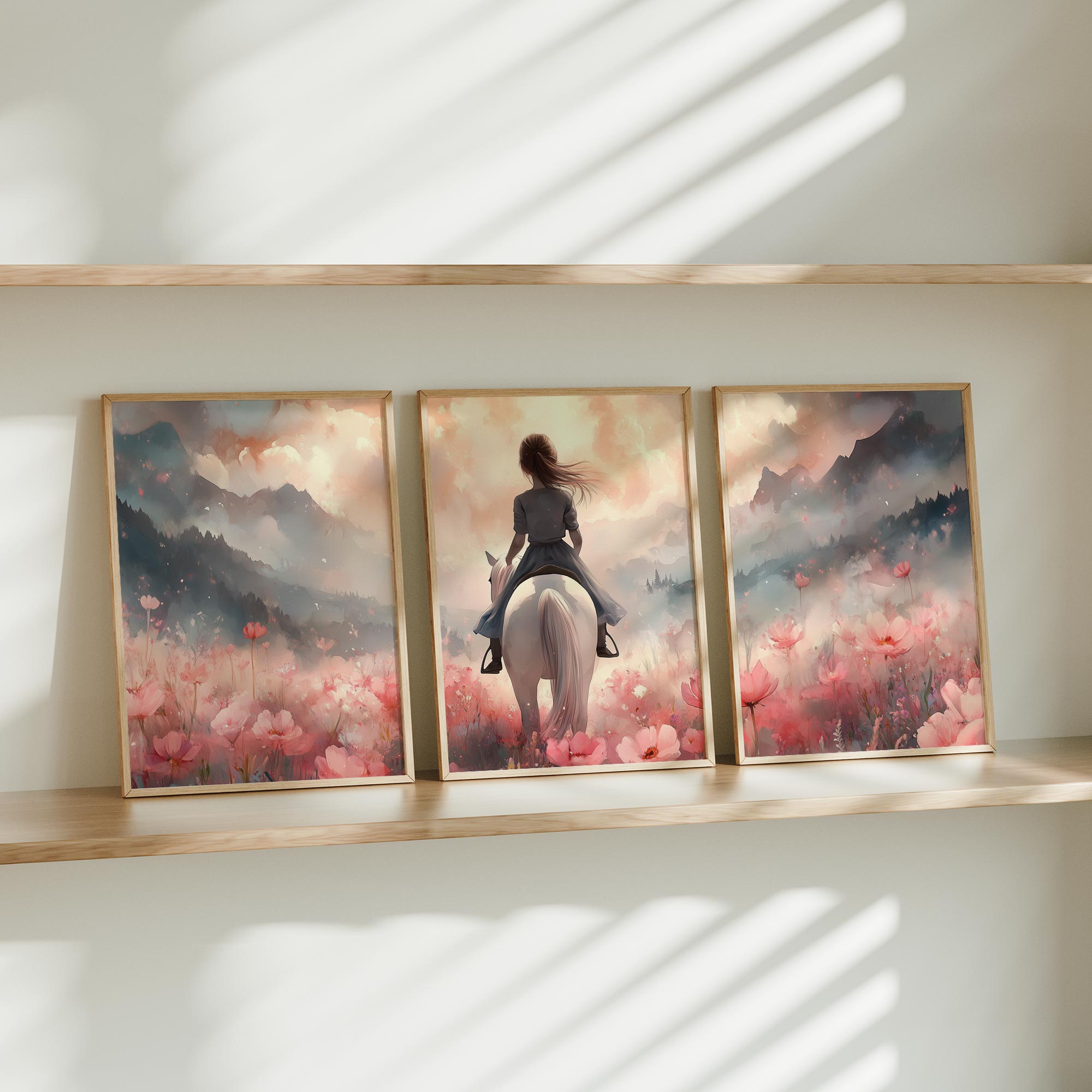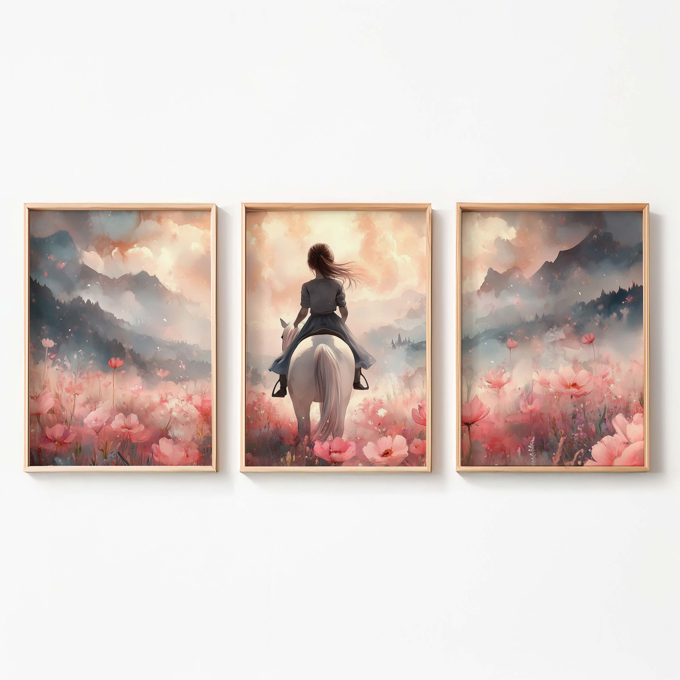 Magisch Meisje op Witte Paard in Roze Bloemenveld