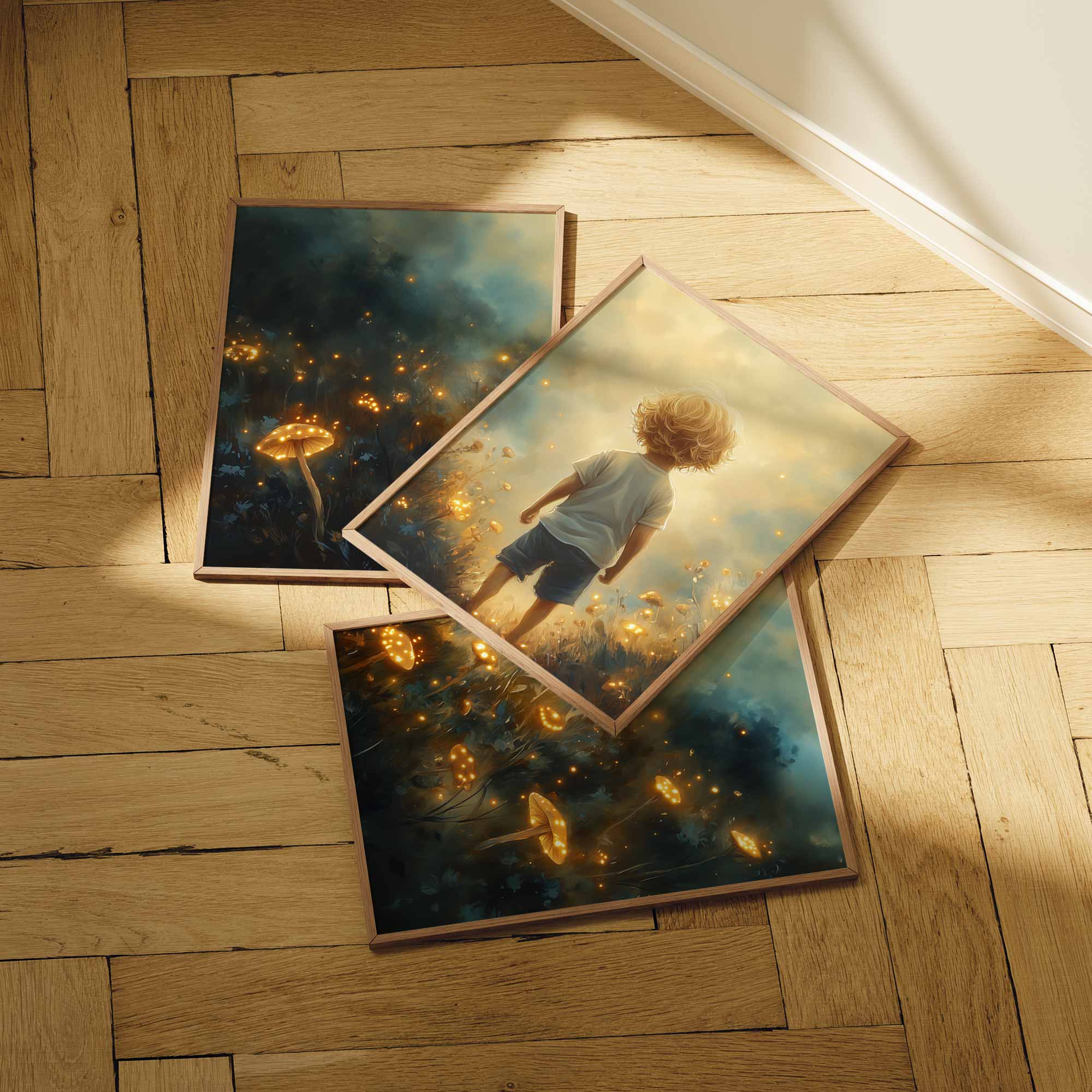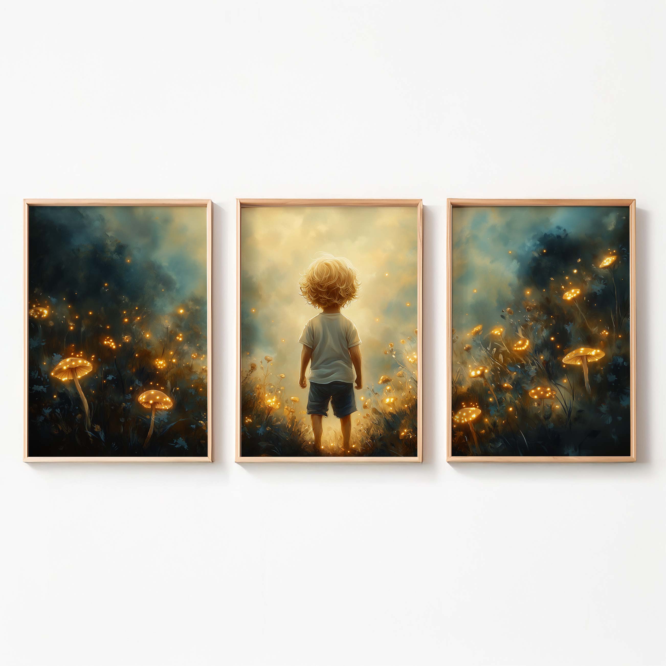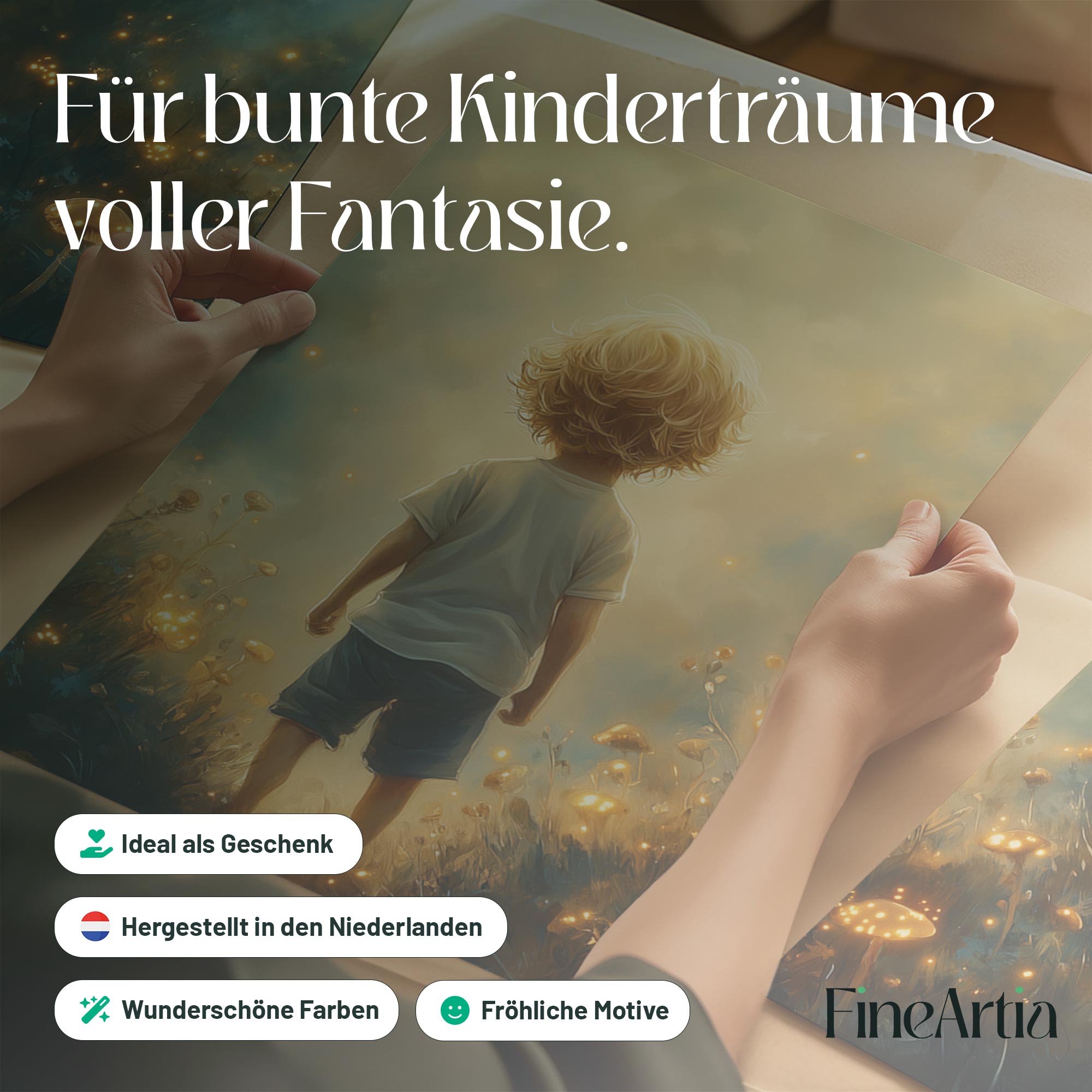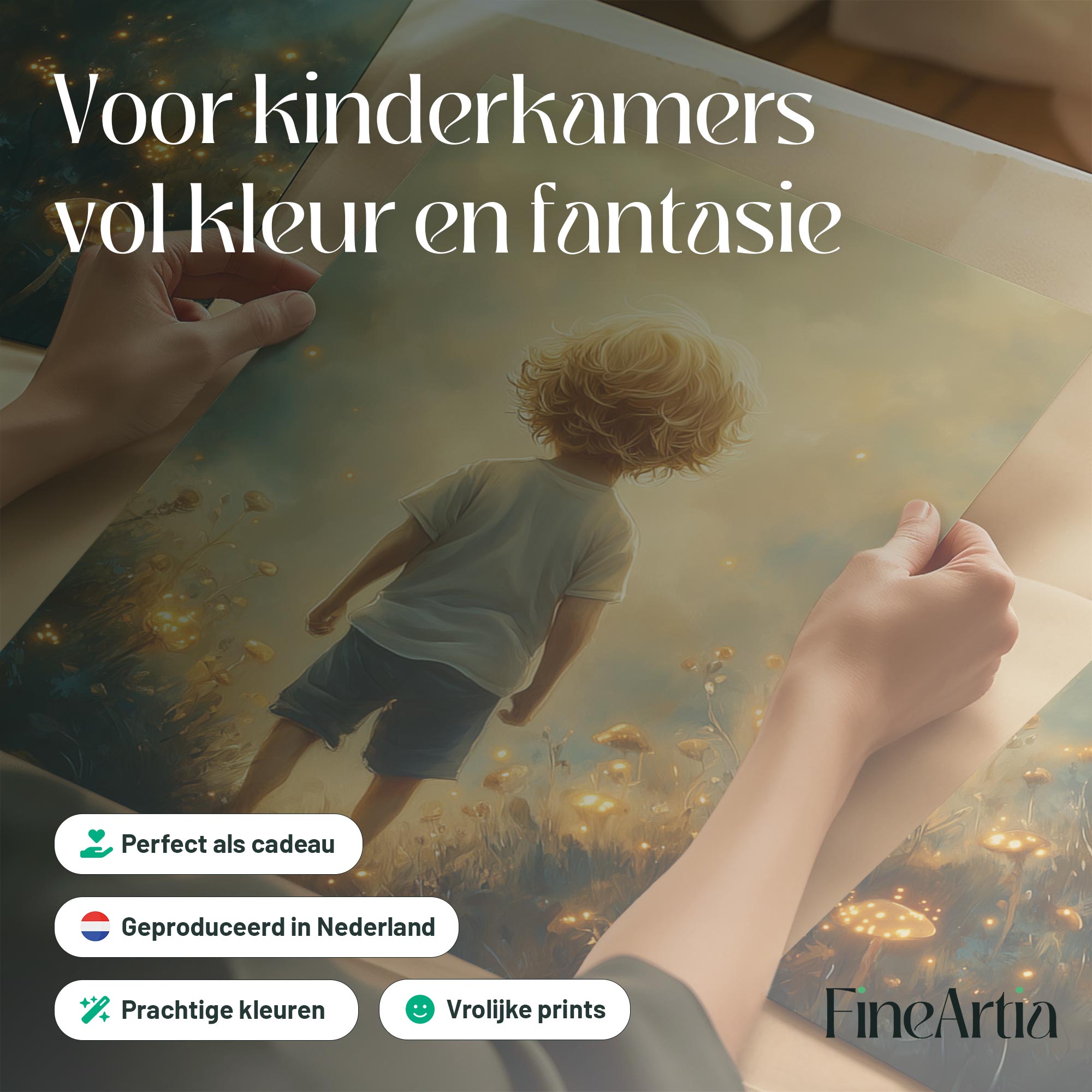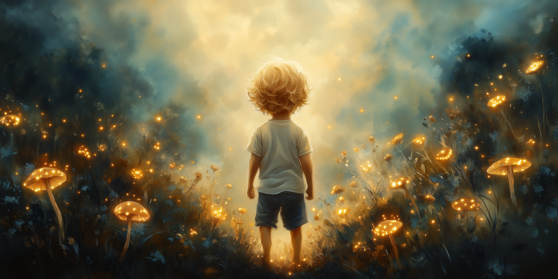 Magisch Velden: Jongen tussen Gloeiende Paddenstoelen en Bloemen