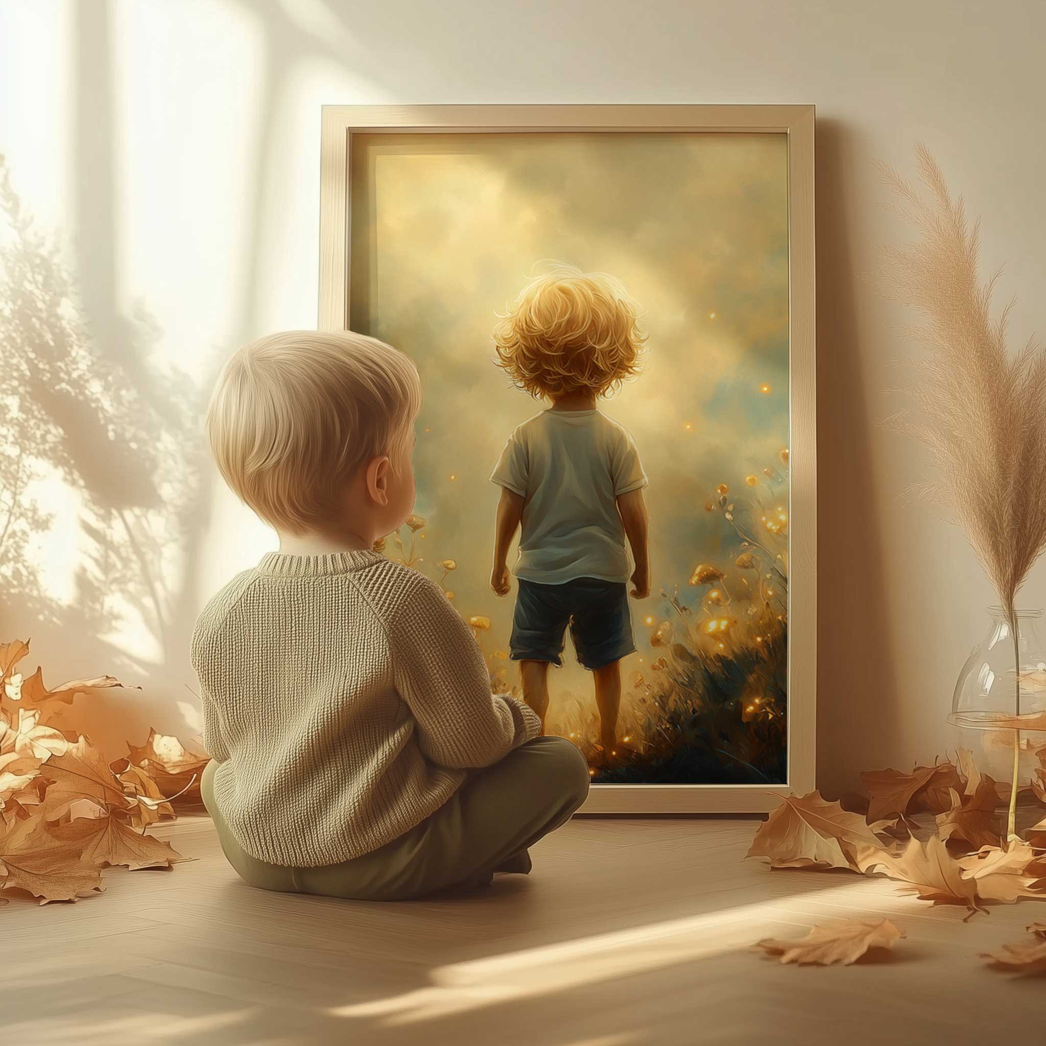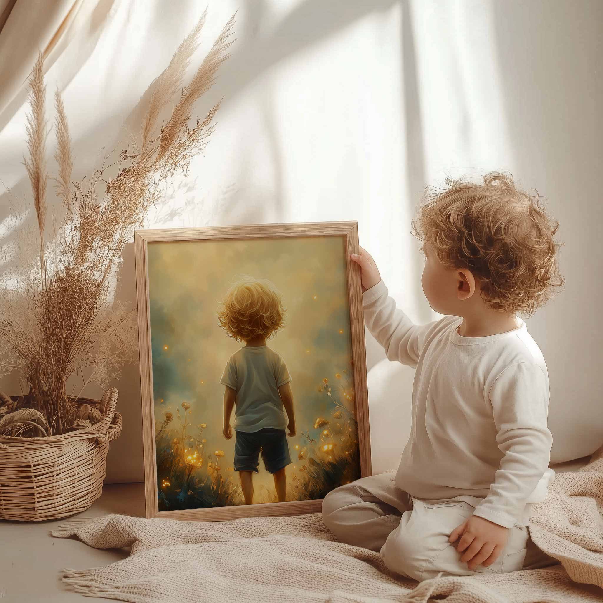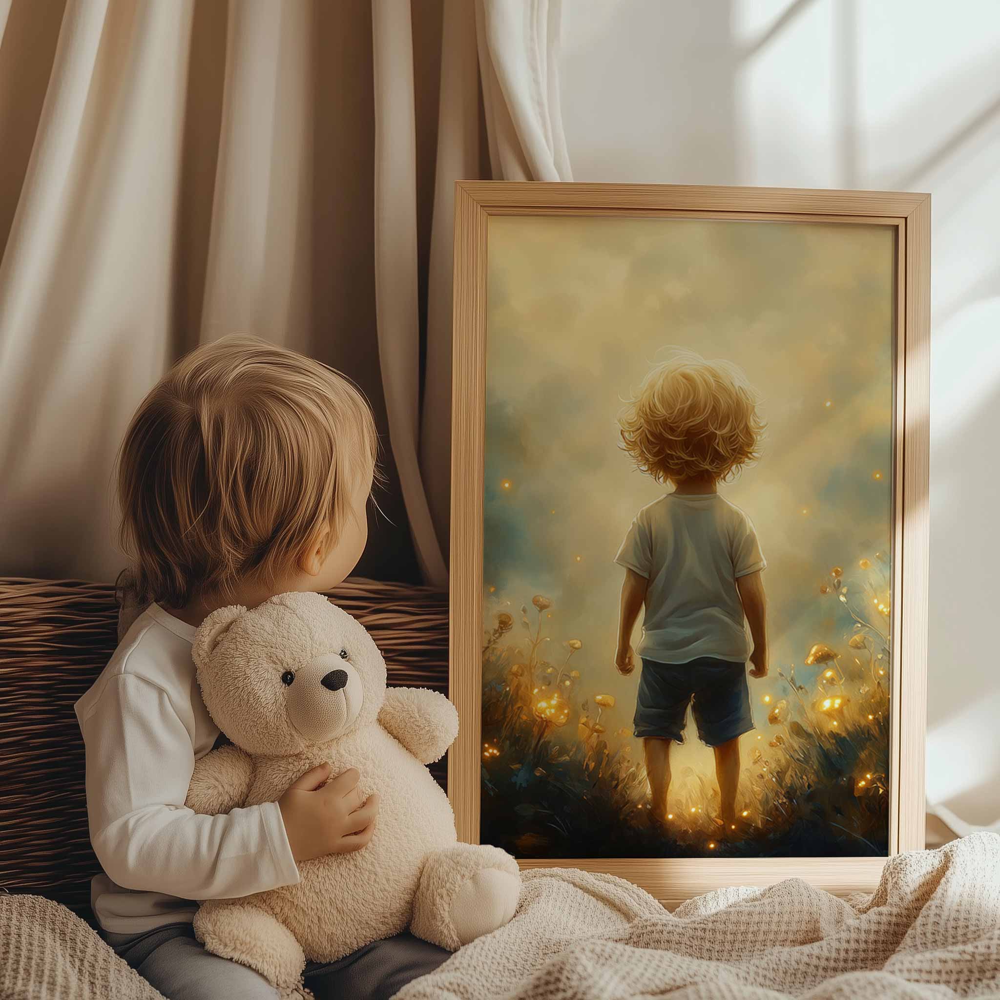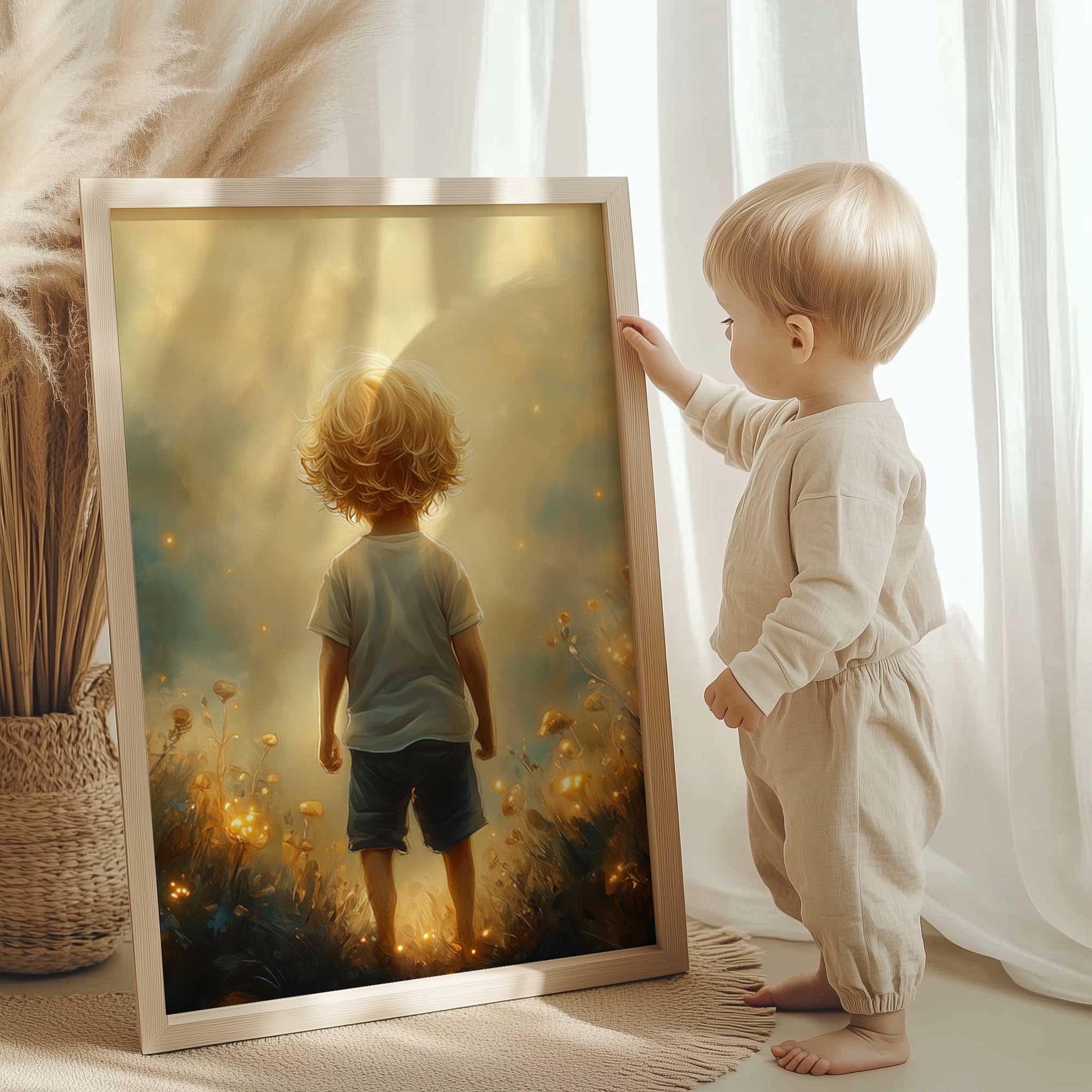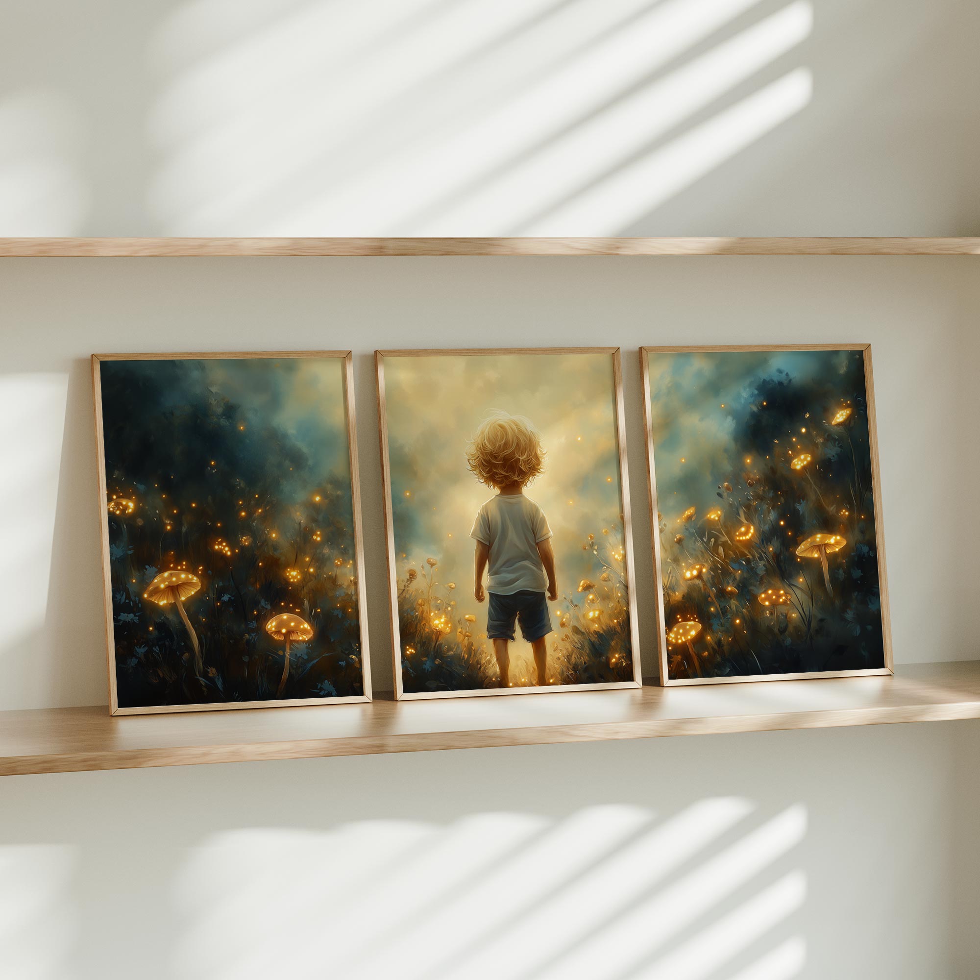 Magisch Velden: Jongen tussen Gloeiende Paddenstoelen en Bloemen