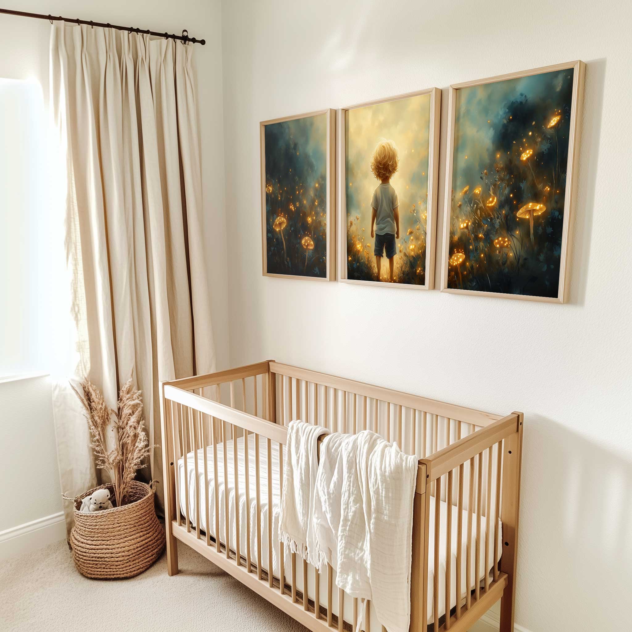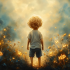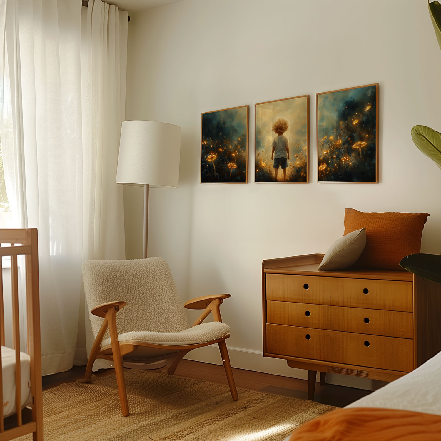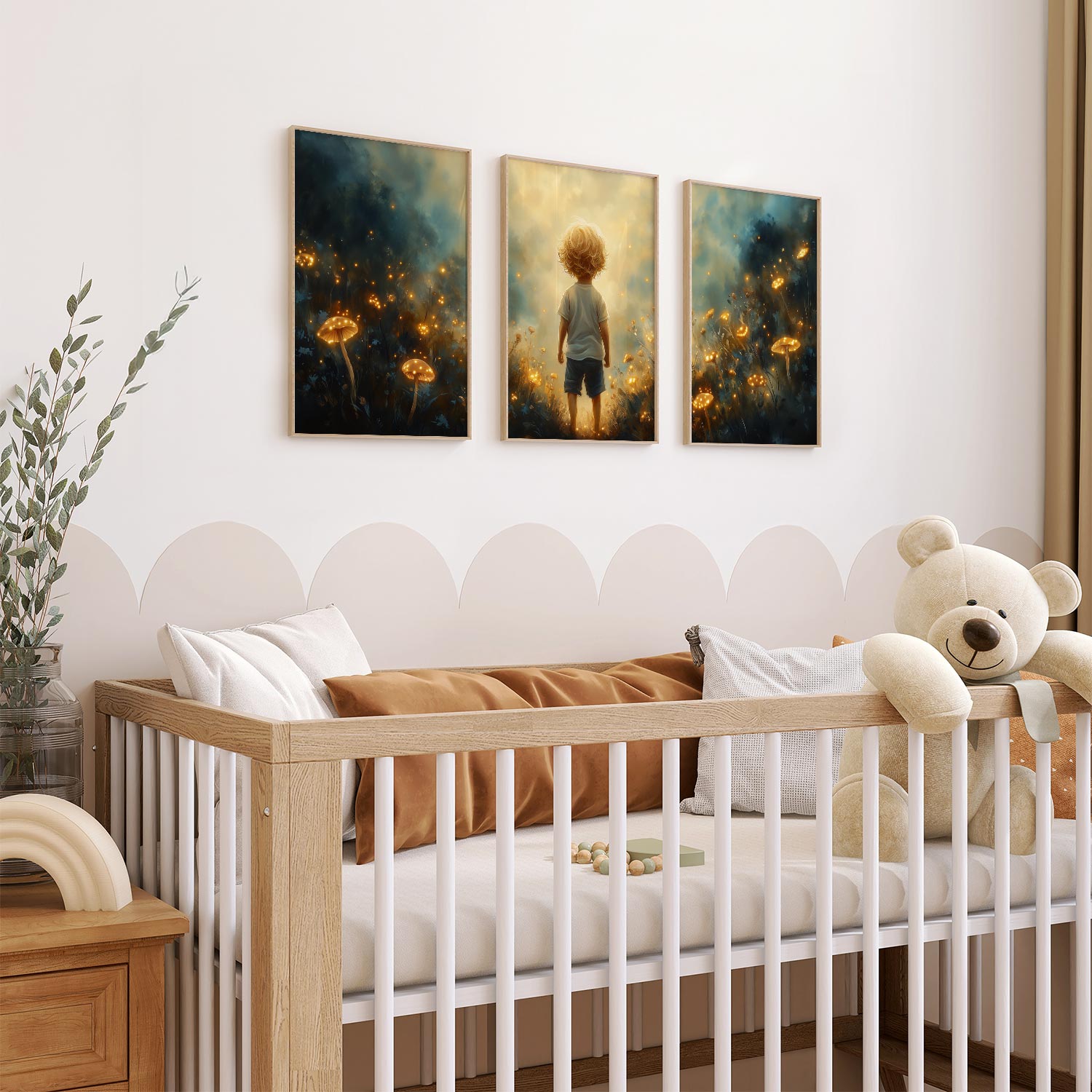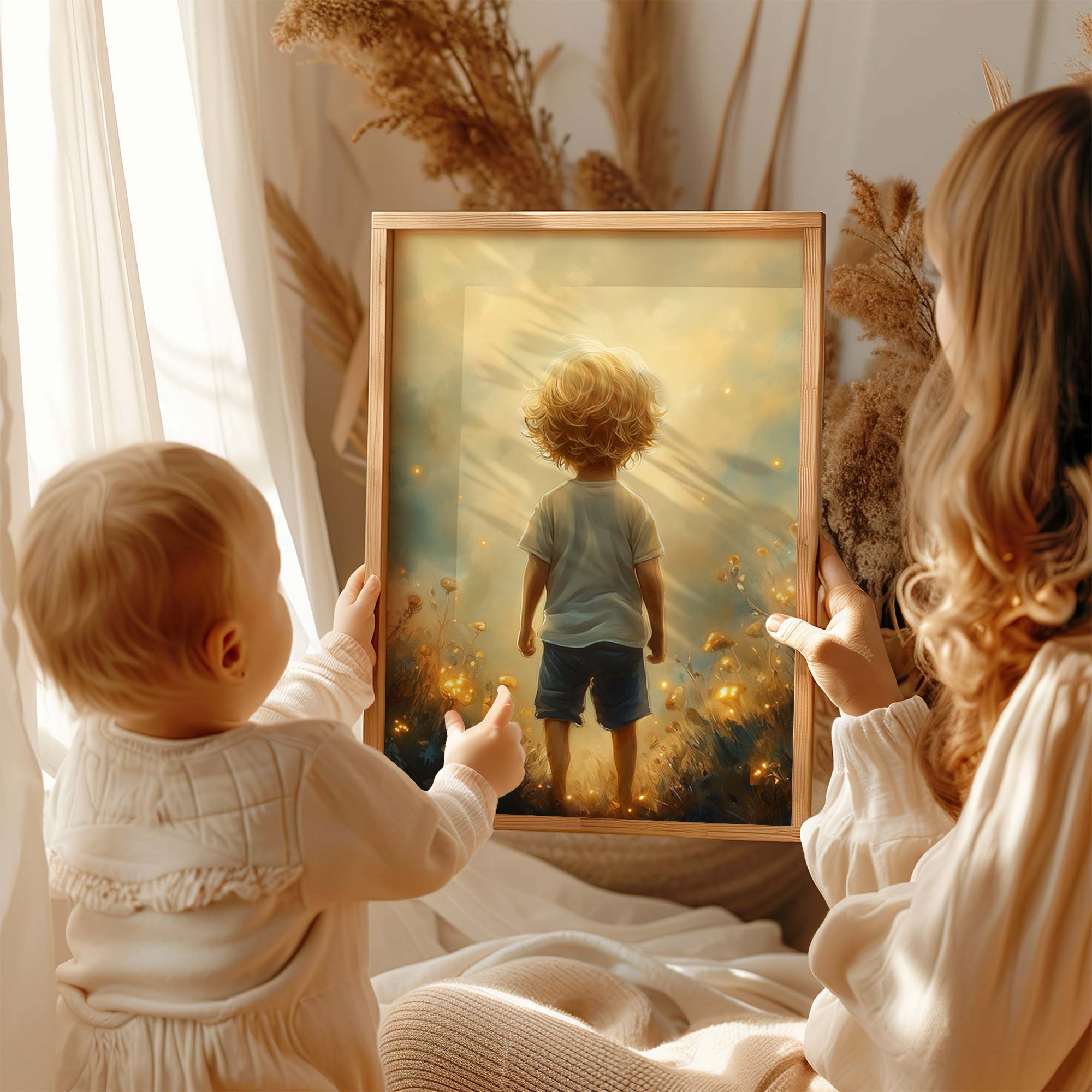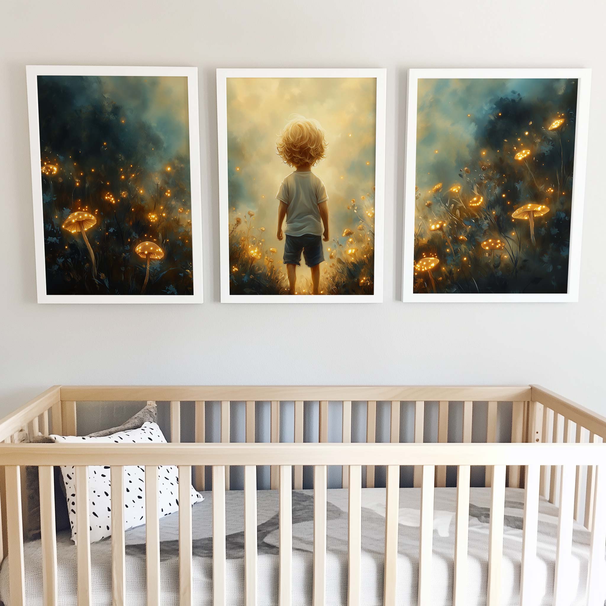 Magisch Velden: Jongen tussen Gloeiende Paddenstoelen en Bloemen