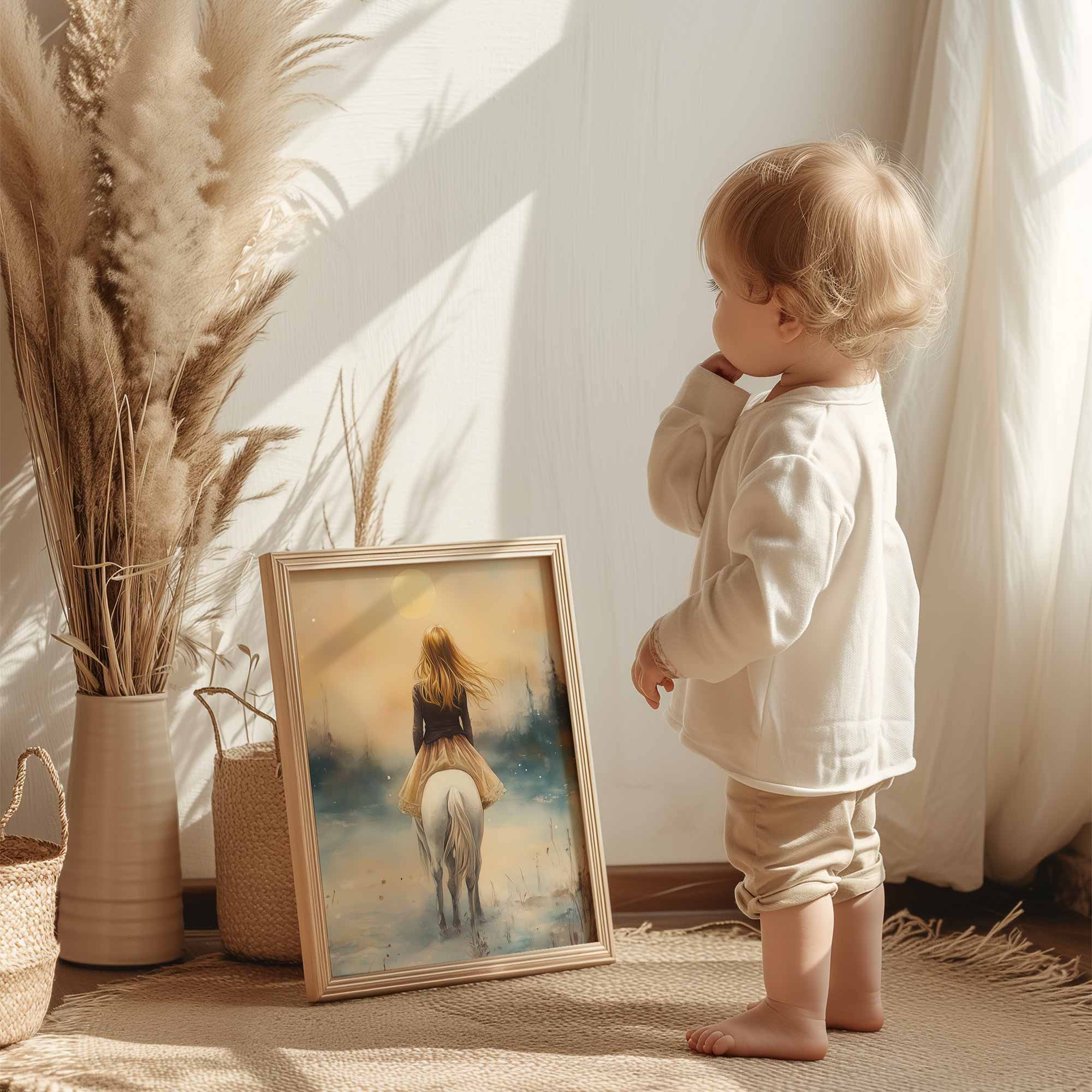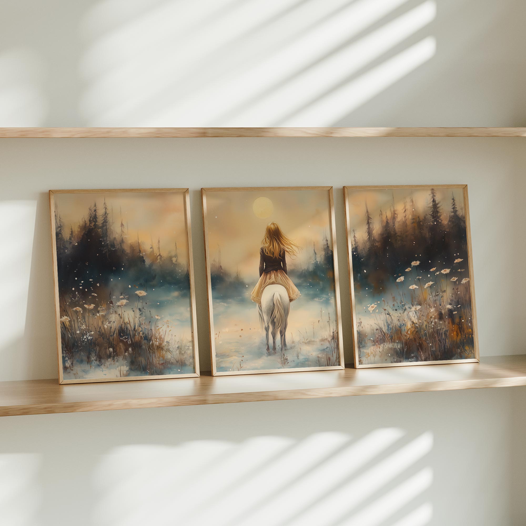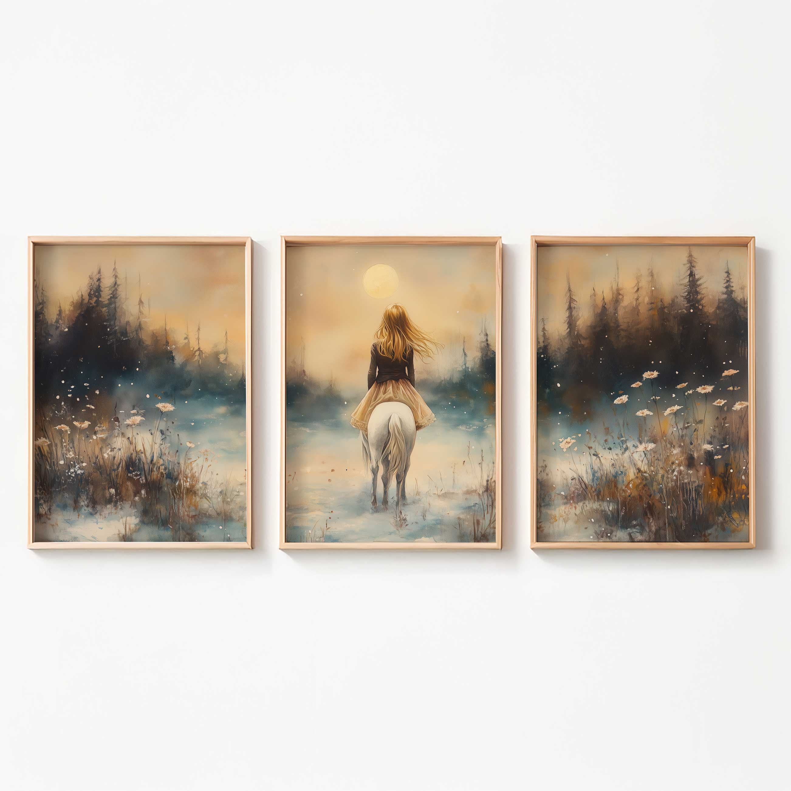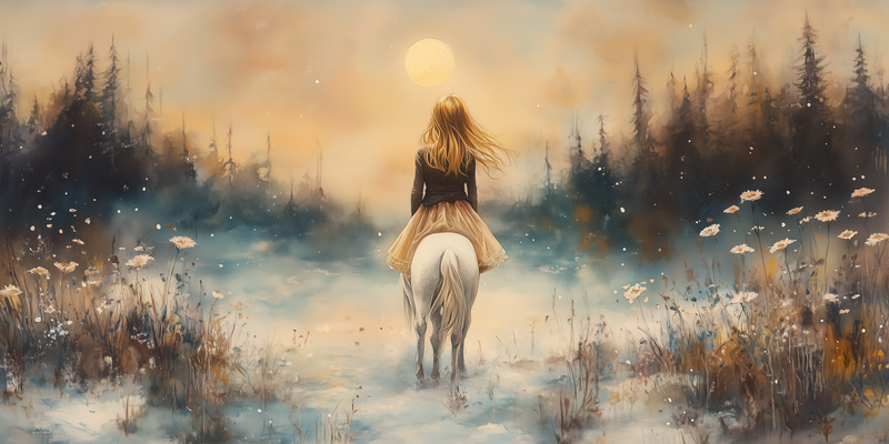 Terug naar collectie Posters Magische Sneeuwprinses op Witte Paard bij Volle Maan