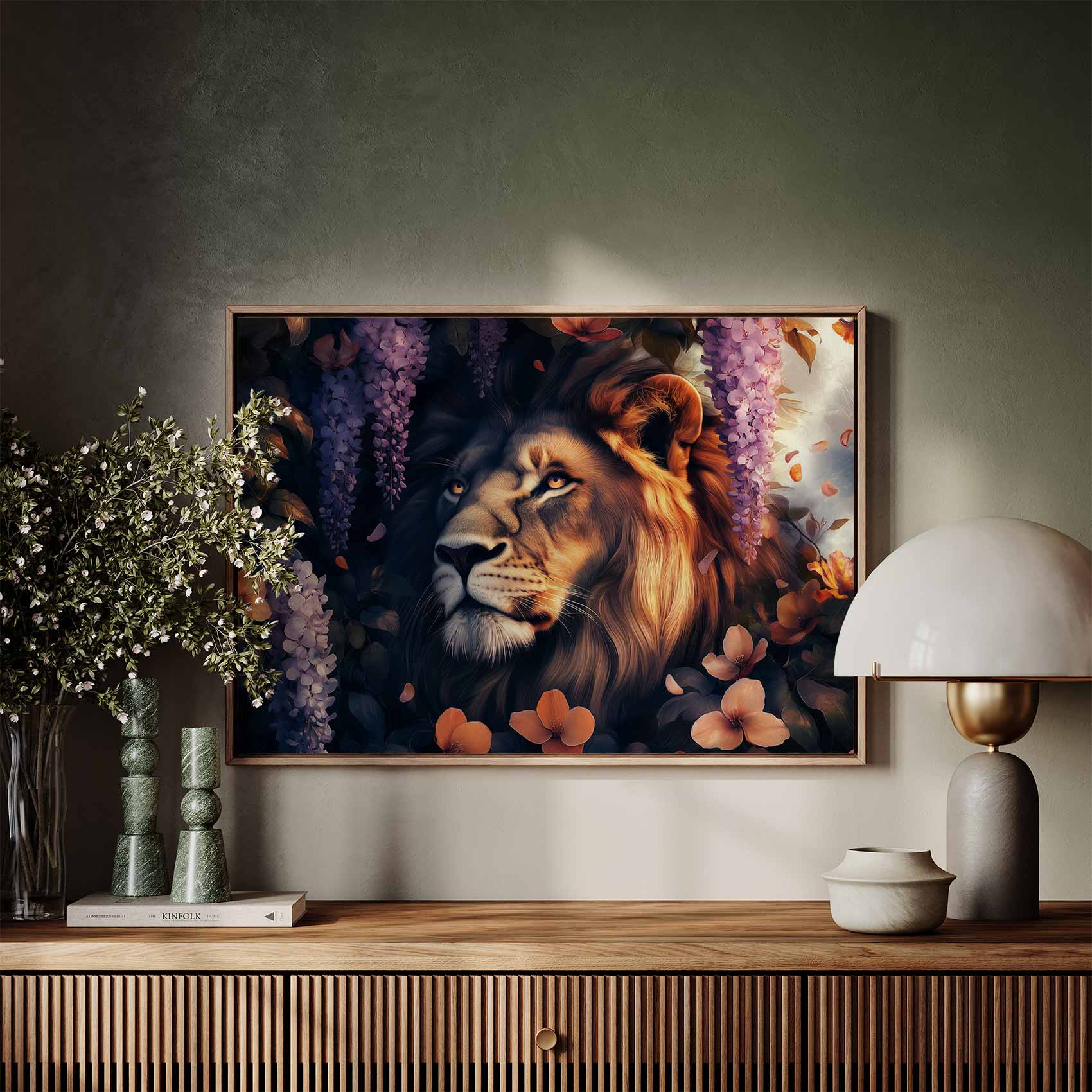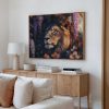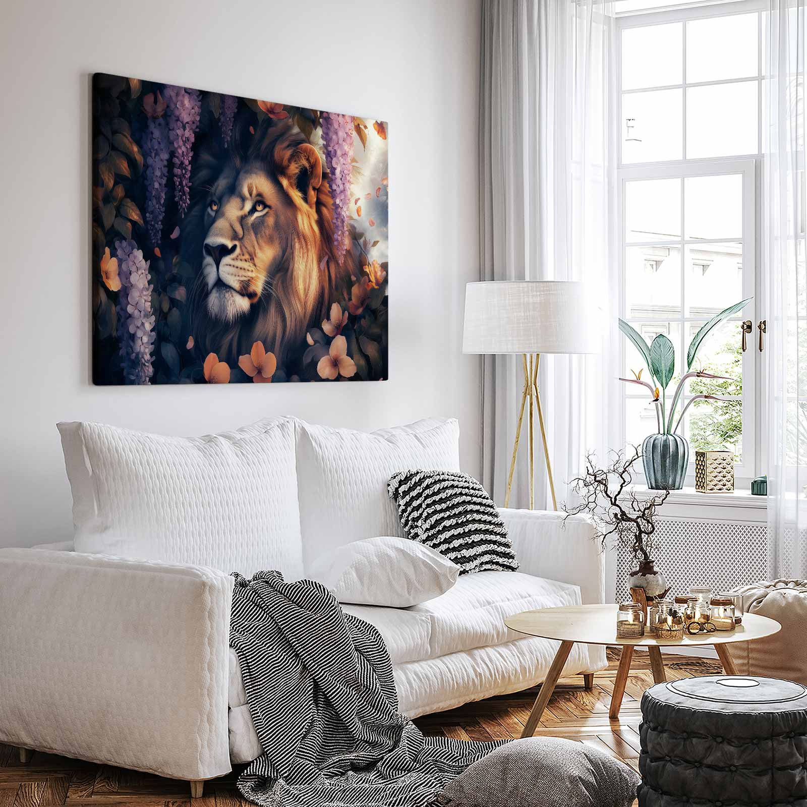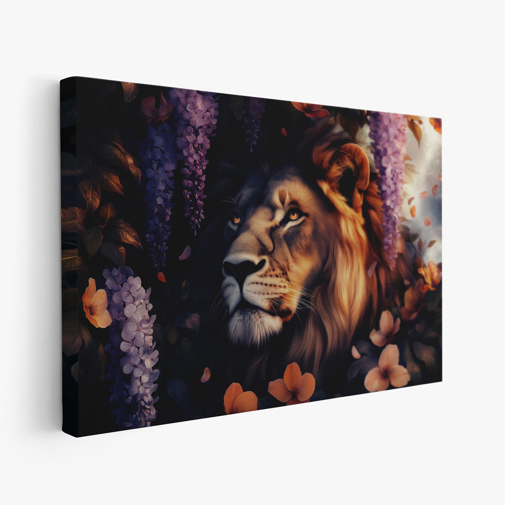 Terug naar collectie Canvas Majestueuze leeun in bloementuin