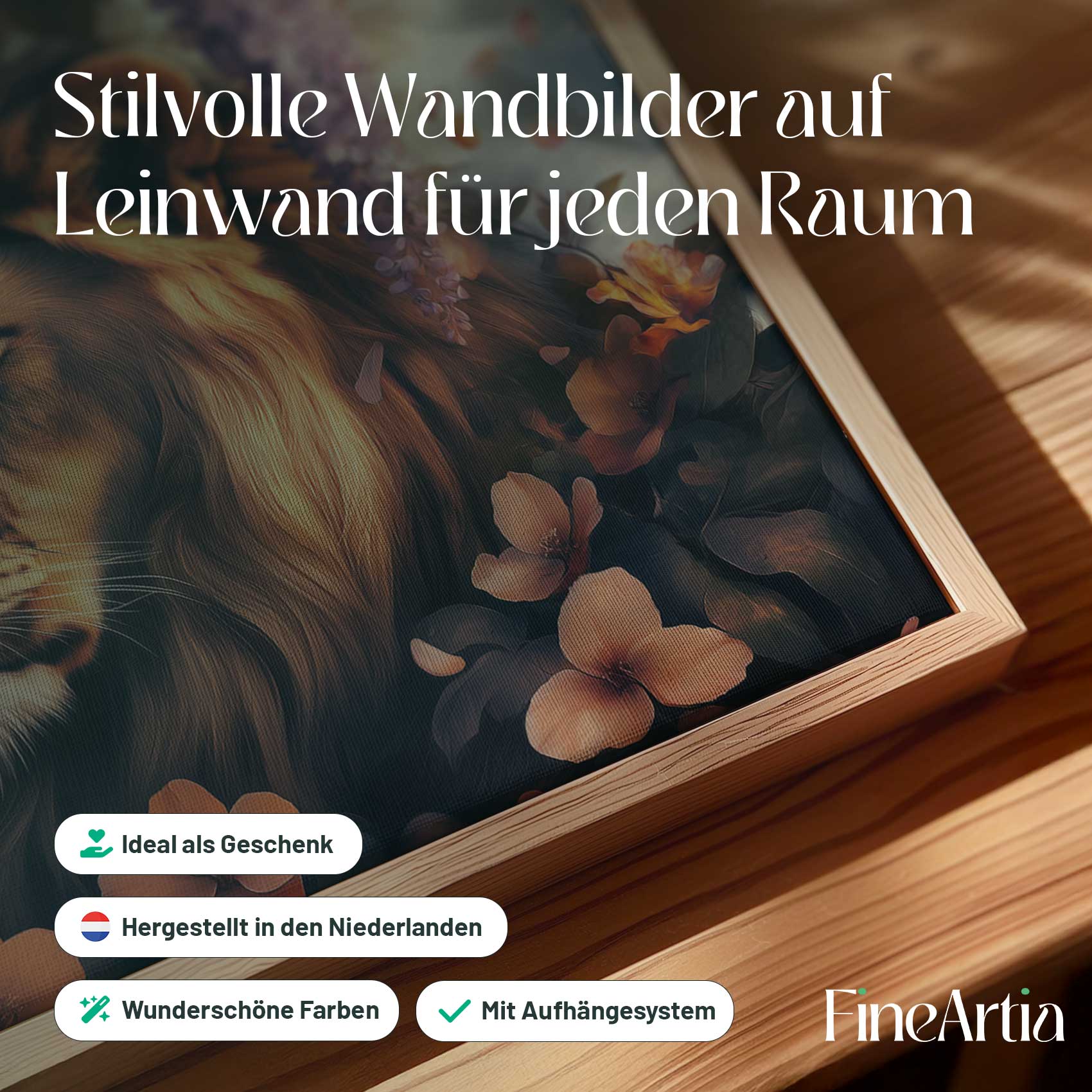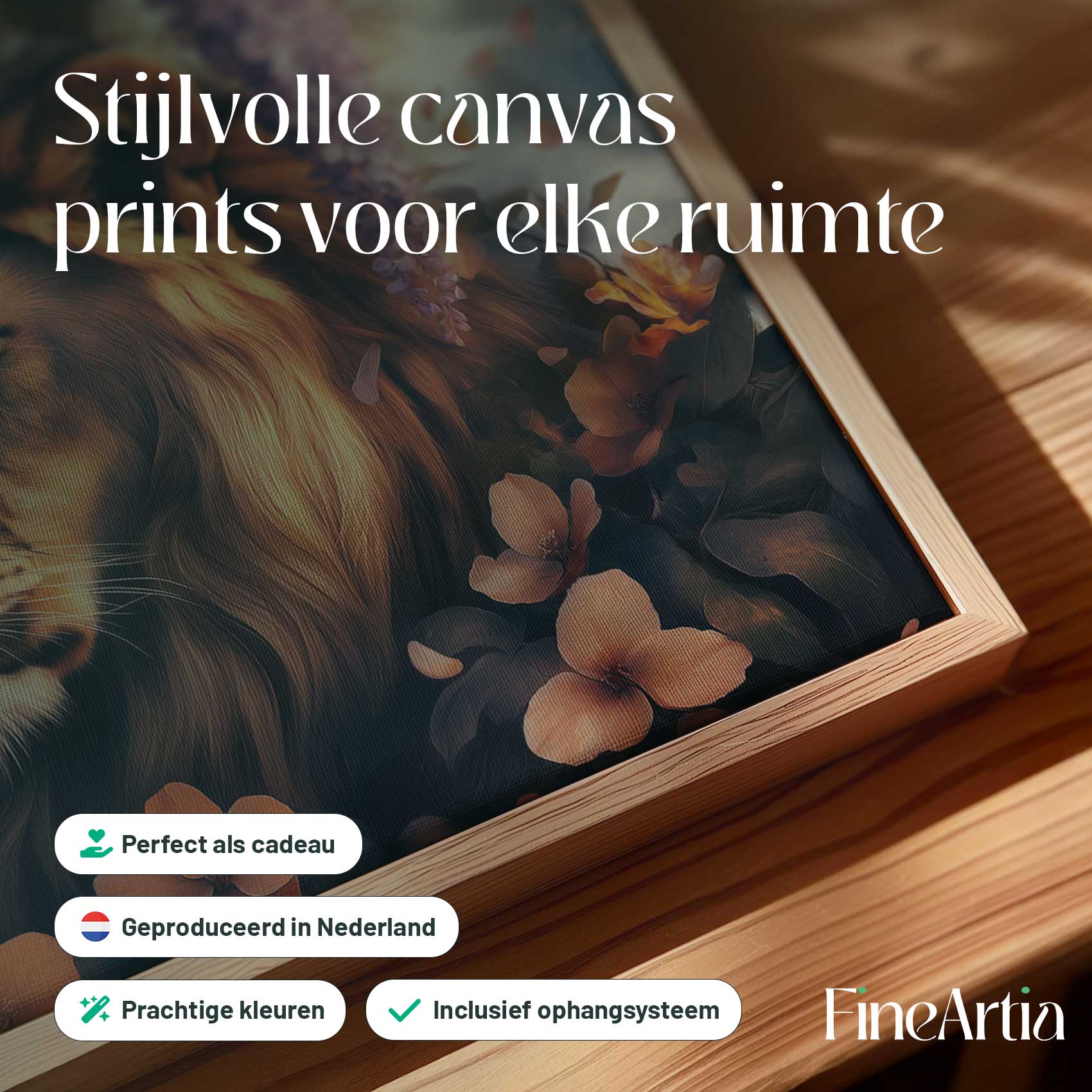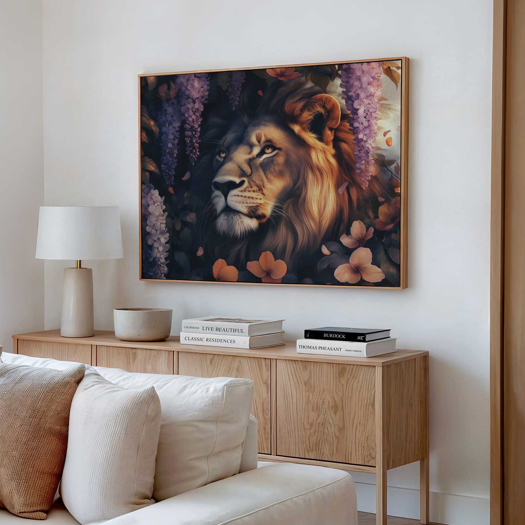 Terug naar collectie Canvas Majestueuze leeun in bloementuin