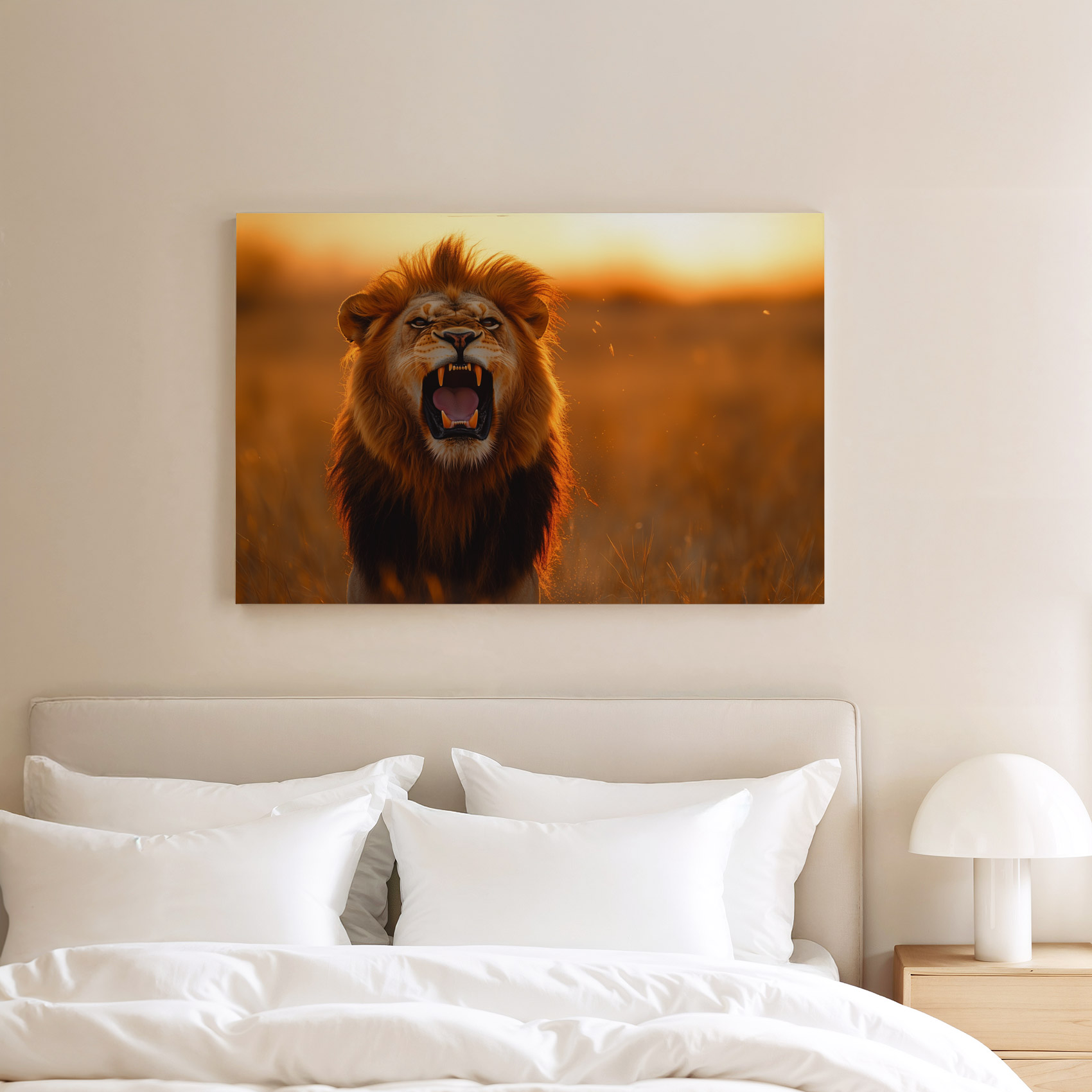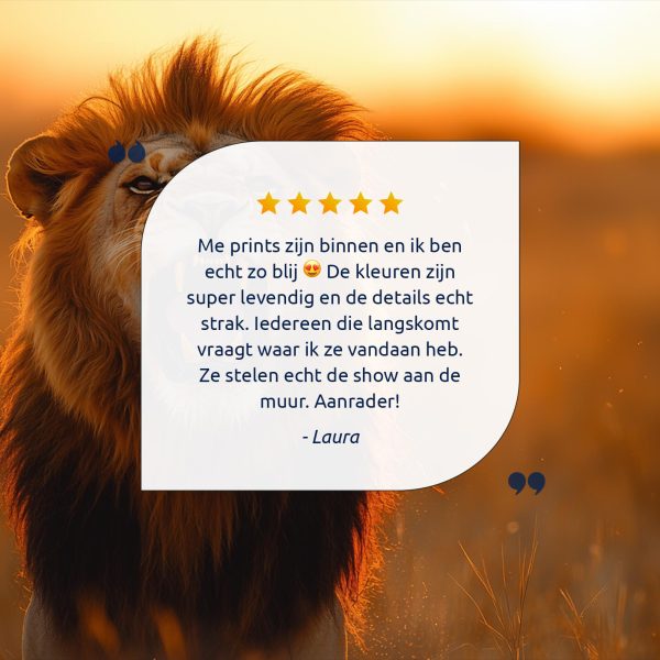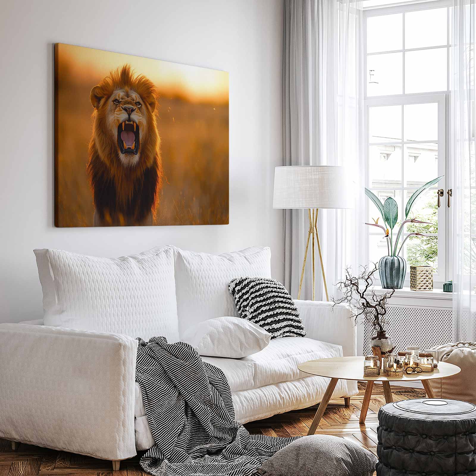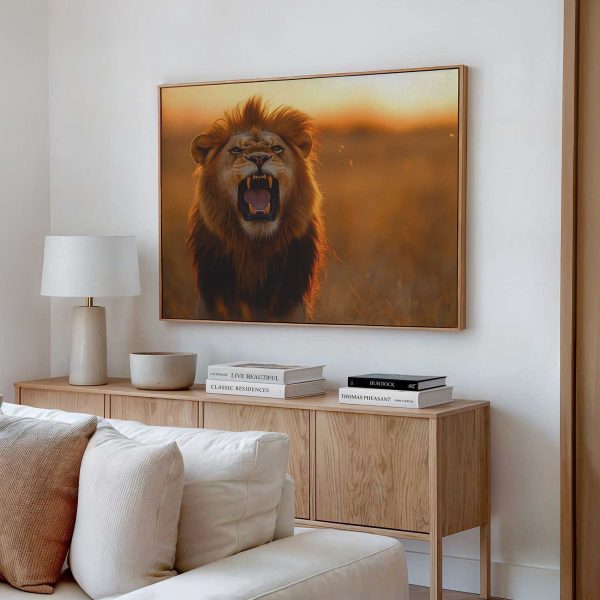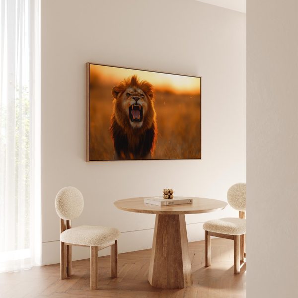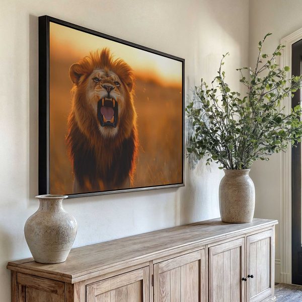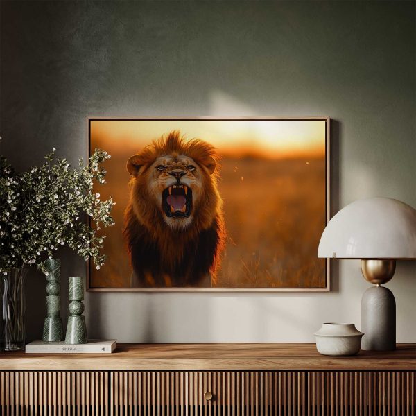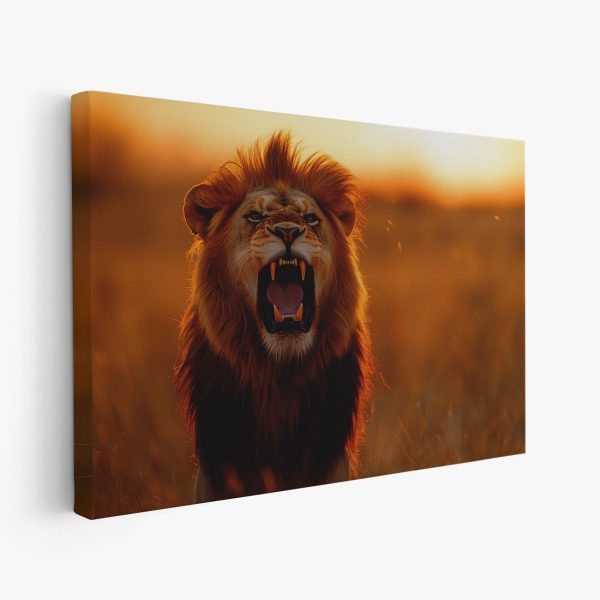Terug naar collectie Canvas Majestueuze leeuw bij zonsondergang