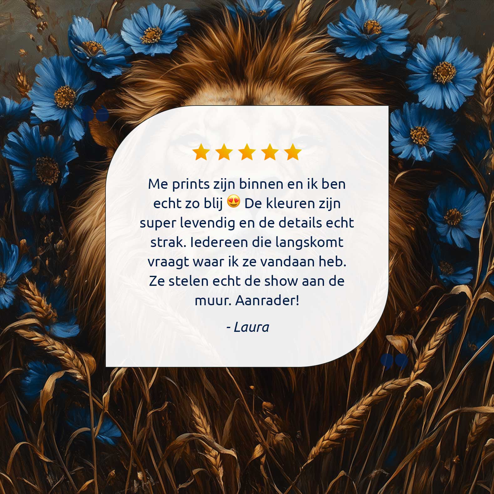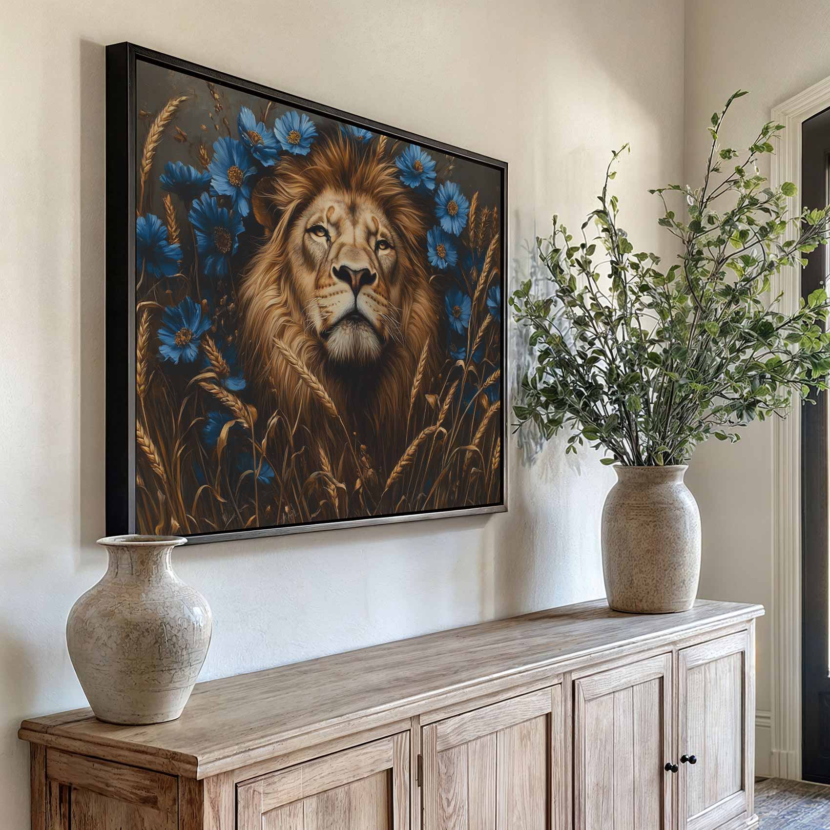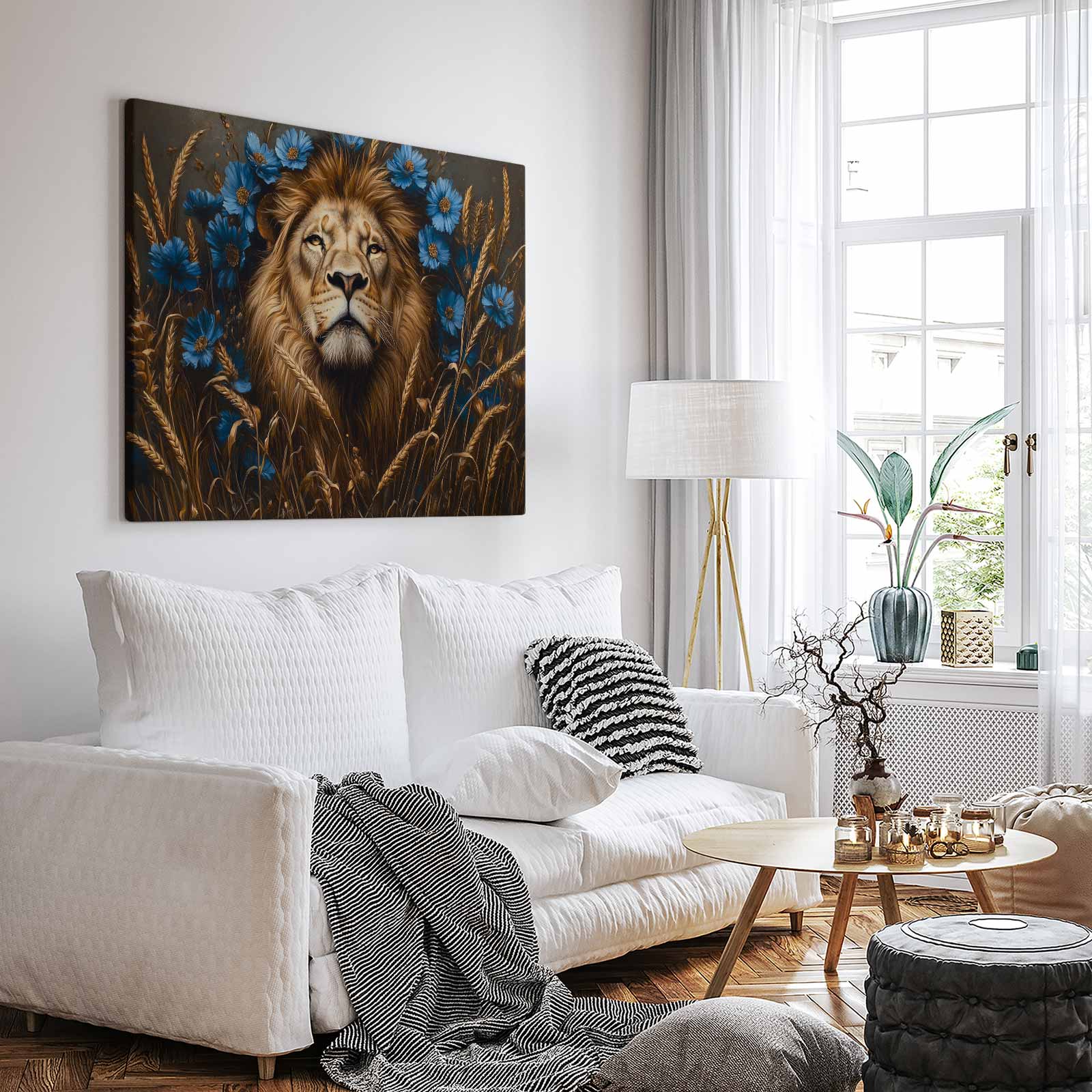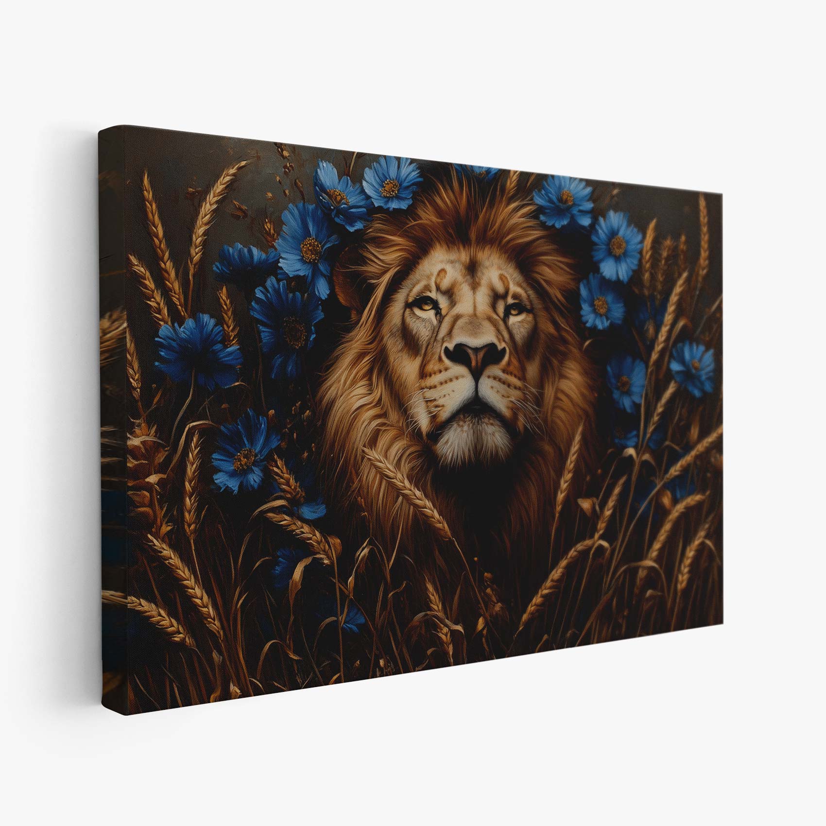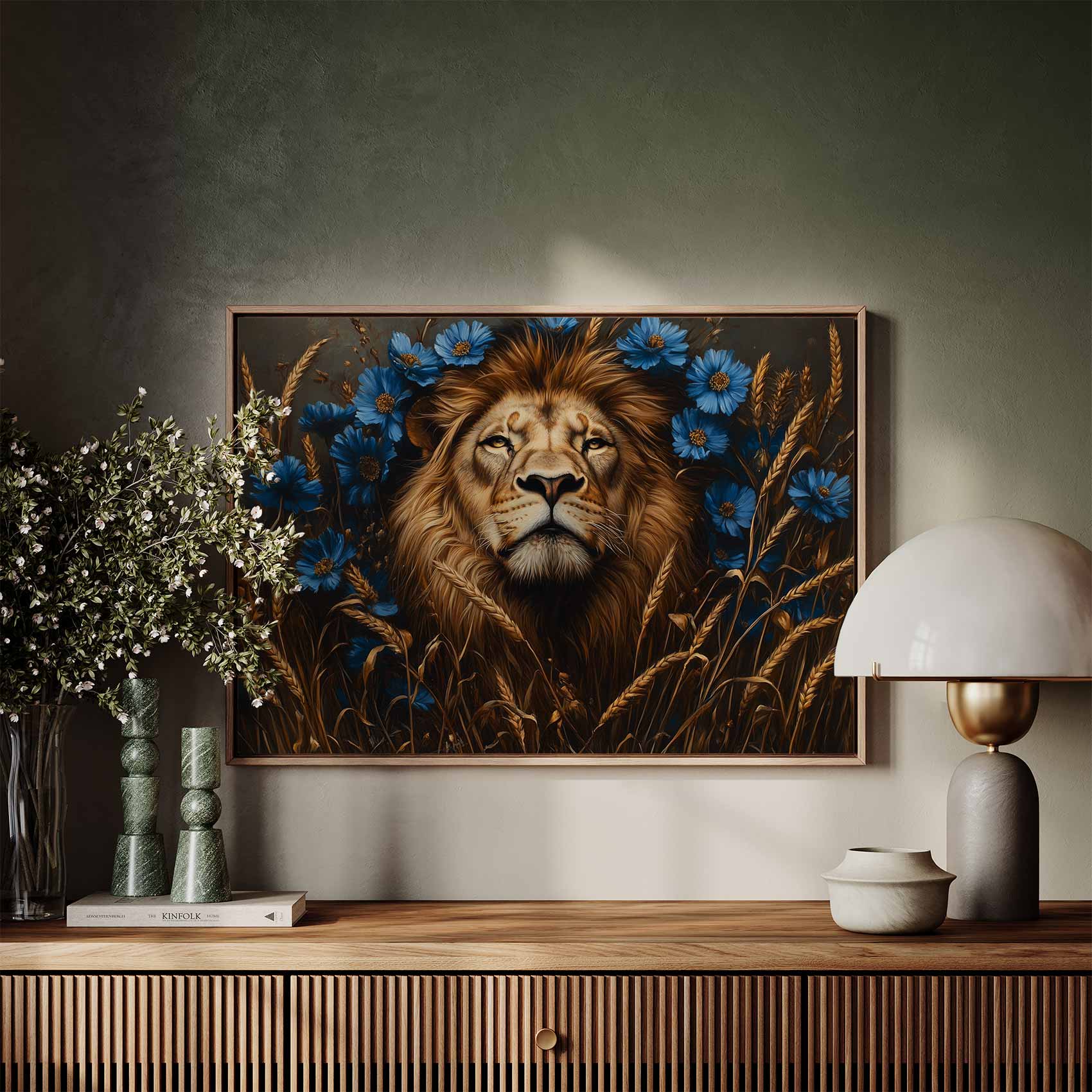 Majestueuze leeuw in blauwe bloemen