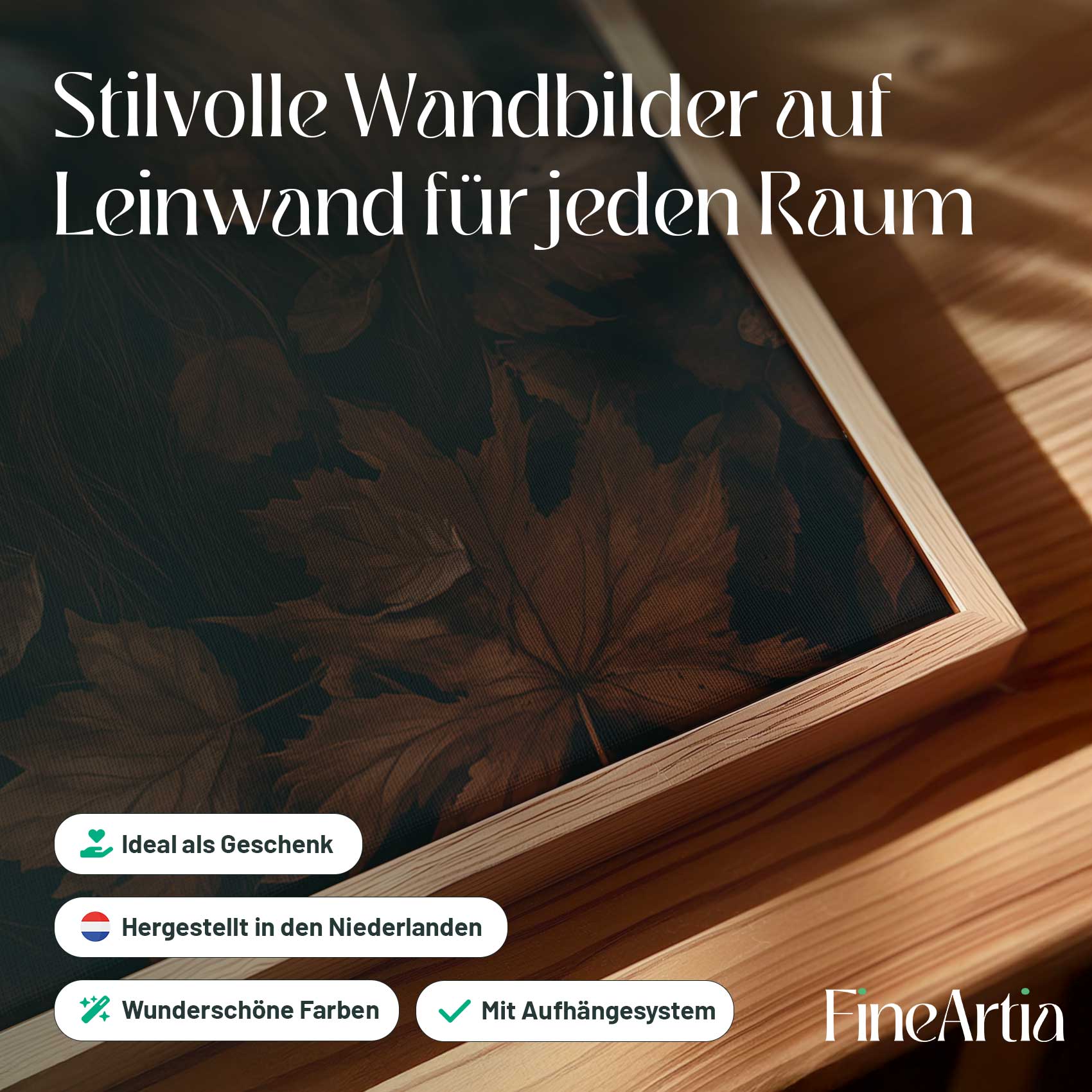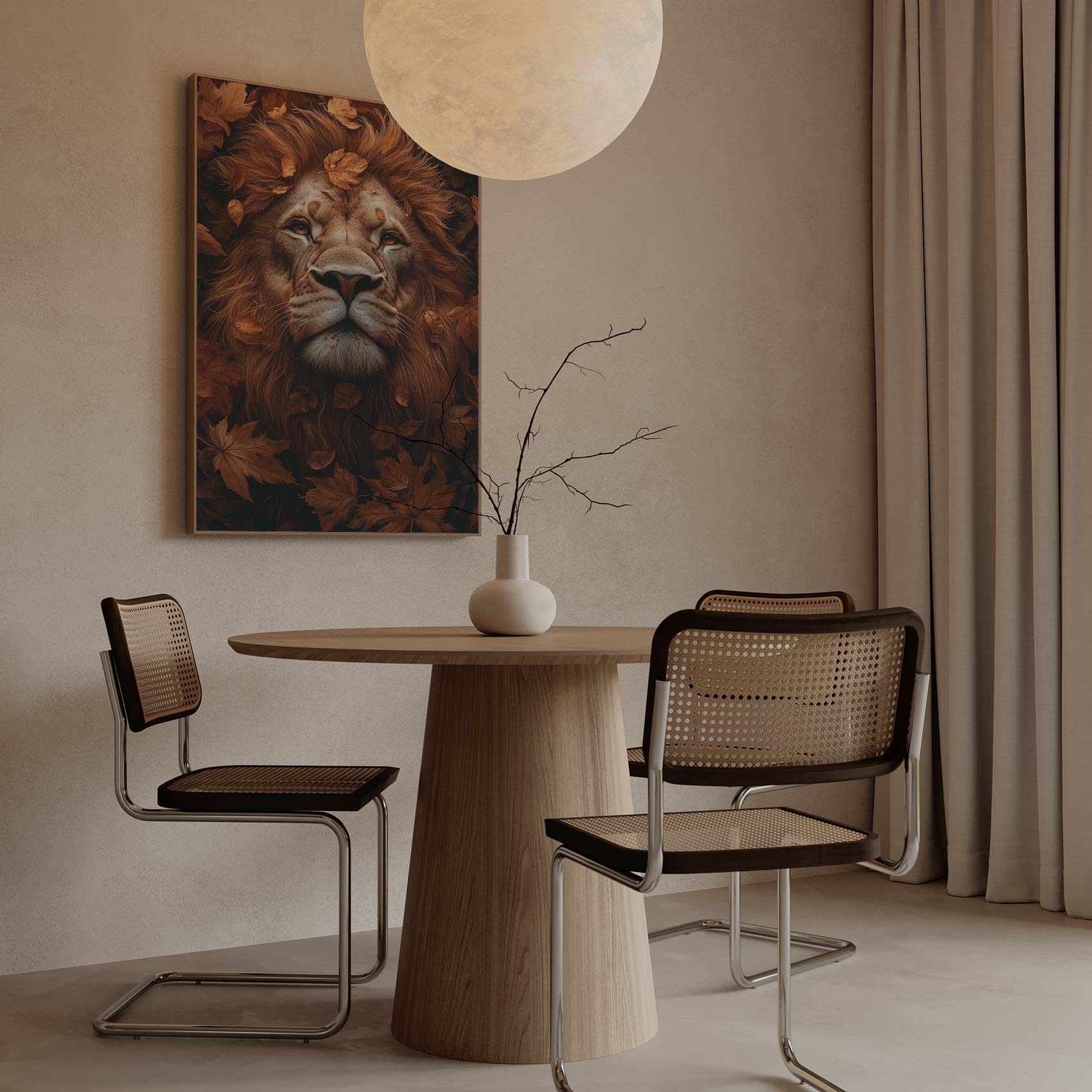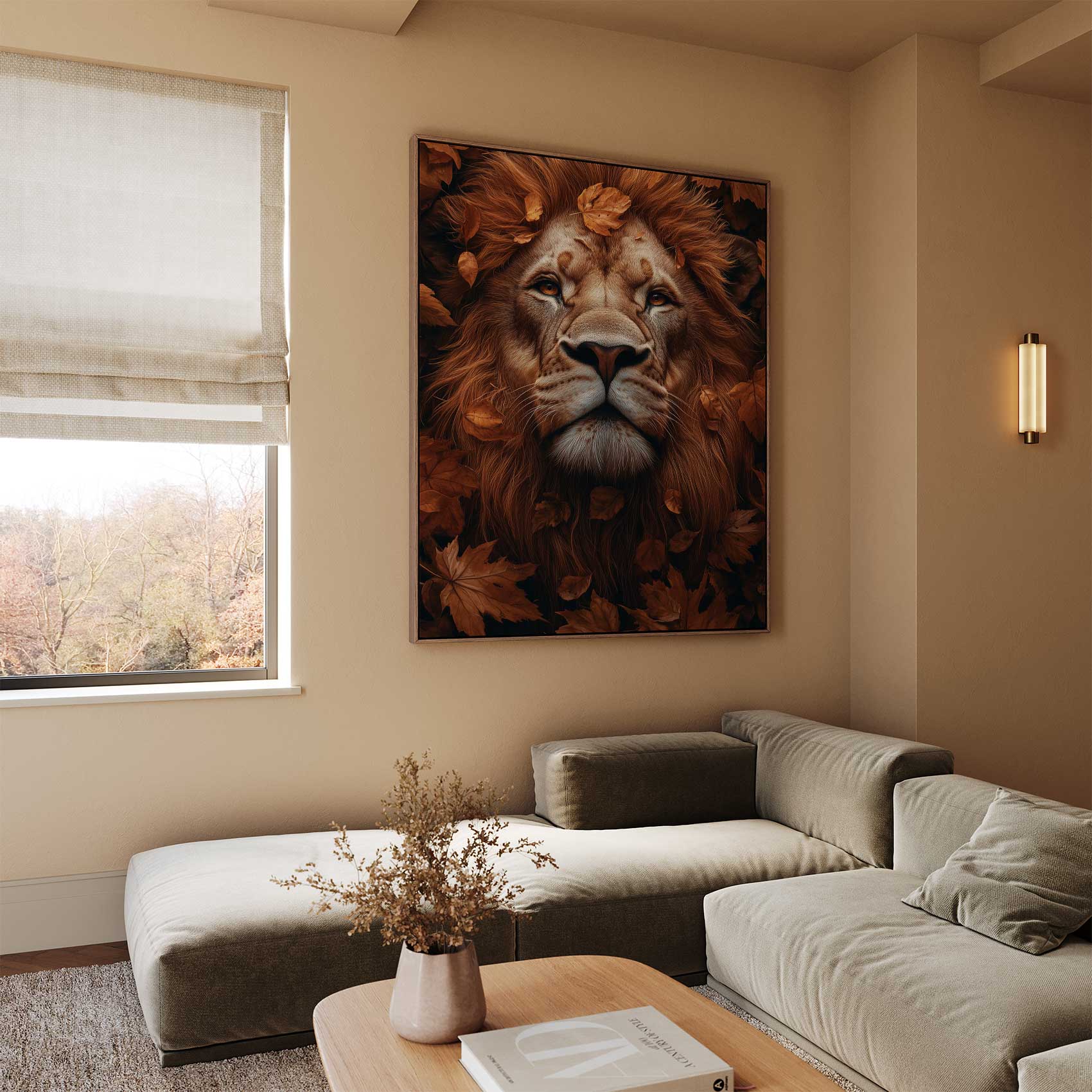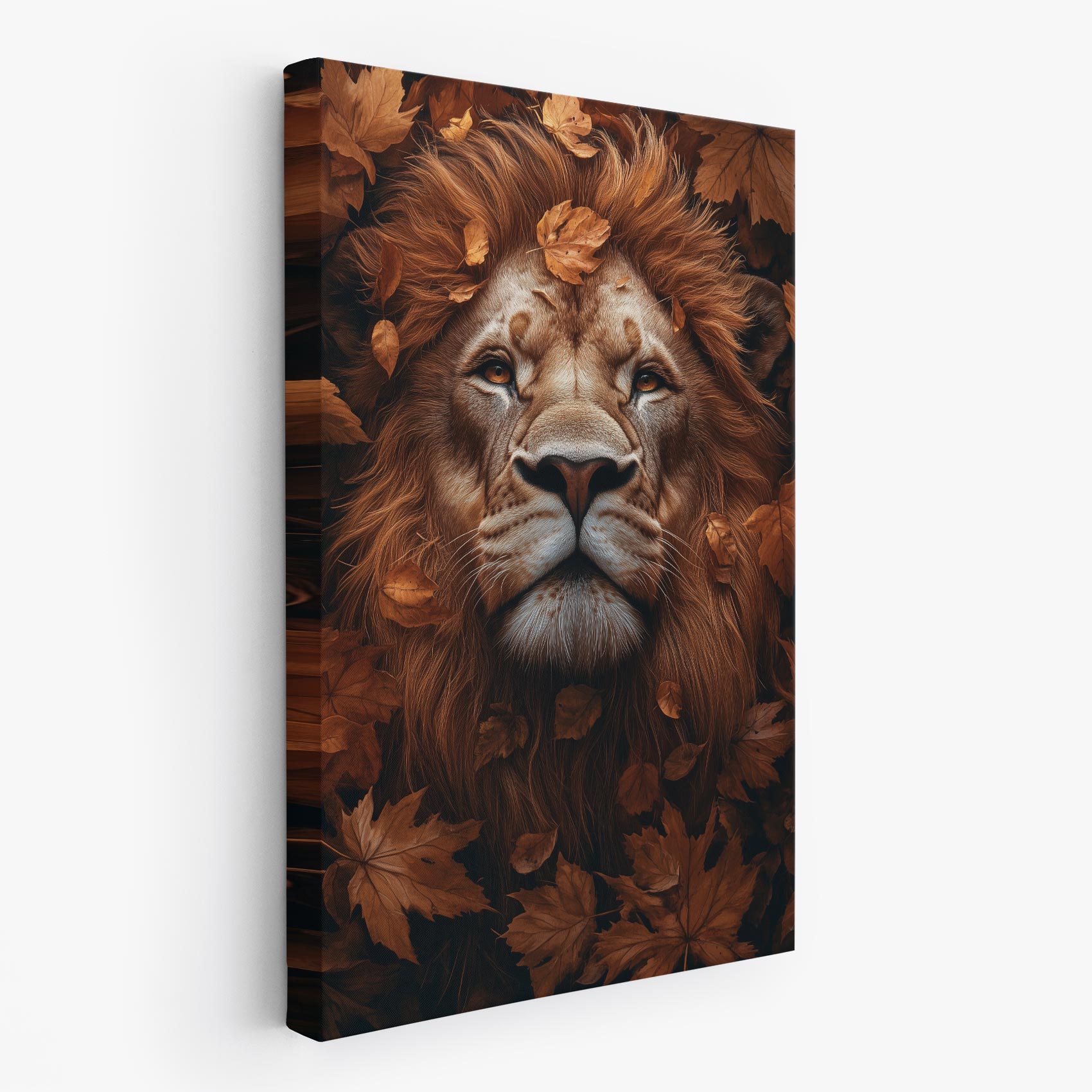 Terug naar collectie Canvas Majestueuze leeuw in herfstbladeren