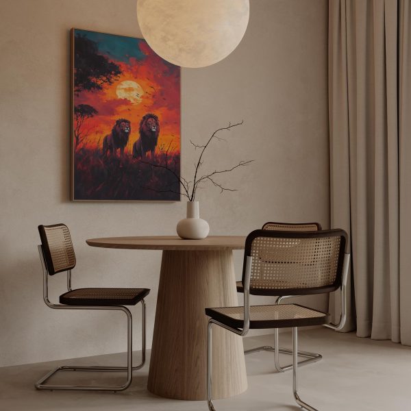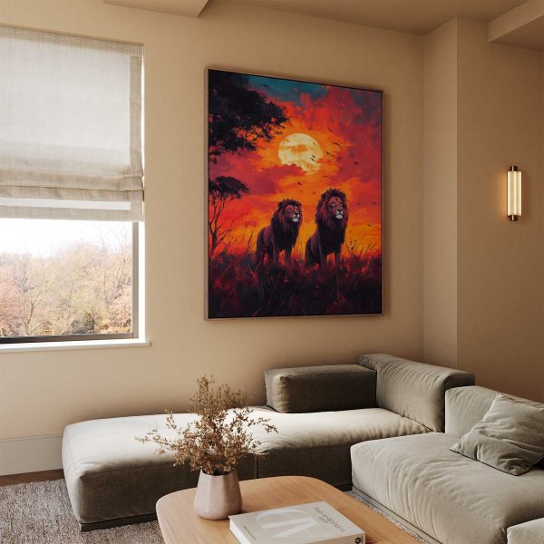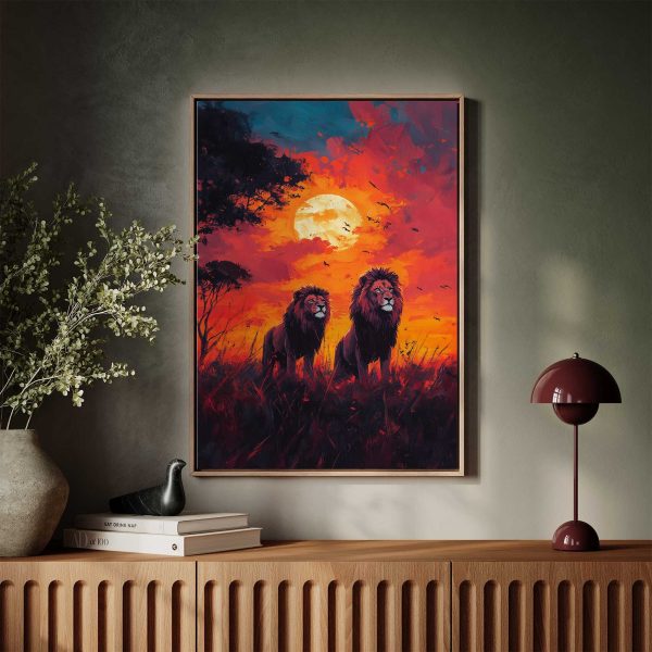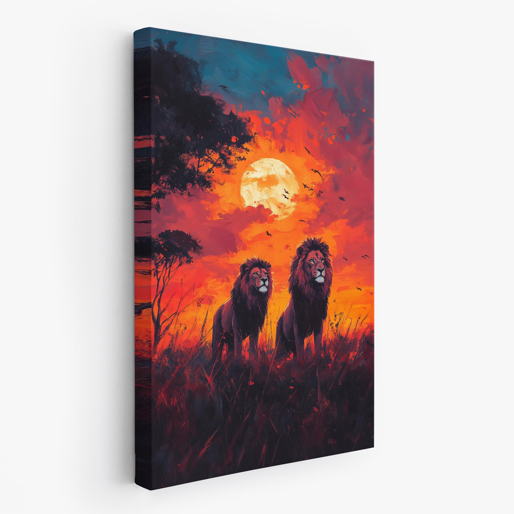 Terug naar collectie Canvas Majestueuze leeuwen bij zonsondergang