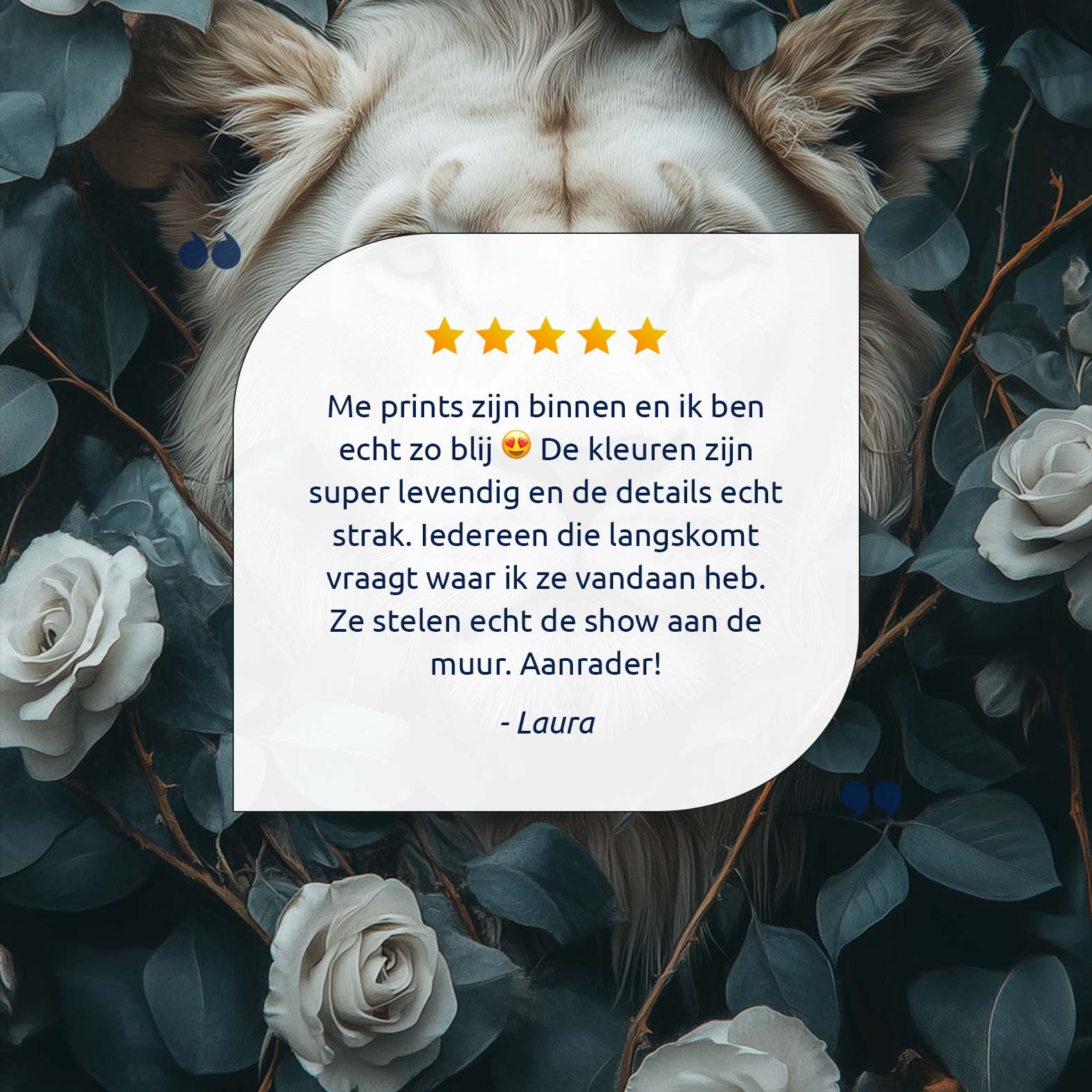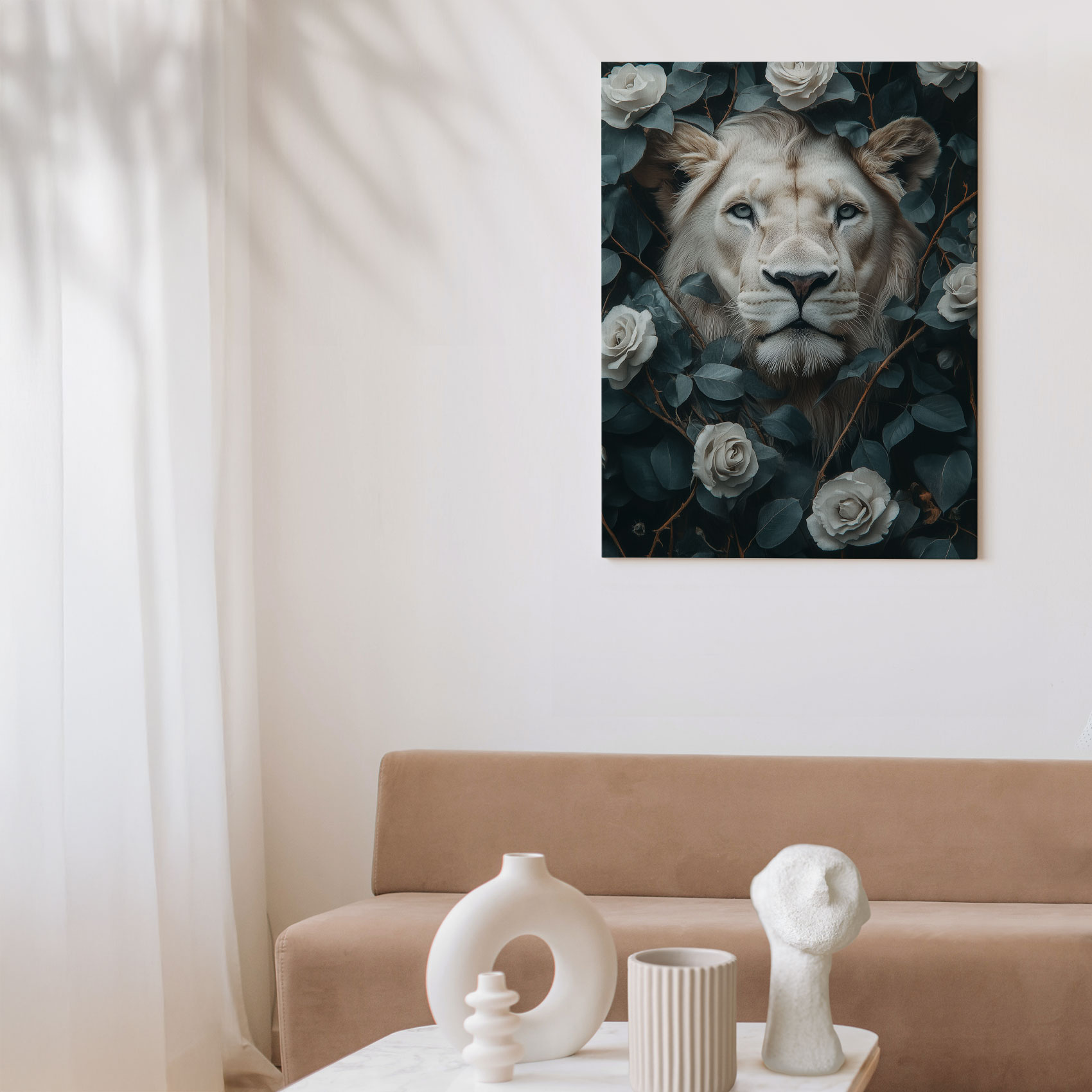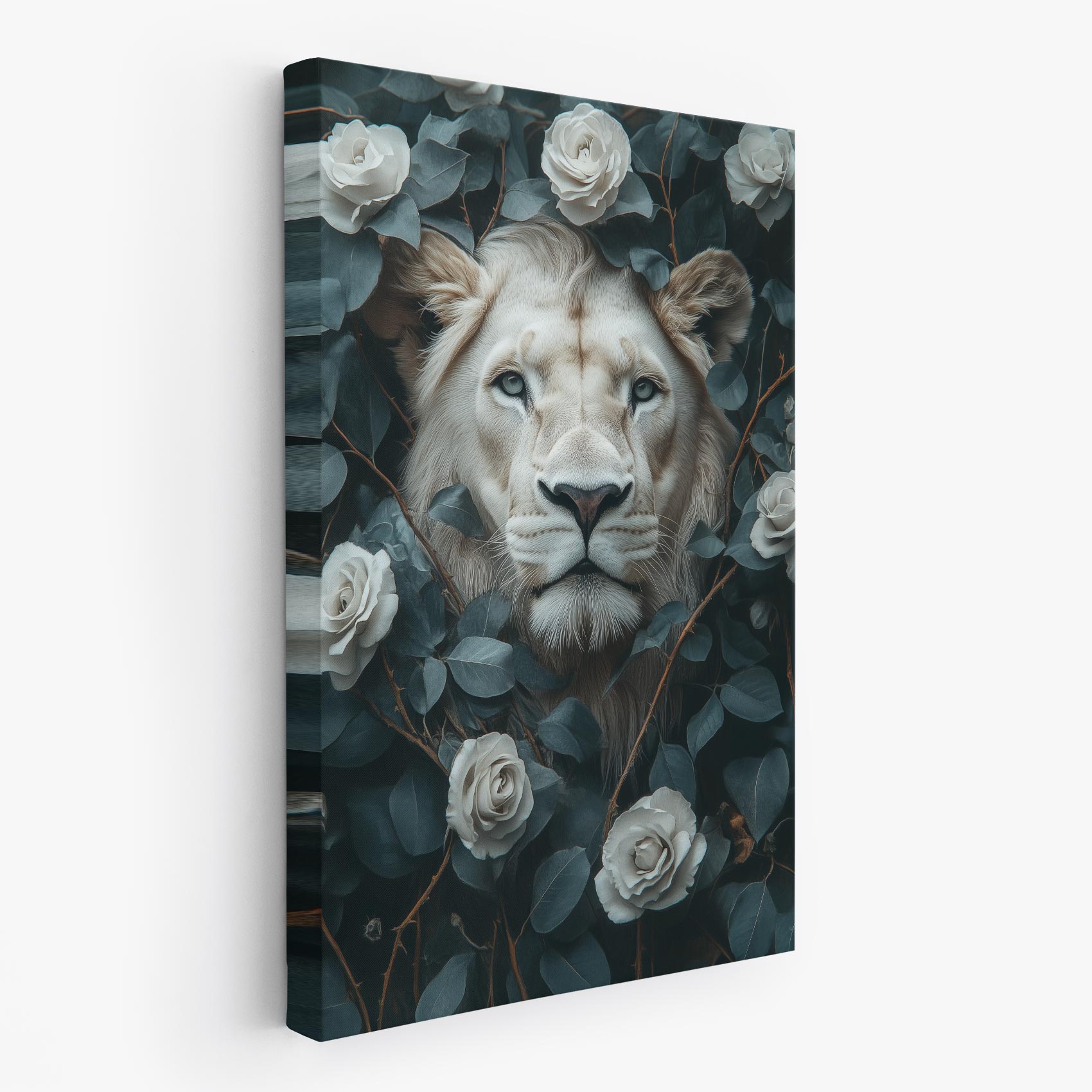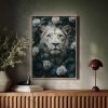 Majestueuze leeuwenkop tussen rozen