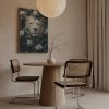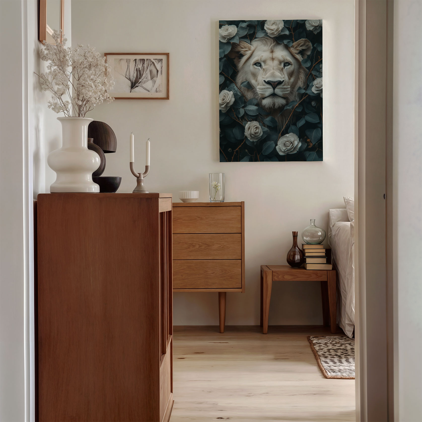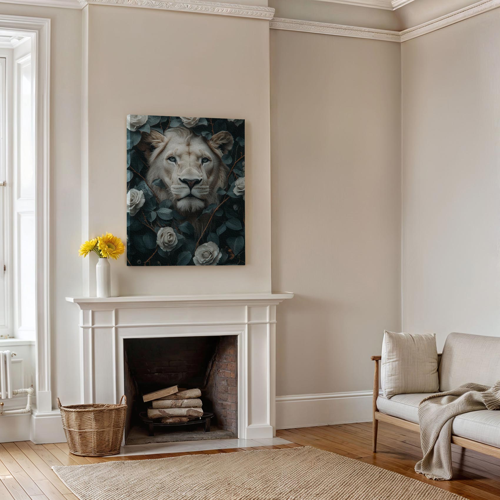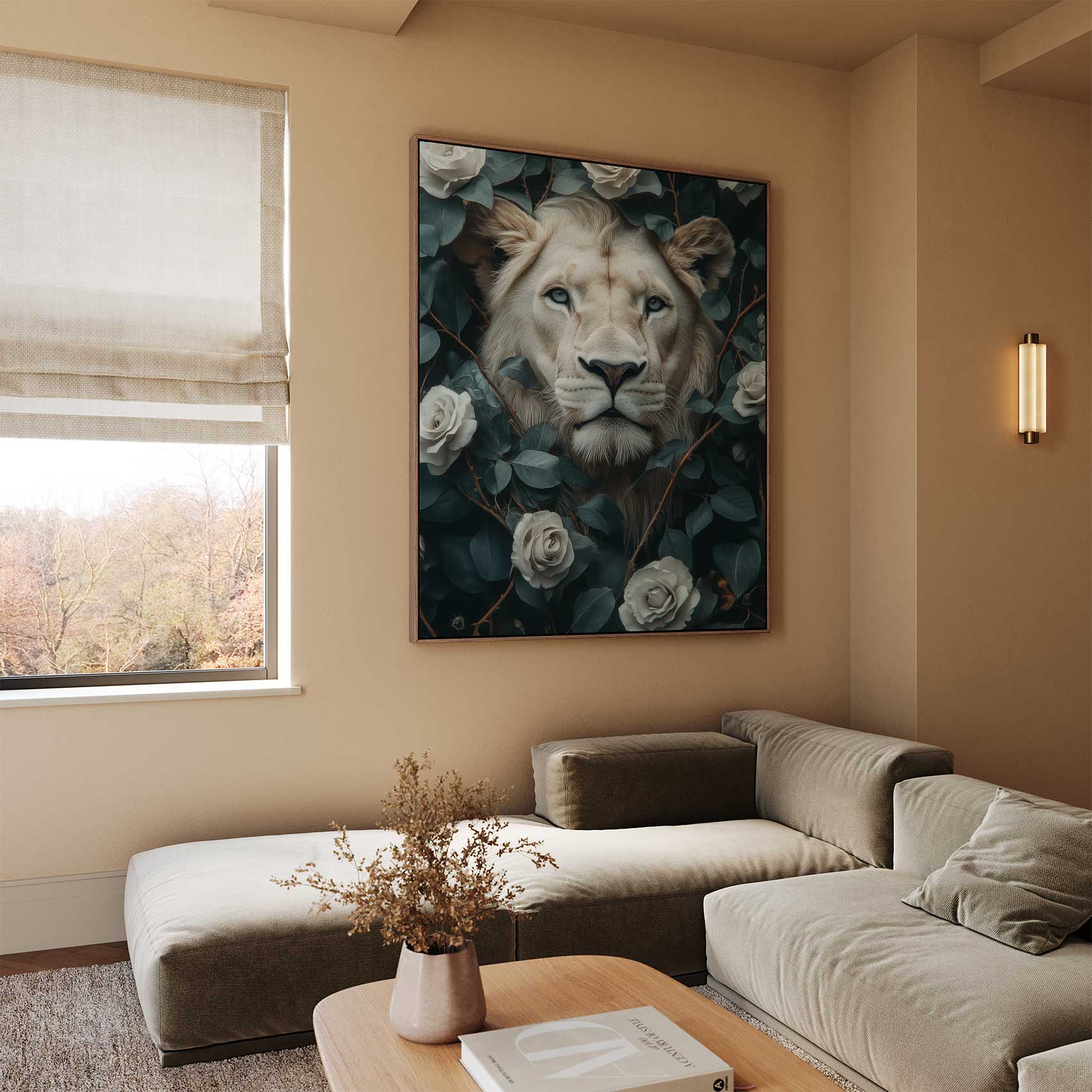 Majestueuze leeuwenkop tussen rozen