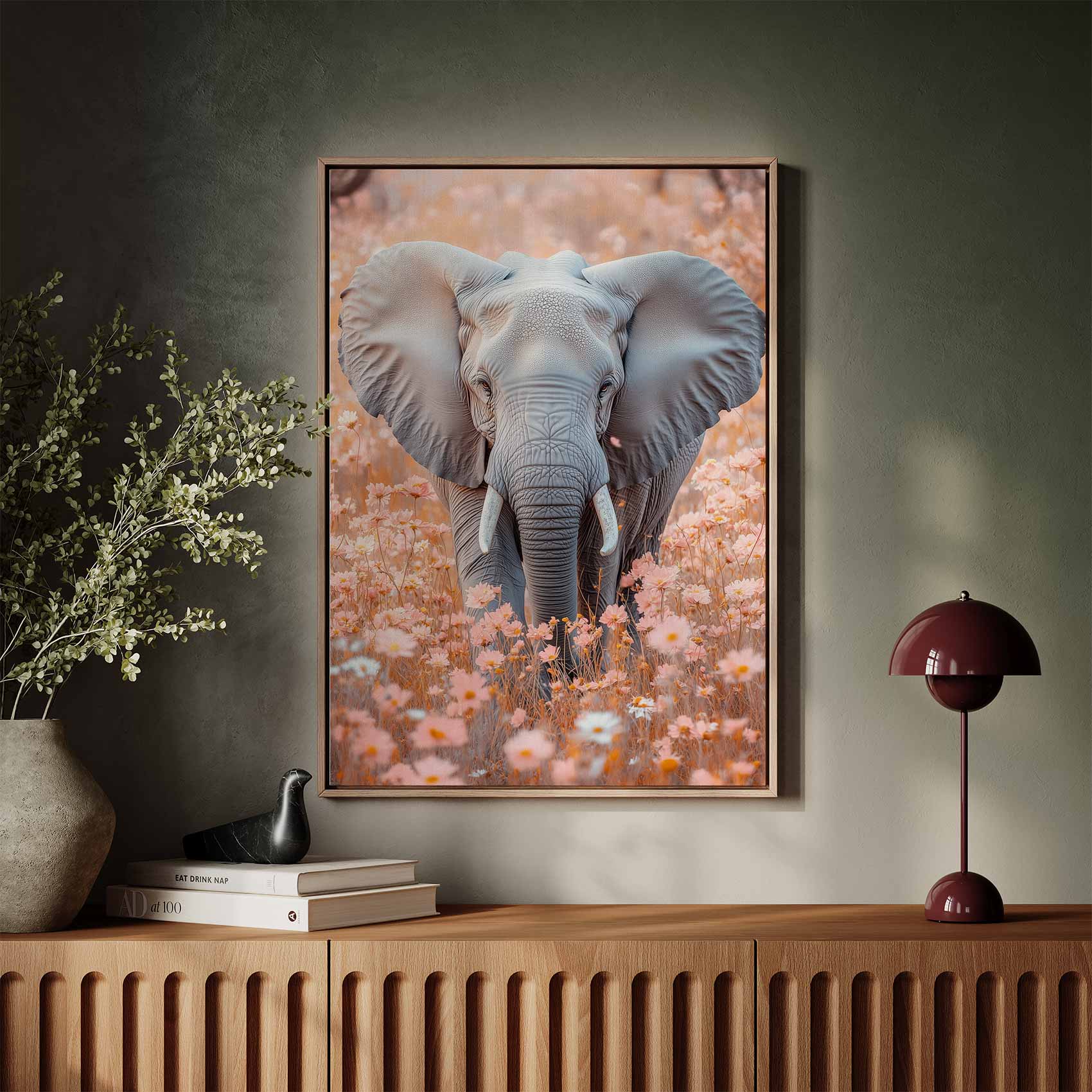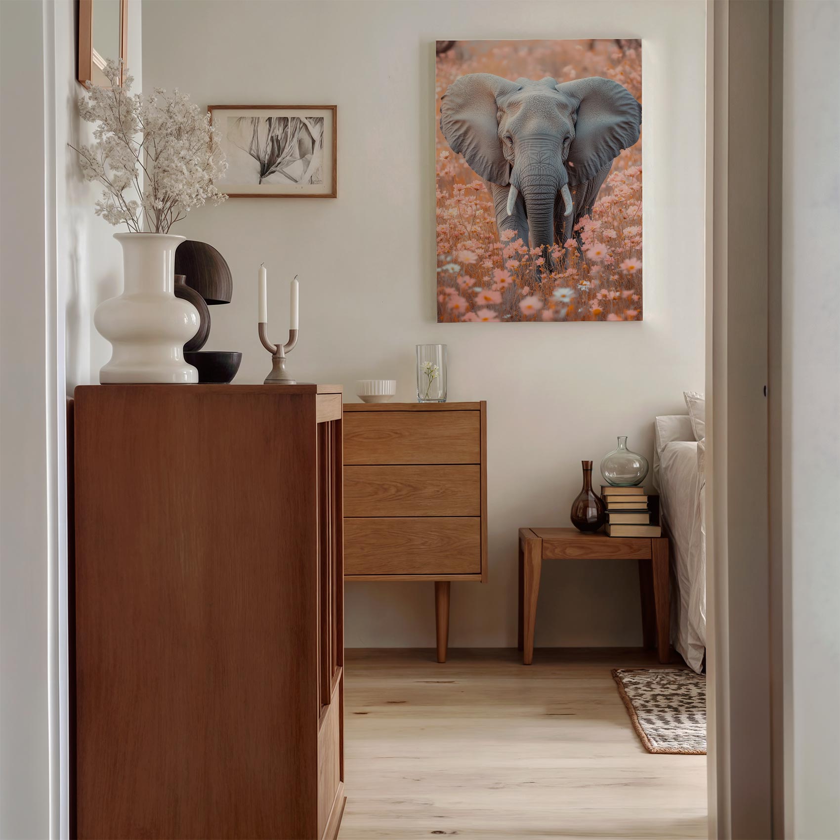 Majestueuze olifant in bloemenveld