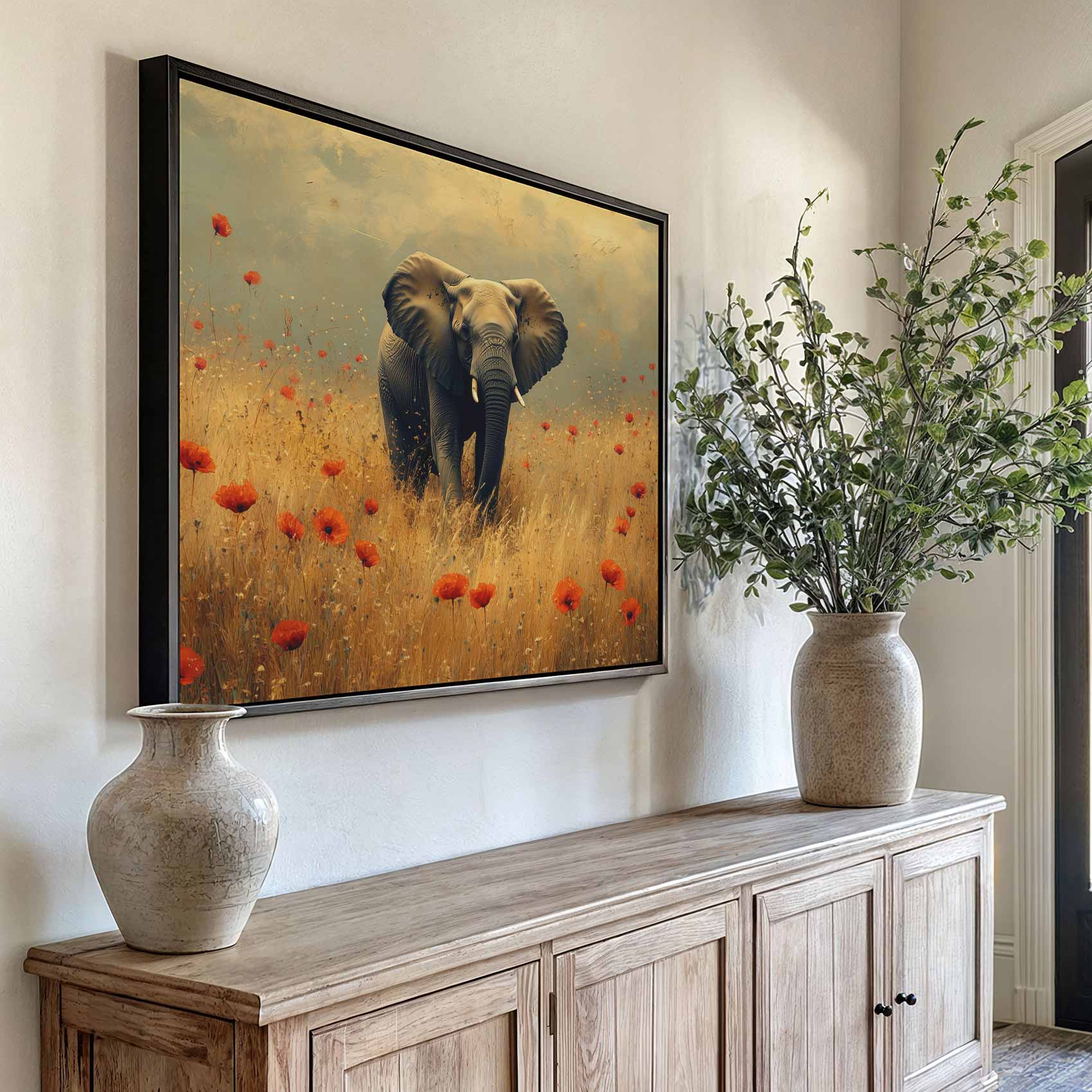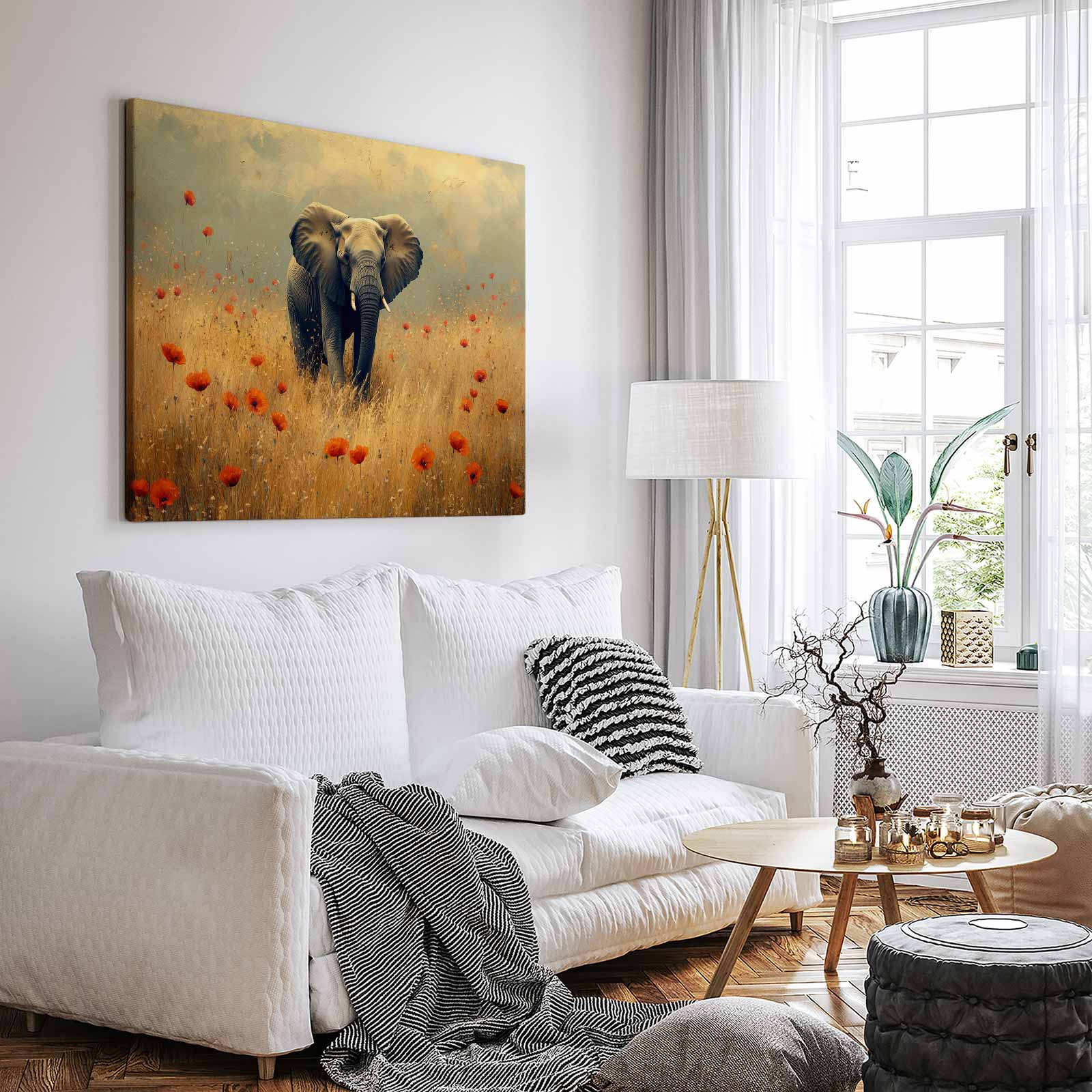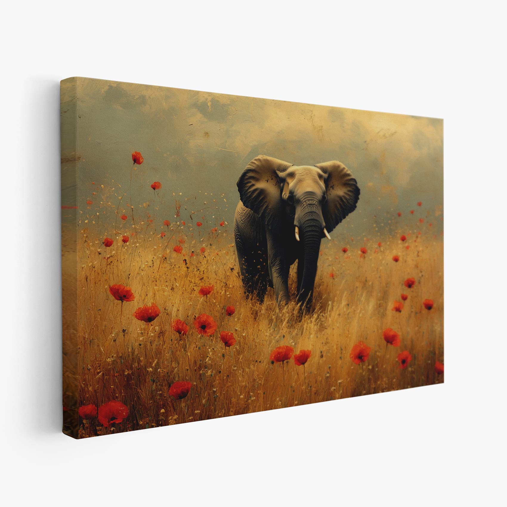 Terug naar collectie Canvas Majestueuze olifant tussen klaprozen