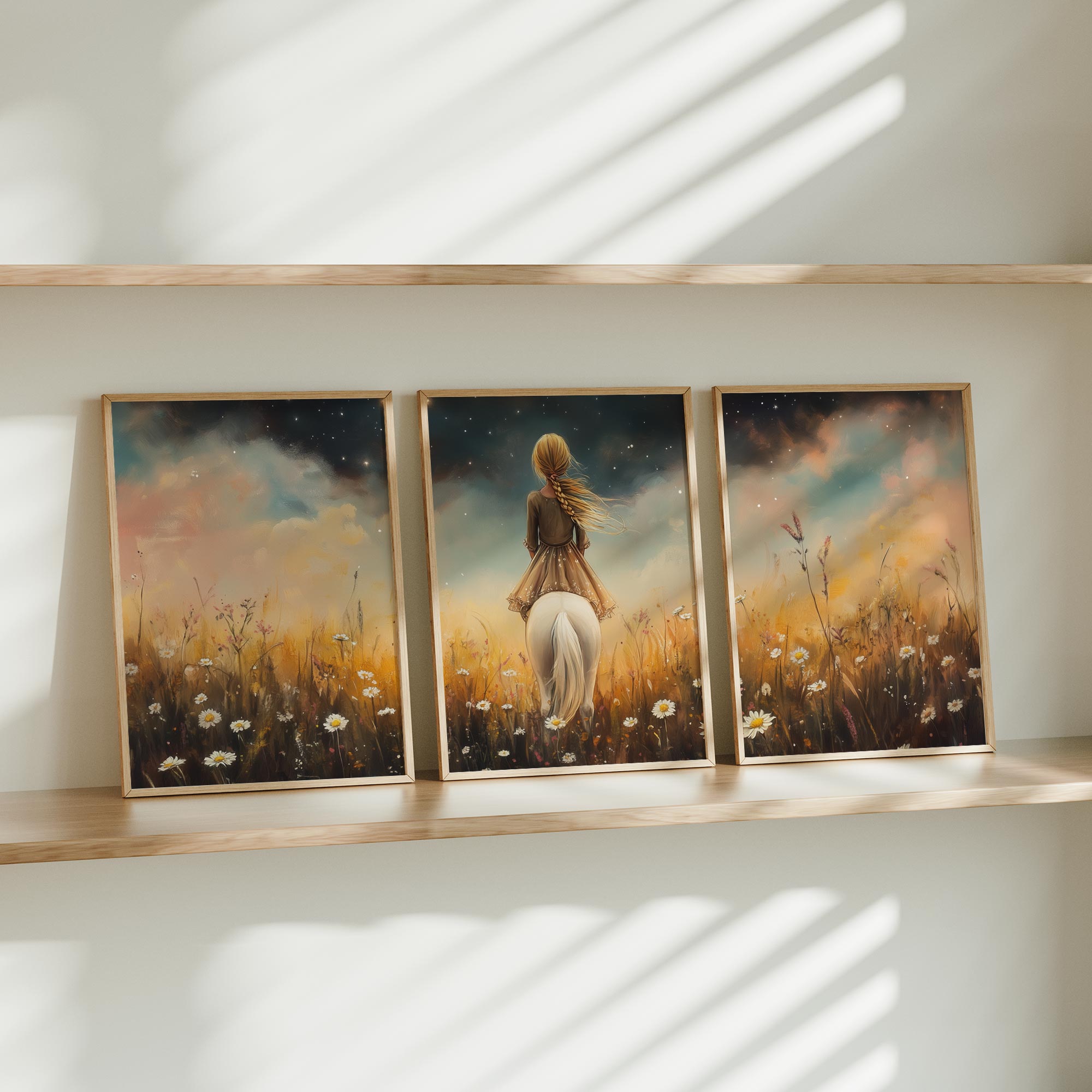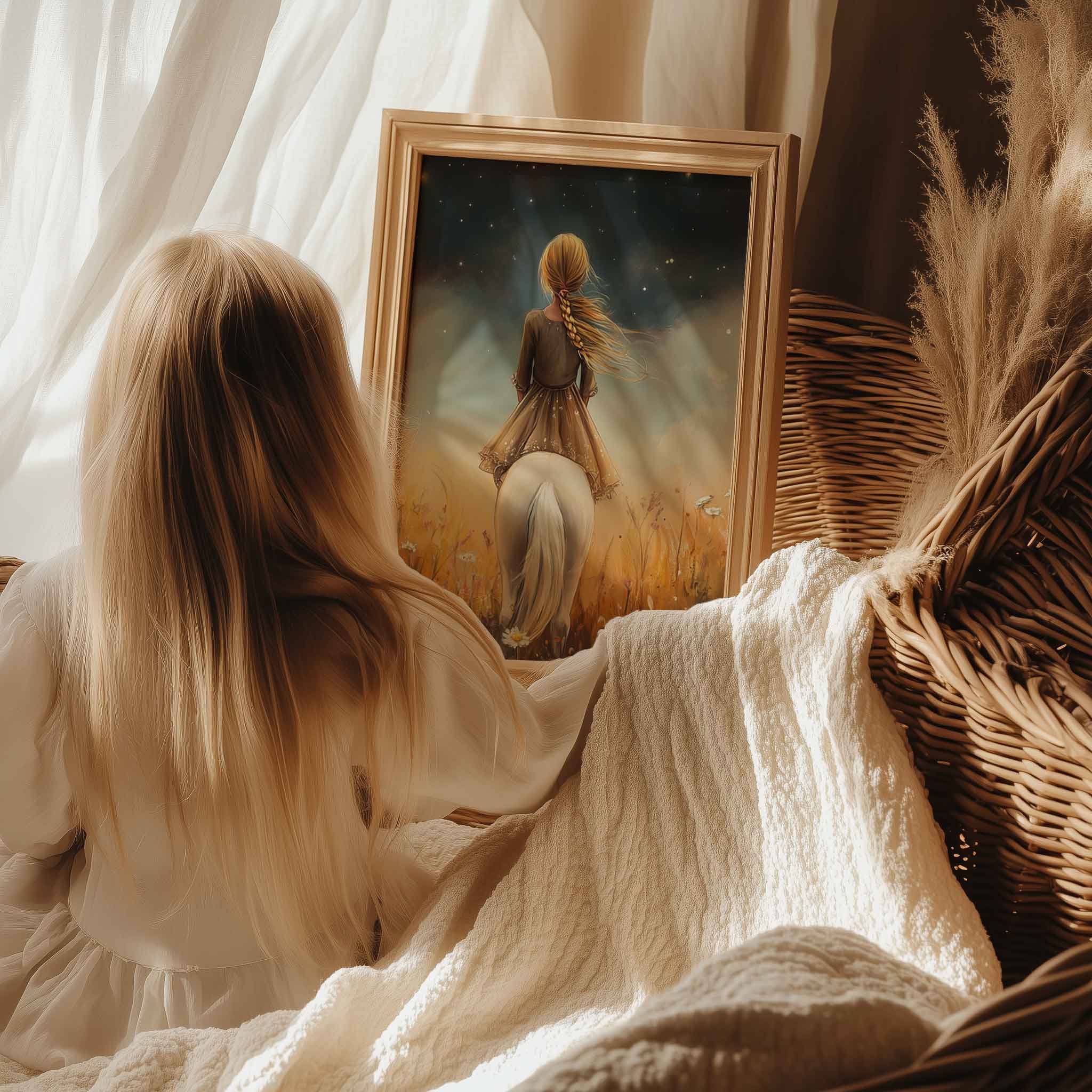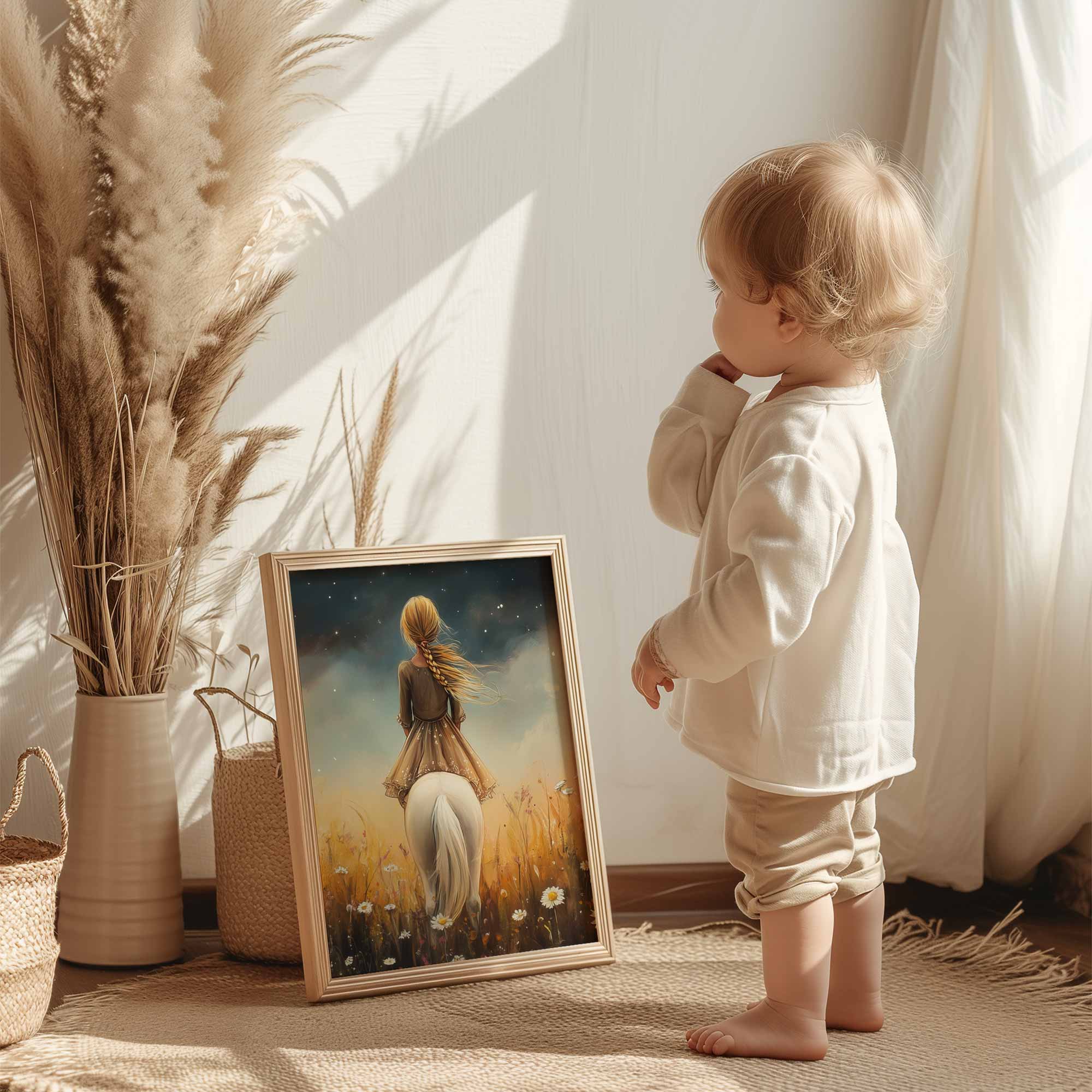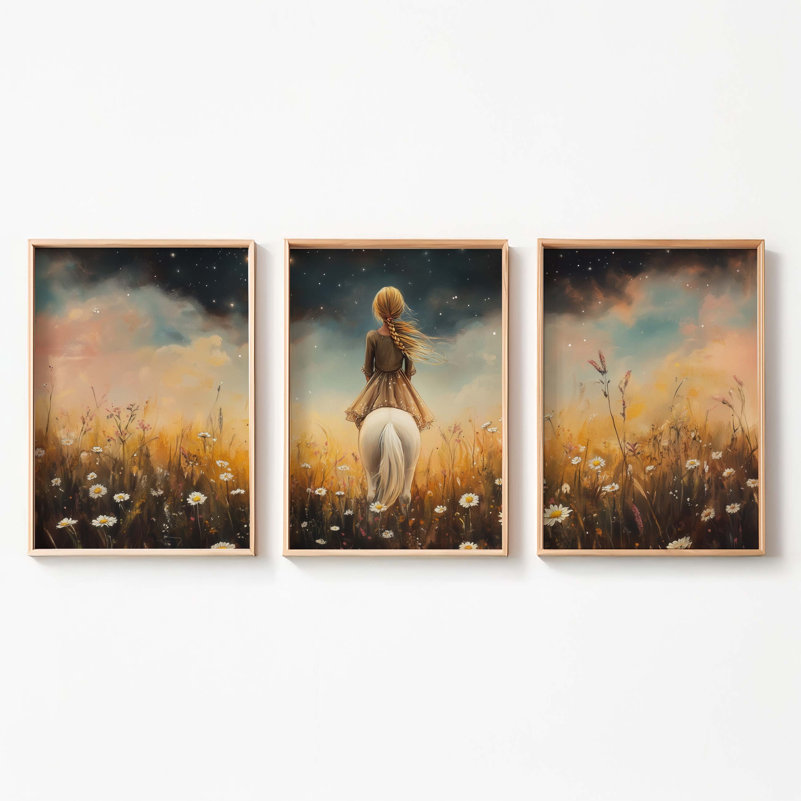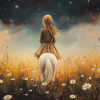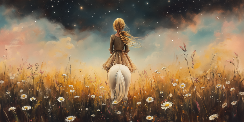 Meisje op witte pony in bloemenveld onder sterrenhemel