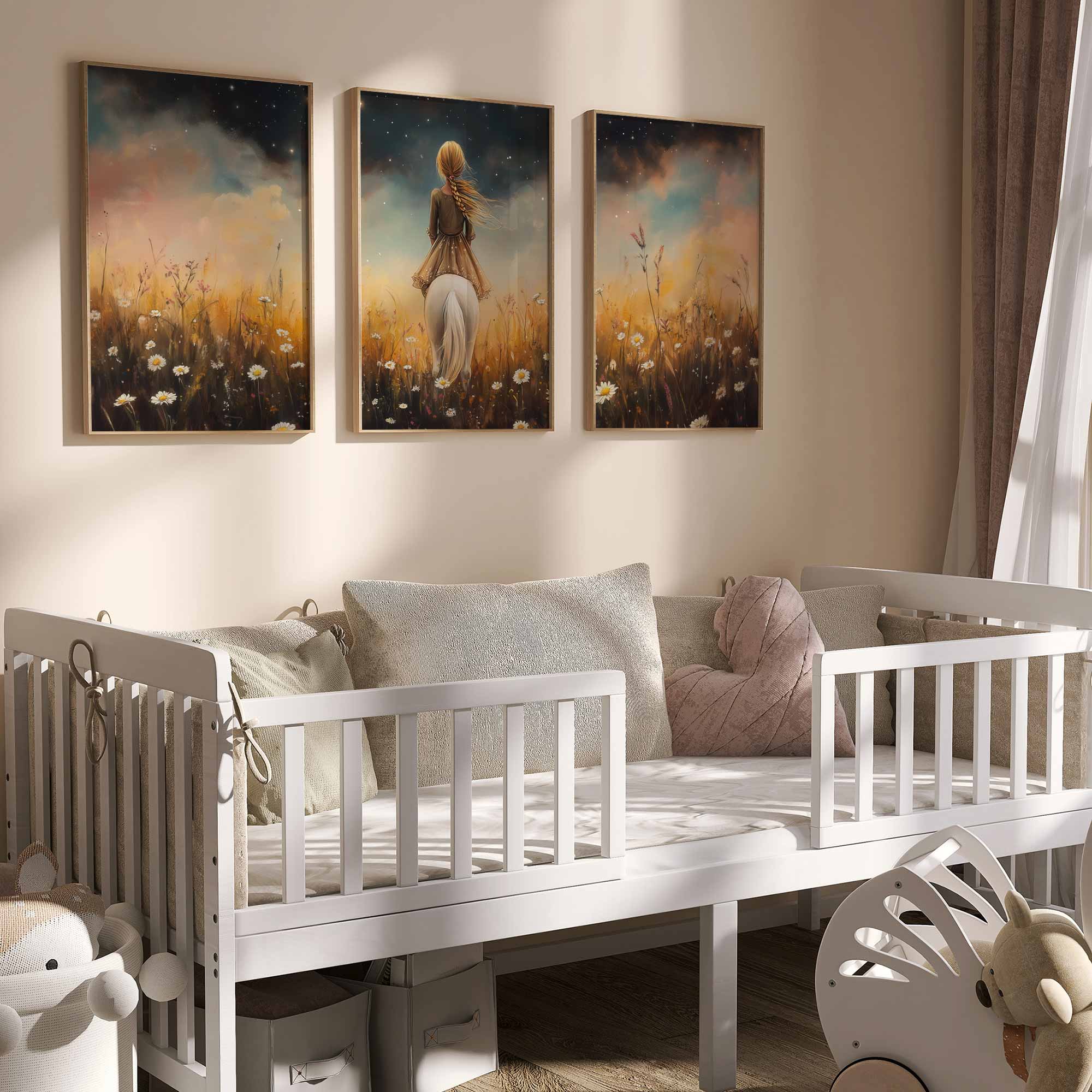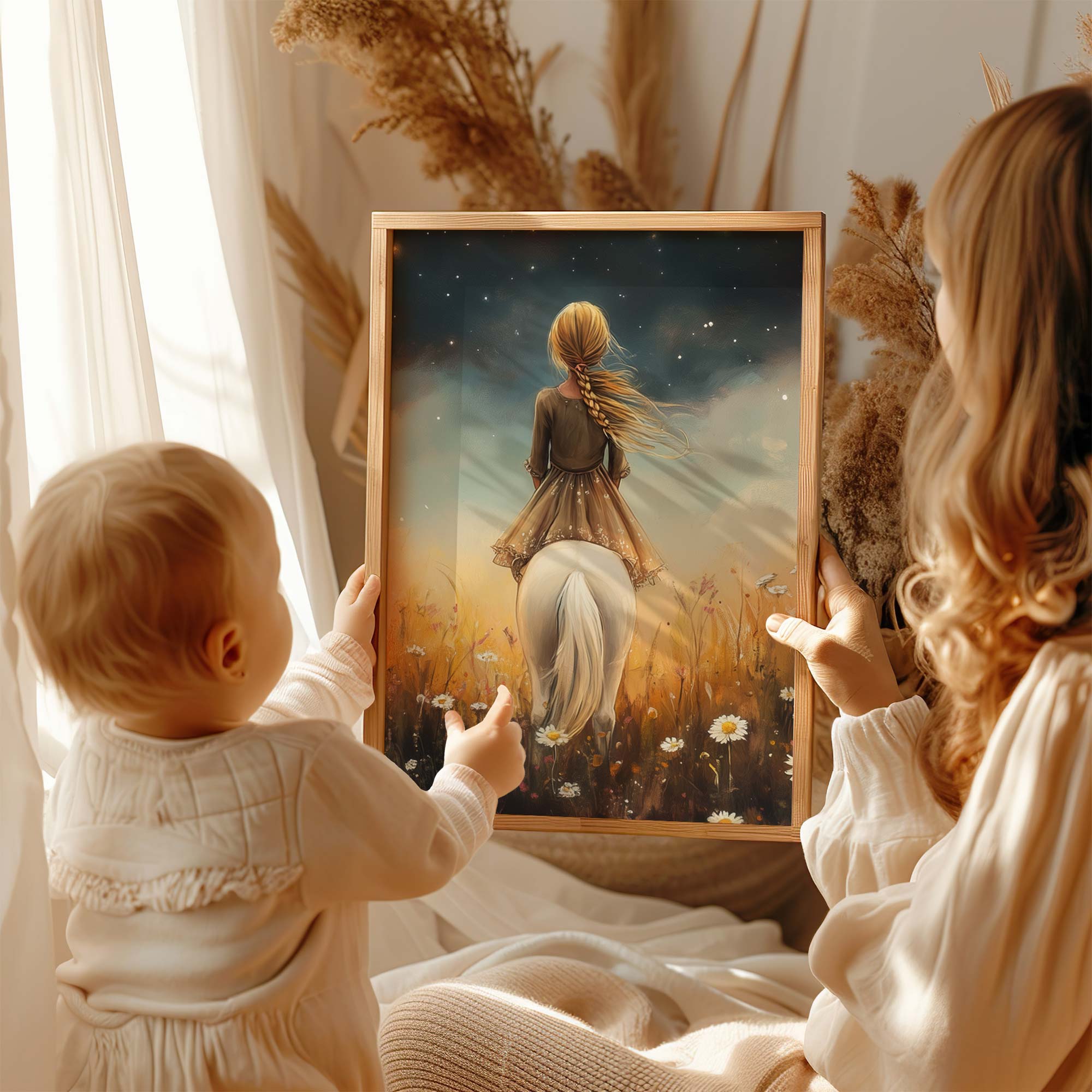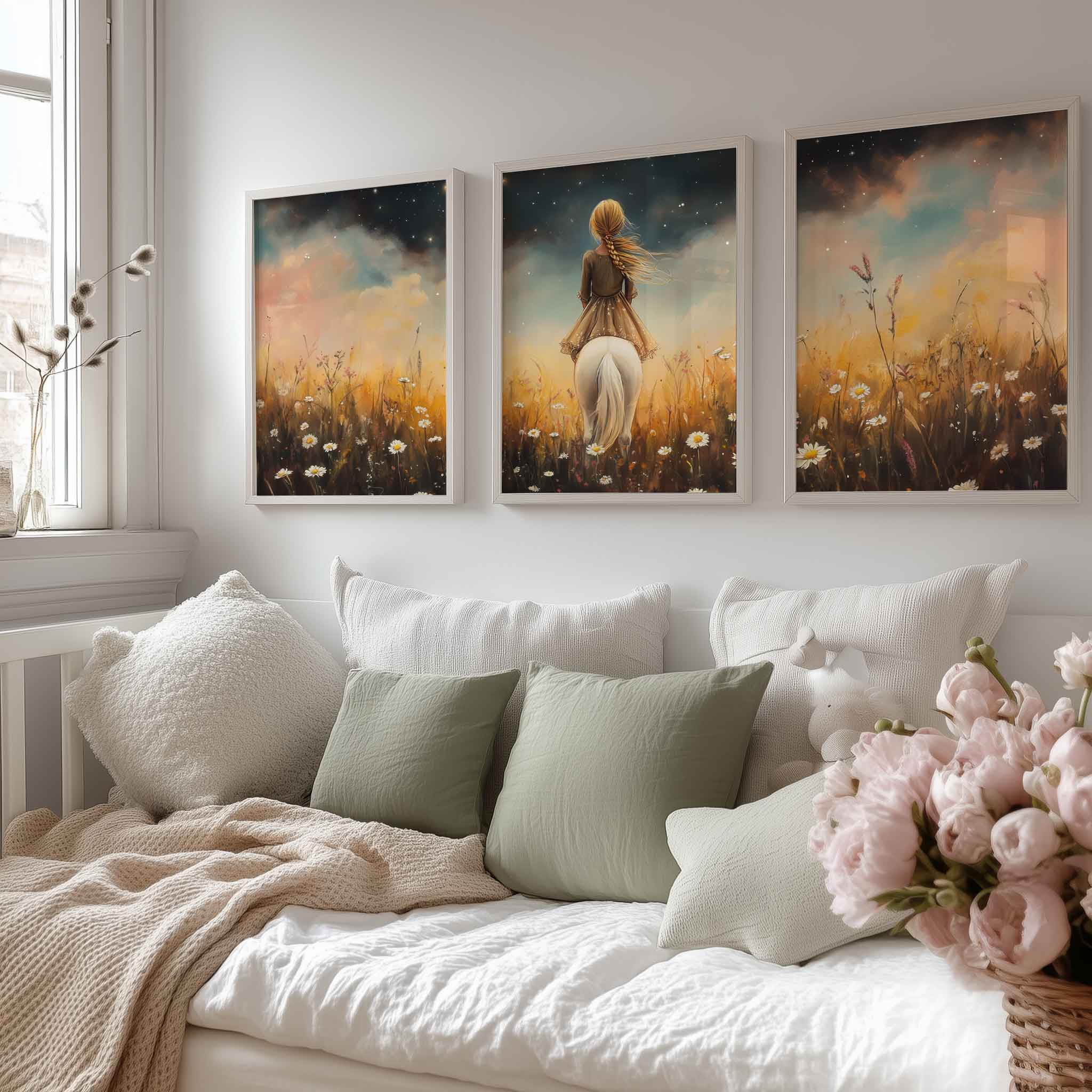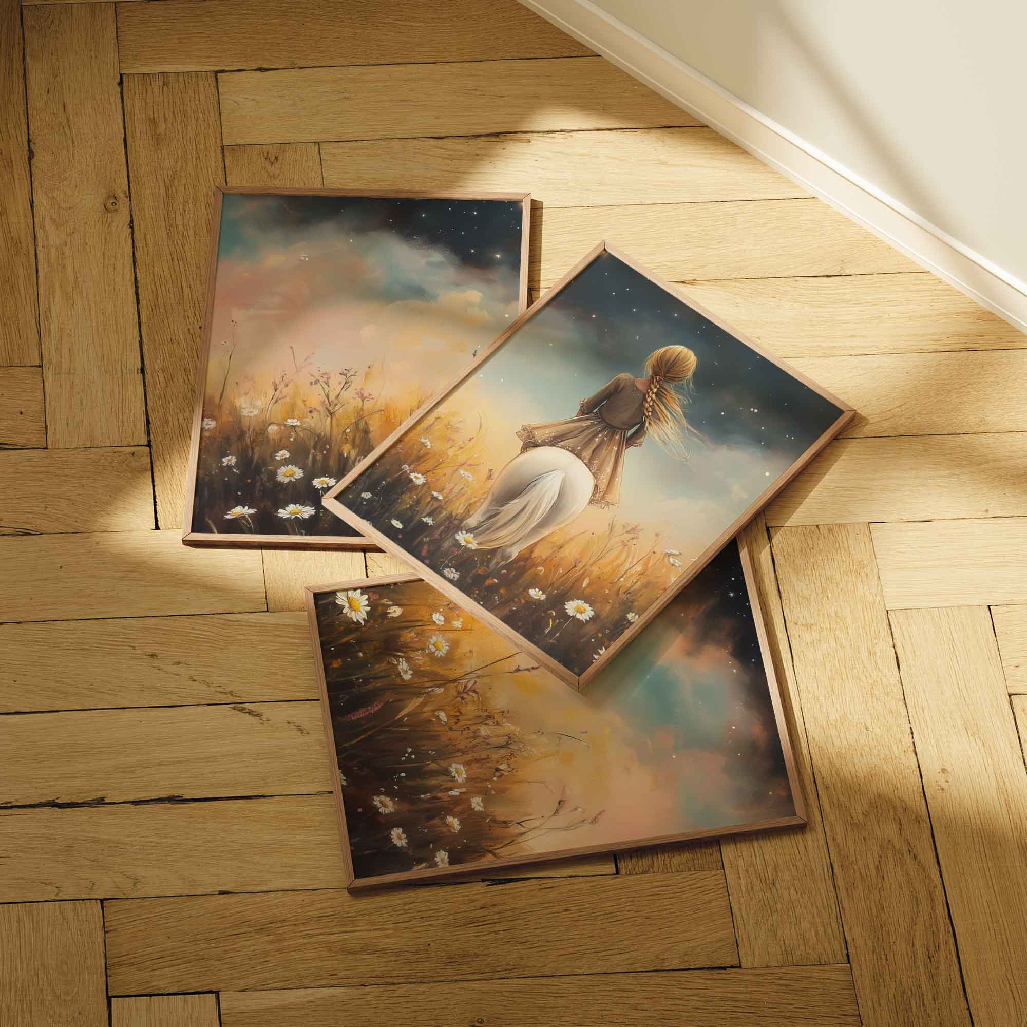 Meisje op witte pony in bloemenveld onder sterrenhemel